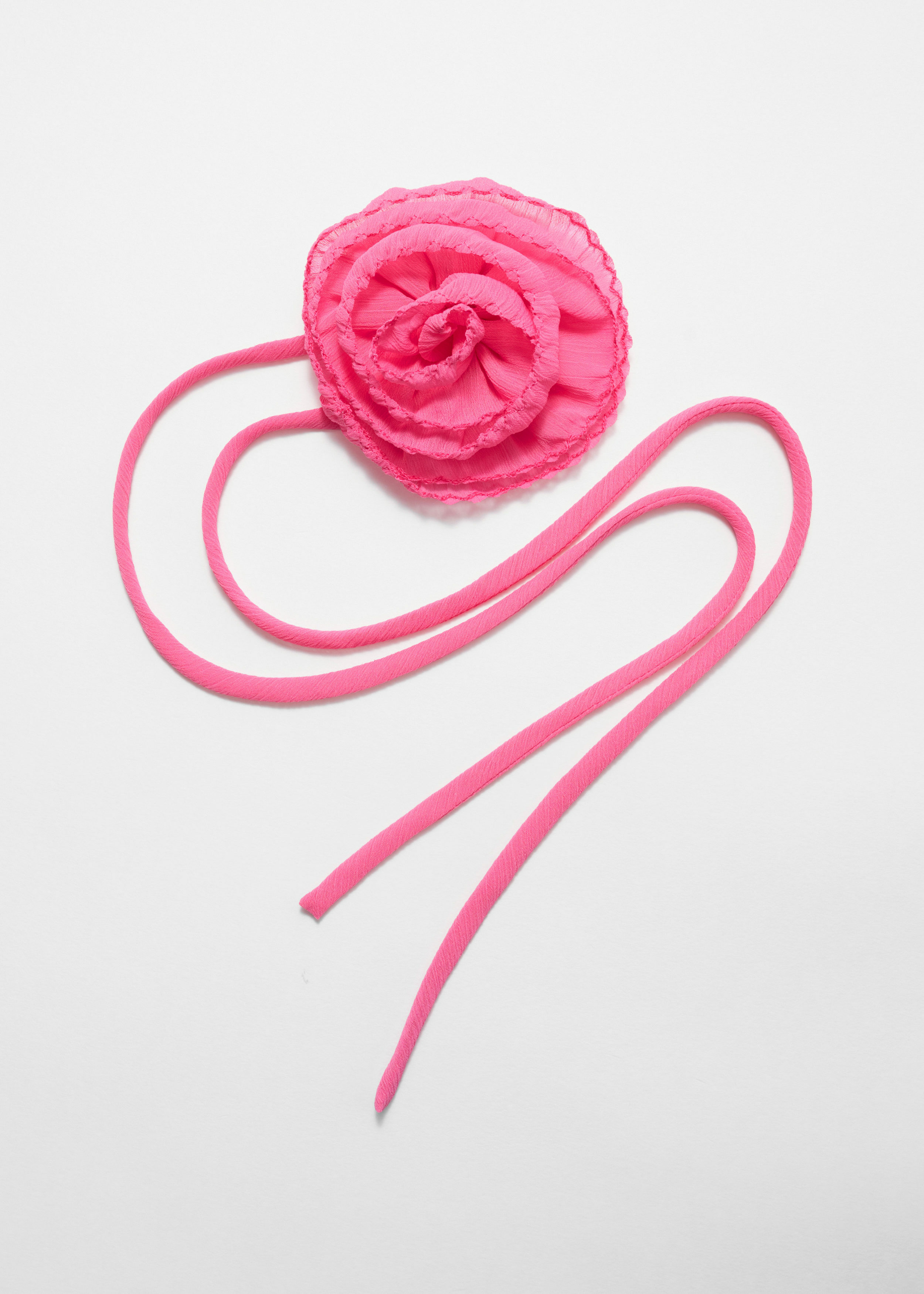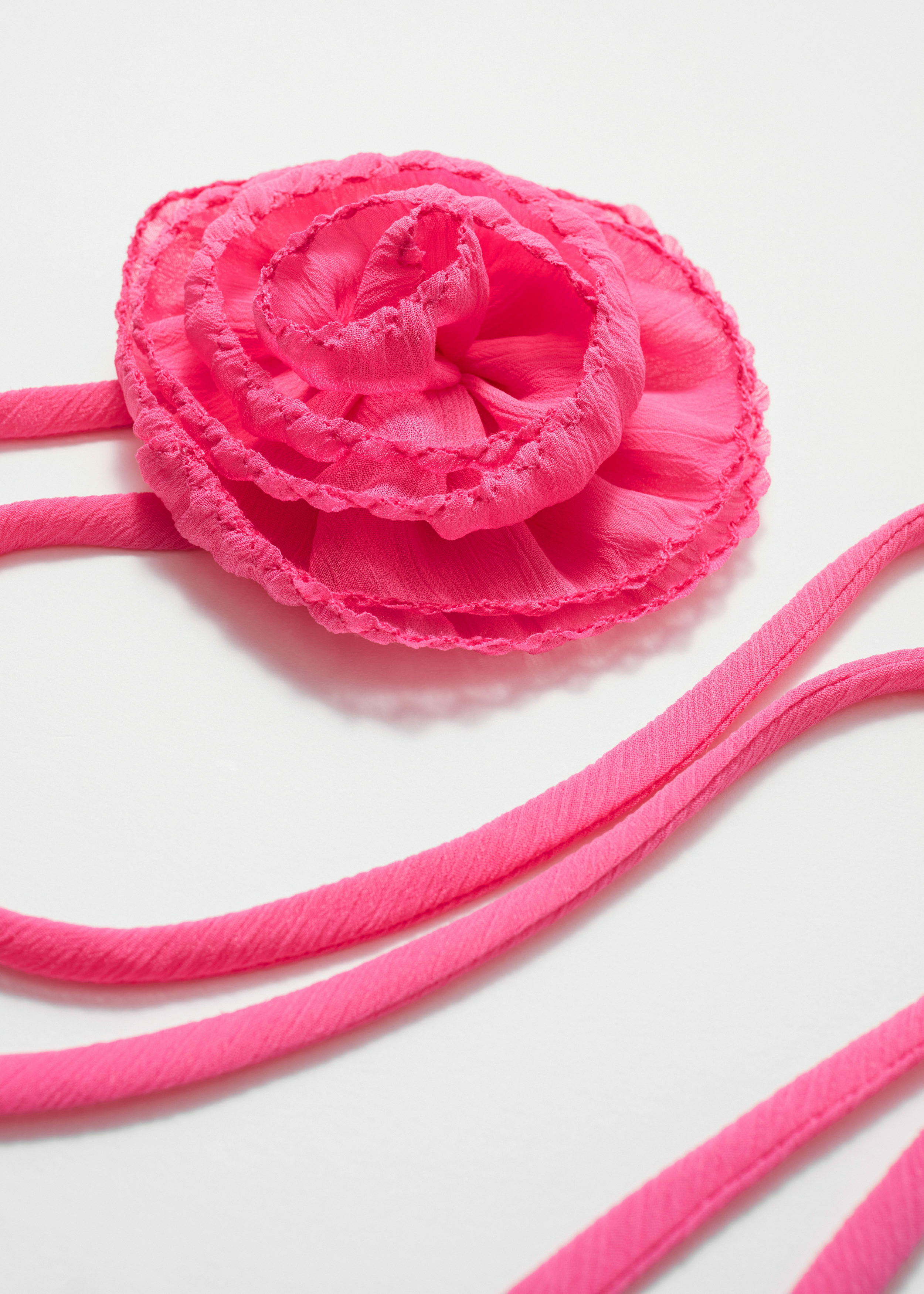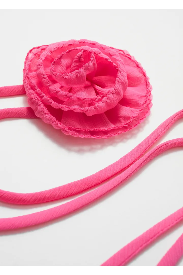 섬세하면서도 강렬한 무드의 로즈 브로치 네크리스예요. 어떤 룩에나 멋스러움을 더해줄 아이템이죠. 뒷면의 긴 타이를 활용해 네크리스, 웨이스트 벨트, 백 액세서리 등으로 다양하게 스타일링할 수 있어요. 얇은 크링클 시폰 소재와 로즈 테두리의 지그재그 스티치를 특징으로 하여 텍스처적 매력이 돋보이며, 부드러운 러플처럼 살랑인답니다.
