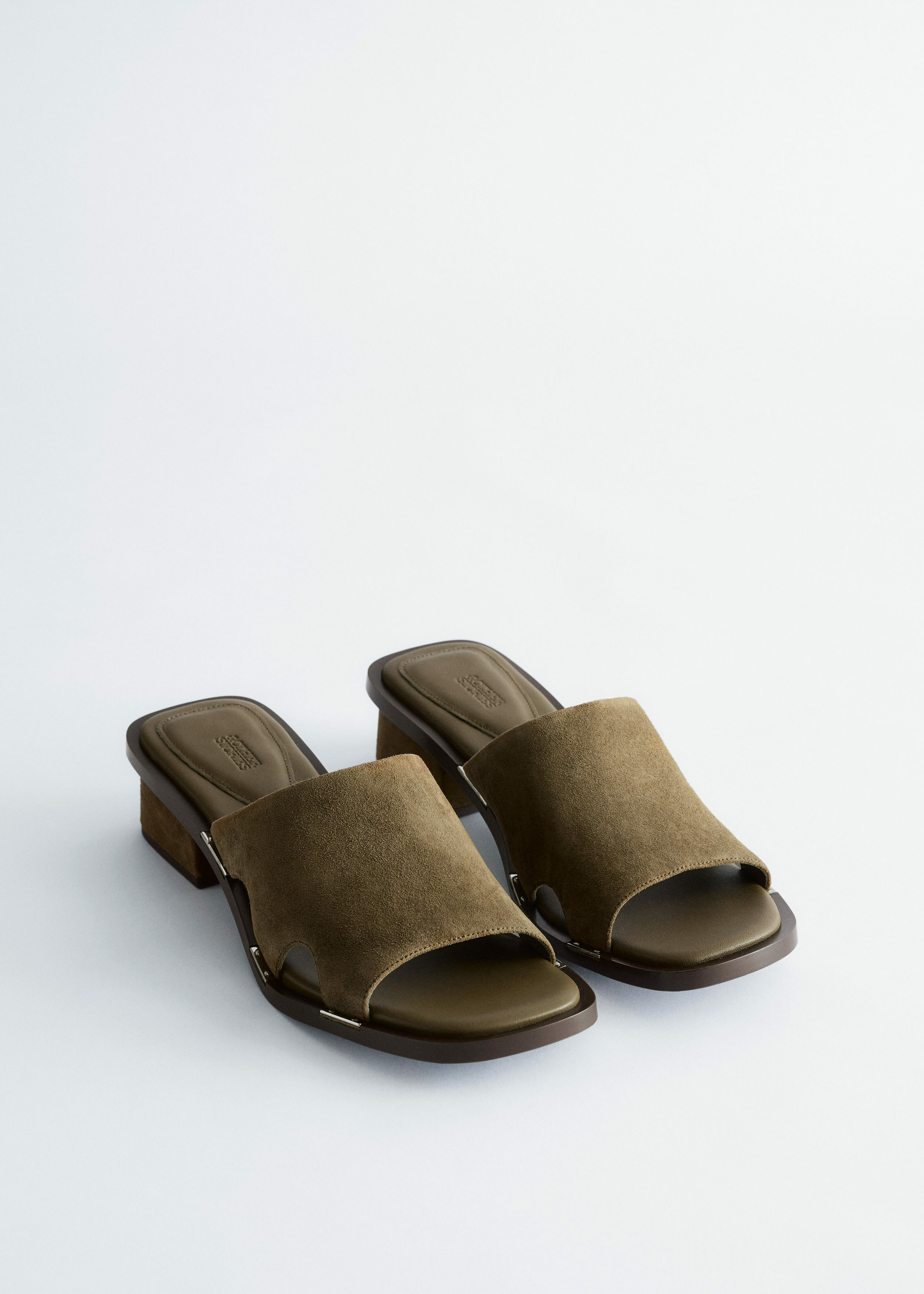 부드러운 가죽 소재로 탄생한 슬립 온 샌들이에요. 사선 쉐입의 앞코와 둥근 블록 힐이 특징이며, 두께감 있는 밑창으로 안정적인 착화감을 선사한답니다. 갑피에는 메탈 플레이트가 장식되어 있으며, 쿠션 처리된 가죽 안창으로 편안함을 더해주어요.