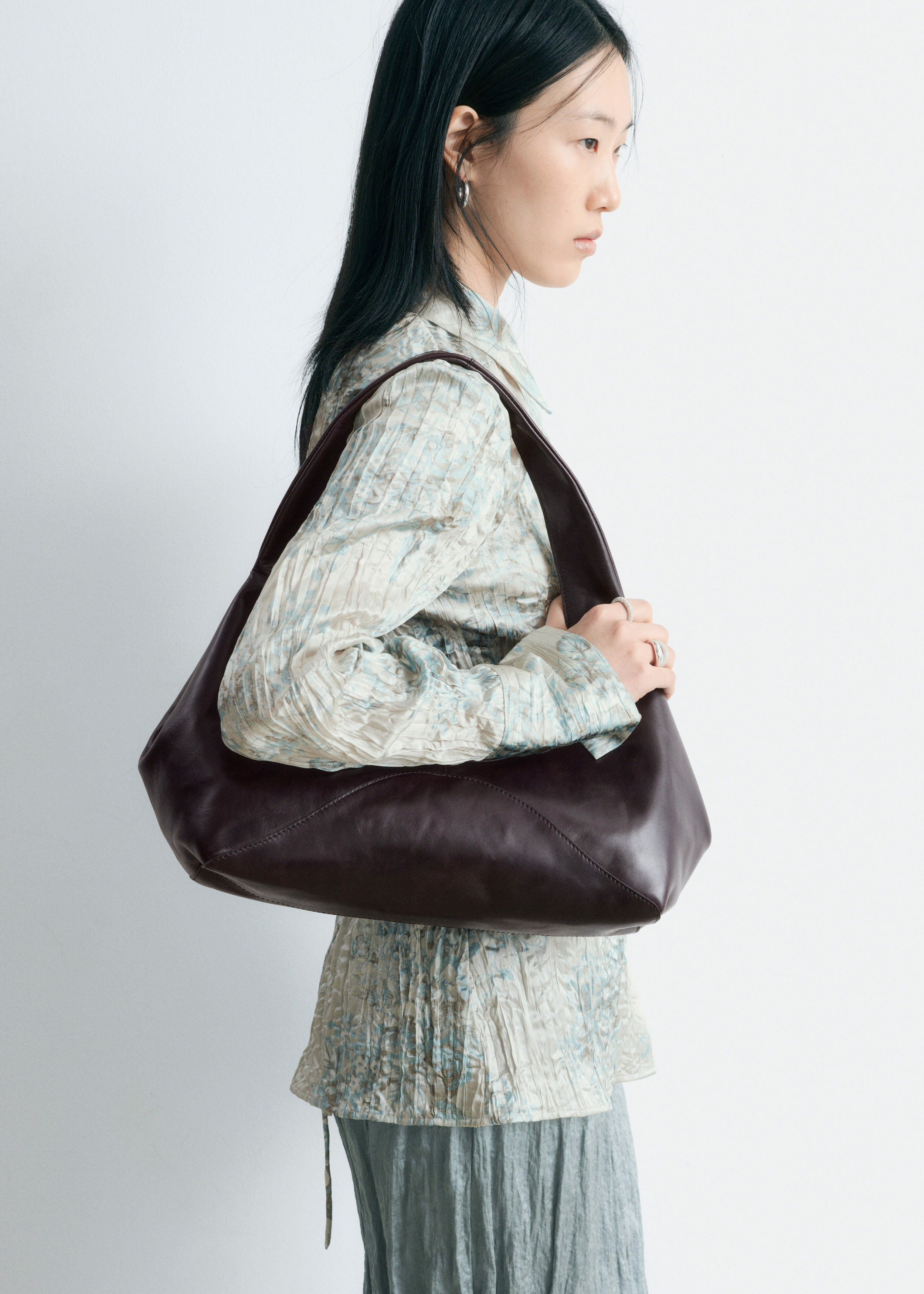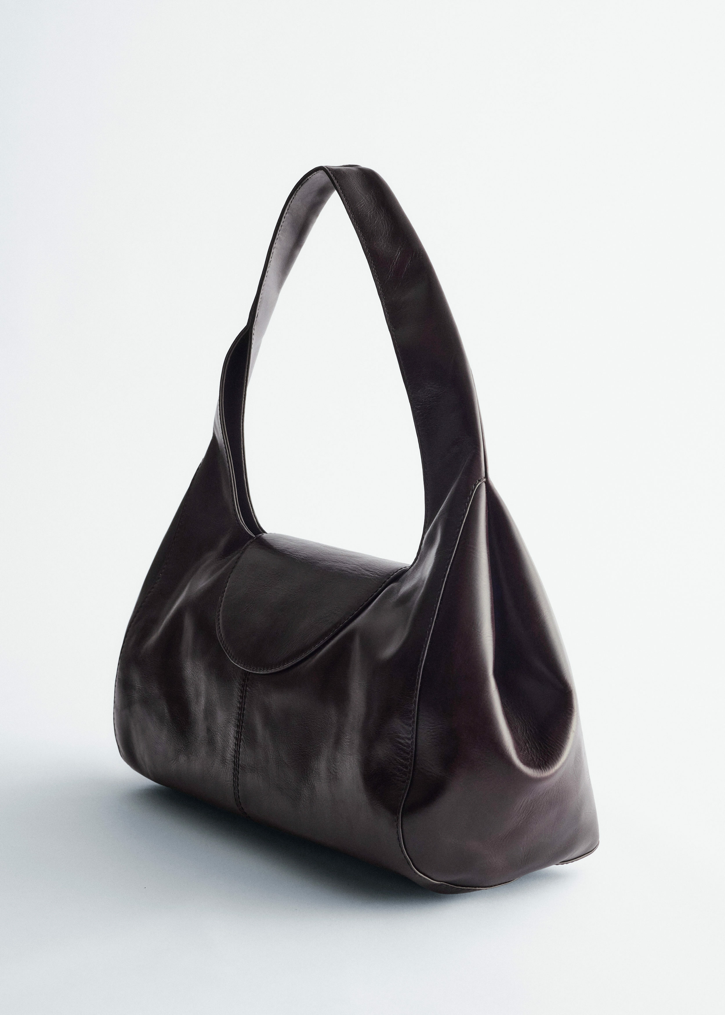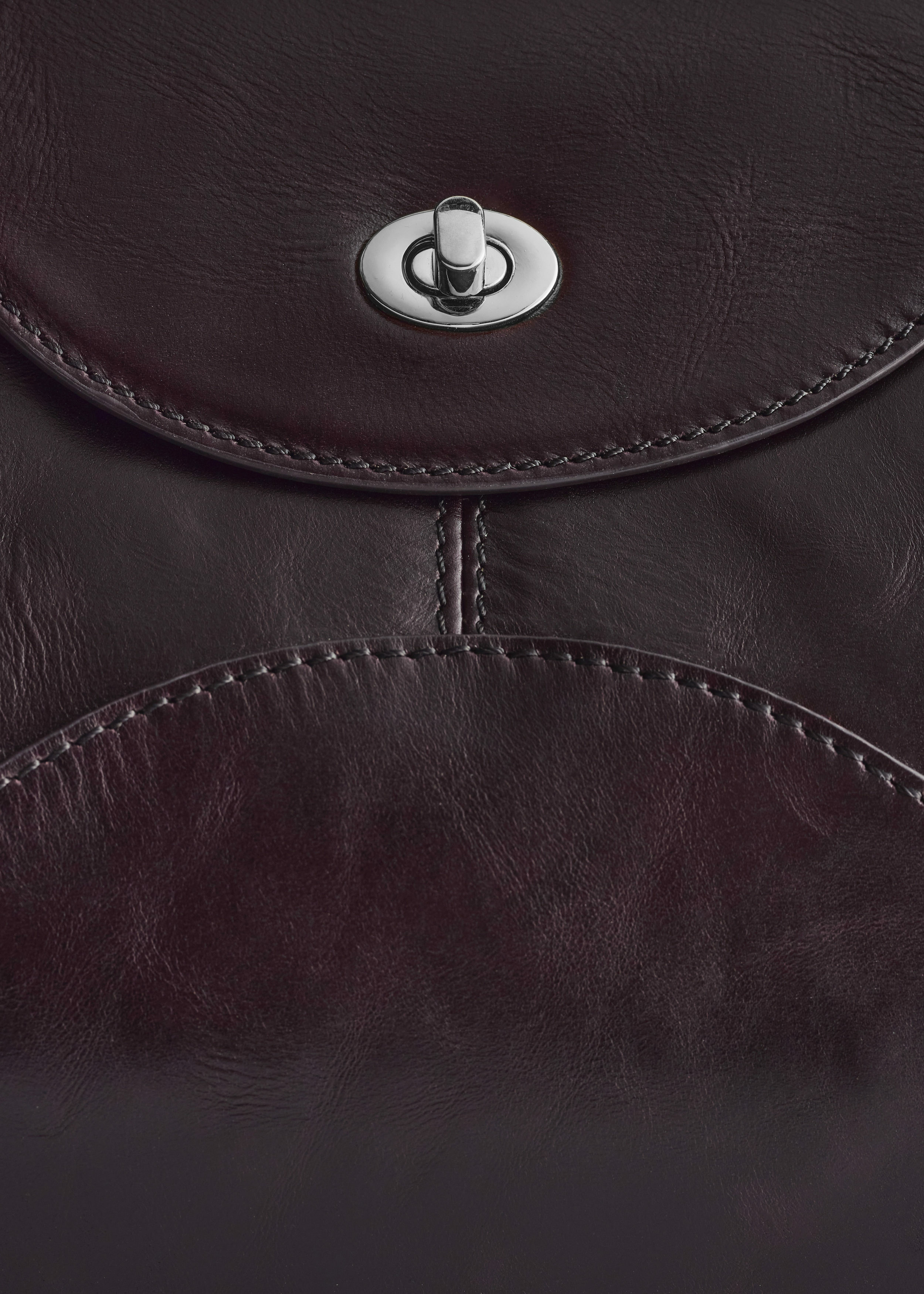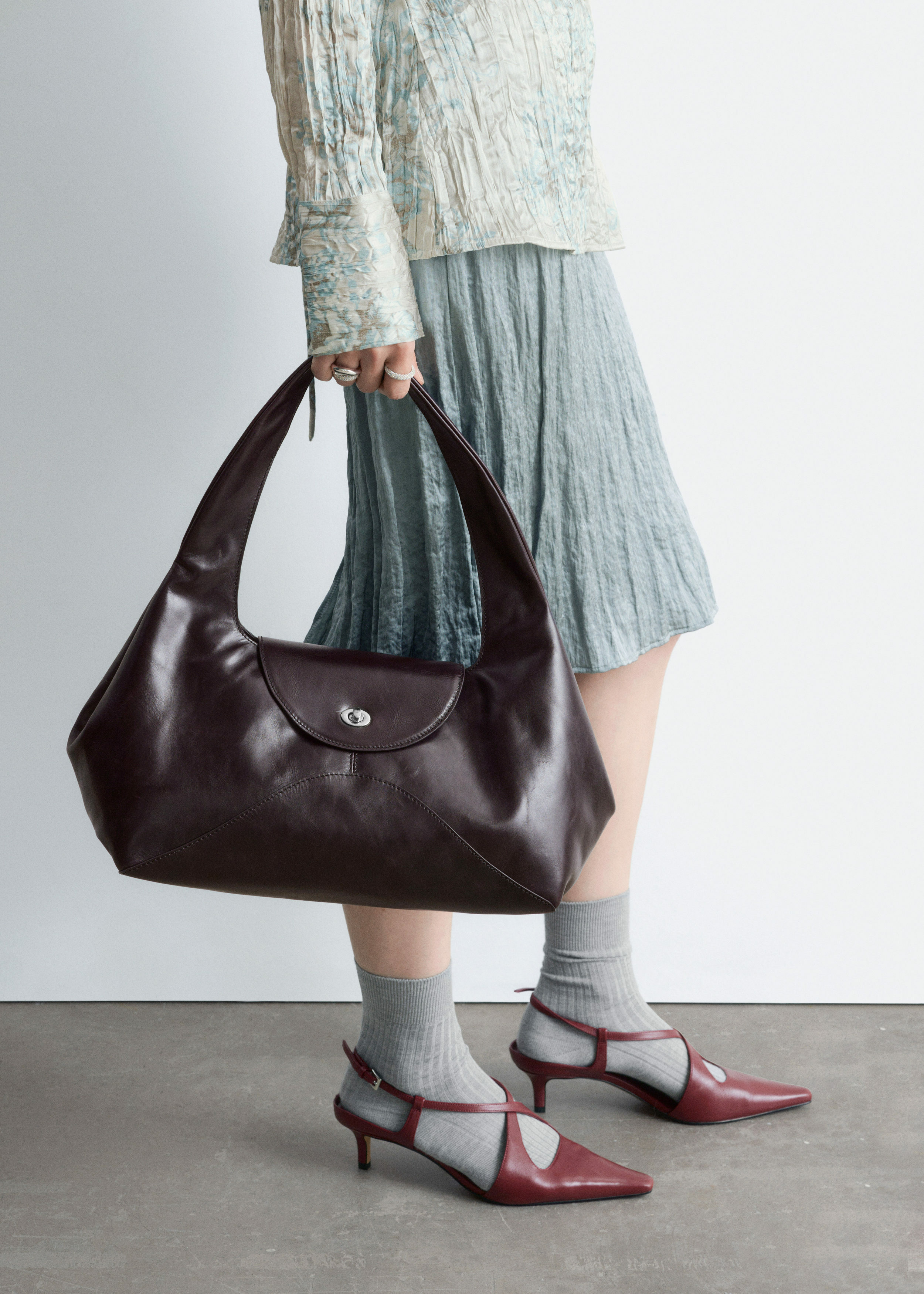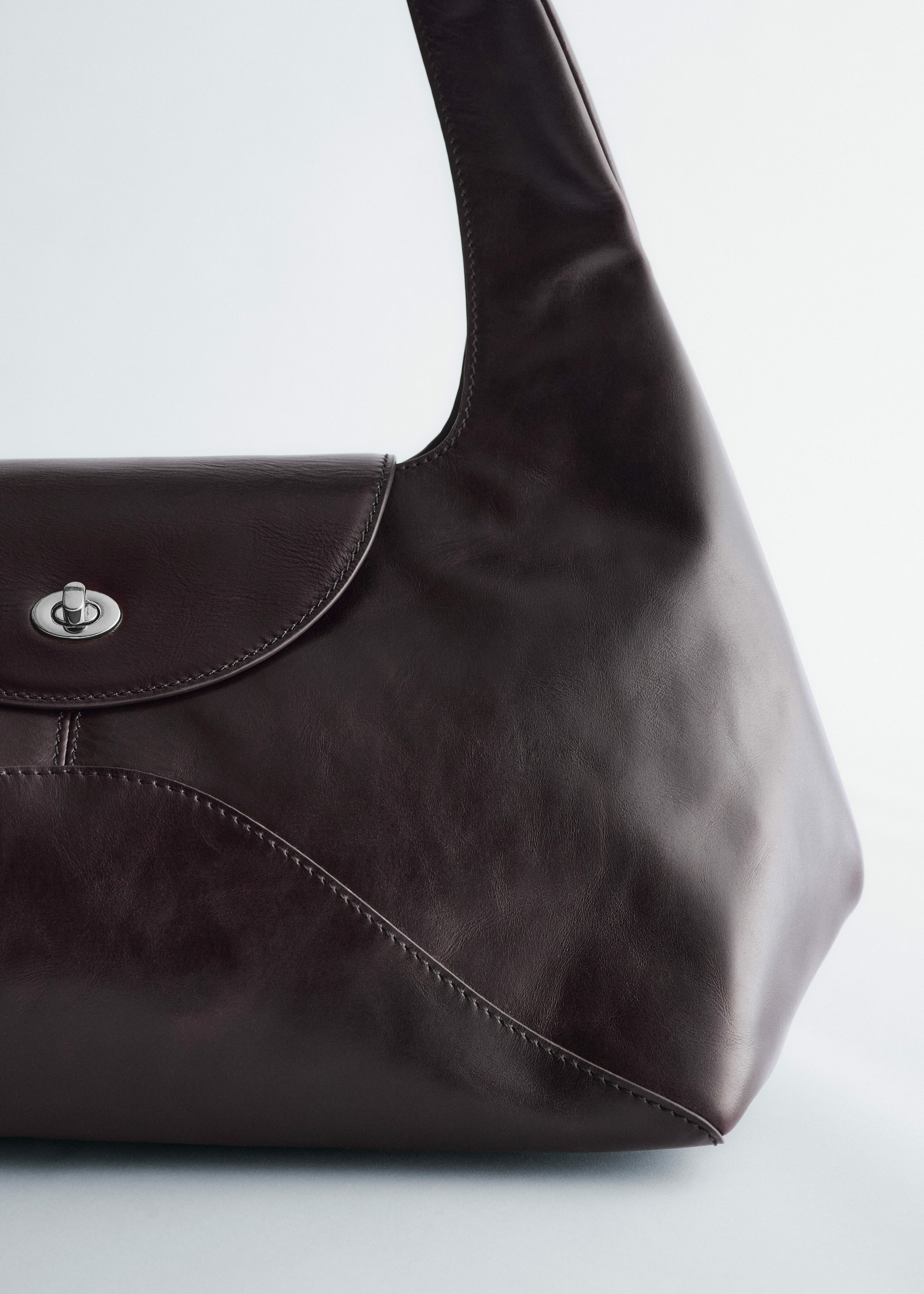 구조감 있는 곡선형 실루엣이 멋스러운 숄더 백이에요. 너비감 있는 사선 숄더 스트랩, 커트 라인 장식 솔기, 그리고 앞면의 플랩과 트위스트 잠금 클로저가 자리해 있어요.