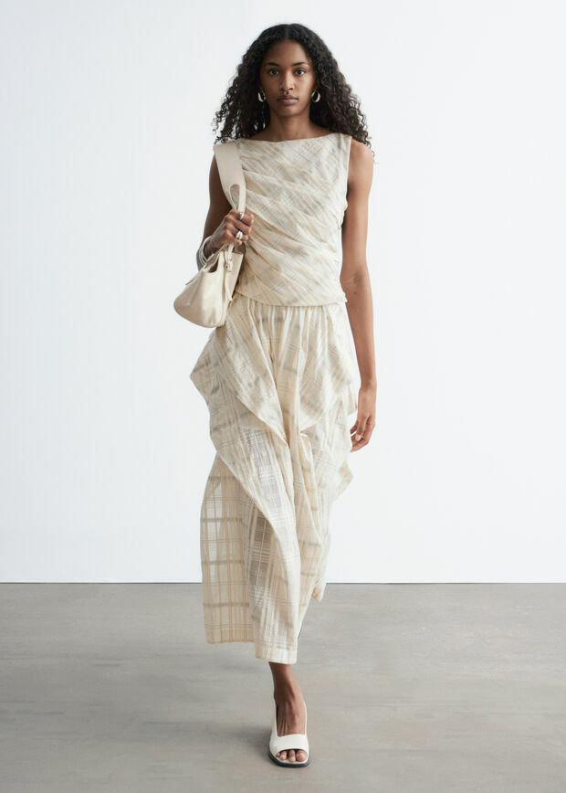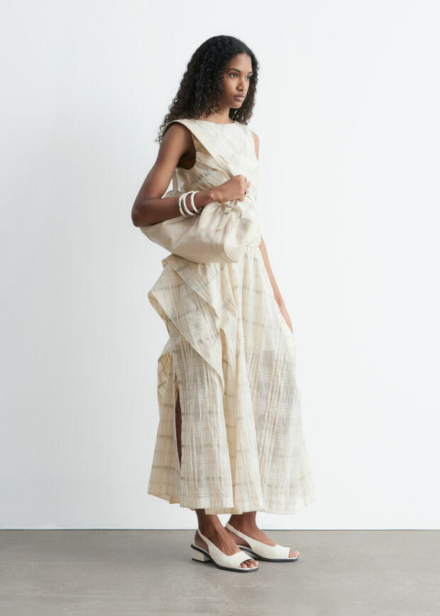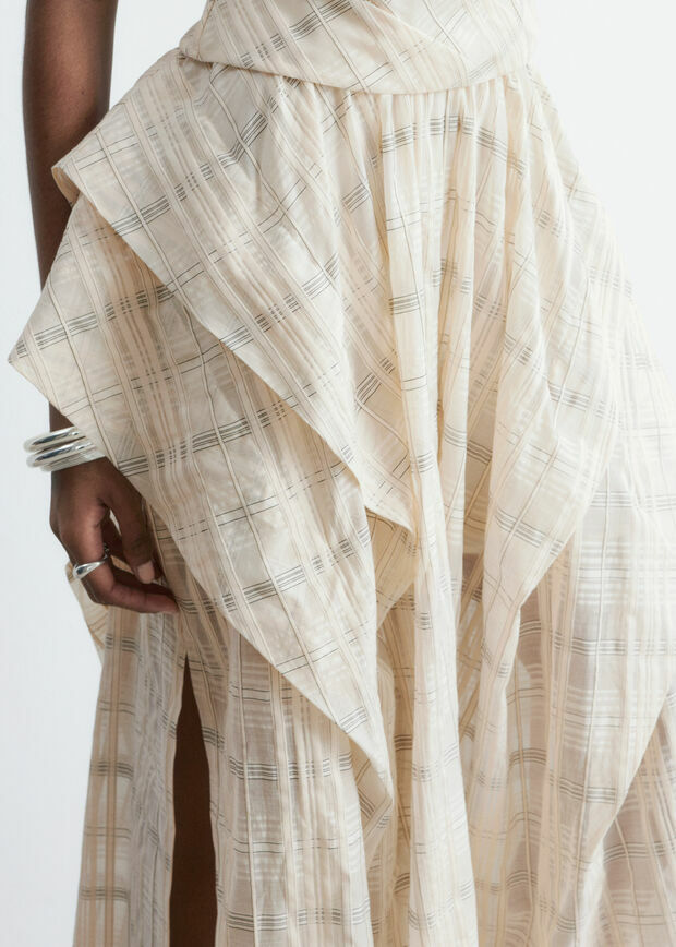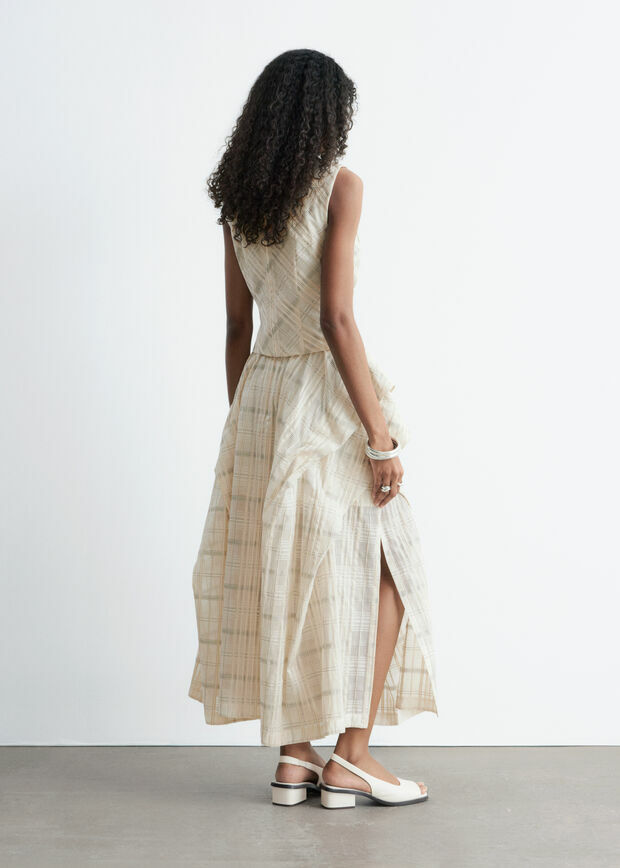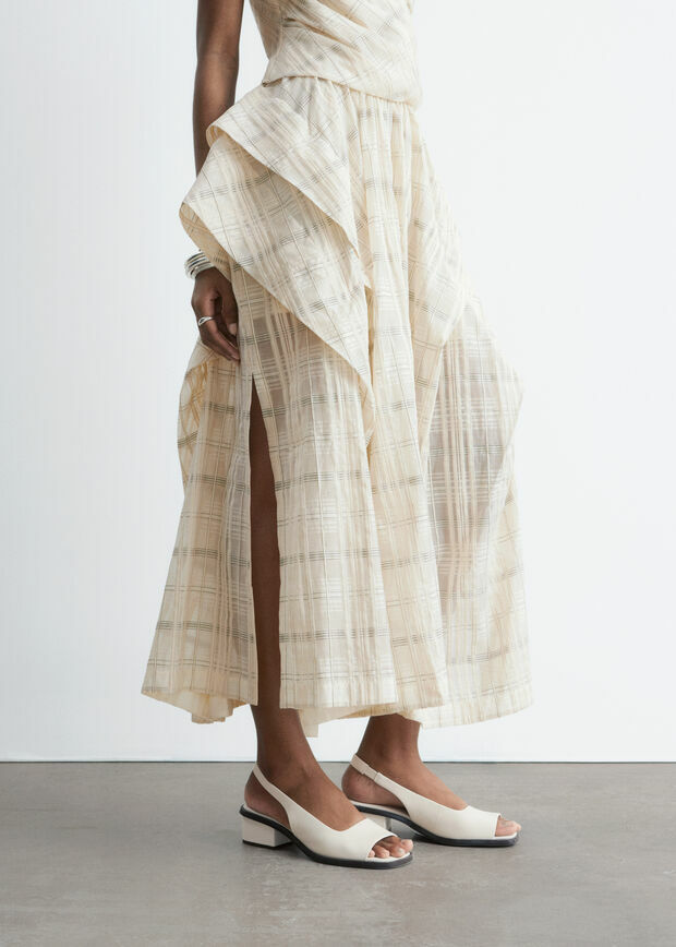 코튼 소재의 미디 스커트예요. 볼륨감 있는 실루엣, 허리의 개더링 주름, 그리고 양쪽 측면부의 넓은 스티치 주름이 구조감과 움직임을 더해주어요. 옆면 트임, 후크 앤 바 여밈, 뒷면 중앙의 히든 지퍼, 그리고 비침을 방지하는 짧은 이너 스커트가 자리해 있어요.