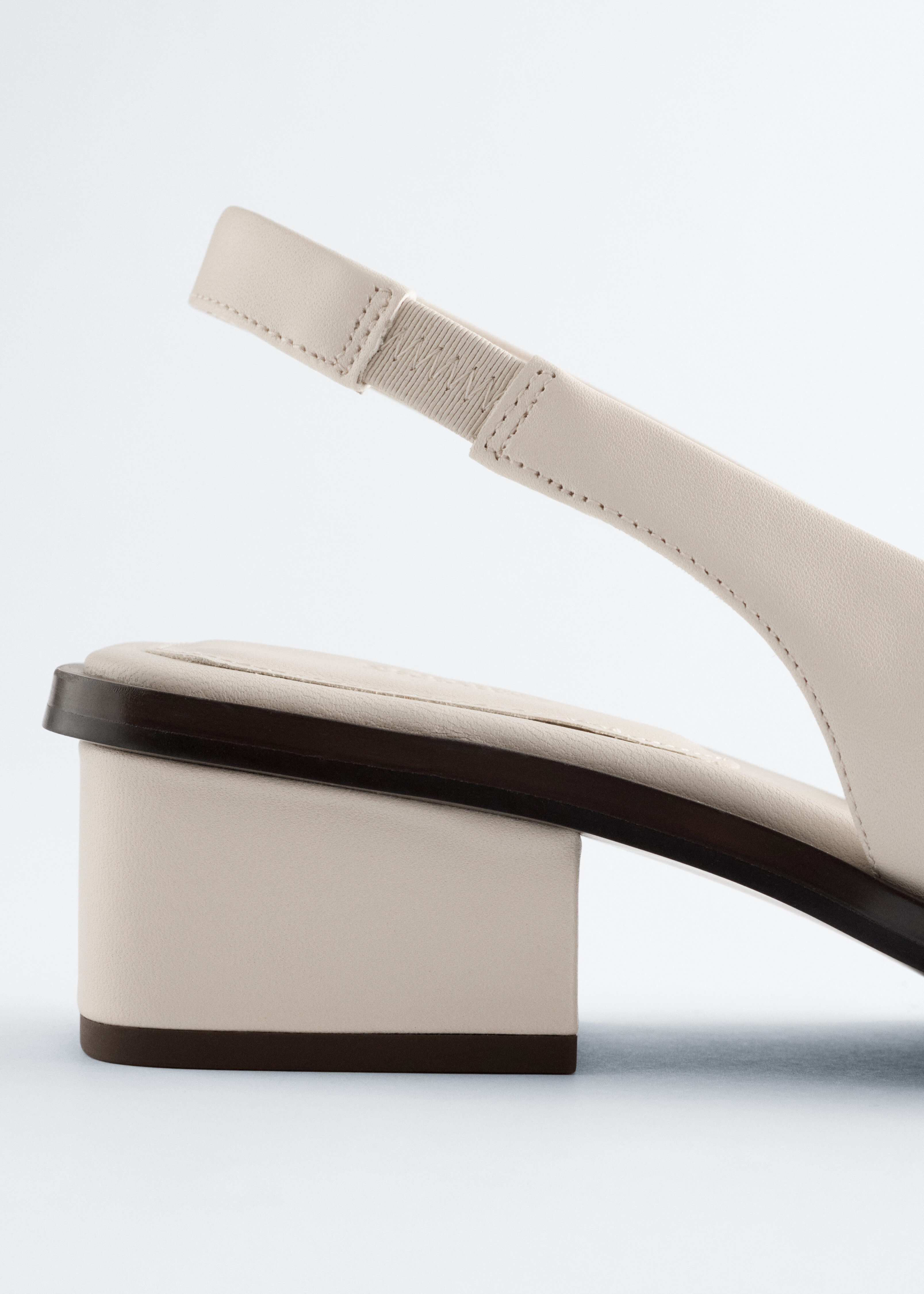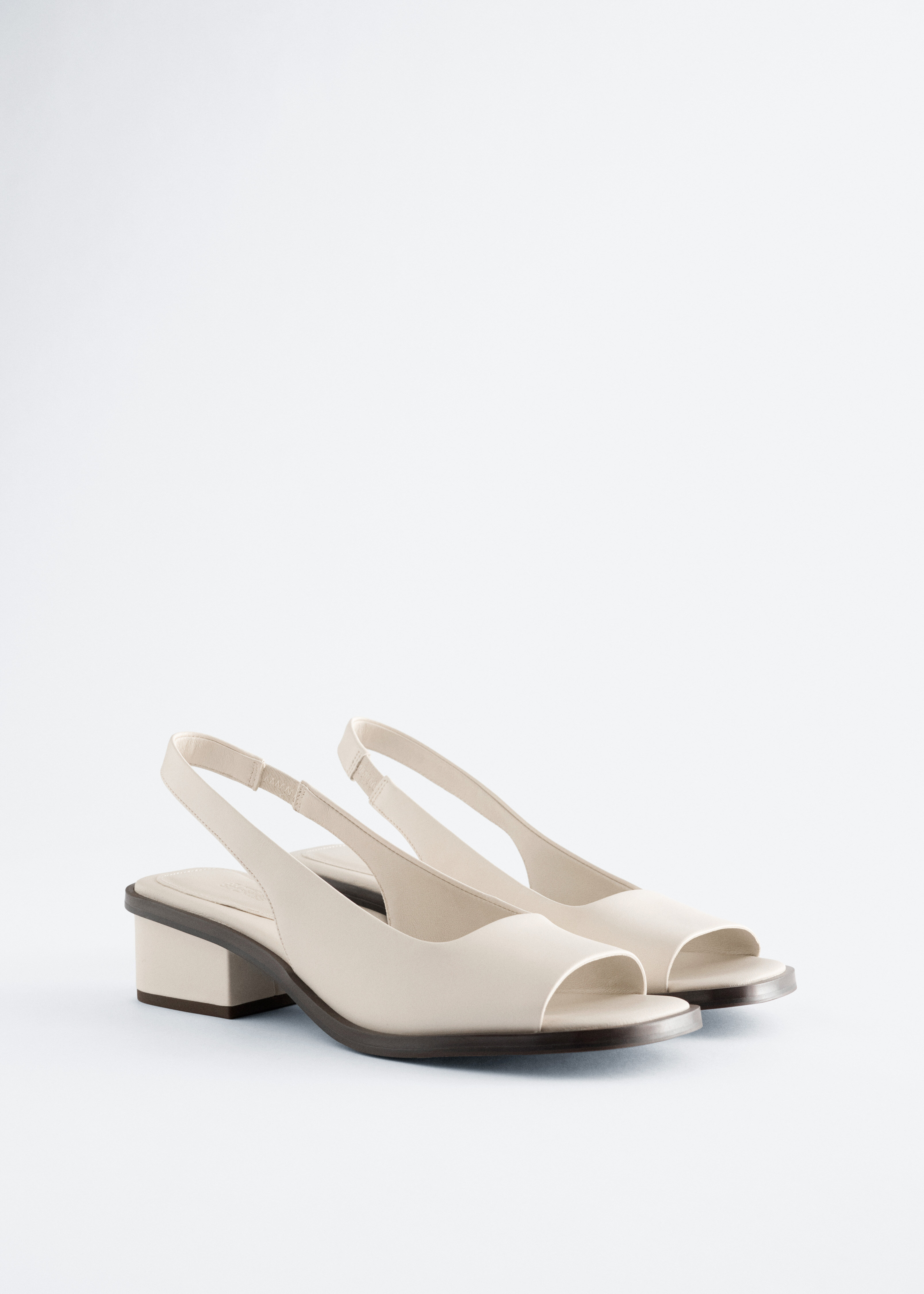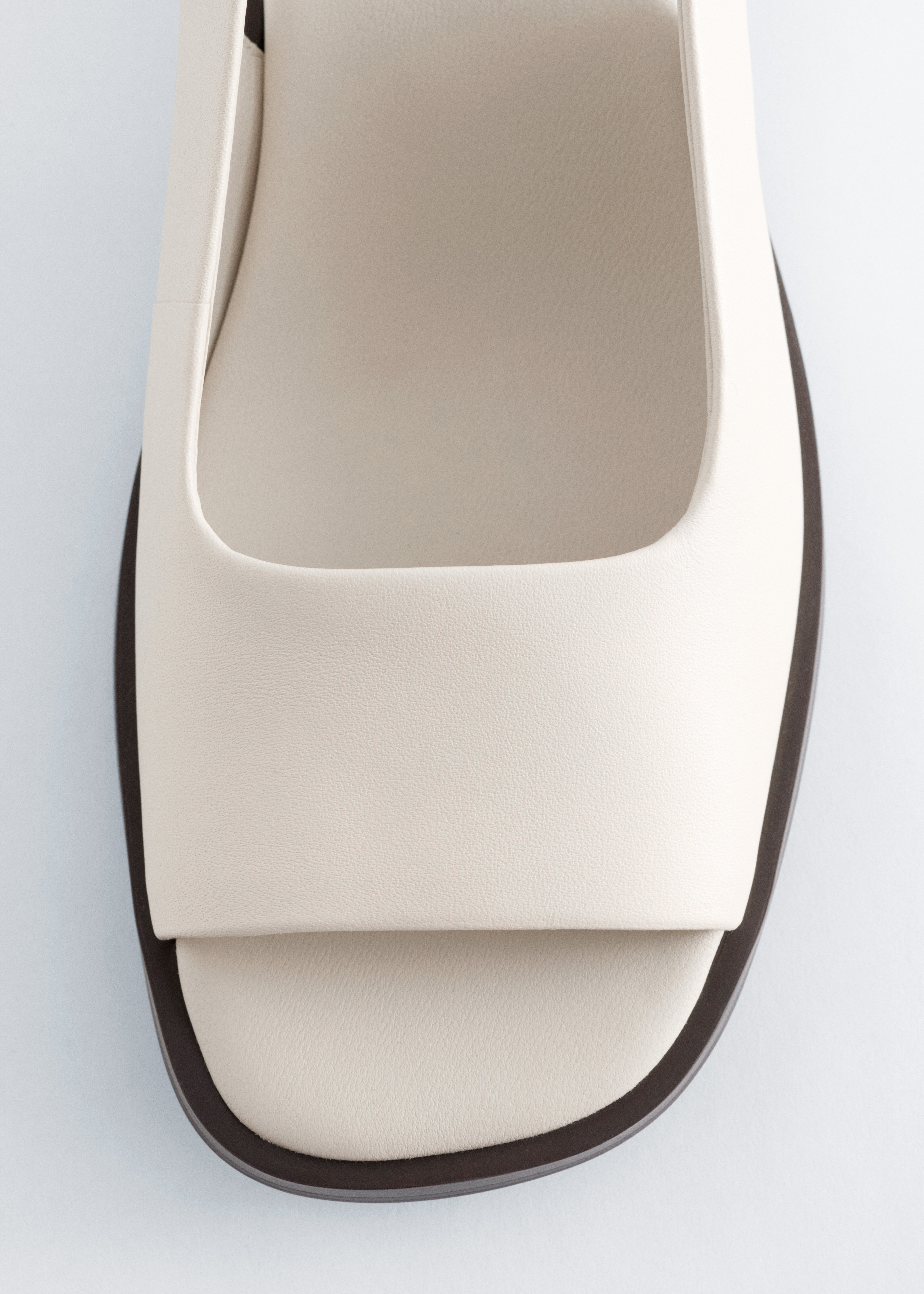 블록 힐과 곡선 스퀘어 앞코 디자인이 강렬한 무드를 연출하는 슬링백 샌들이에요. 유연한 나파 가죽으로 탄생했답니다. 엘라스틱 슬링백 스트랩이 안정적인 핏을 제공하며, 쿠션 처리된 인솔과 두께감 있는 밑창이 편안함을 더해주어요.