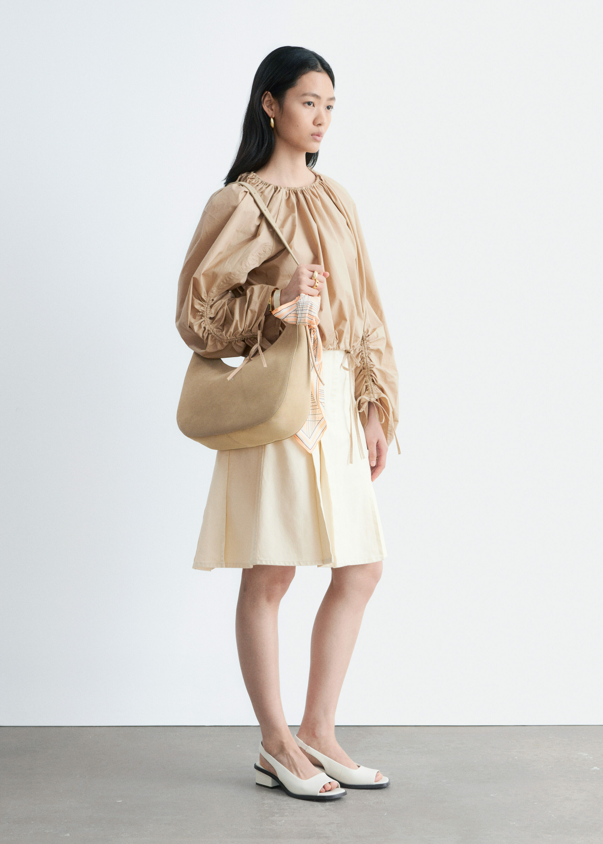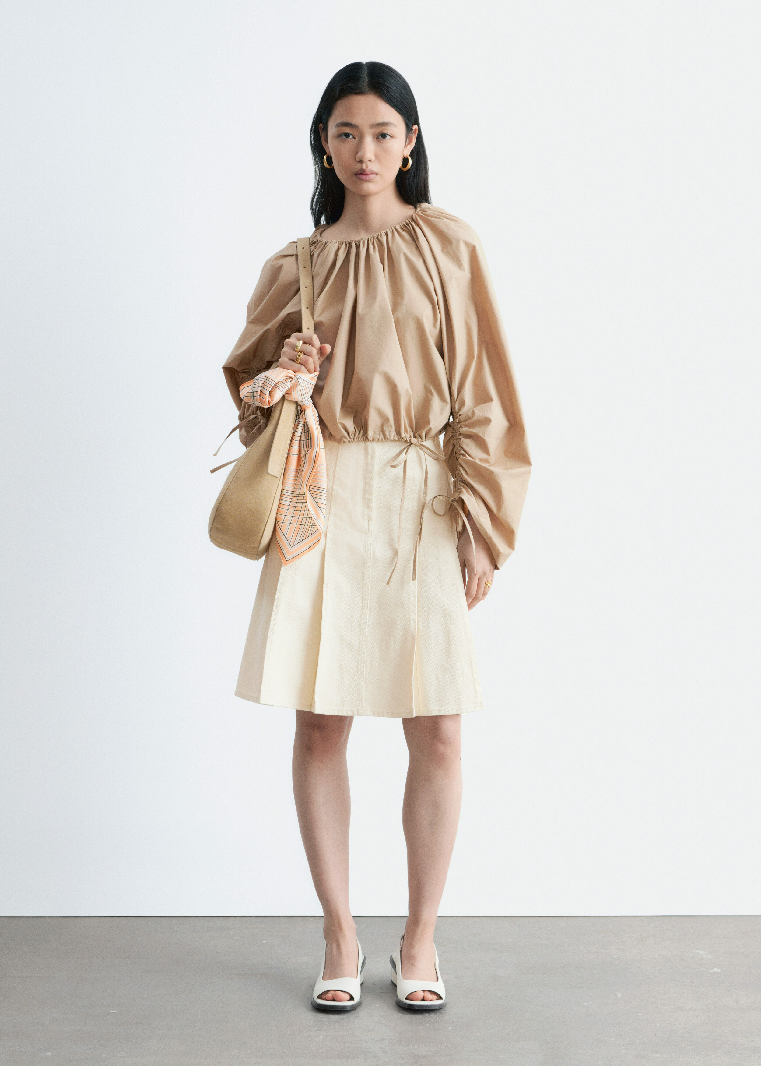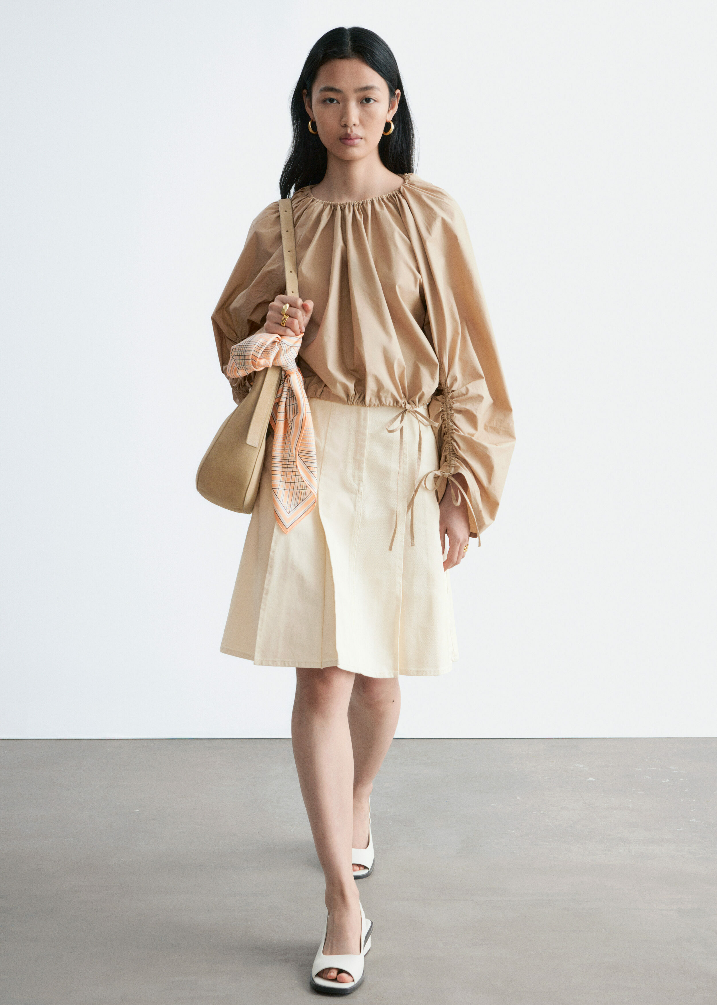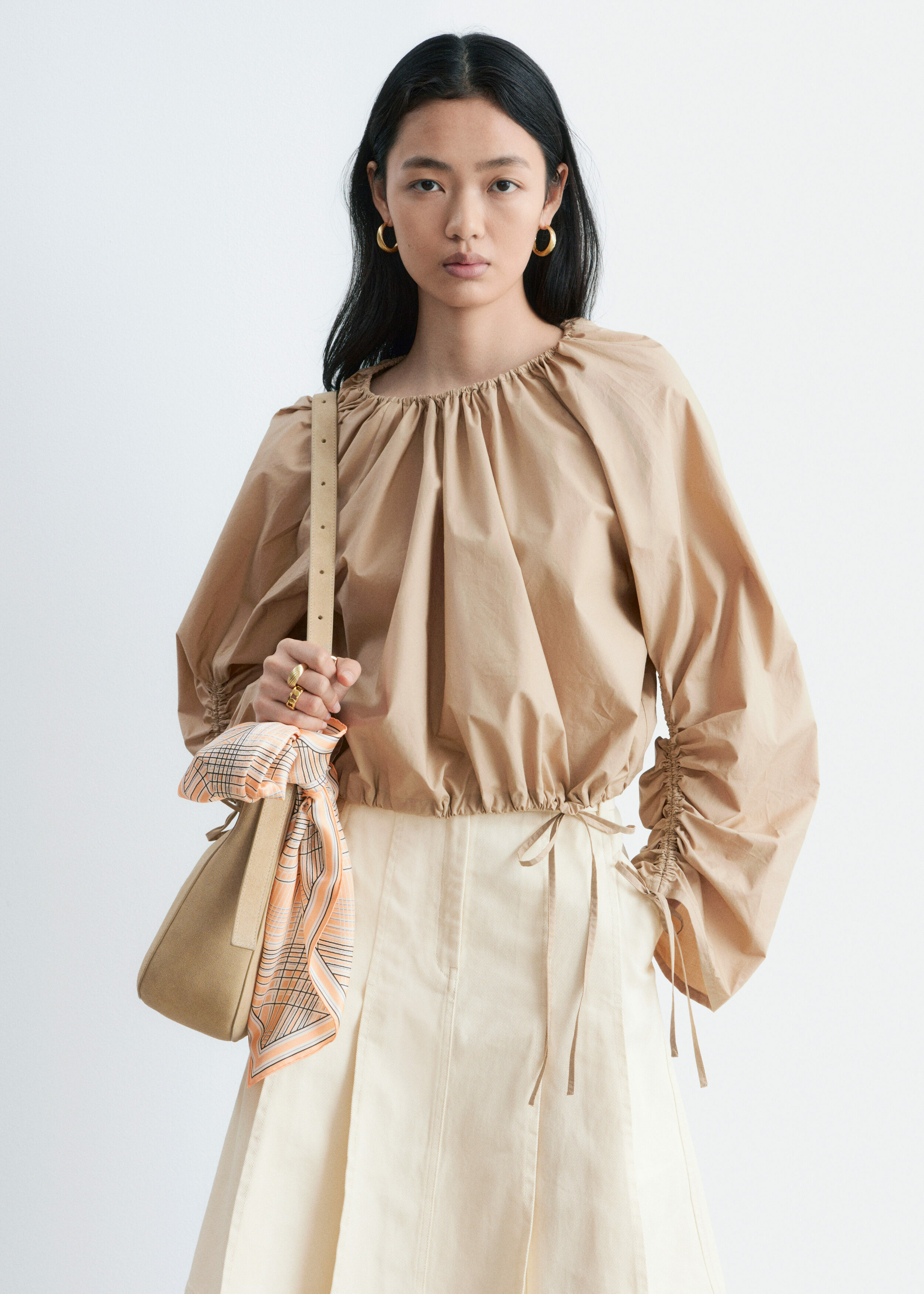 부드러움과 구조미가 멋스럽게 어우러진 블라우스예요. 산뜻한 코튼 소재에 자리한 셔링이 볼륨감과 텍스처를 더해주어요. 네크라인, 헴라인, 슬리브의 드로스트링 타이로 다양한 스타일링이 가능하답니다.