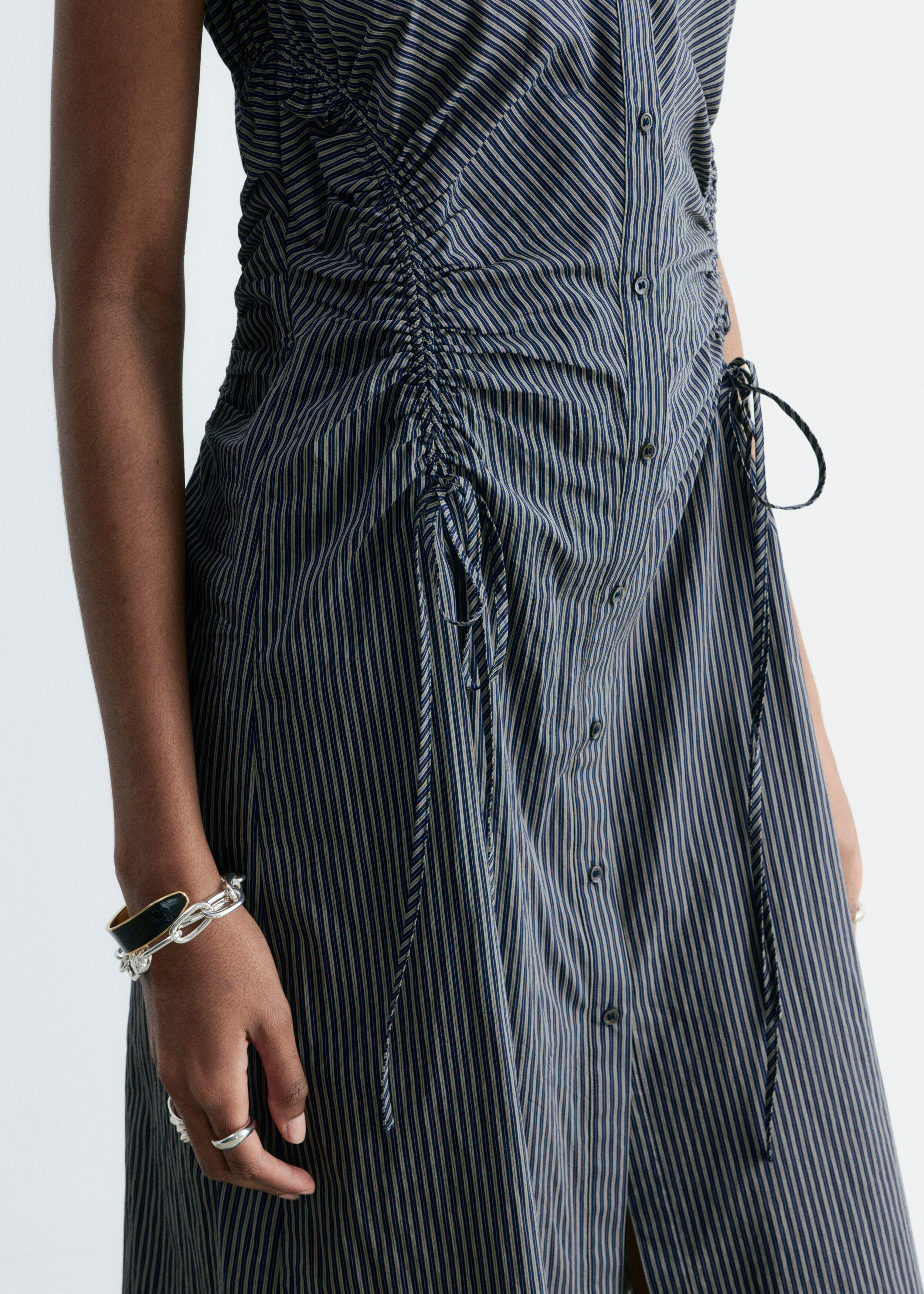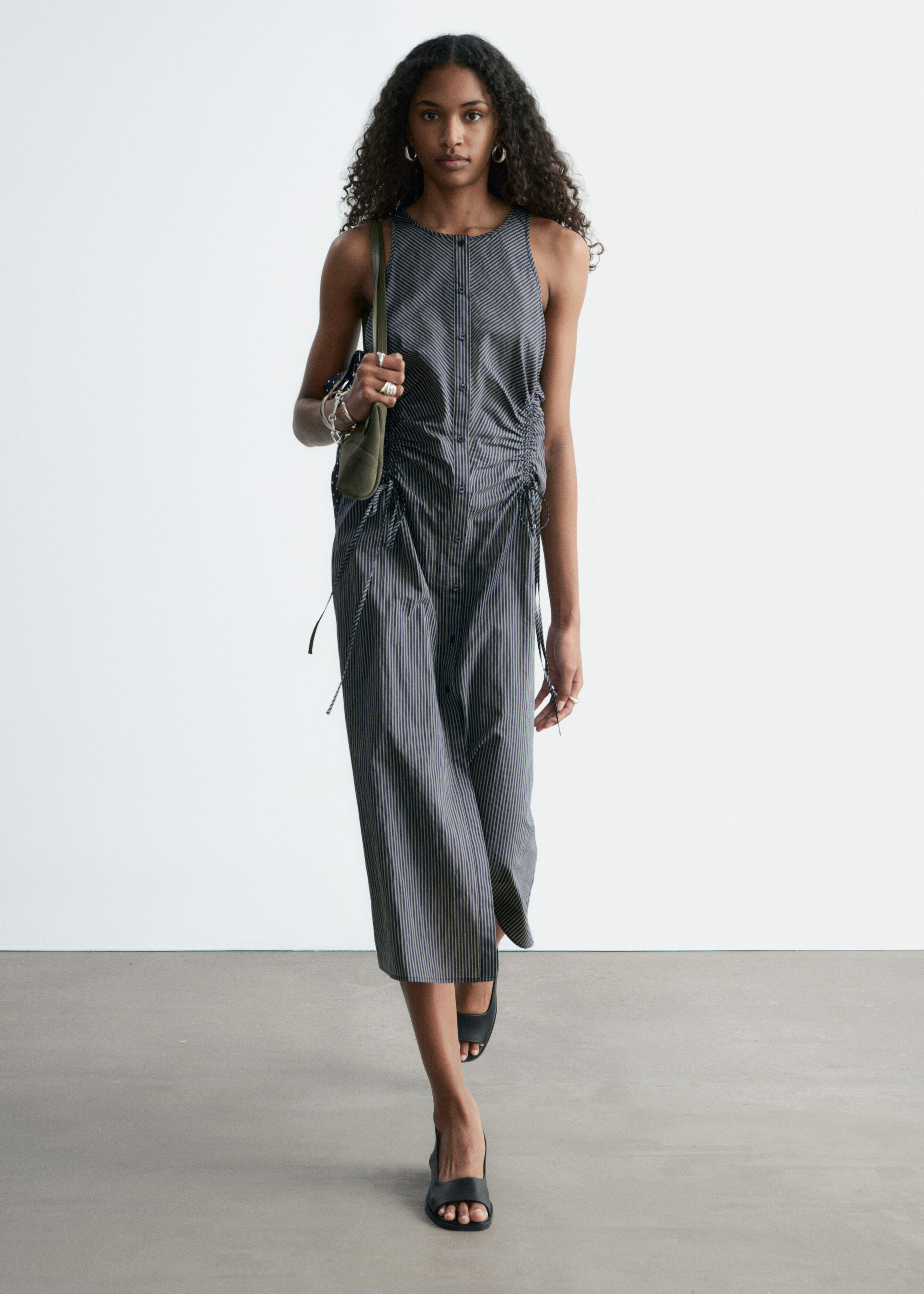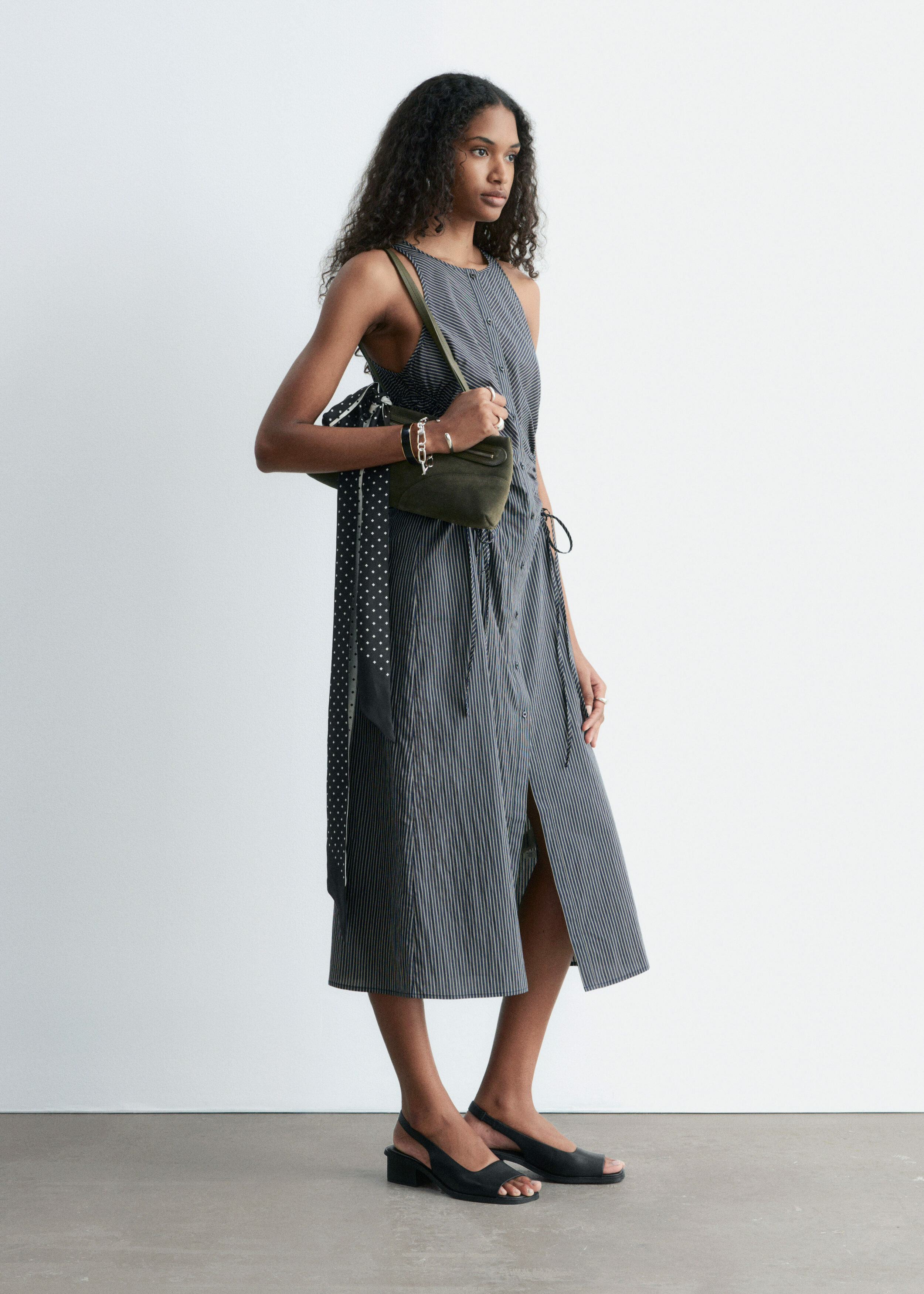 더없이 여성스러운 감성과 스포티한 무드가 어우러진 모던한 미디 드레스예요. 산뜻한 코튼 혼방 소재로 제작되어 쾌적하면서도 구조감이 좋답니다. 슬리브리스 실루엣이 특징으로, 드로스트링으로 강조한 웨이스트와 조절형 타이 클로저가 자리해 있어요.