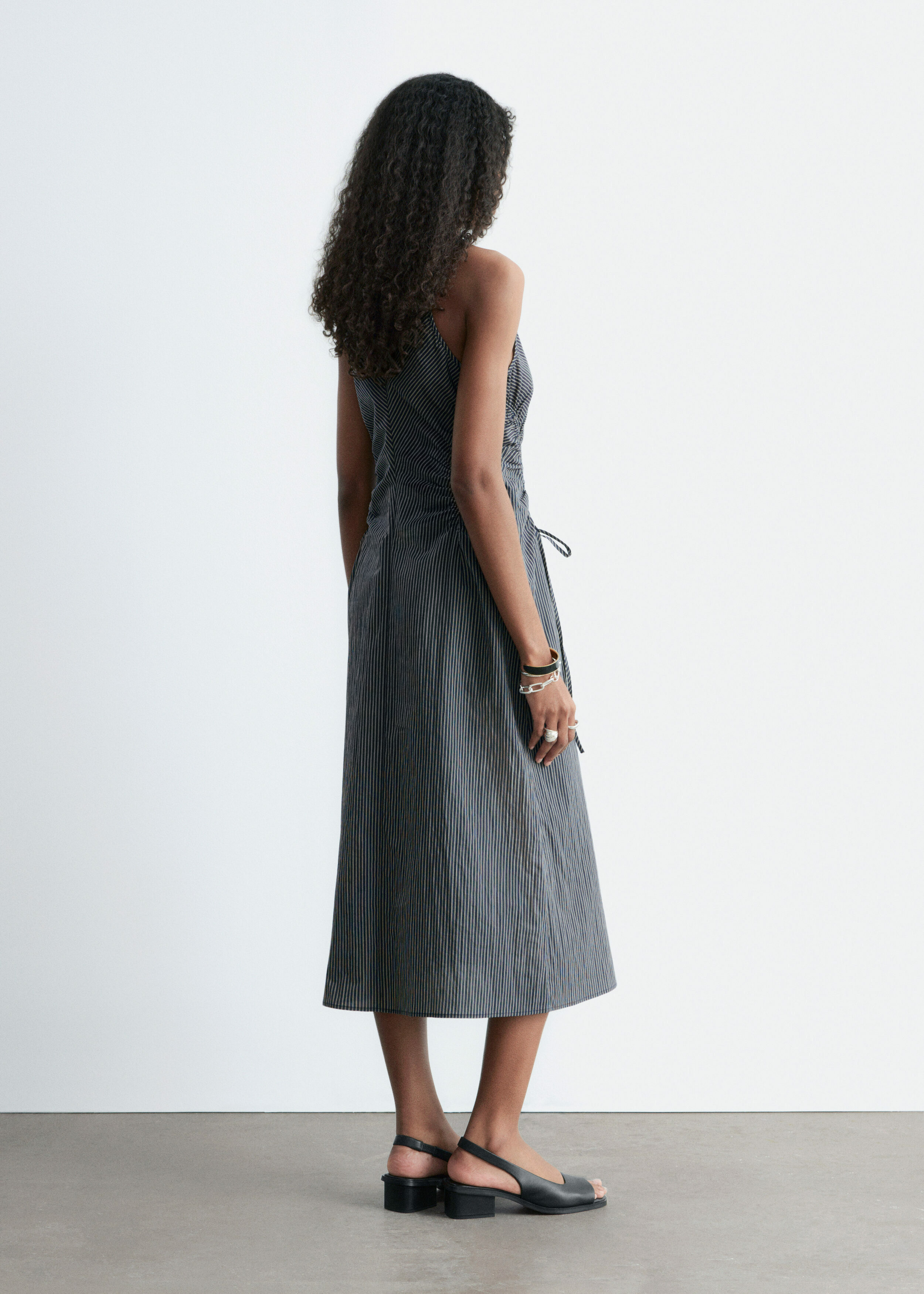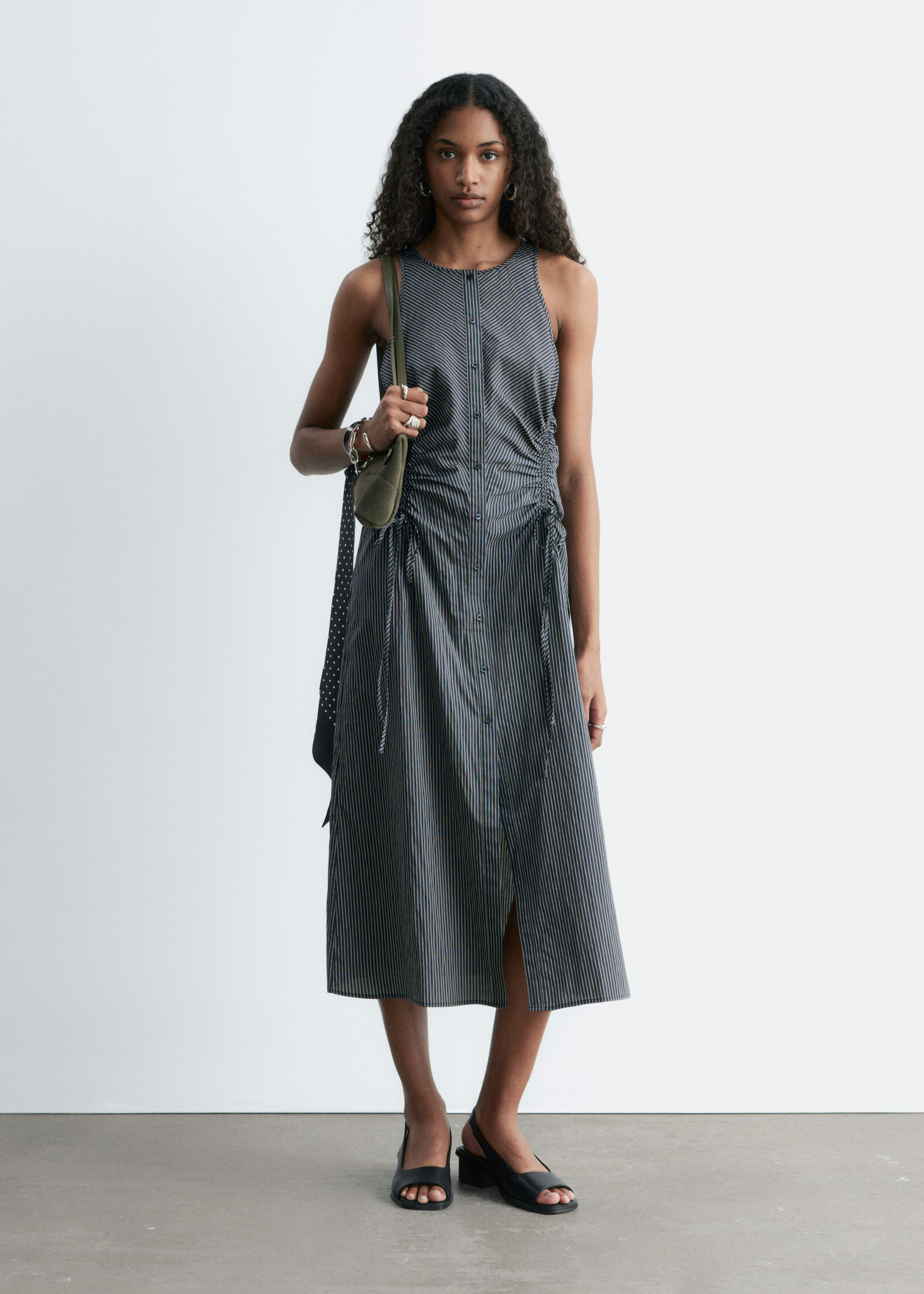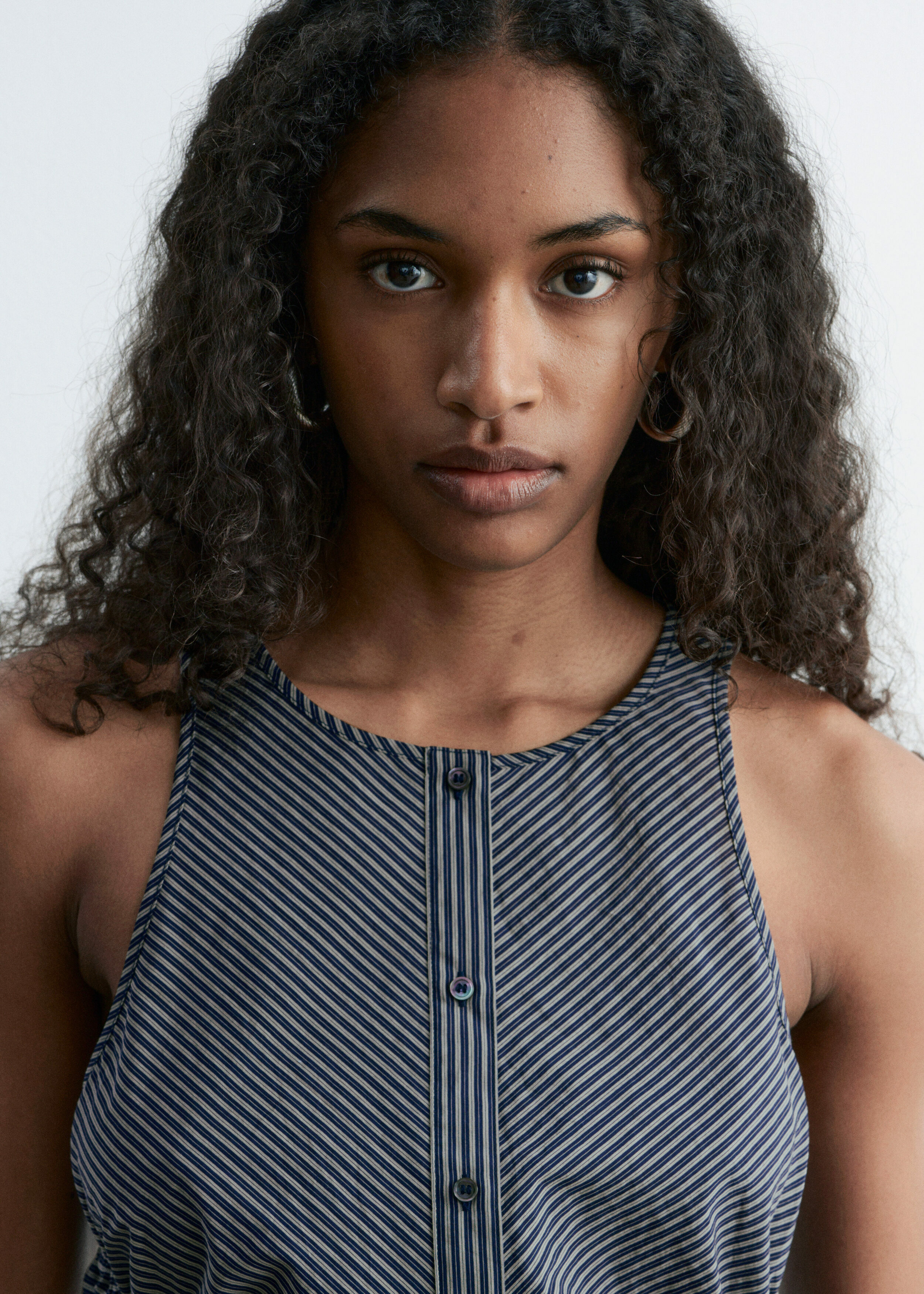 더없이 여성스러운 감성과 스포티한 무드가 어우러진 모던한 미디 드레스예요. 산뜻한 코튼 혼방 소재로 제작되어 쾌적하면서도 구조감이 좋답니다. 슬리브리스 실루엣이 특징으로, 드로스트링으로 강조한 웨이스트와 조절형 타이 클로저가 자리해 있어요.