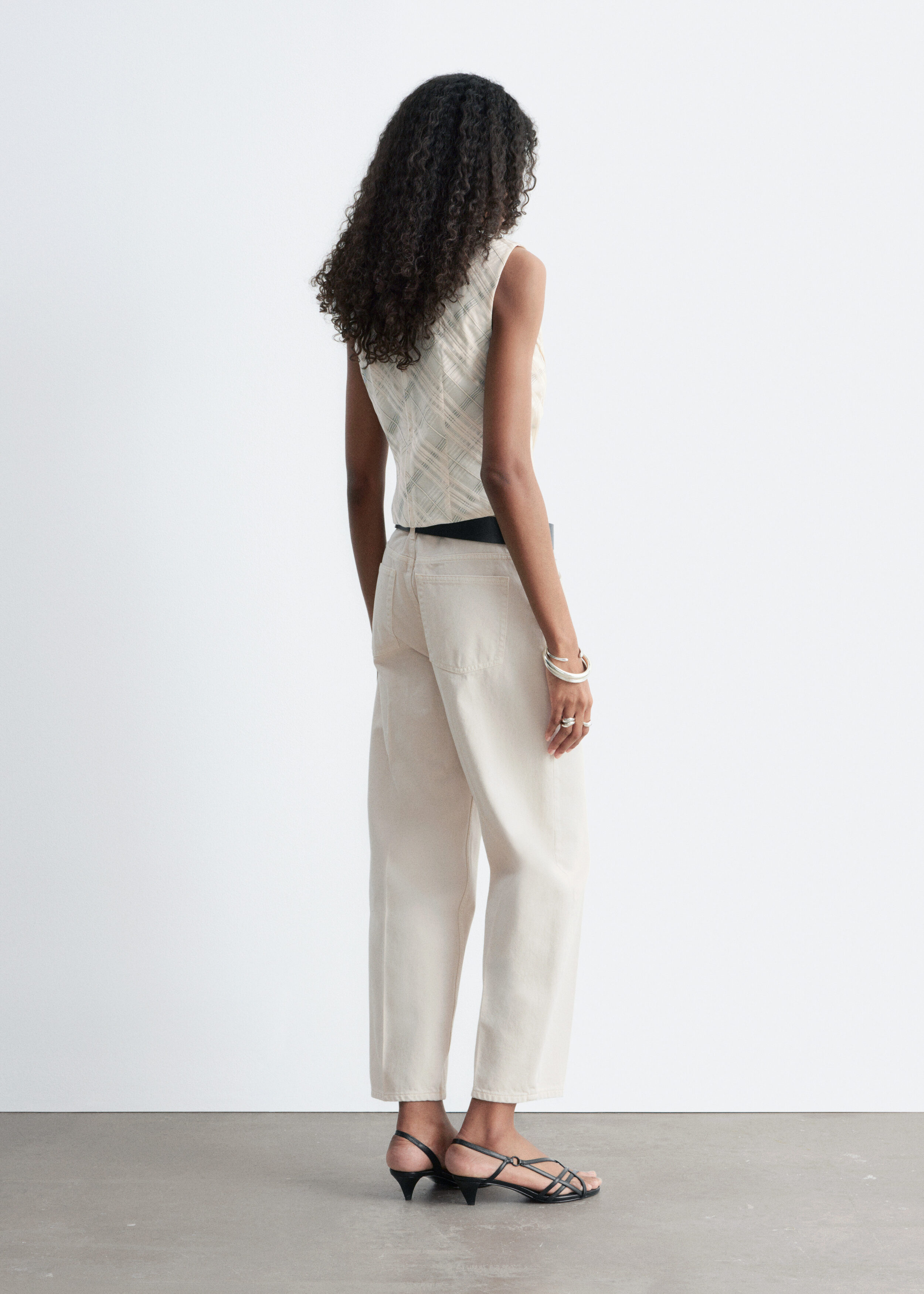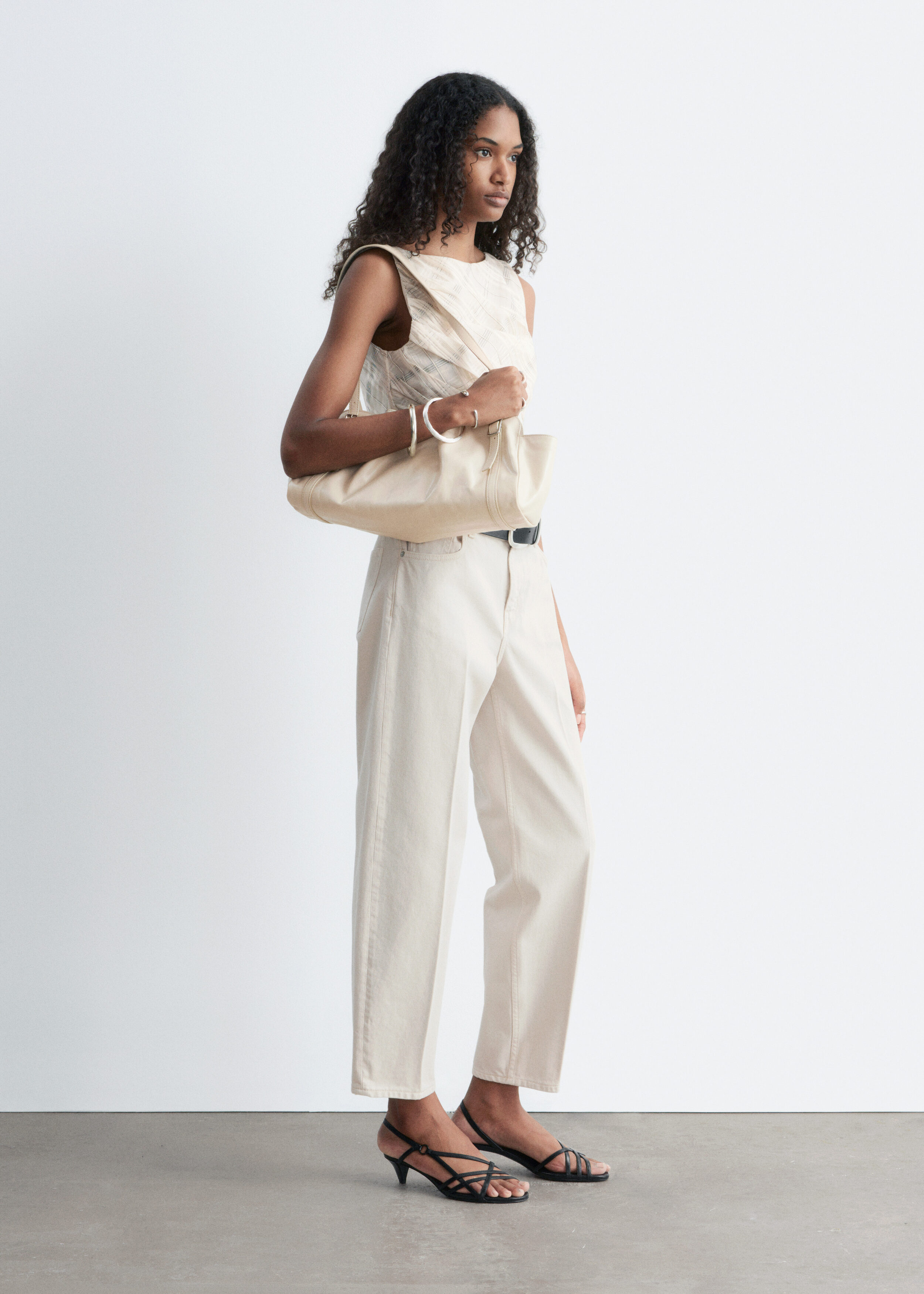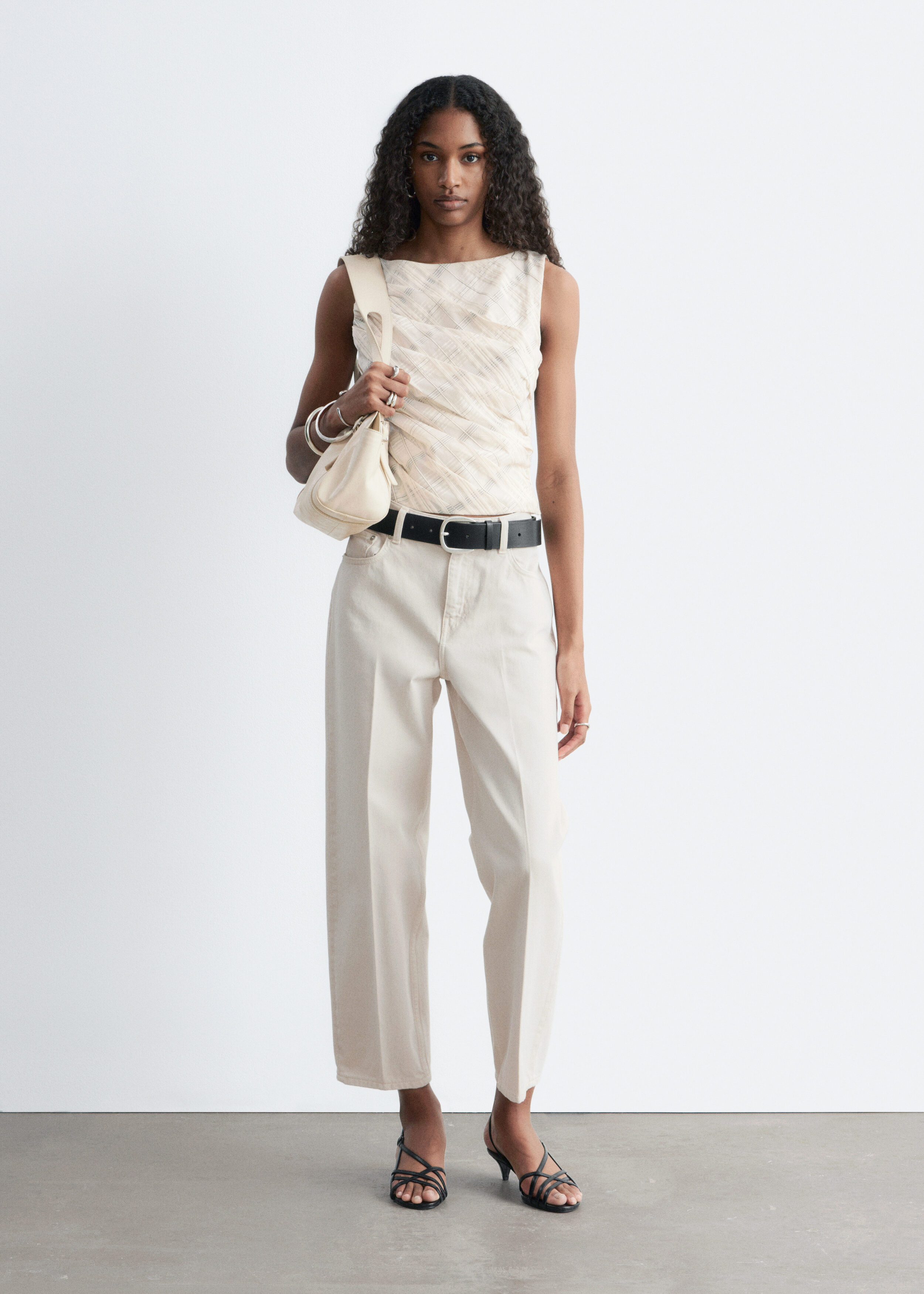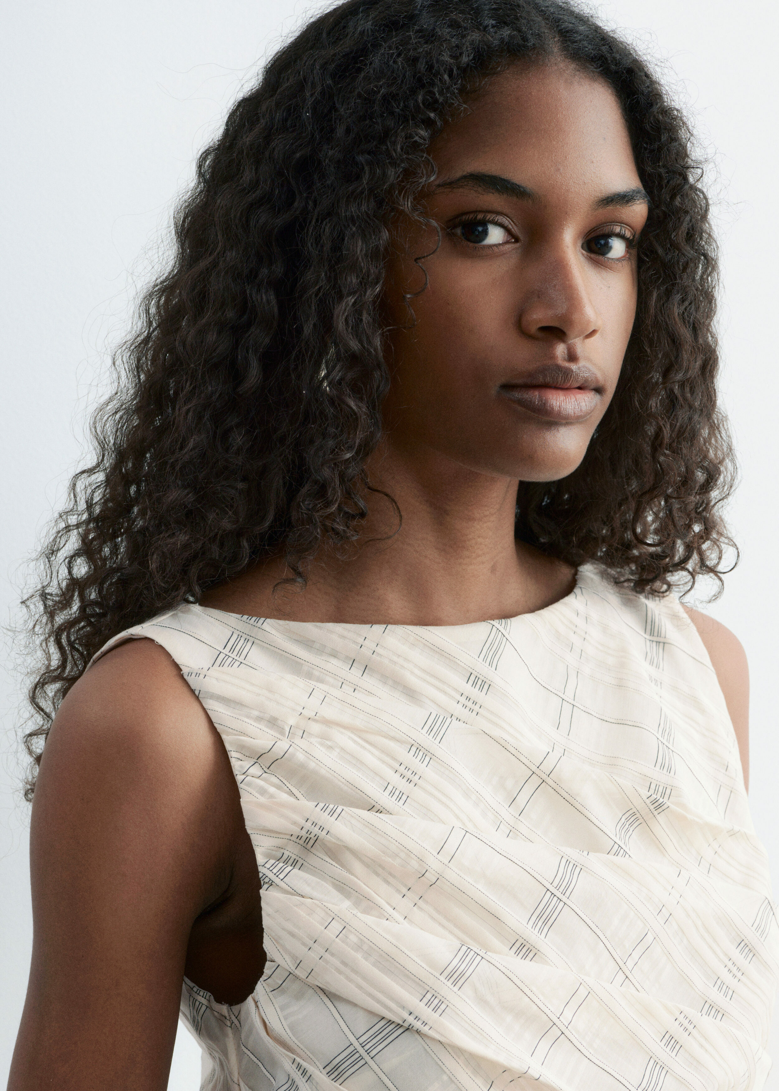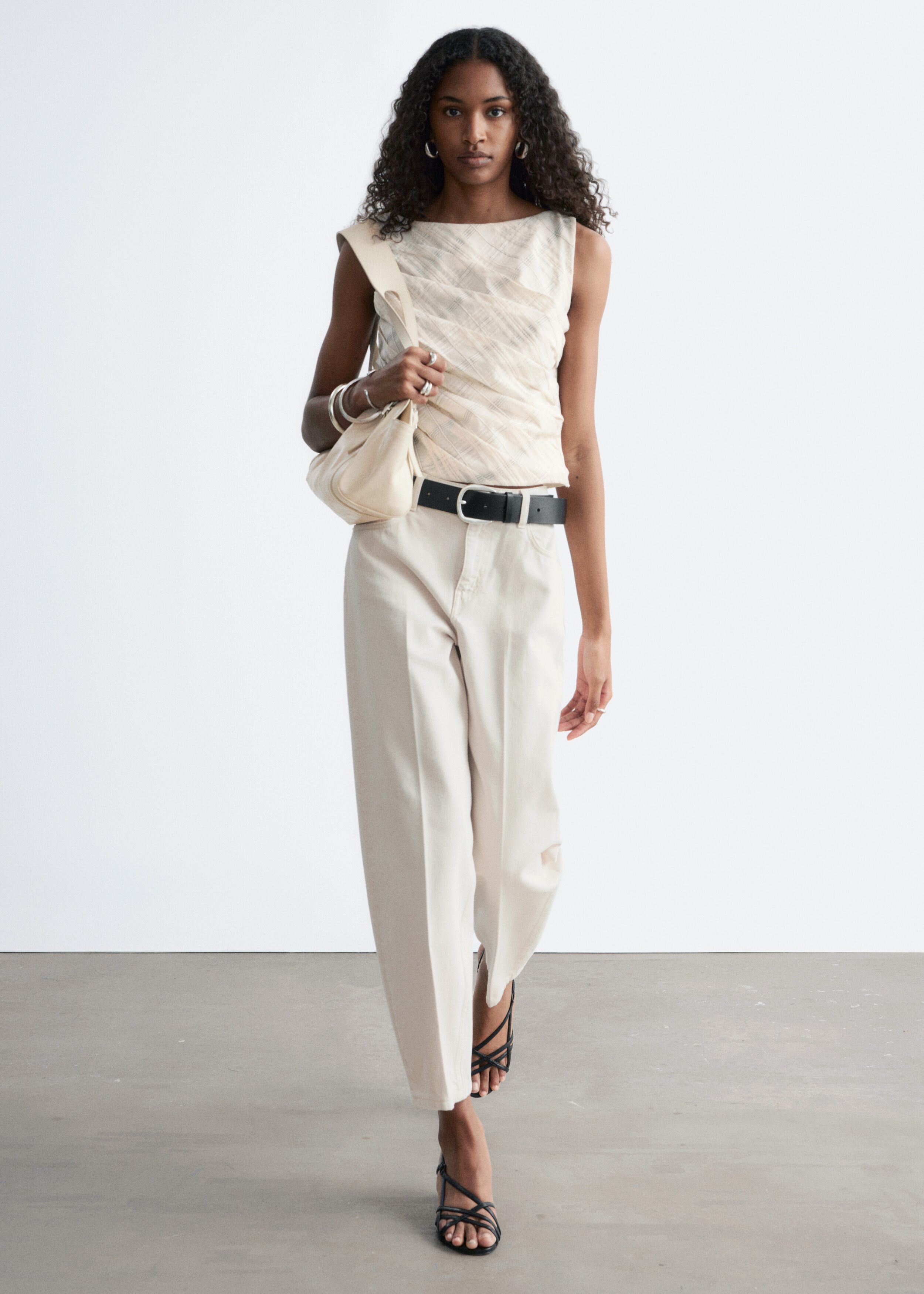 은은한 텍스처와 깔끔한 라인이 돋보이는 슬리브리스 탑이에요. 가벼운 코튼 소재로 탄생했으며, 정교한 주름 디테일이 구조감과 깊이를 더한답니다. 우아한 보트넥과 짧은 기장감으로 모던하고 활용도 높은 실루엣을 연출하며, 스커트나 트라우저와 자연스럽게 매치할 수 있어요.