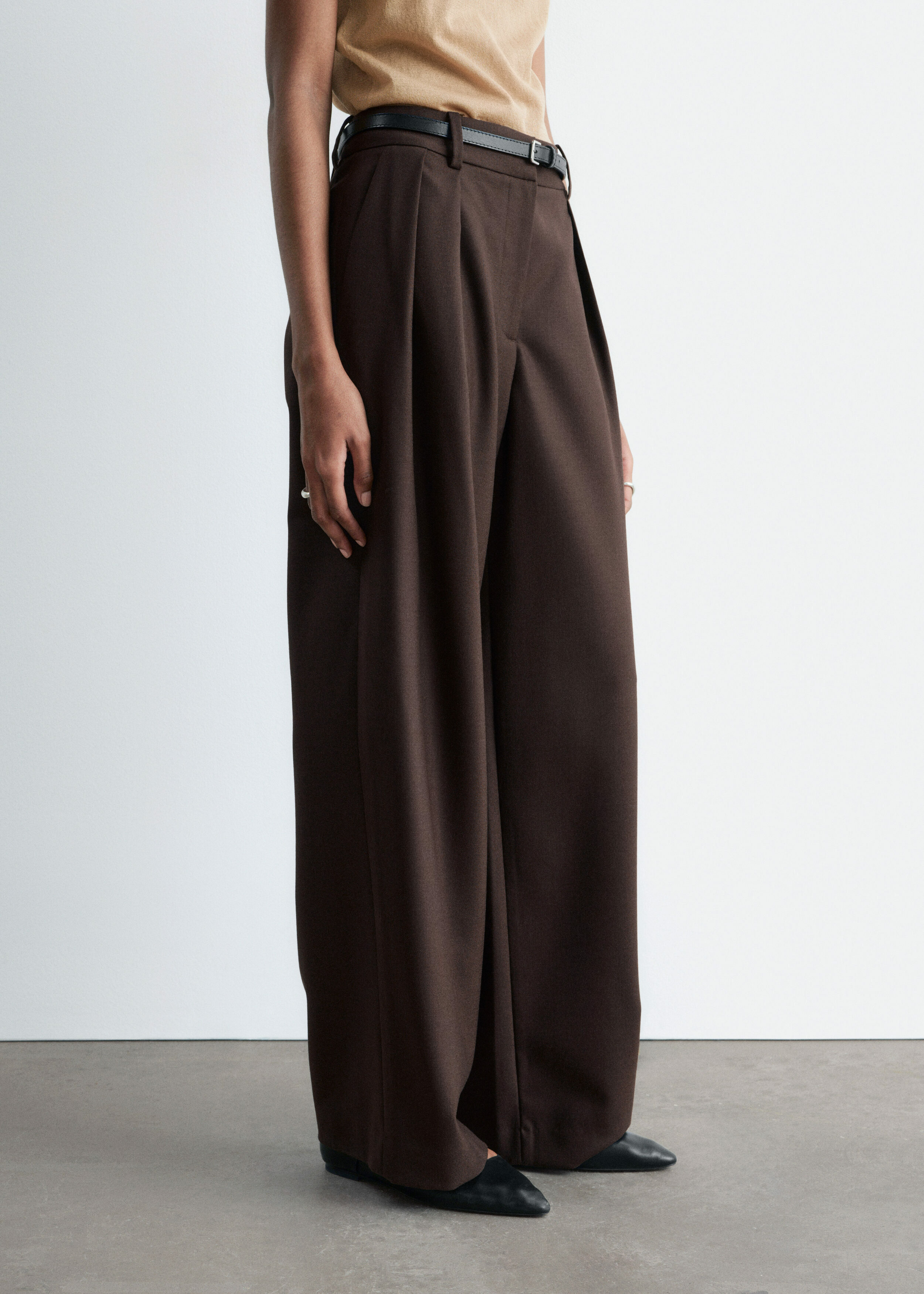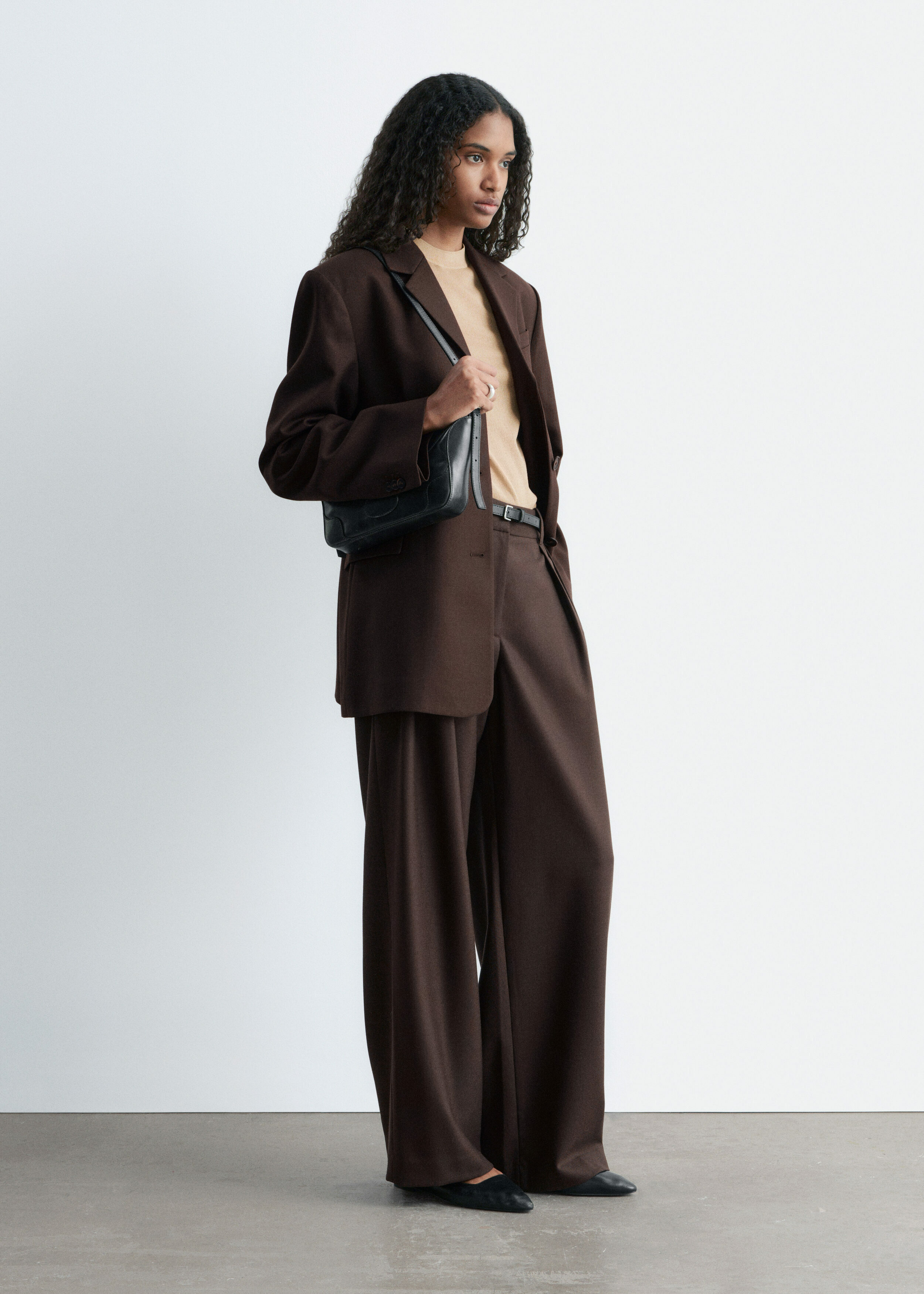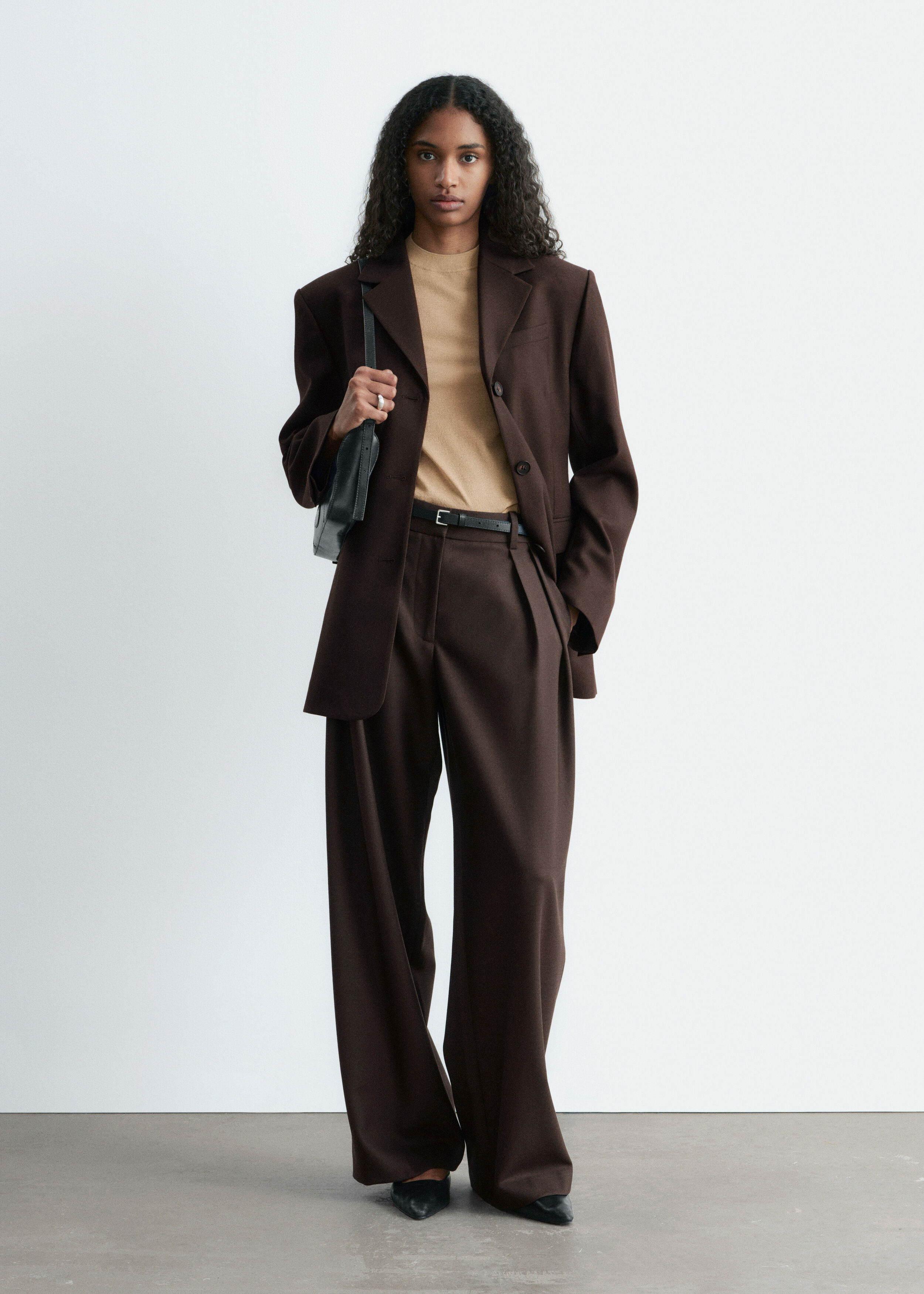 울 혼방 소재로 탄생한 트라우저예요. 레귤러 웨이스트, 그리고 롱 & 와이드 레그의 플리츠가 특징이랍니다. 측면의 사선 포켓, 지퍼 플라이와 후크 앤 바 & 단추, 뒷면의 웰트 포켓이 자리해 있어요.