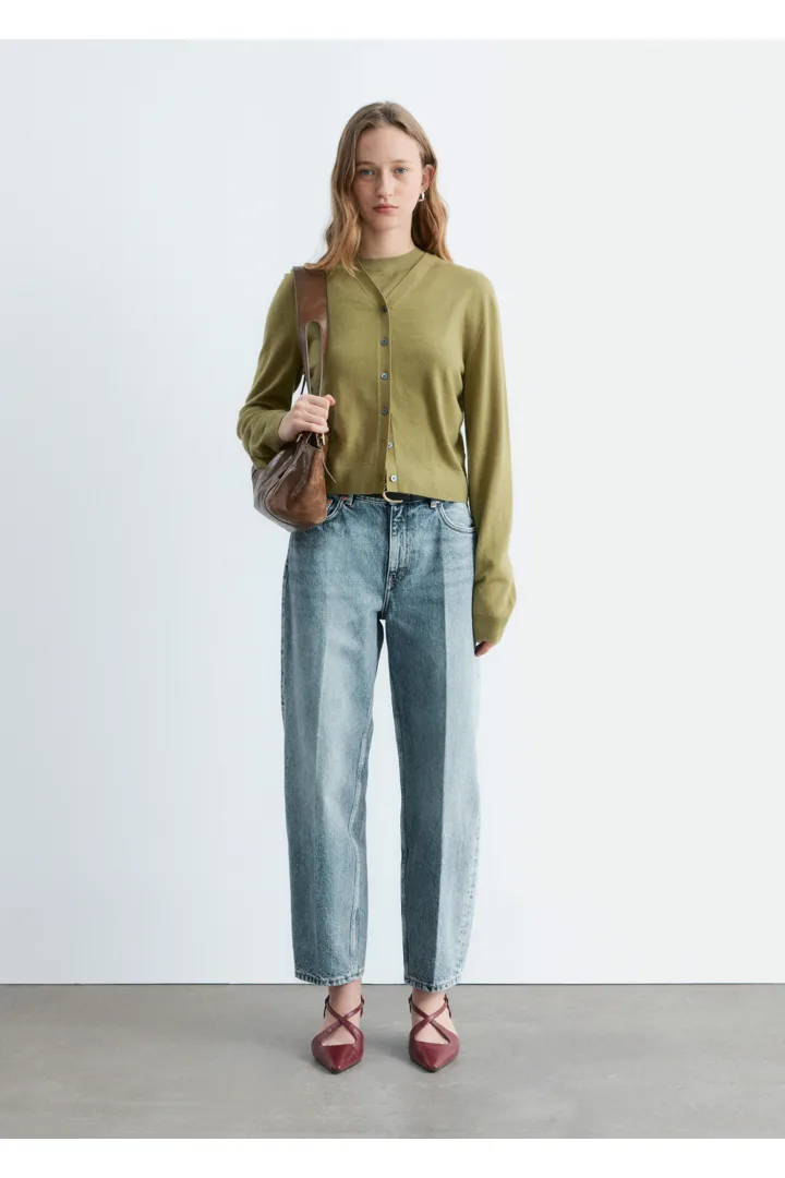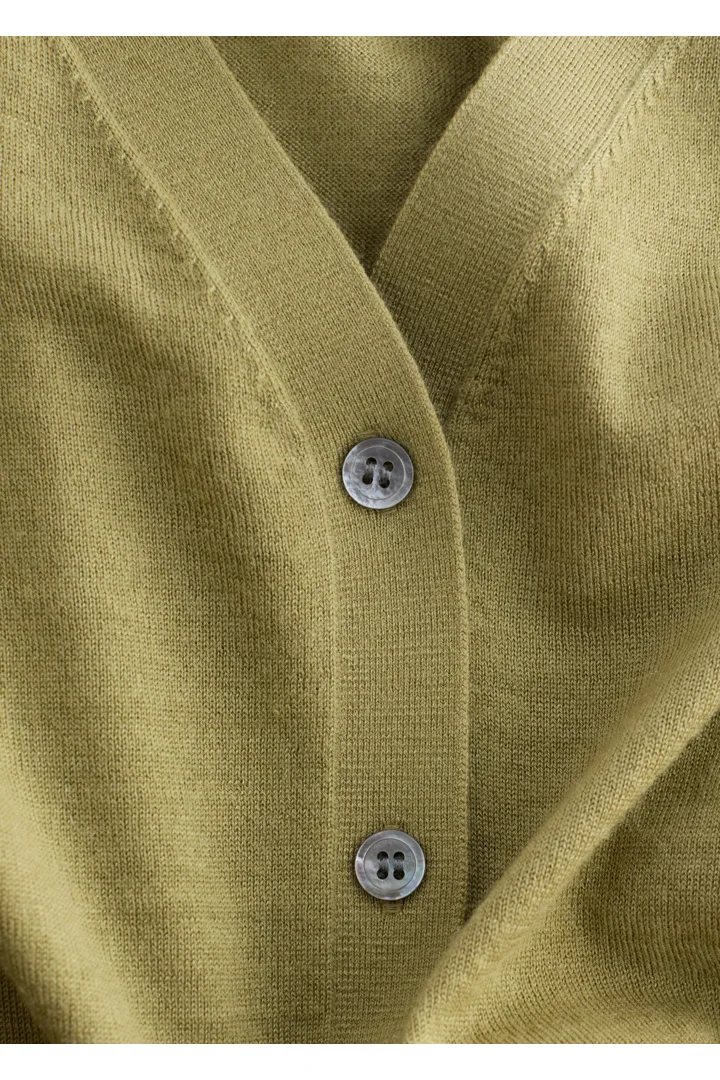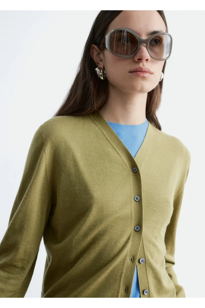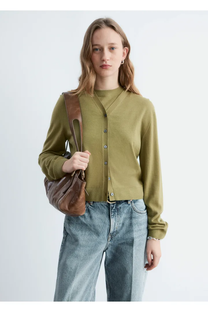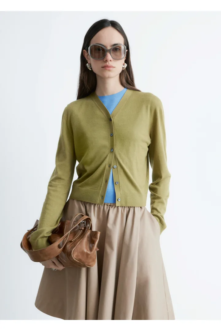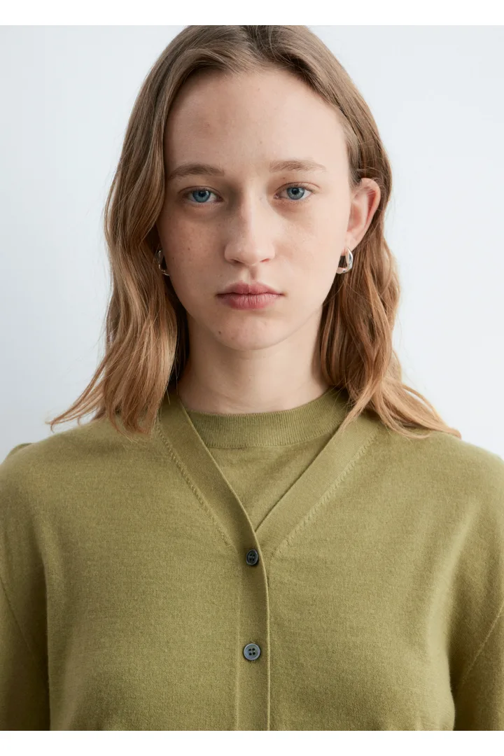 100% 캐시미어 소재로 섬세하게 니팅된 가디건이에요. 힙까지 오는 스트레이트 실루엣, 립 트리밍, 그리고 앞면의 단추가 특징이에요.