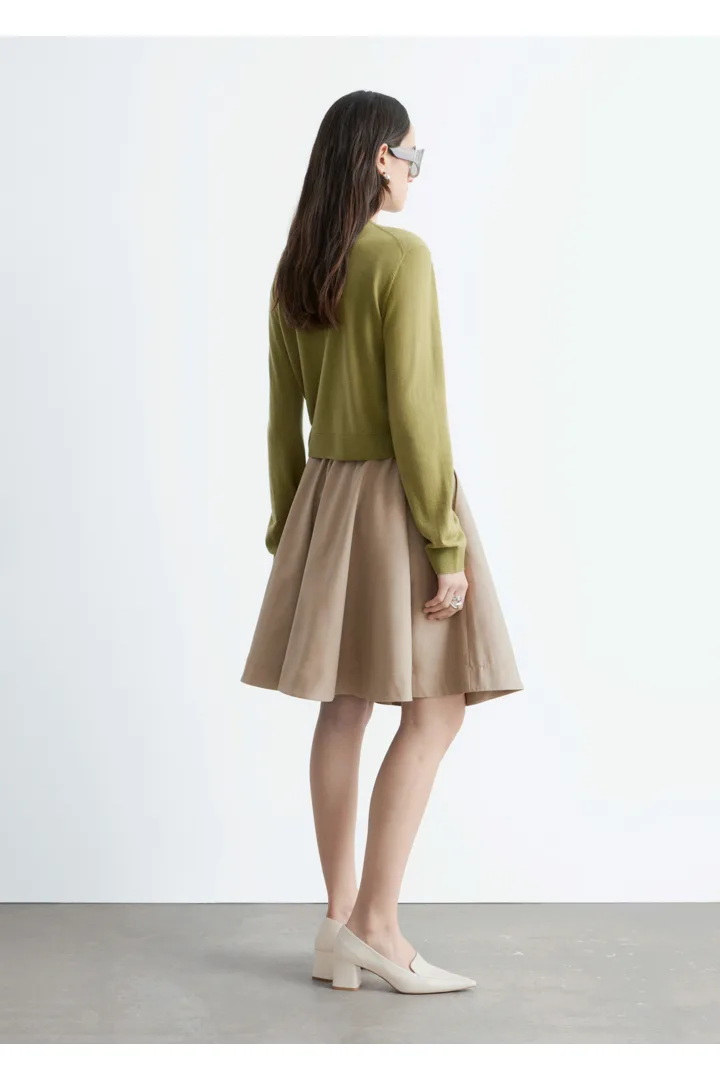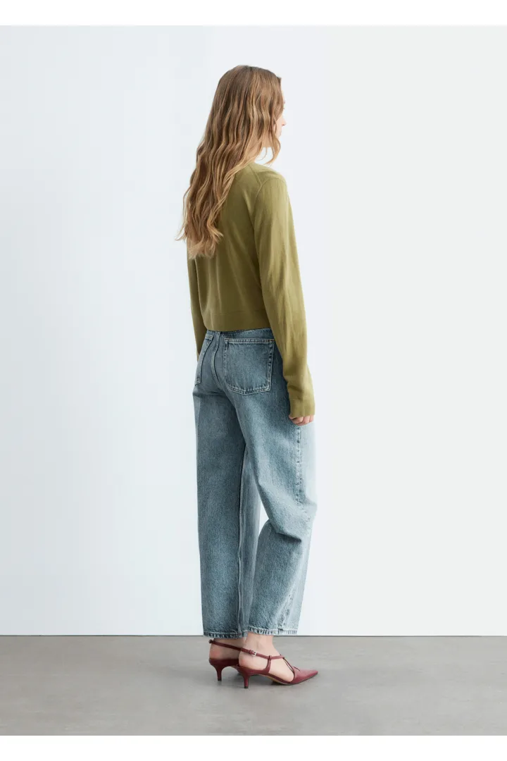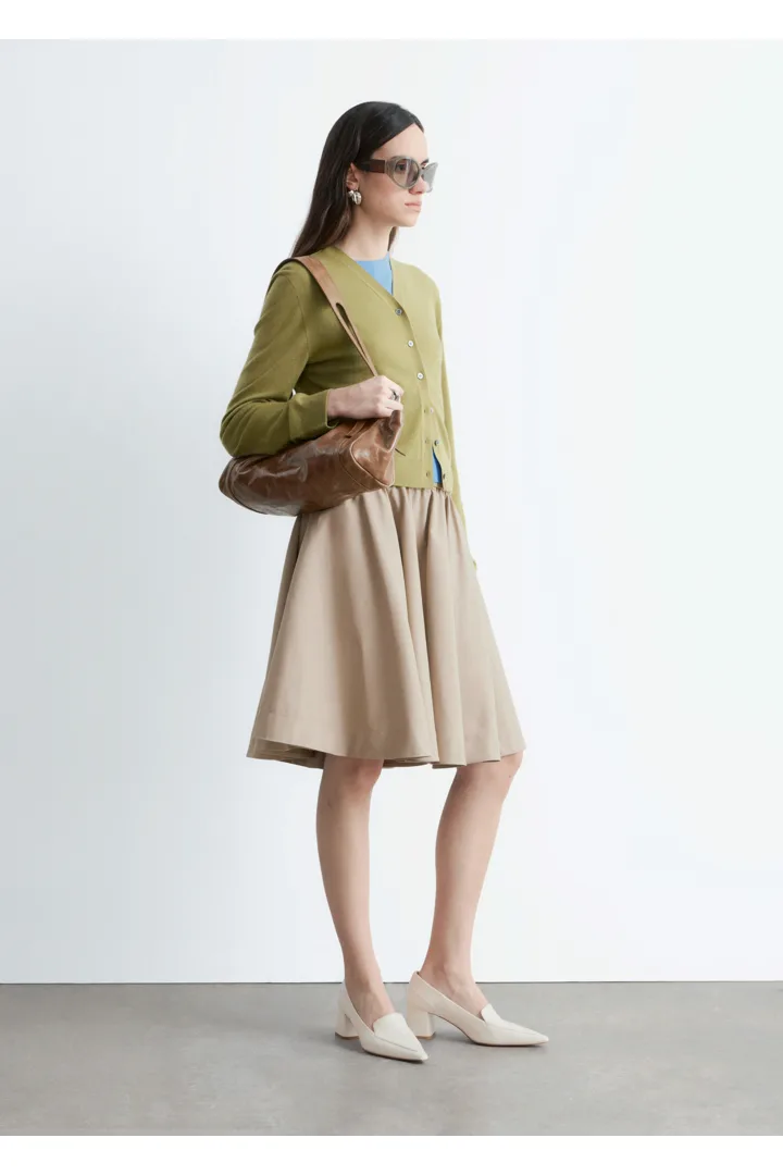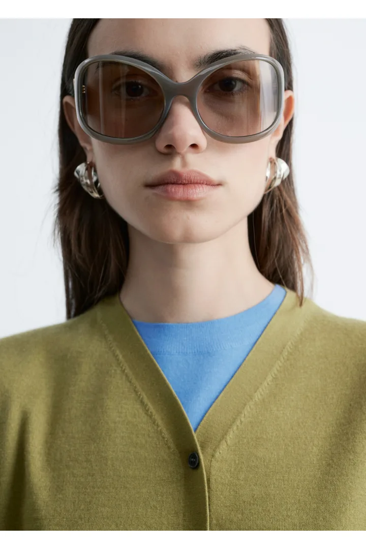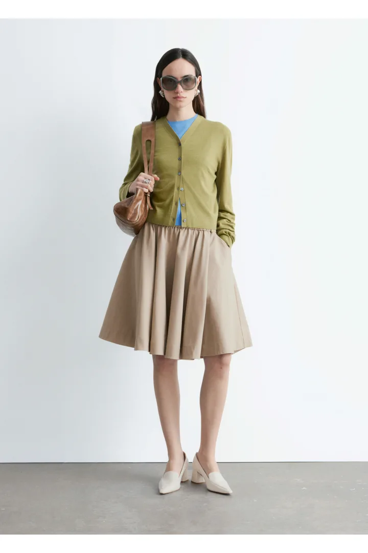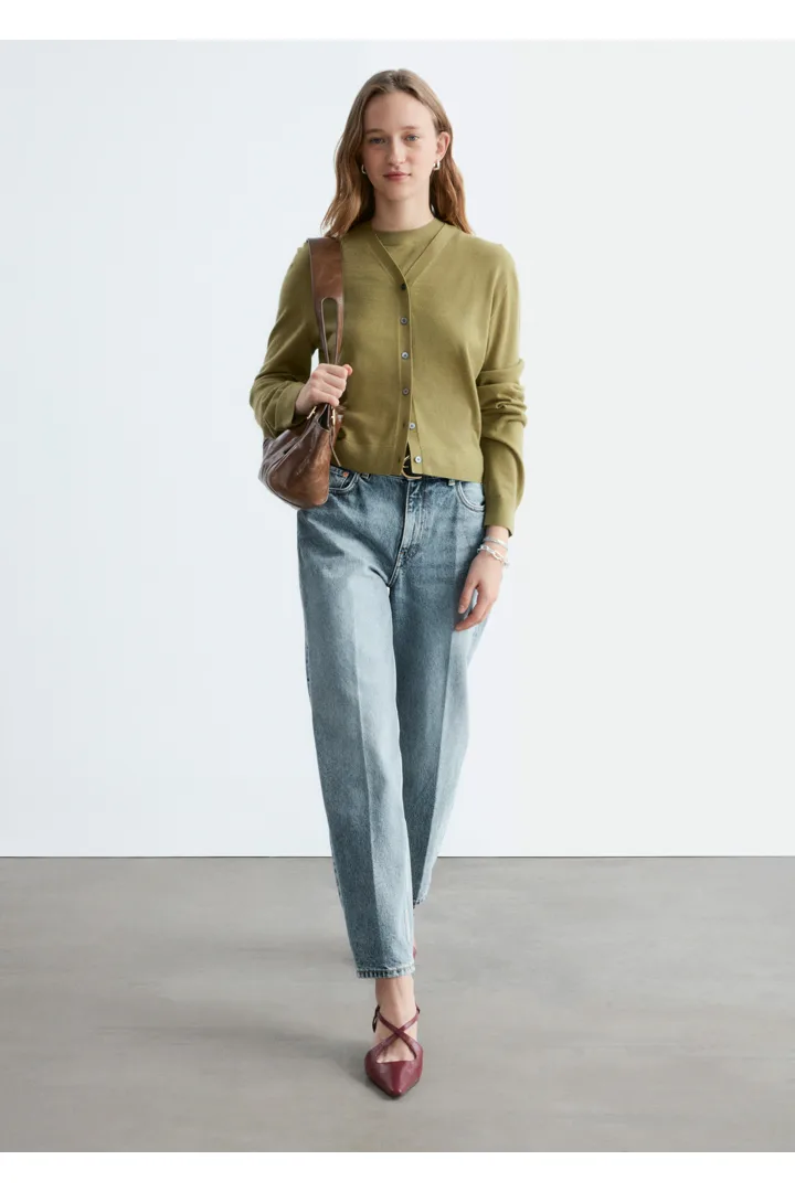 100% 캐시미어 소재로 섬세하게 니팅된 가디건이에요. 힙까지 오는 스트레이트 실루엣, 립 트리밍, 그리고 앞면의 단추가 특징이에요.