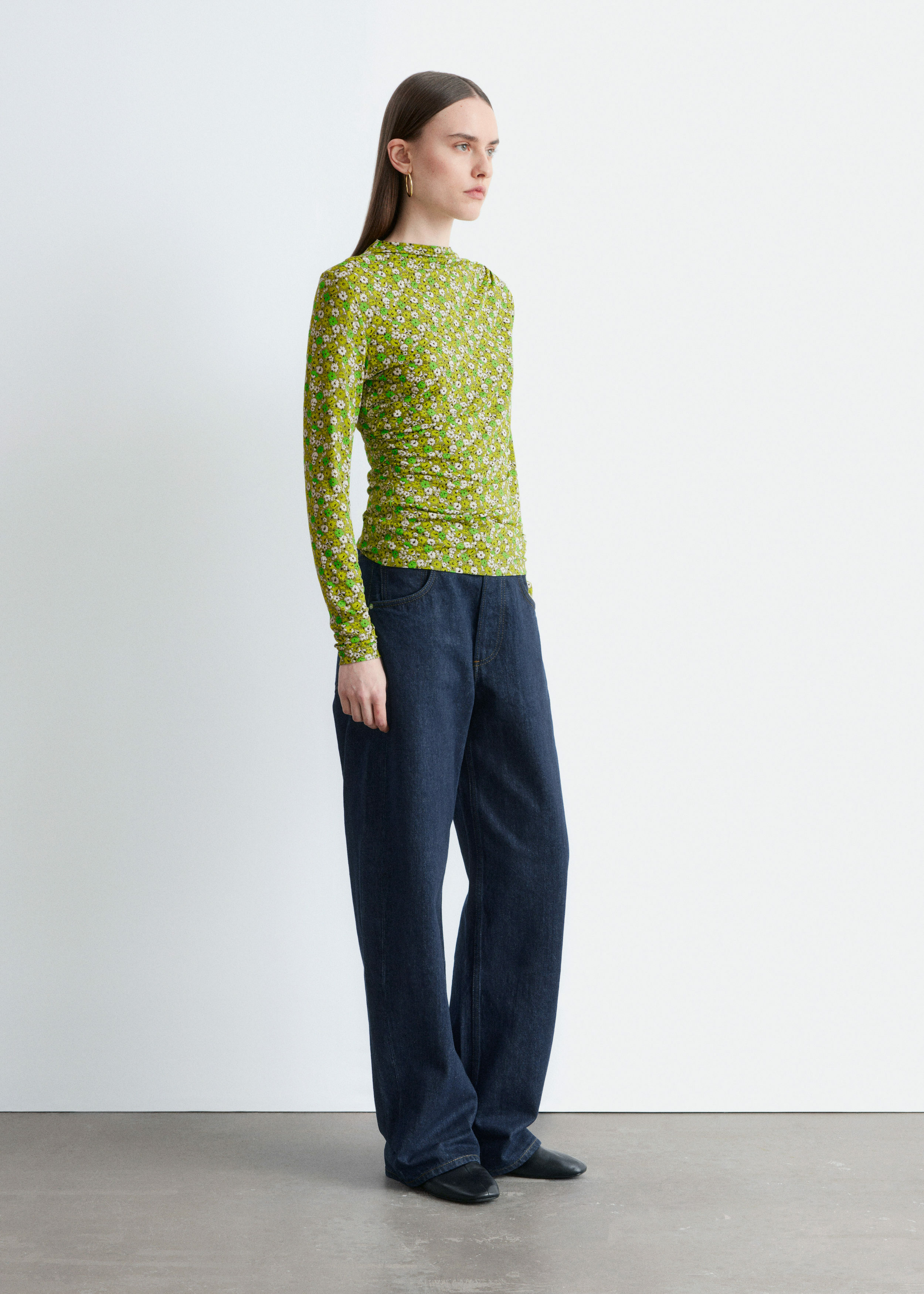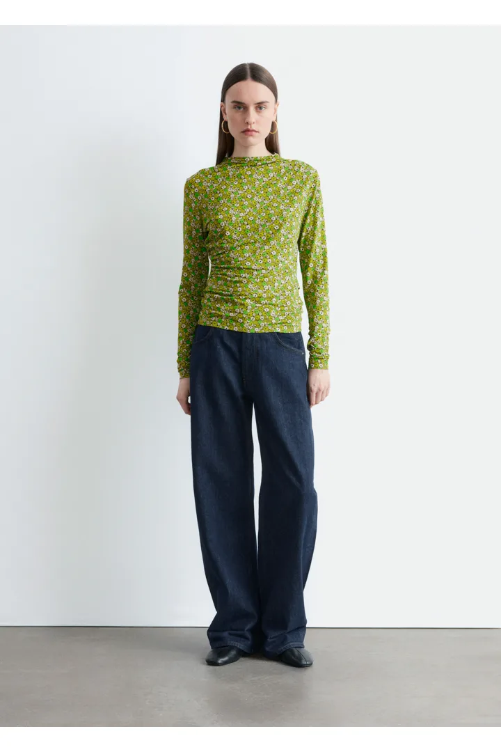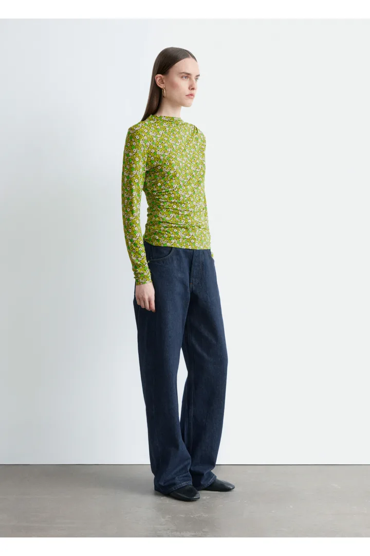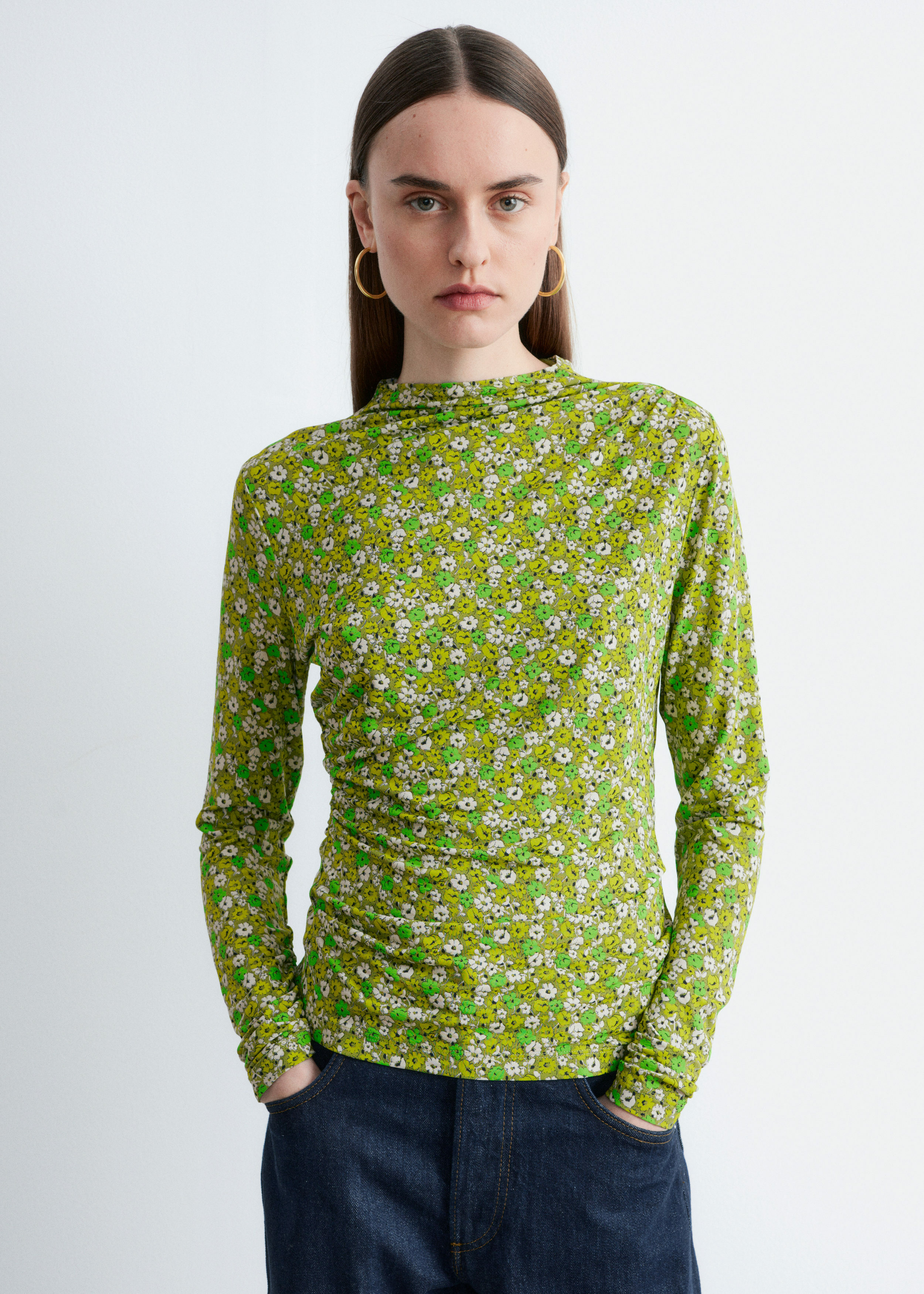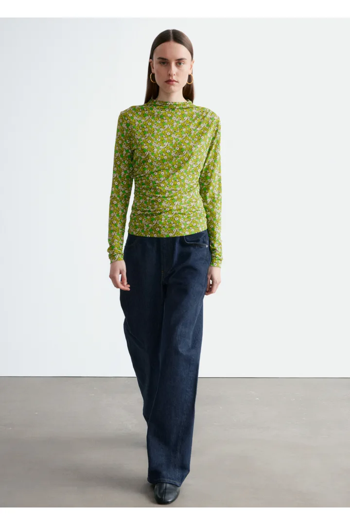 부드러운 저지 소재로 탄생한 롱 슬리브 탑이에요. 섬세한 모크 넥 디자인과 앞면의 은은한 드레이프 룩이 매력적이랍니다.