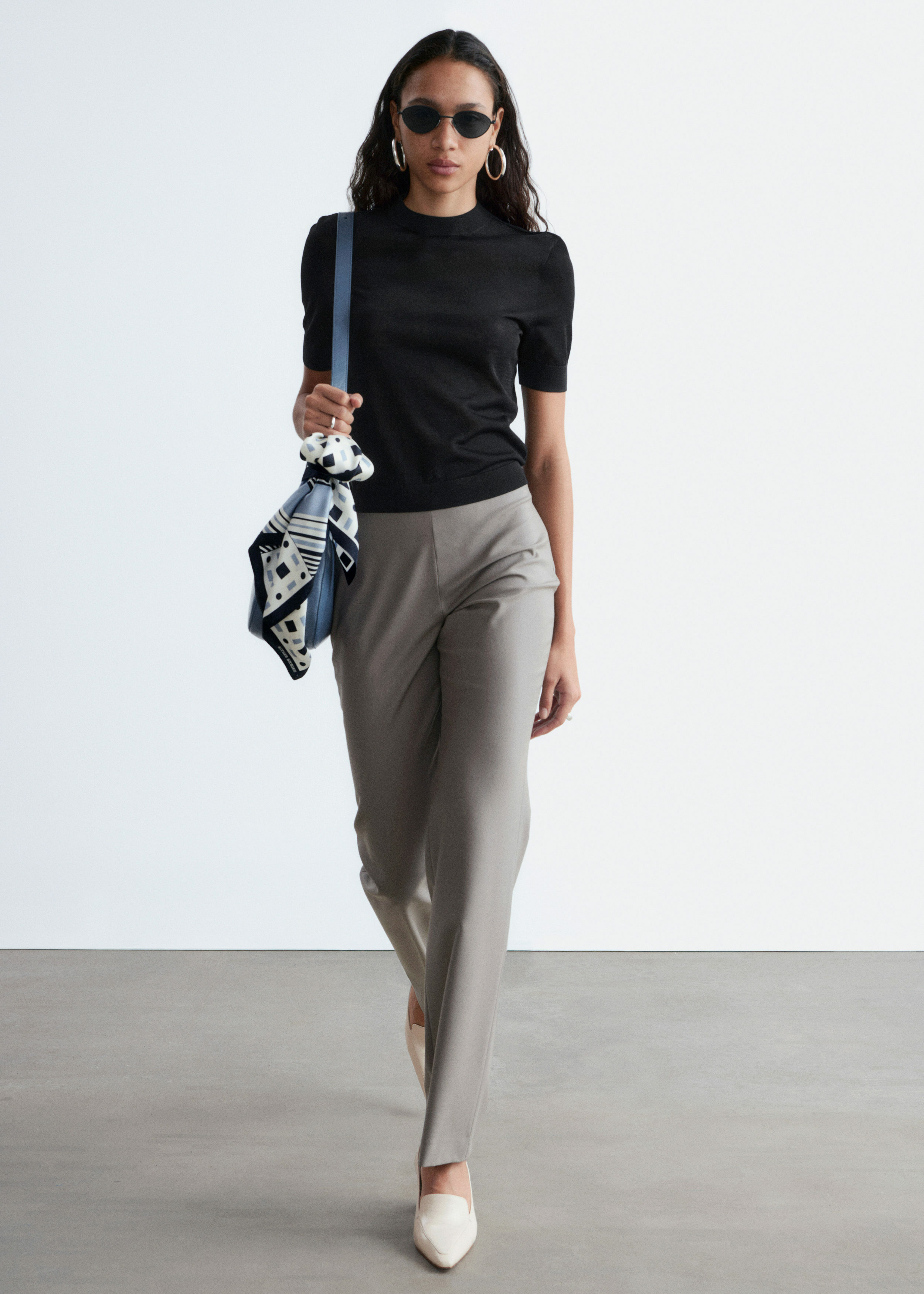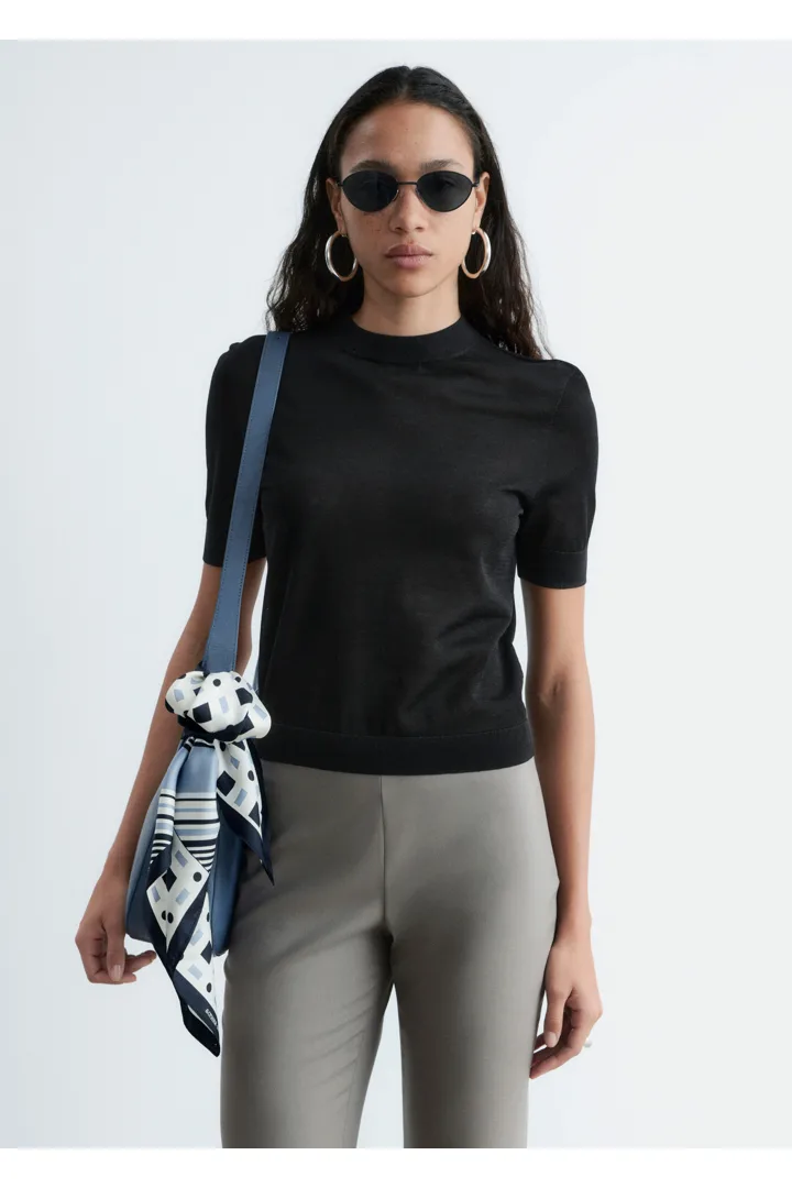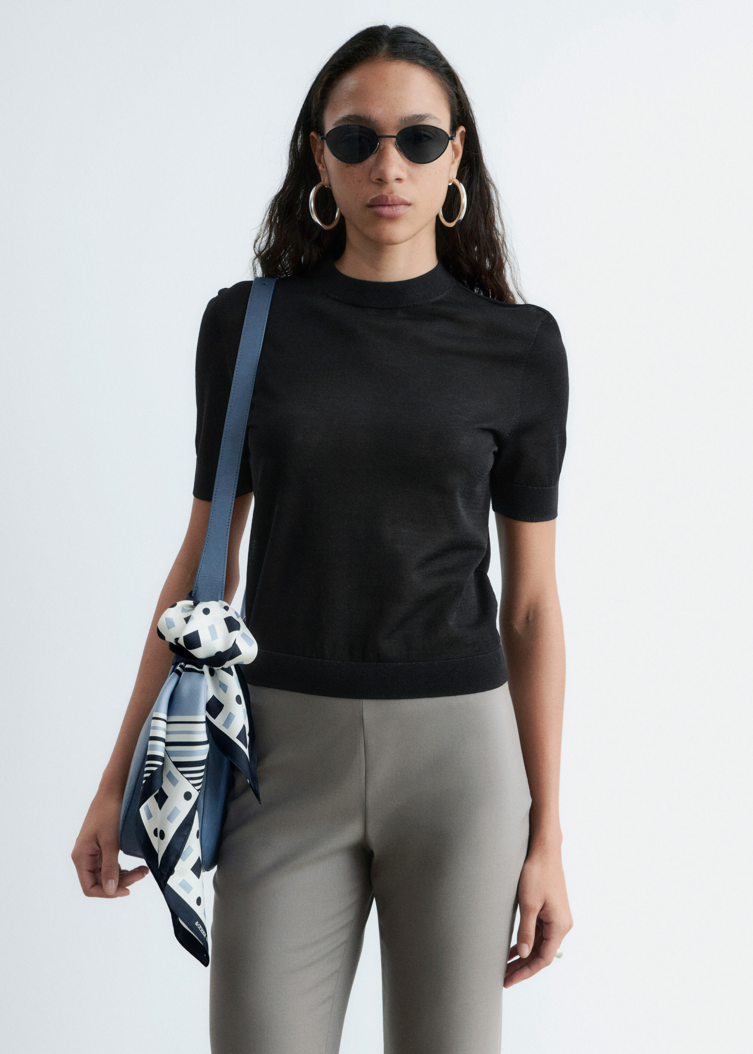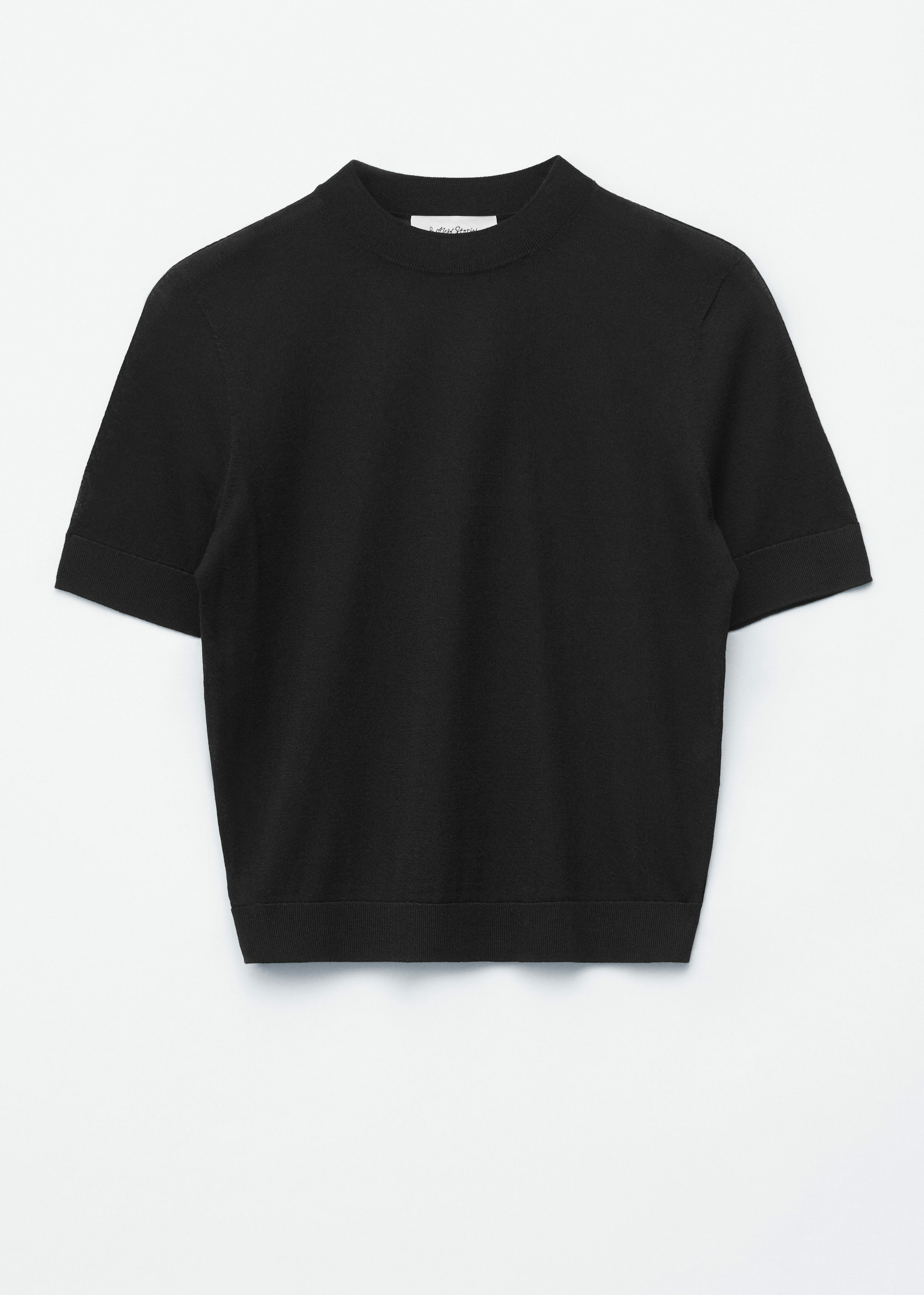 플레인 니트 티셔츠예요. 핏 되는 실루엣과 힙까지 오는 기장감이 특징이며, 립 트리밍이 은은한 구조감을 더한답니다. 단독으로 연출하거나, 베이직 아이템과 다양하게 레이어링해 보세요.