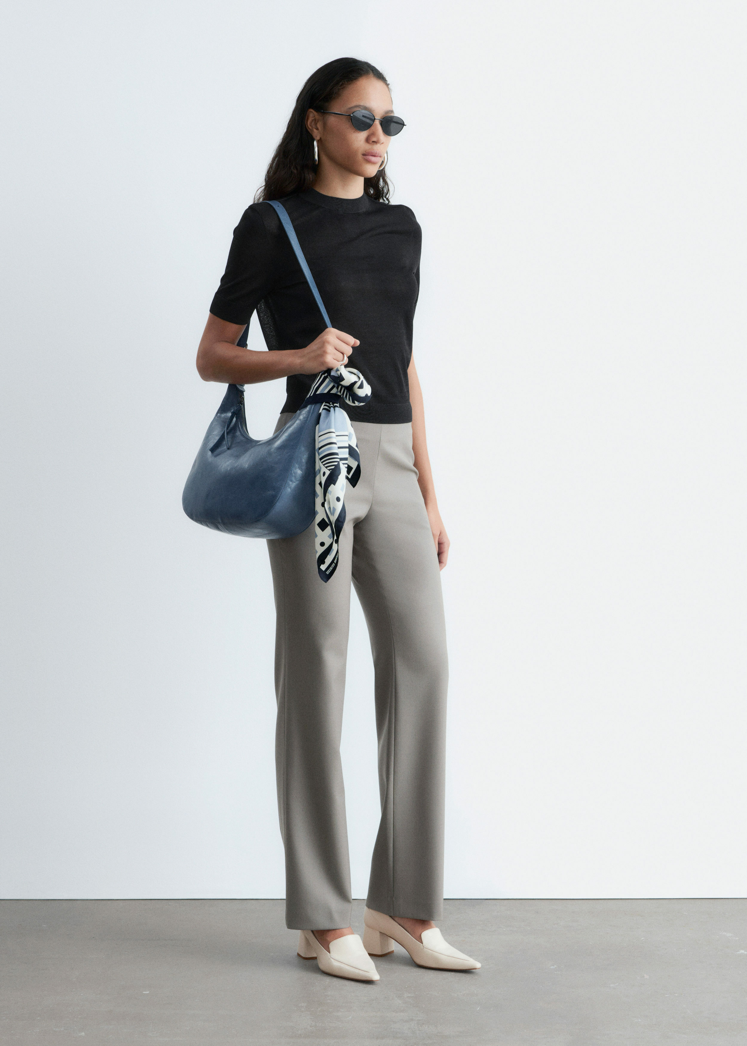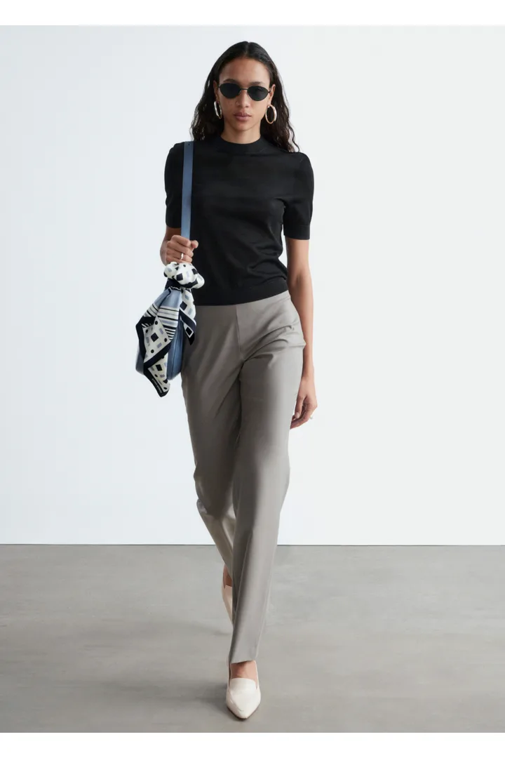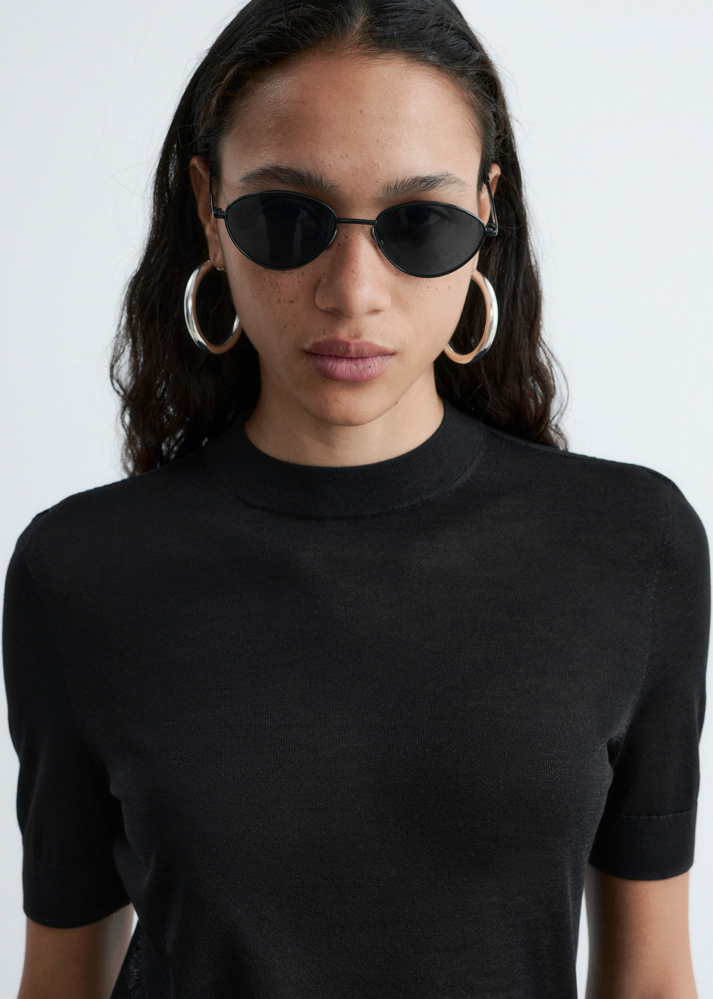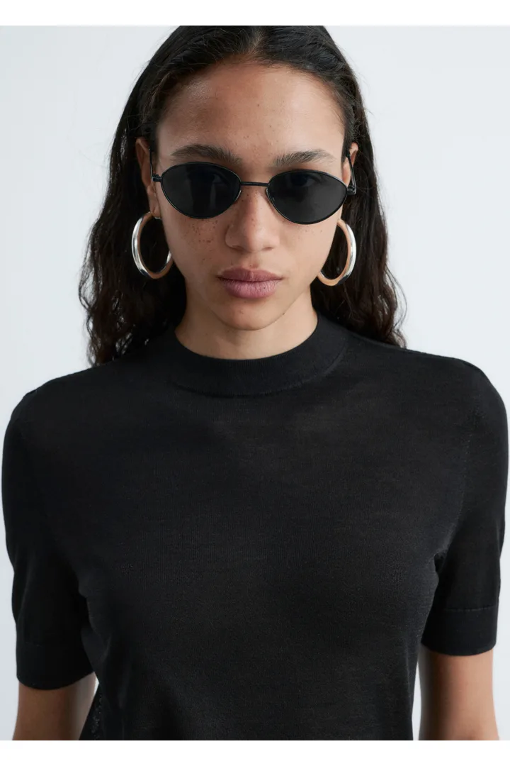 플레인 니트 티셔츠예요. 핏 되는 실루엣과 힙까지 오는 기장감이 특징이며, 립 트리밍이 은은한 구조감을 더한답니다. 단독으로 연출하거나, 베이직 아이템과 다양하게 레이어링해 보세요.
