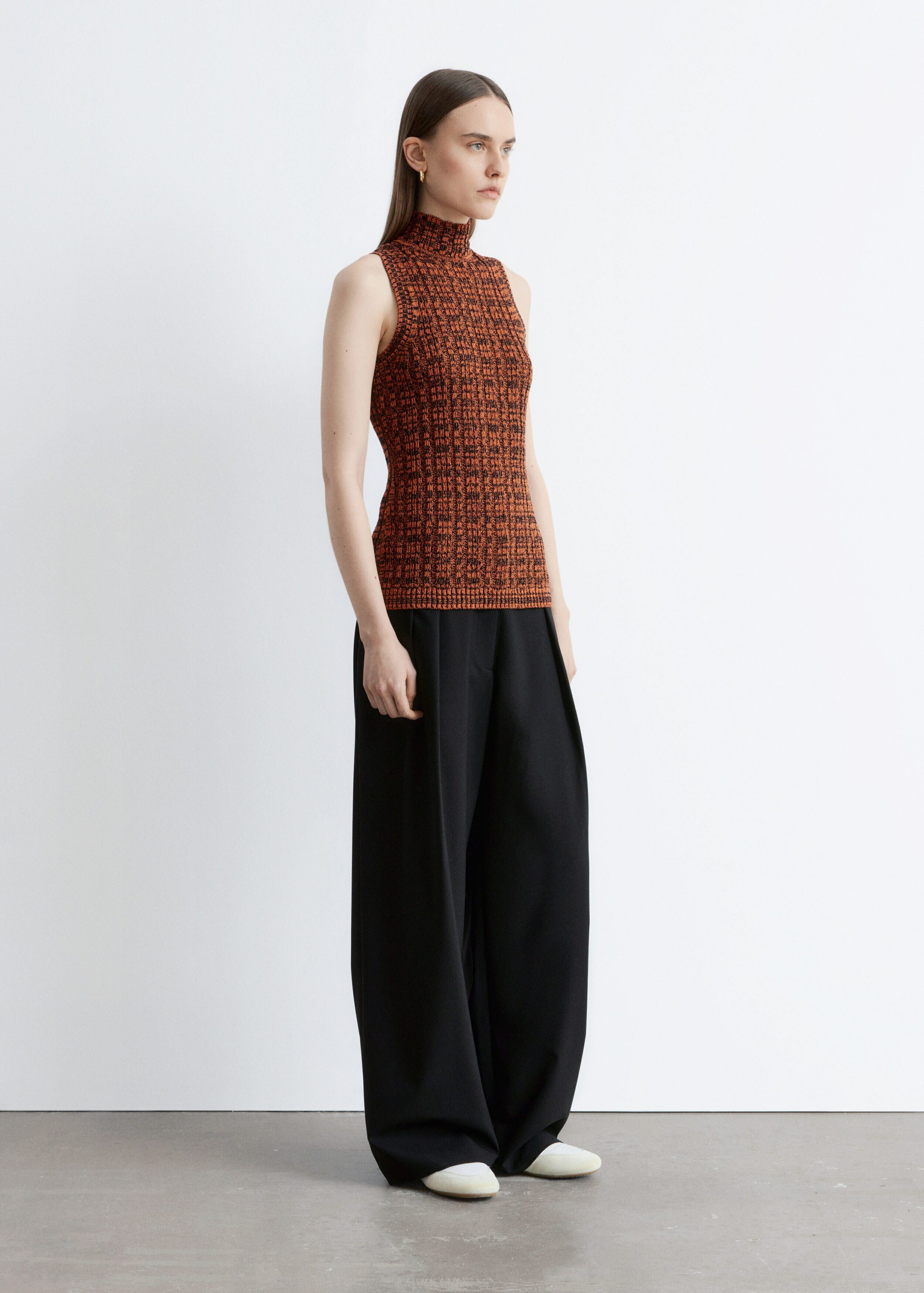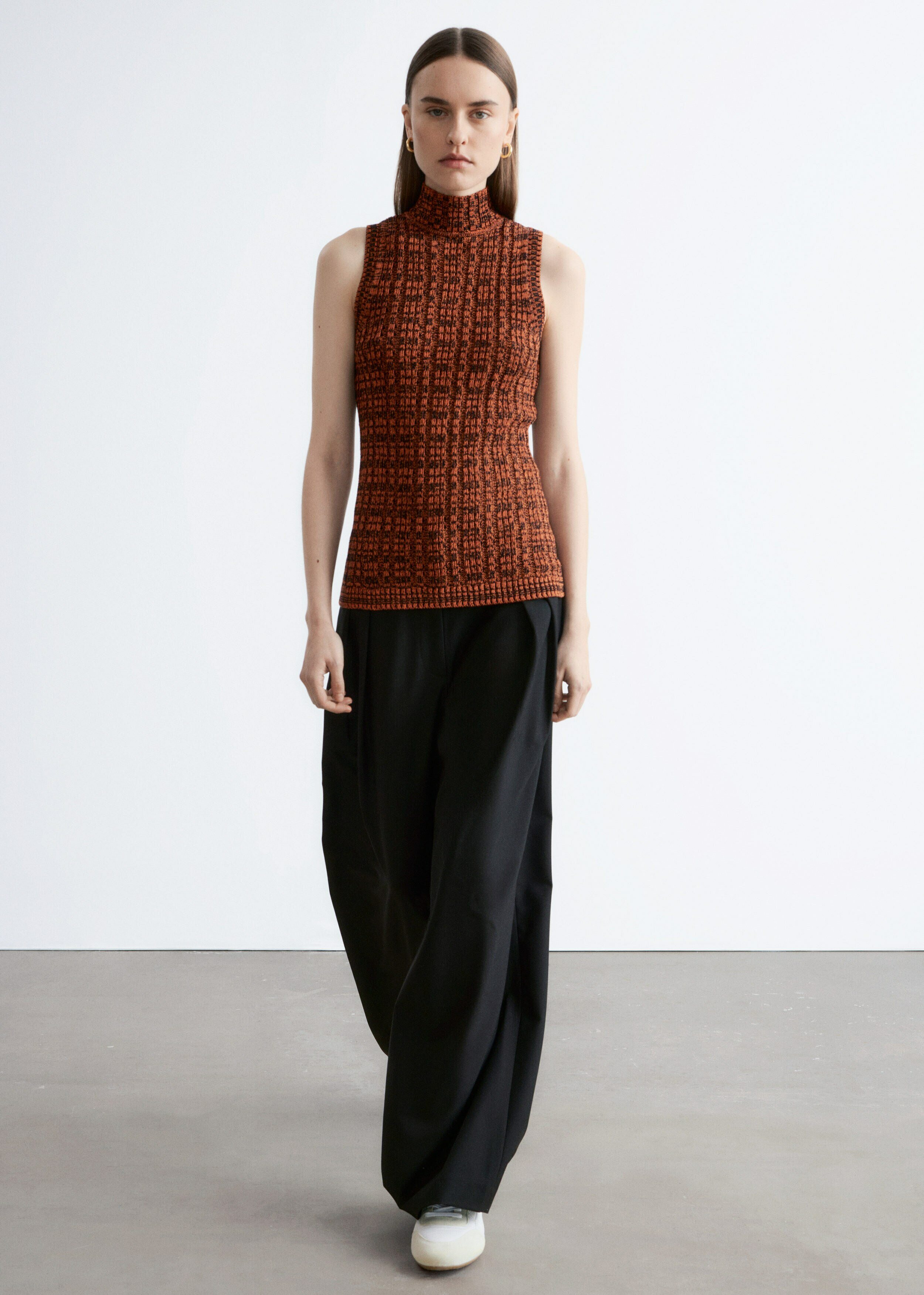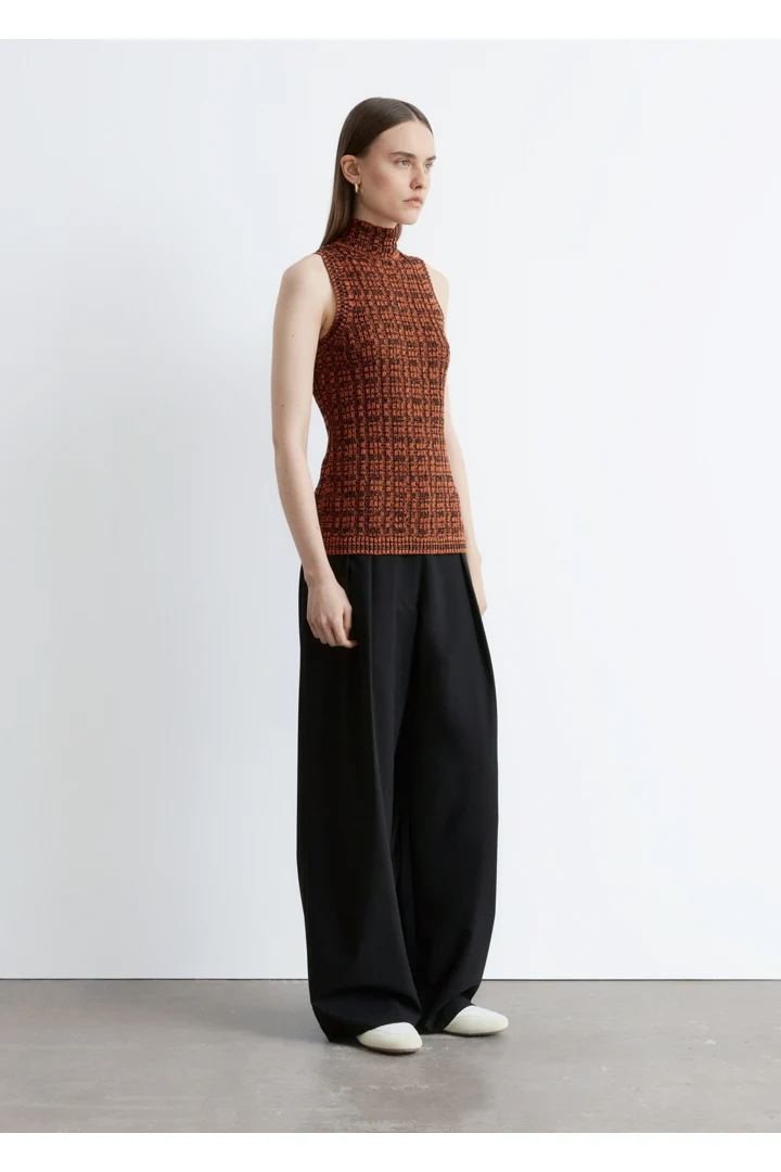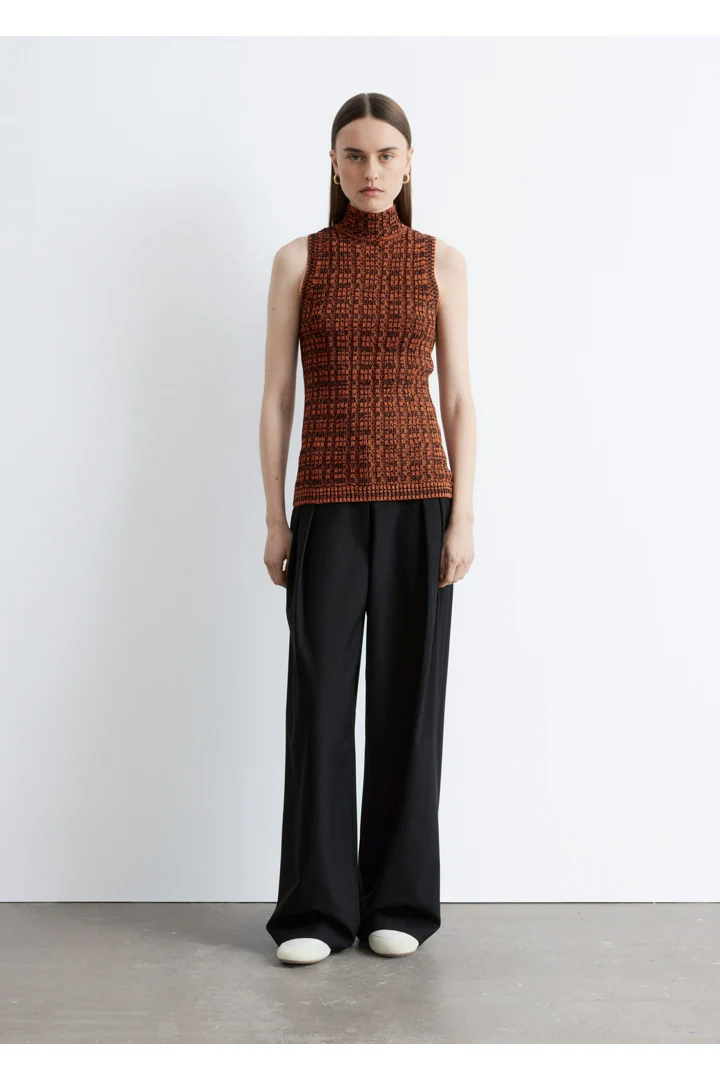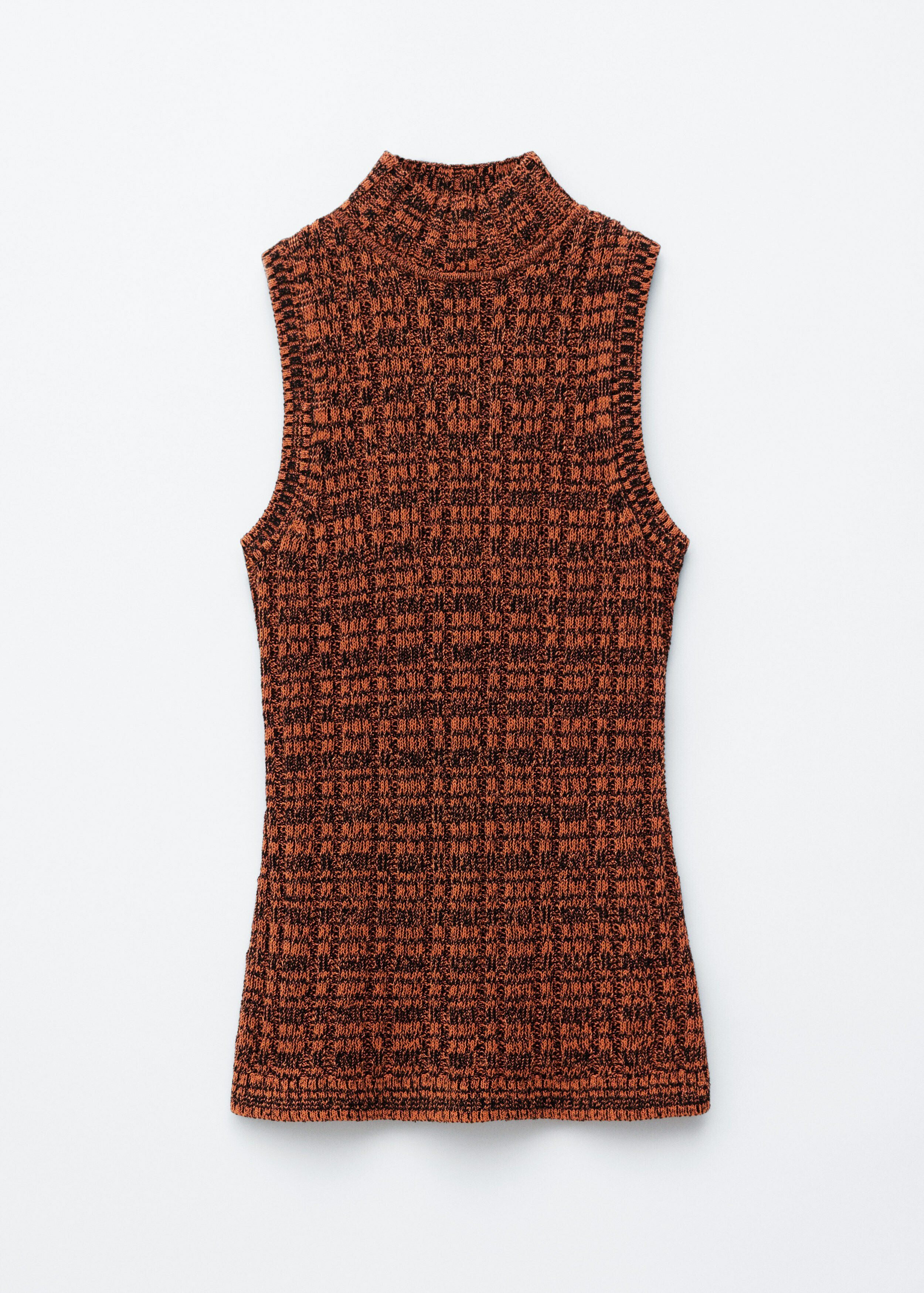 코튼 혼방 니트 소재의 슬리브리스 탑이에요. 립 니트 스퀘어 패턴, 하이 터틀넥, 그리고 립 트리밍이 특징이랍니다.