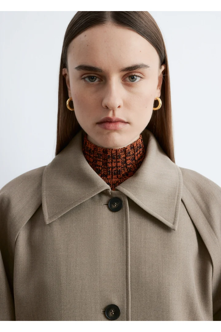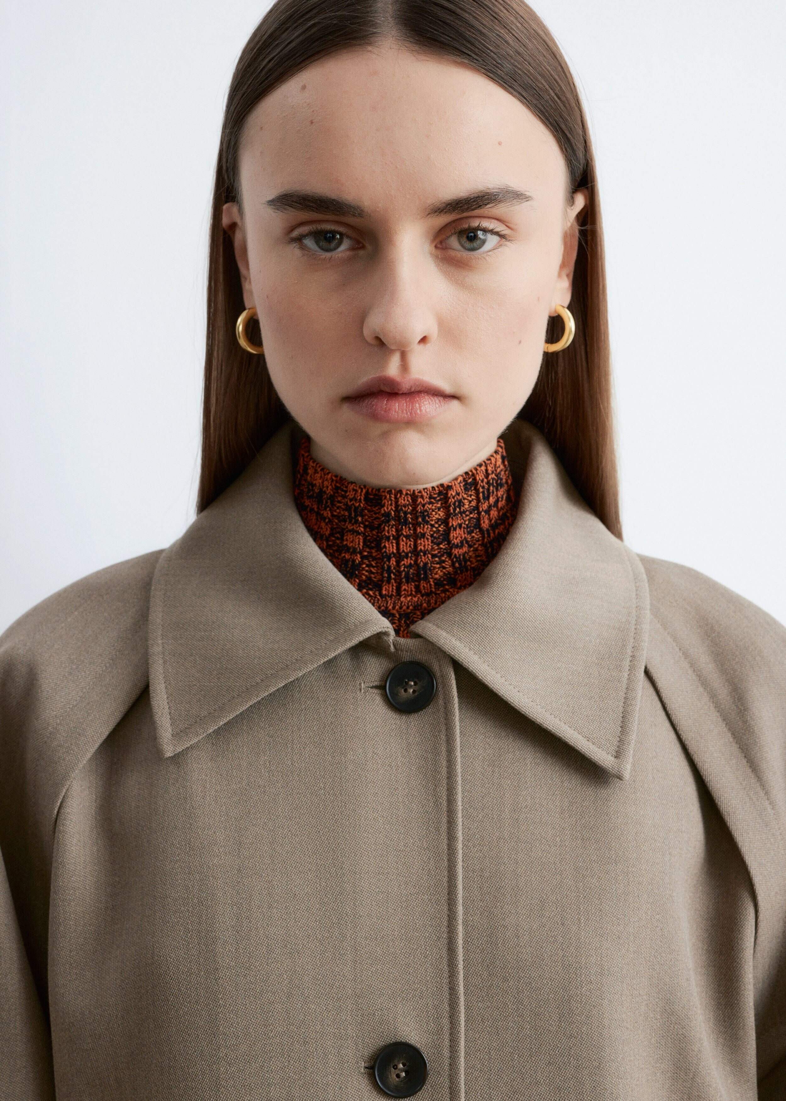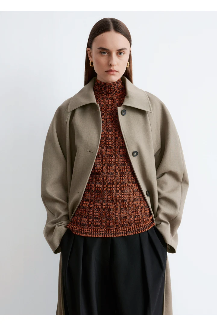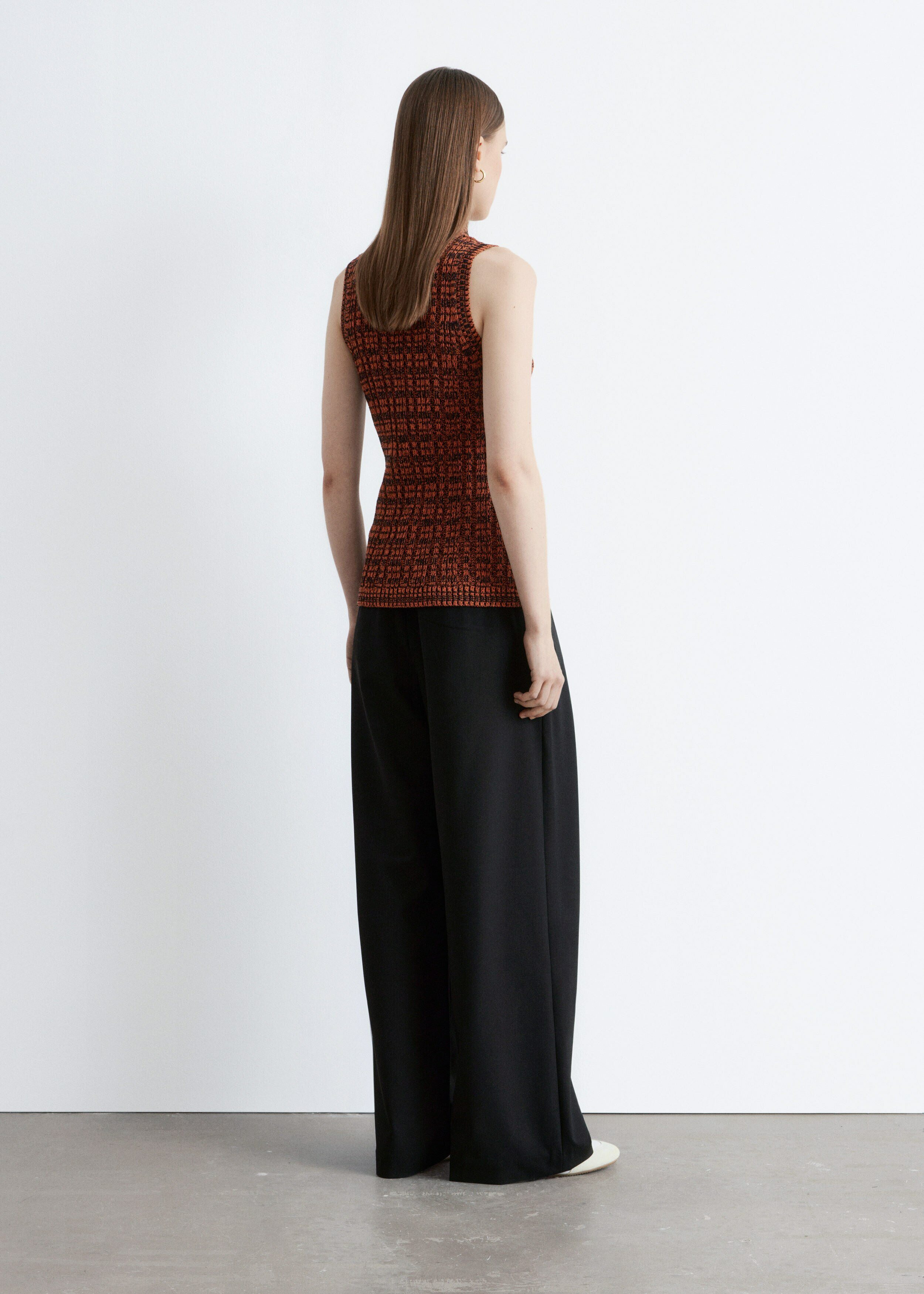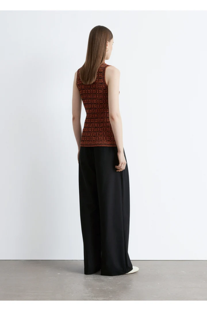 코튼 혼방 니트 소재의 슬리브리스 탑이에요. 립 니트 스퀘어 패턴, 하이 터틀넥, 그리고 립 트리밍이 특징이랍니다.