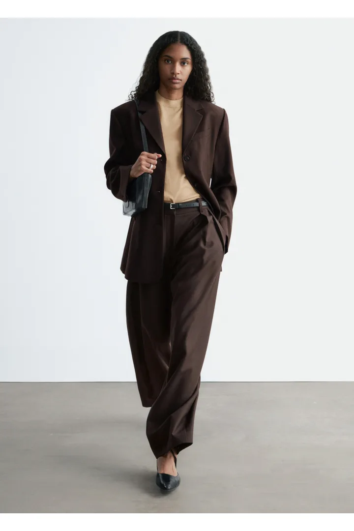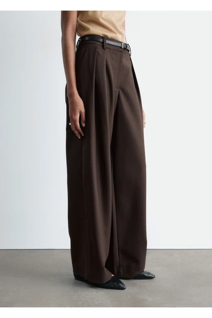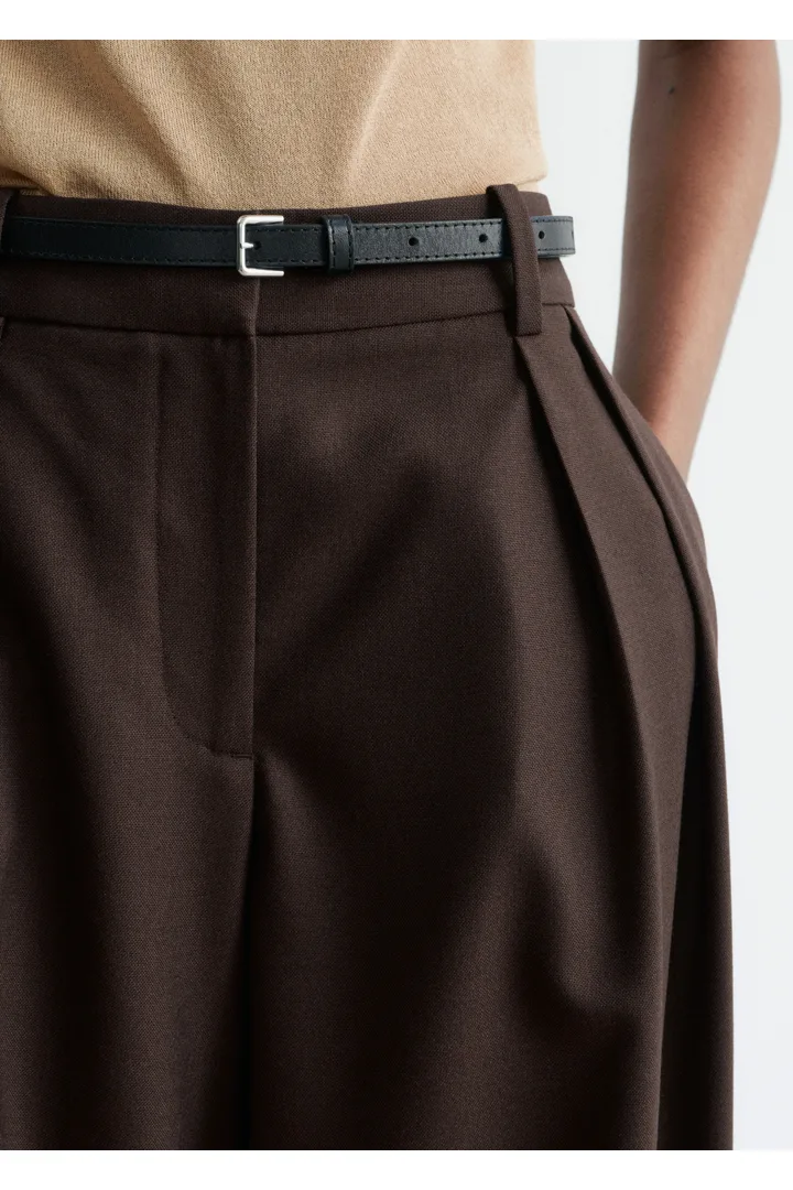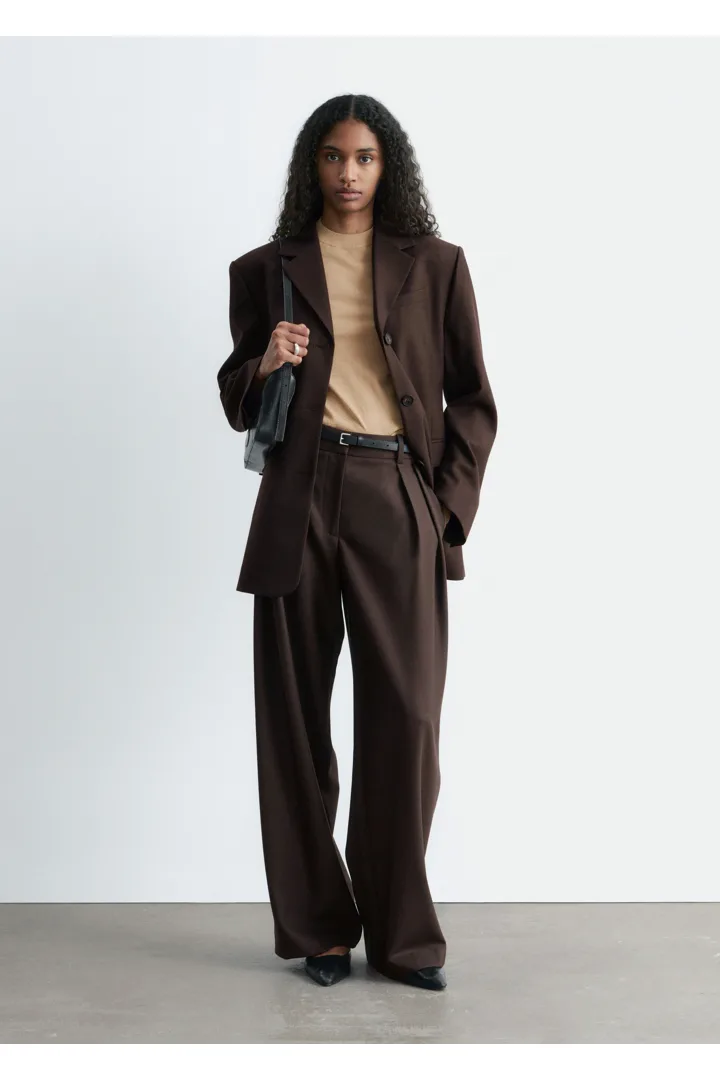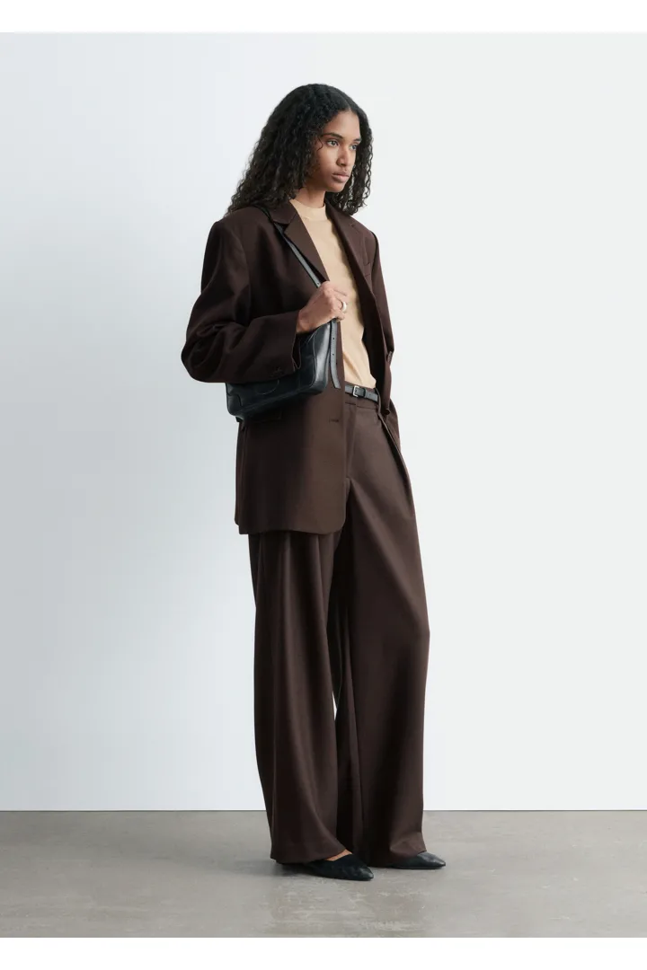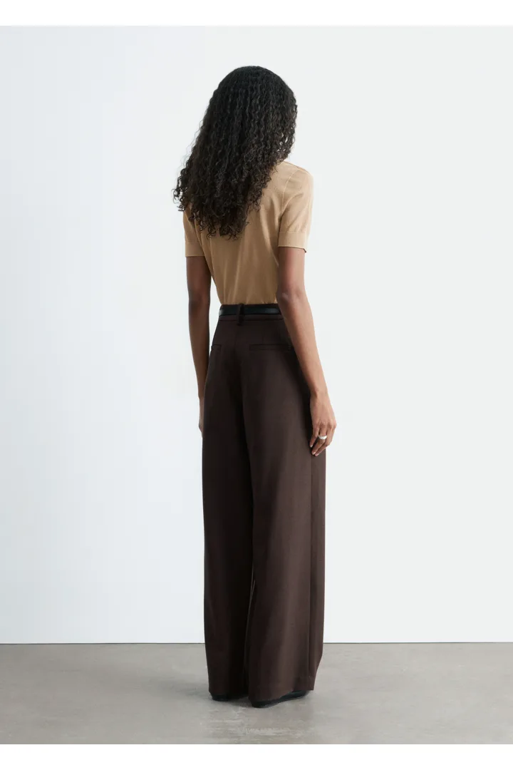 울 혼방 소재로 탄생한 트라우저예요. 레귤러 웨이스트, 그리고 롱 & 와이드 레그의 플리츠가 특징이랍니다. 측면의 사선 포켓, 지퍼 플라이와 후크 앤 바 & 단추, 뒷면의 웰트 포켓이 자리해 있어요.