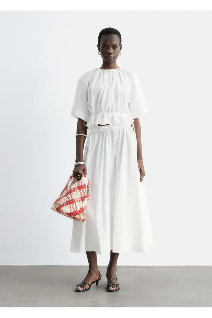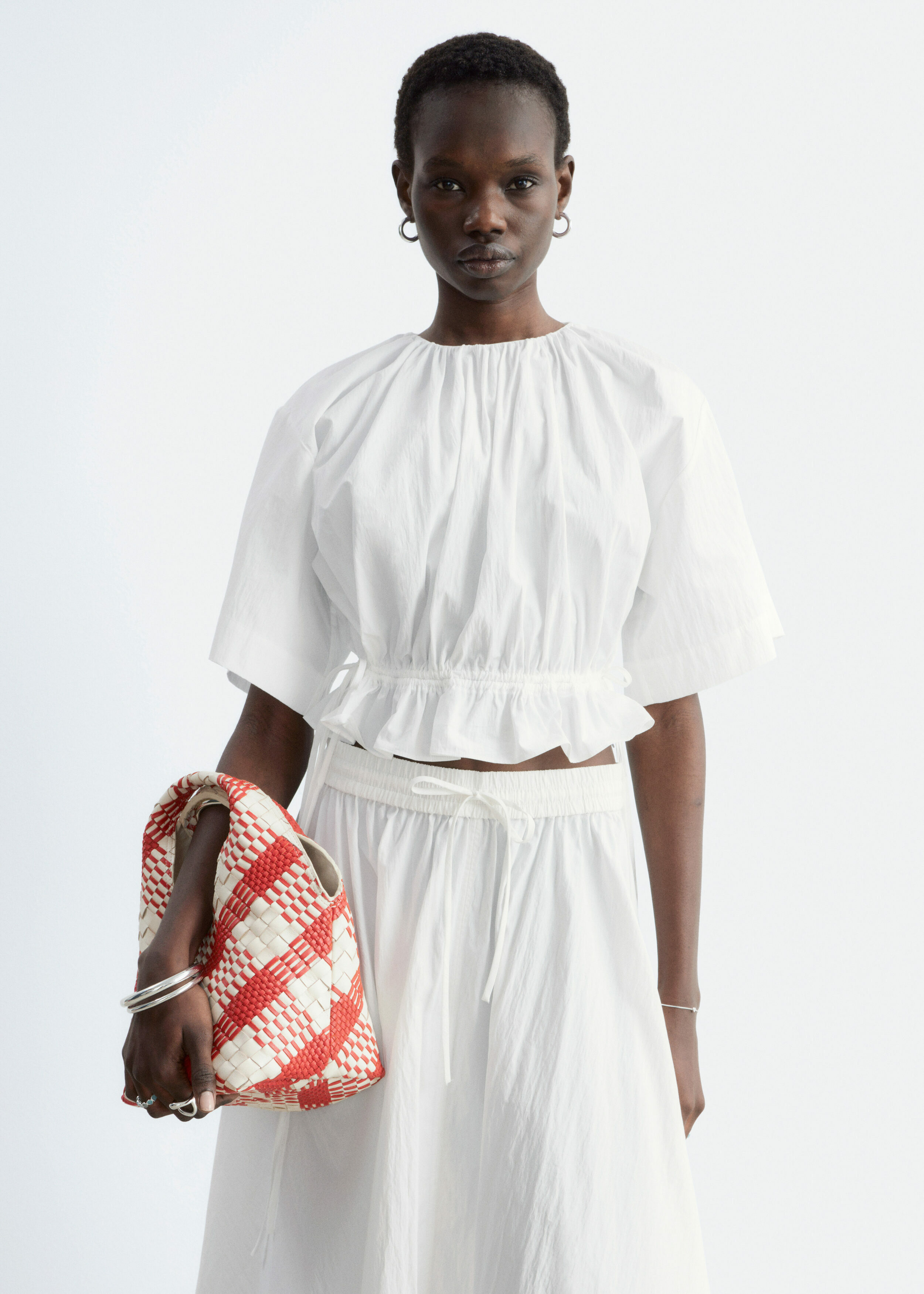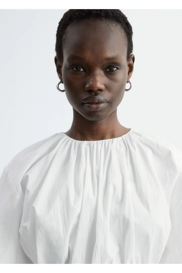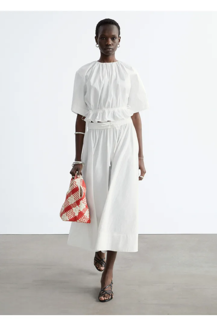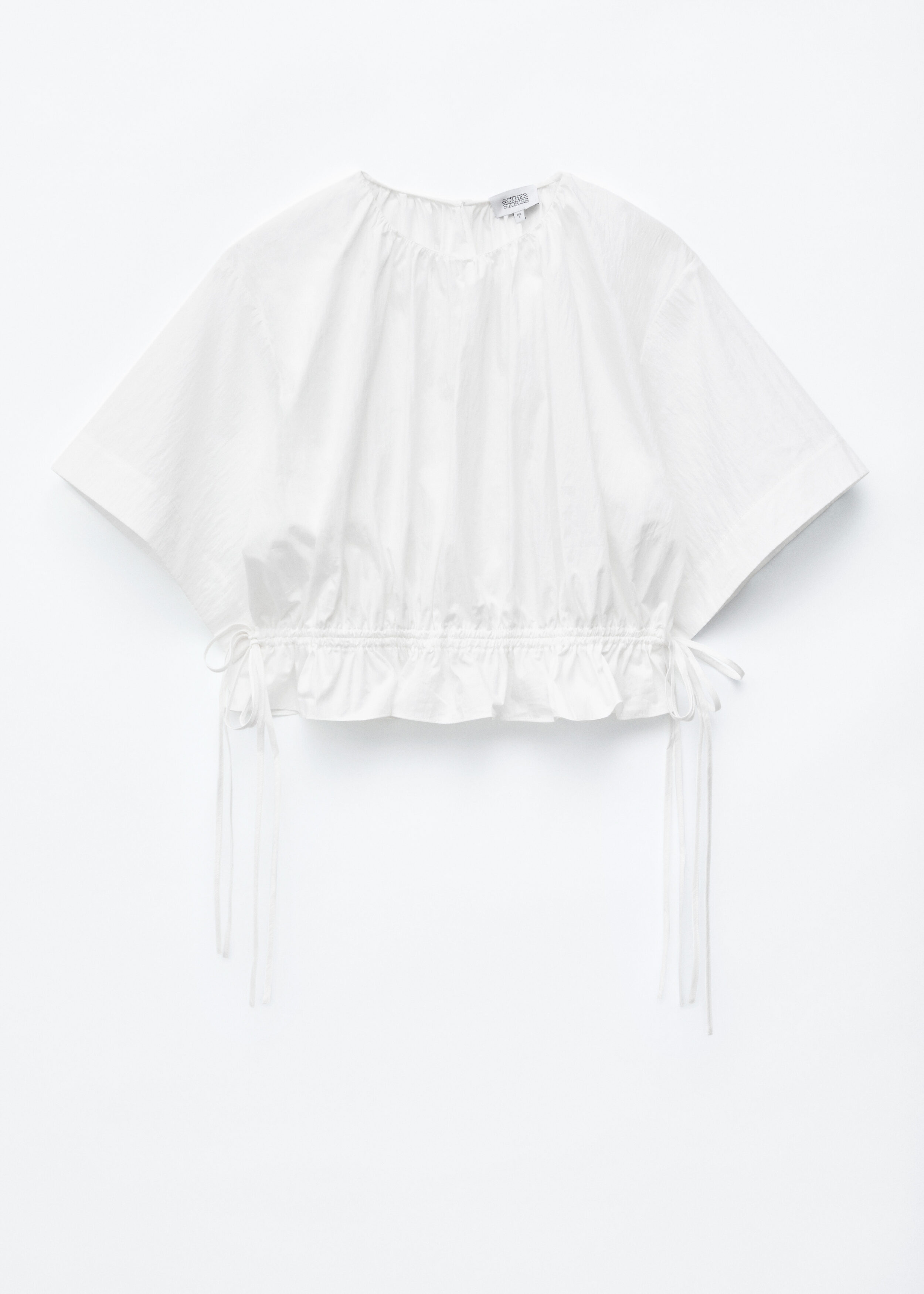 가볍고 편안한 감각을 선사하는 코튼 혼방 쇼트 슬리브 탑이에요. 네크라인의 셔링, 그리고 뒷면 중앙의 키홀 및 버튼이 특징이랍니다. 동일 소재의 타이로 조절 가능한 드로스트링이 허리에 자리해 있어 핏 조절이 용이해요.
