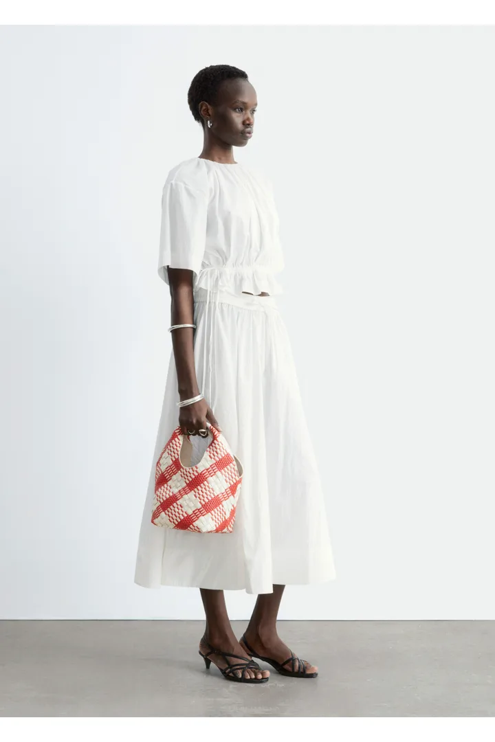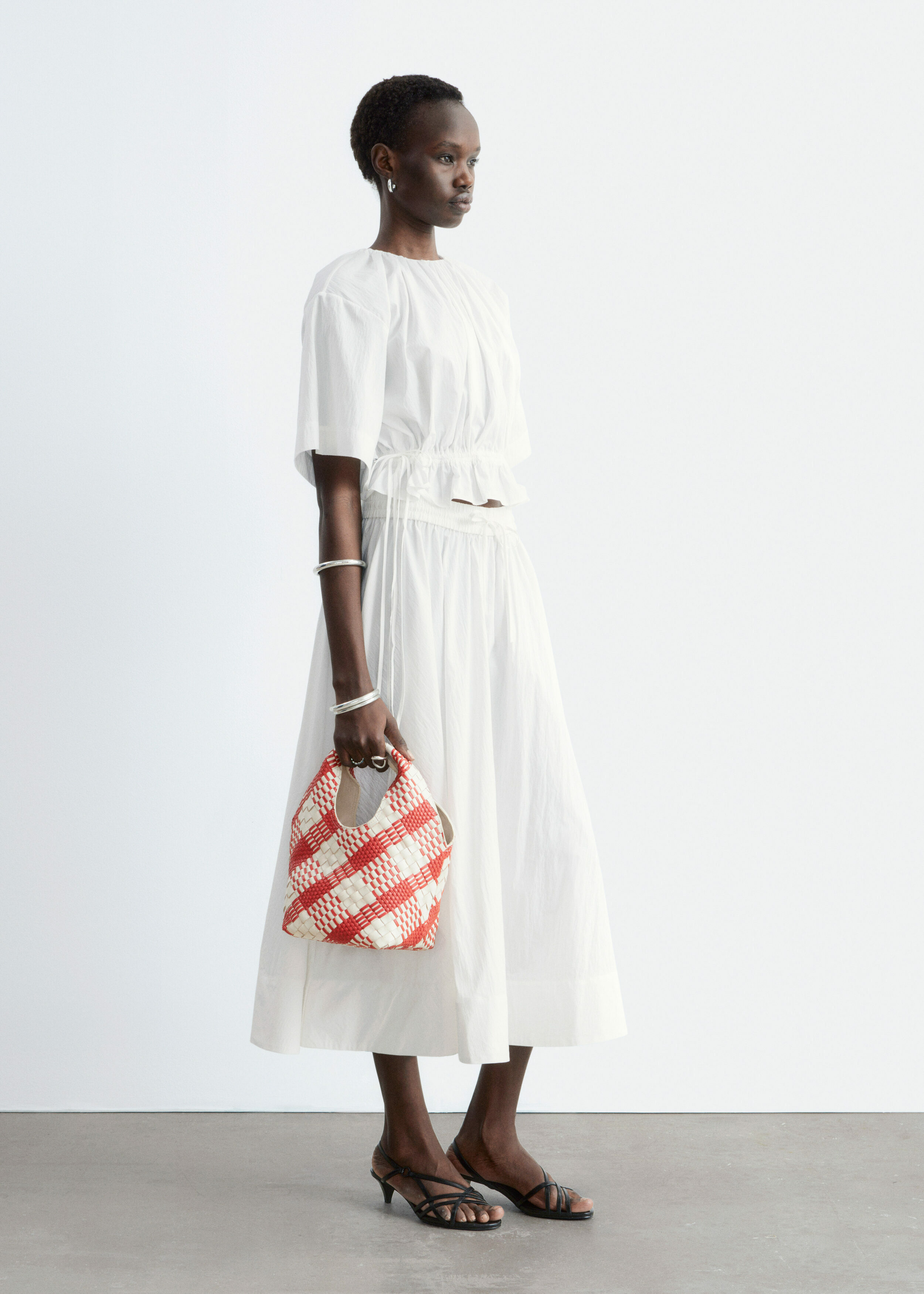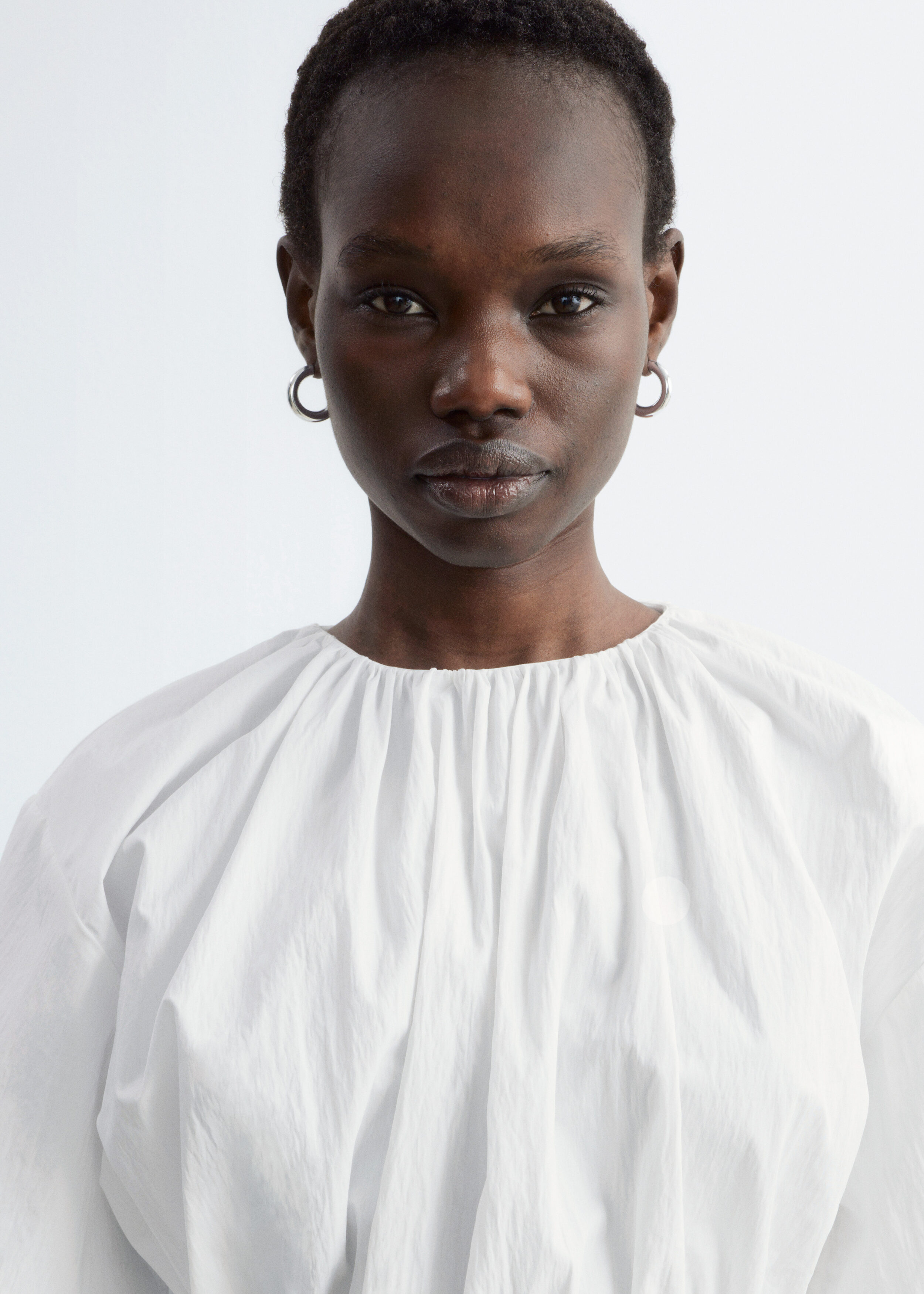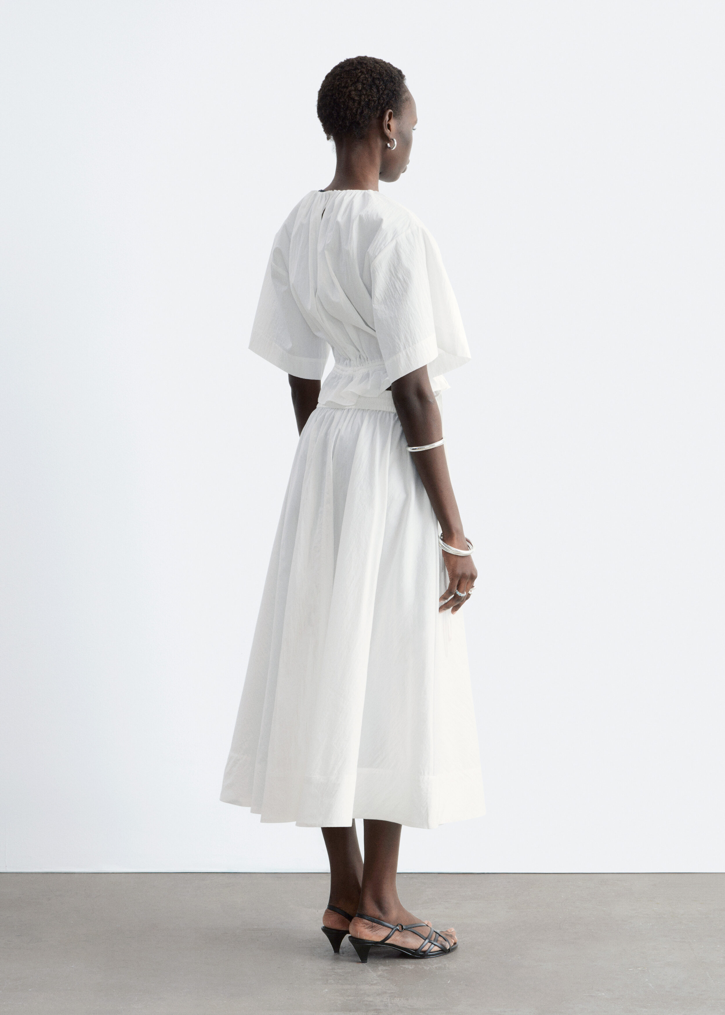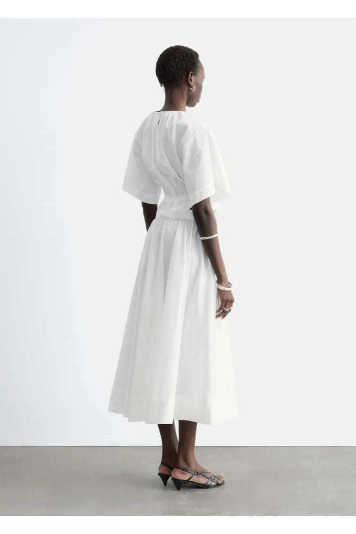 가볍고 편안한 감각을 선사하는 코튼 혼방 쇼트 슬리브 탑이에요. 네크라인의 셔링, 그리고 뒷면 중앙의 키홀 및 버튼이 특징이랍니다. 동일 소재의 타이로 조절 가능한 드로스트링이 허리에 자리해 있어 핏 조절이 용이해요.