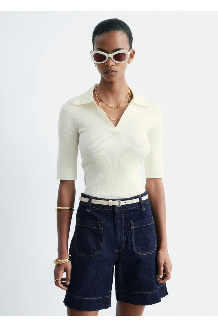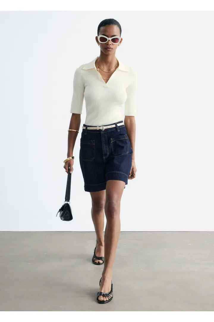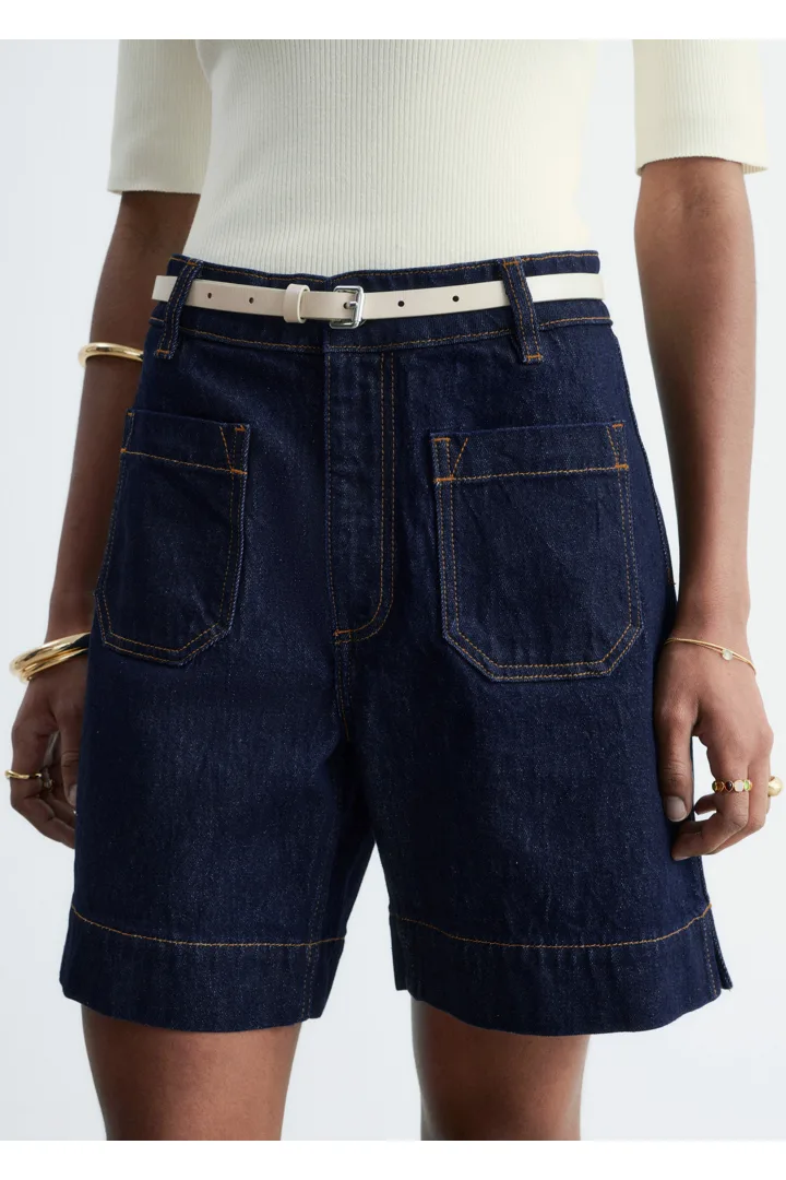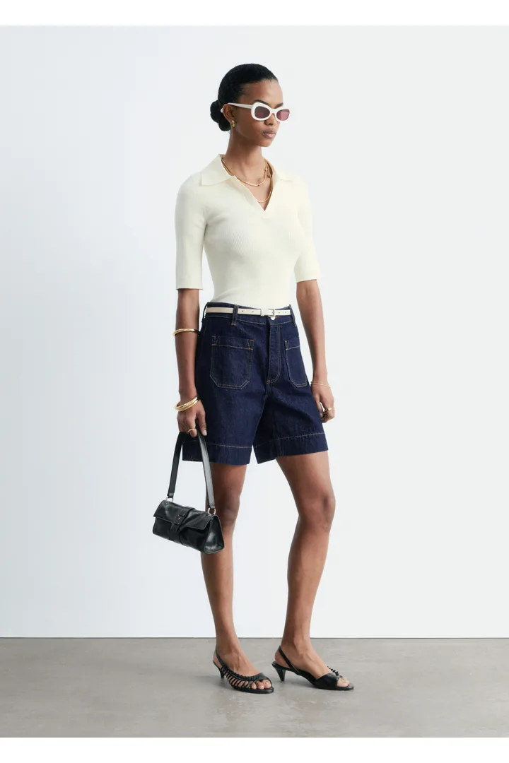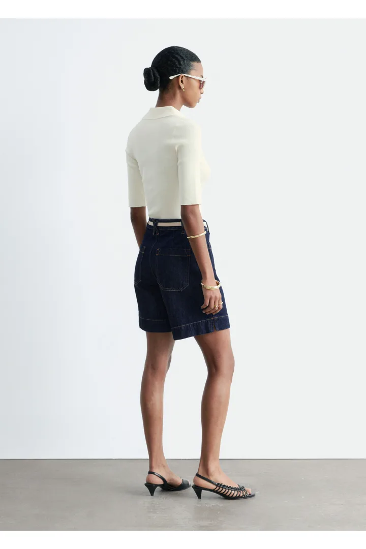 데님 쇼츠만큼 여름의 분위기가 가득 느껴지는 아이템이 또 있을까요. 신축성 좋은 코튼 혼방 소재로 탄생했으며 클래식 하이 웨이스트, 은은한 플레어 레그, 앞면과 뒷면에 2개의 패치 포켓, 대비적인 탑스티치 솔기, 헴라인의 은은한 슬릿이 특징이에요. 벨트 고리, 그리고 지퍼 플라이 & 단추가 자리해 있답니다.