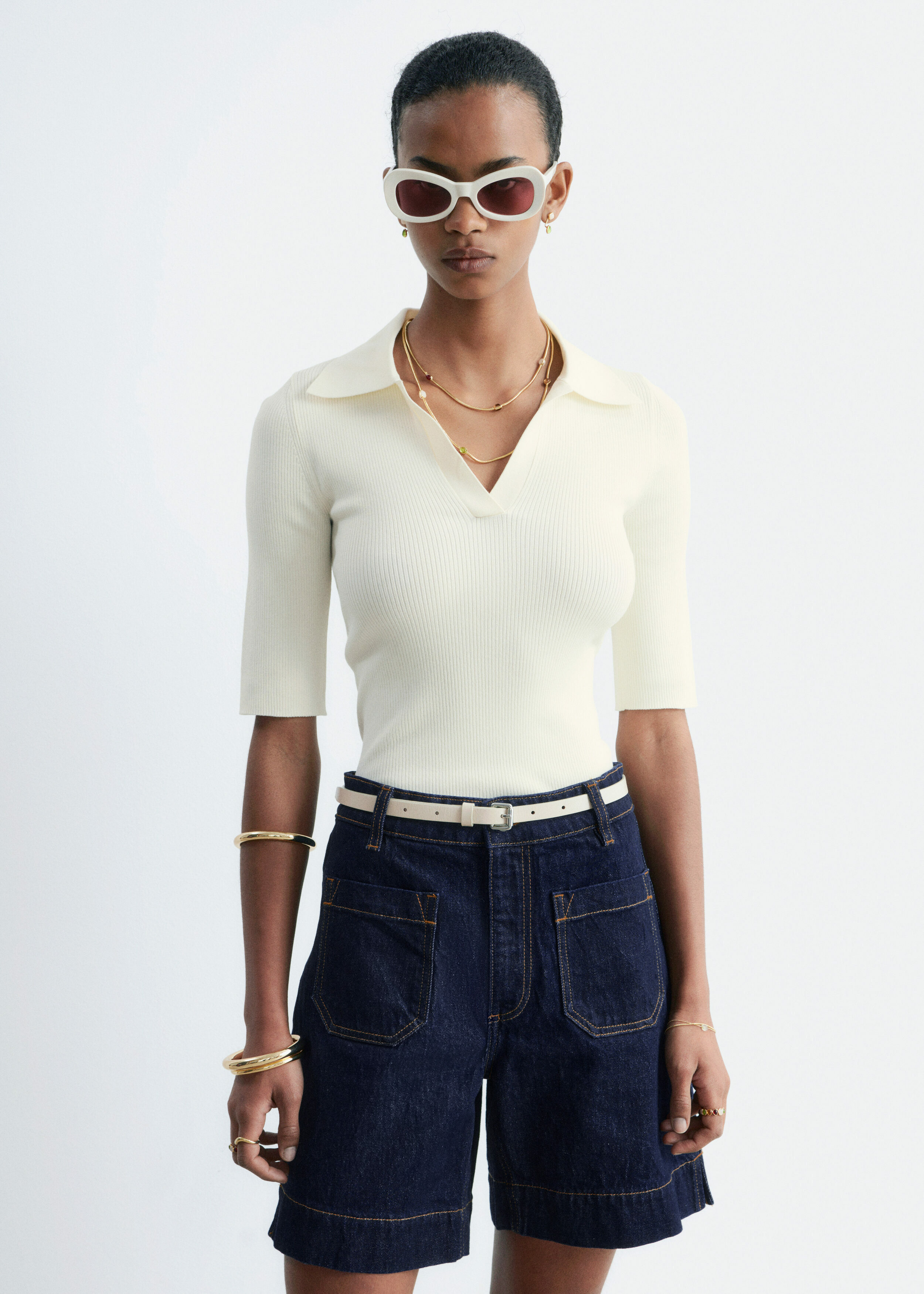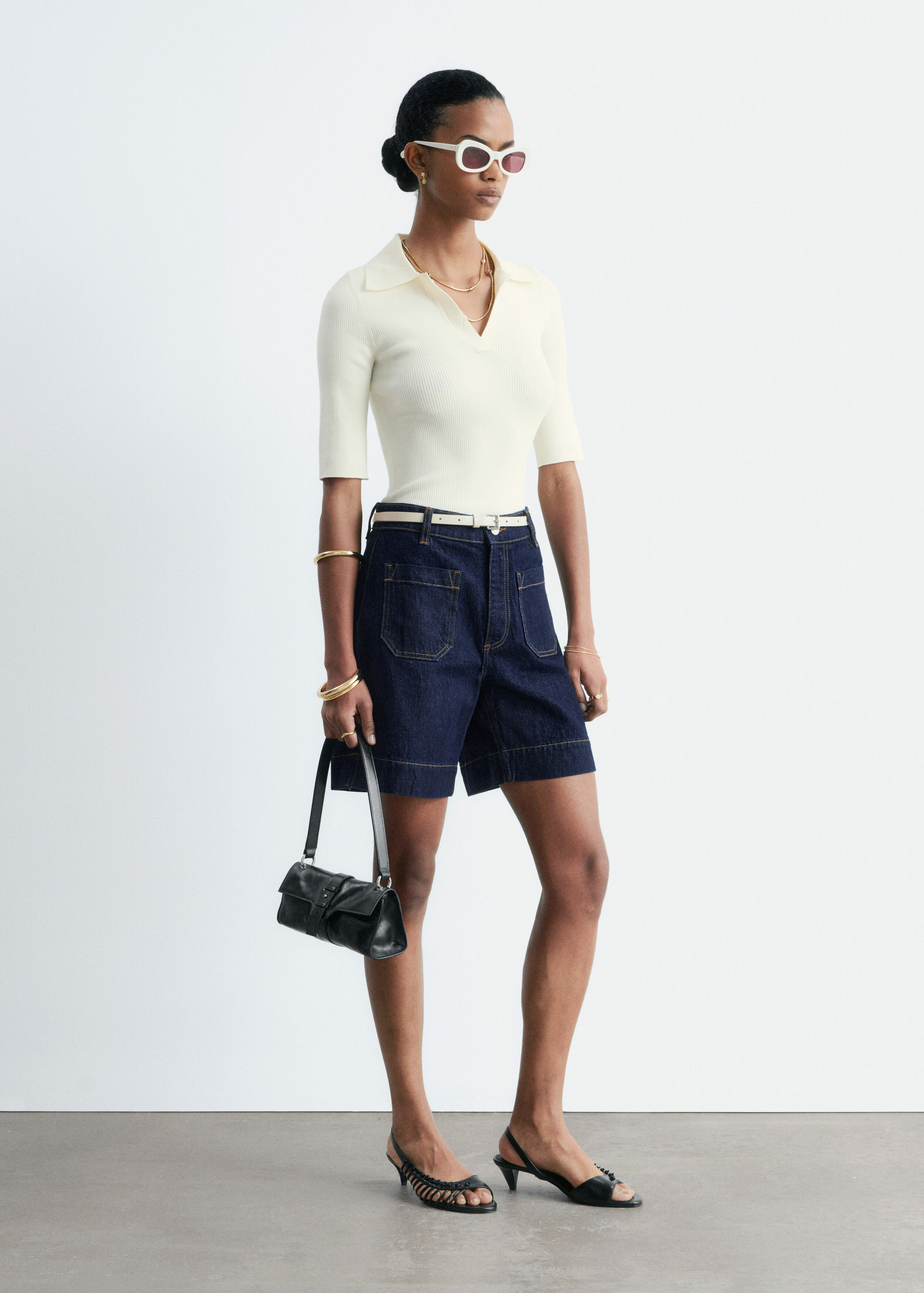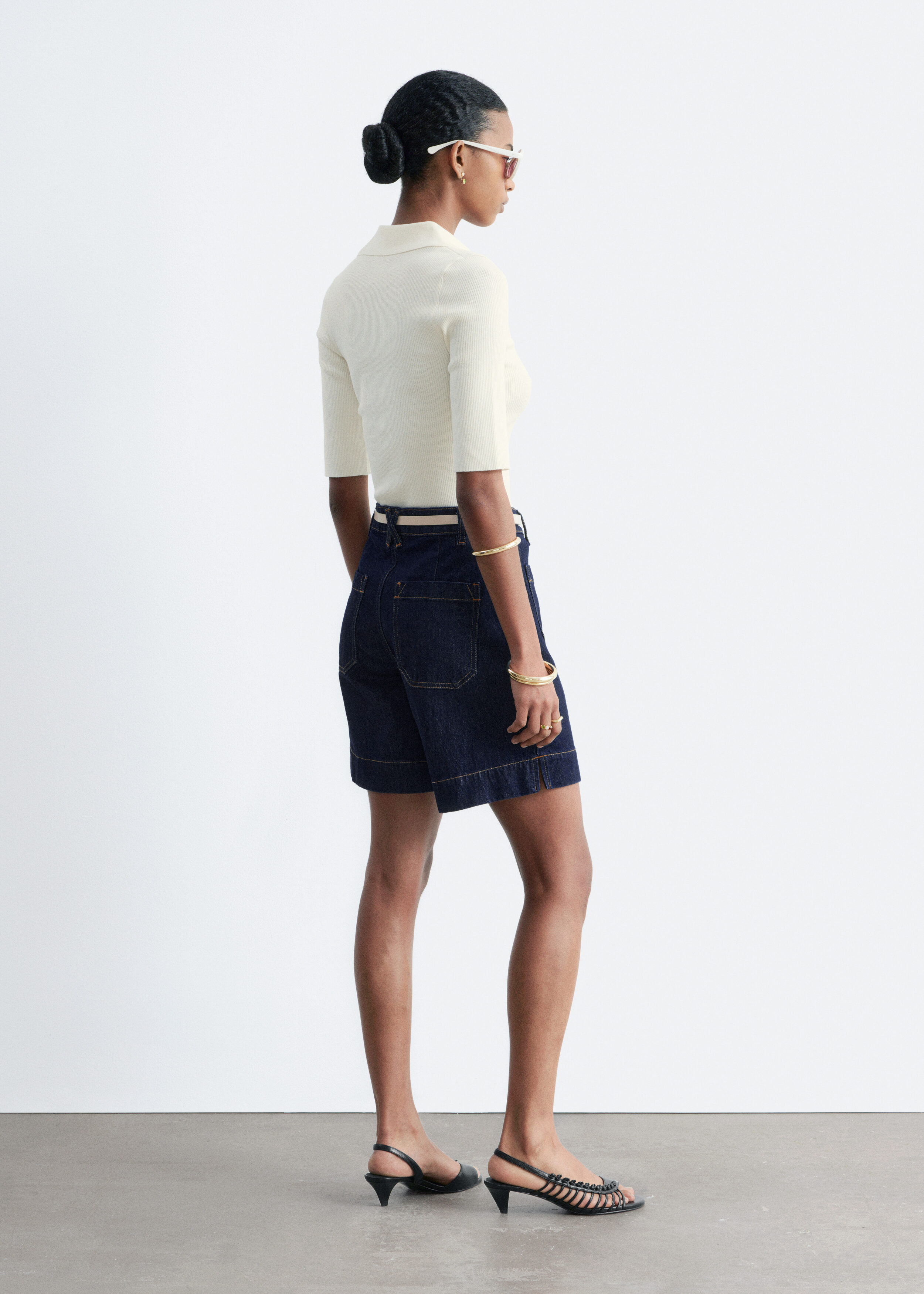 데님 쇼츠만큼 여름의 분위기가 가득 느껴지는 아이템이 또 있을까요. 신축성 좋은 코튼 혼방 소재로 탄생했으며 클래식 하이 웨이스트, 은은한 플레어 레그, 앞면과 뒷면에 2개의 패치 포켓, 대비적인 탑스티치 솔기, 헴라인의 은은한 슬릿이 특징이에요. 벨트 고리, 그리고 지퍼 플라이 & 단추가 자리해 있답니다.