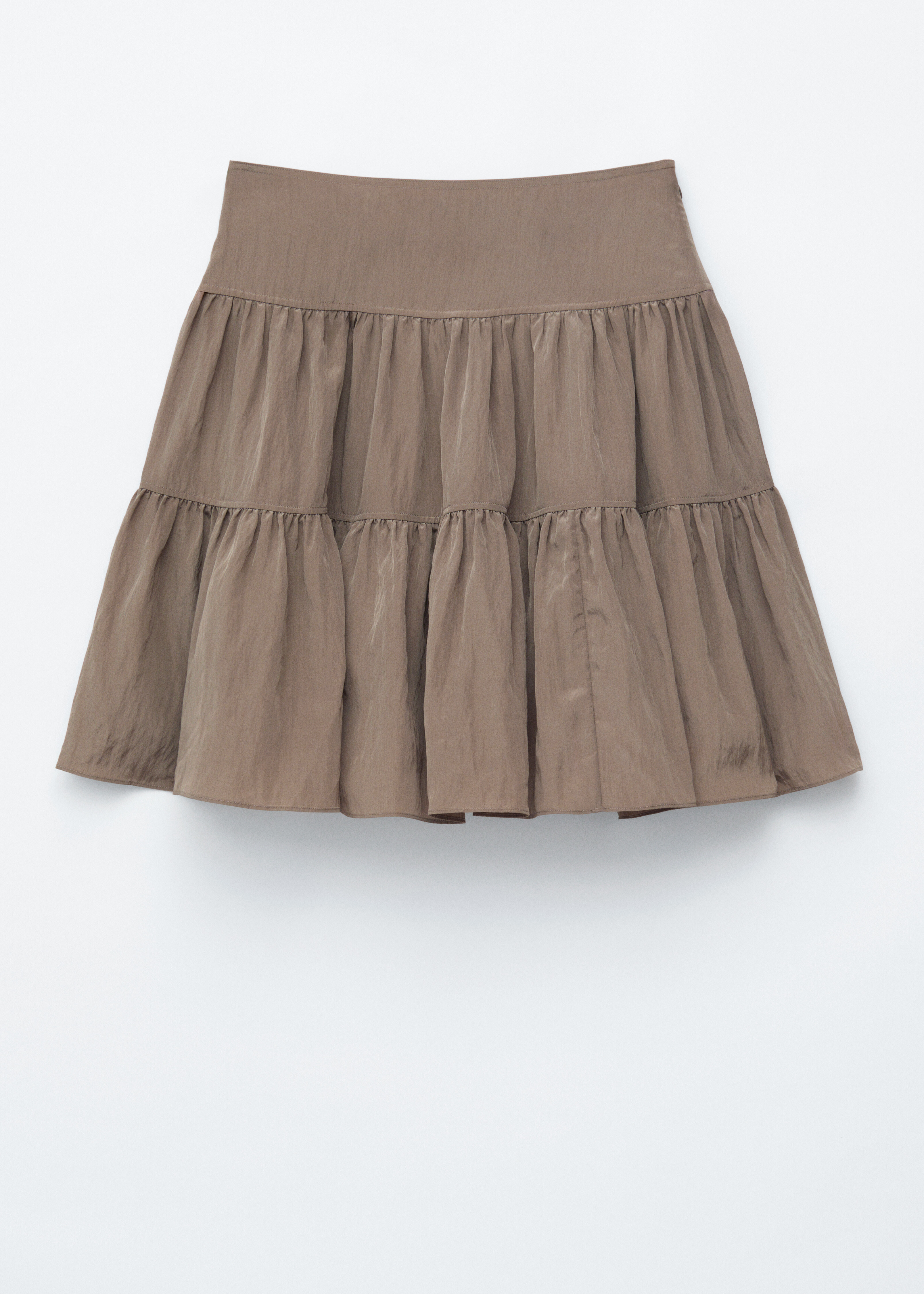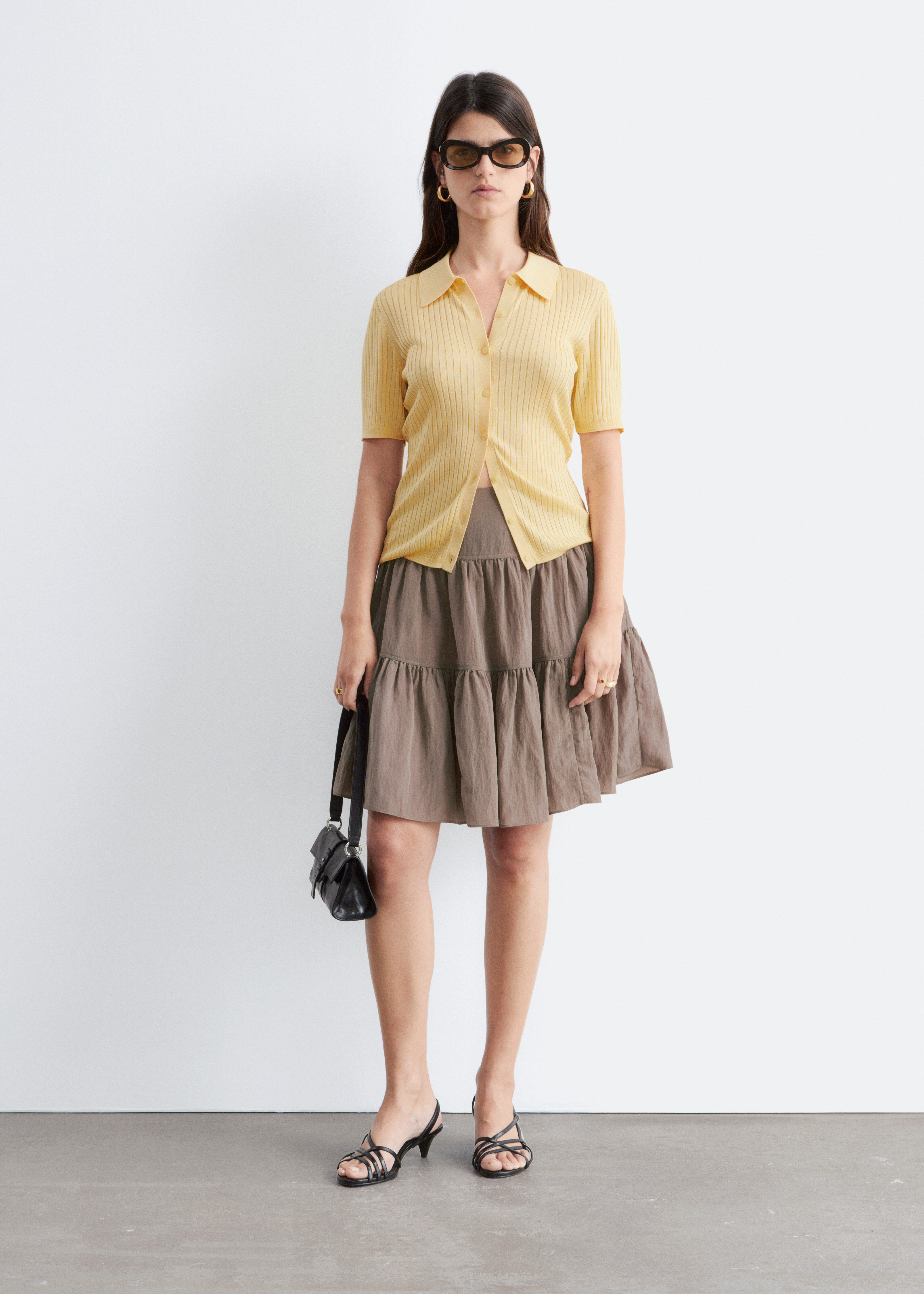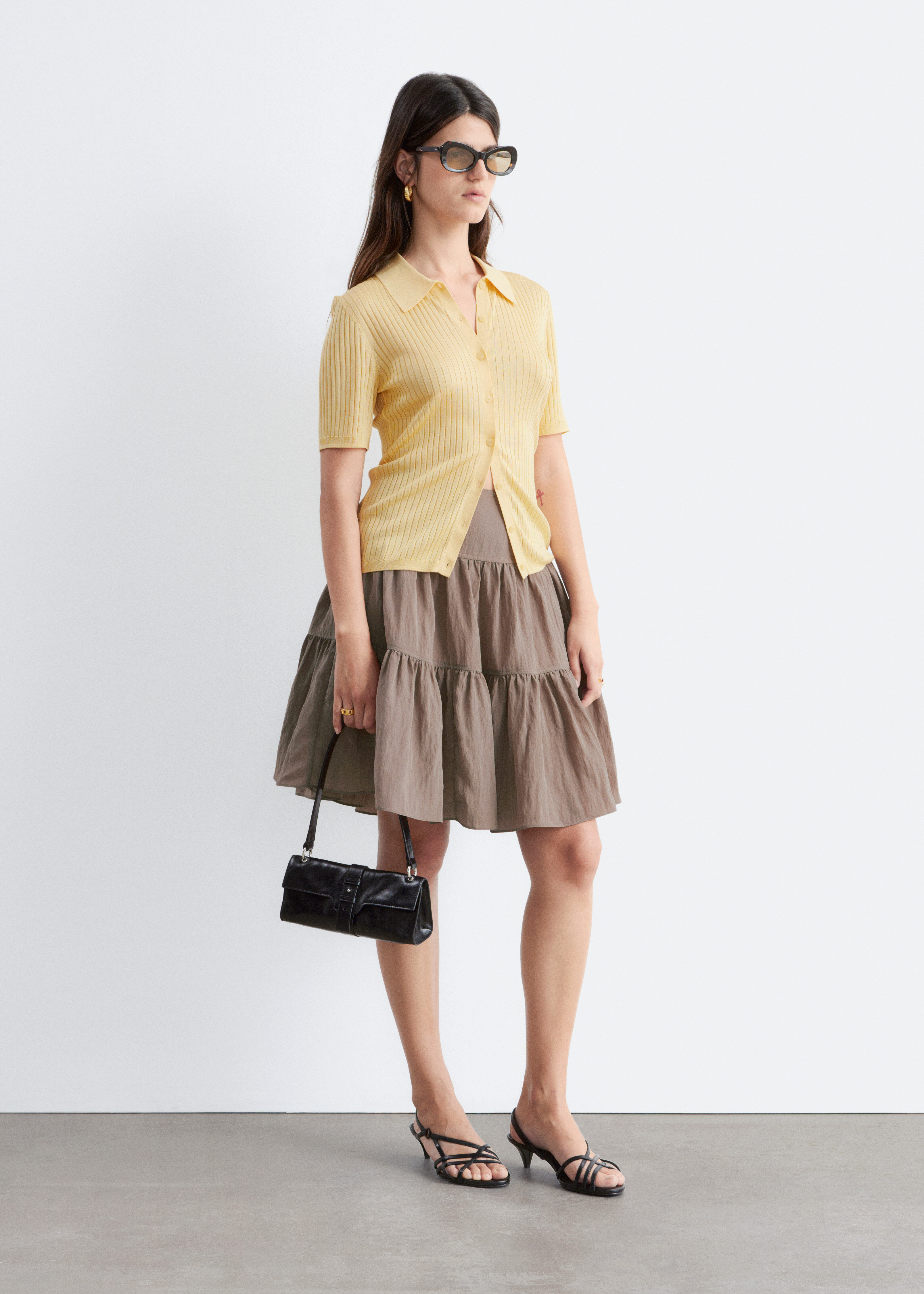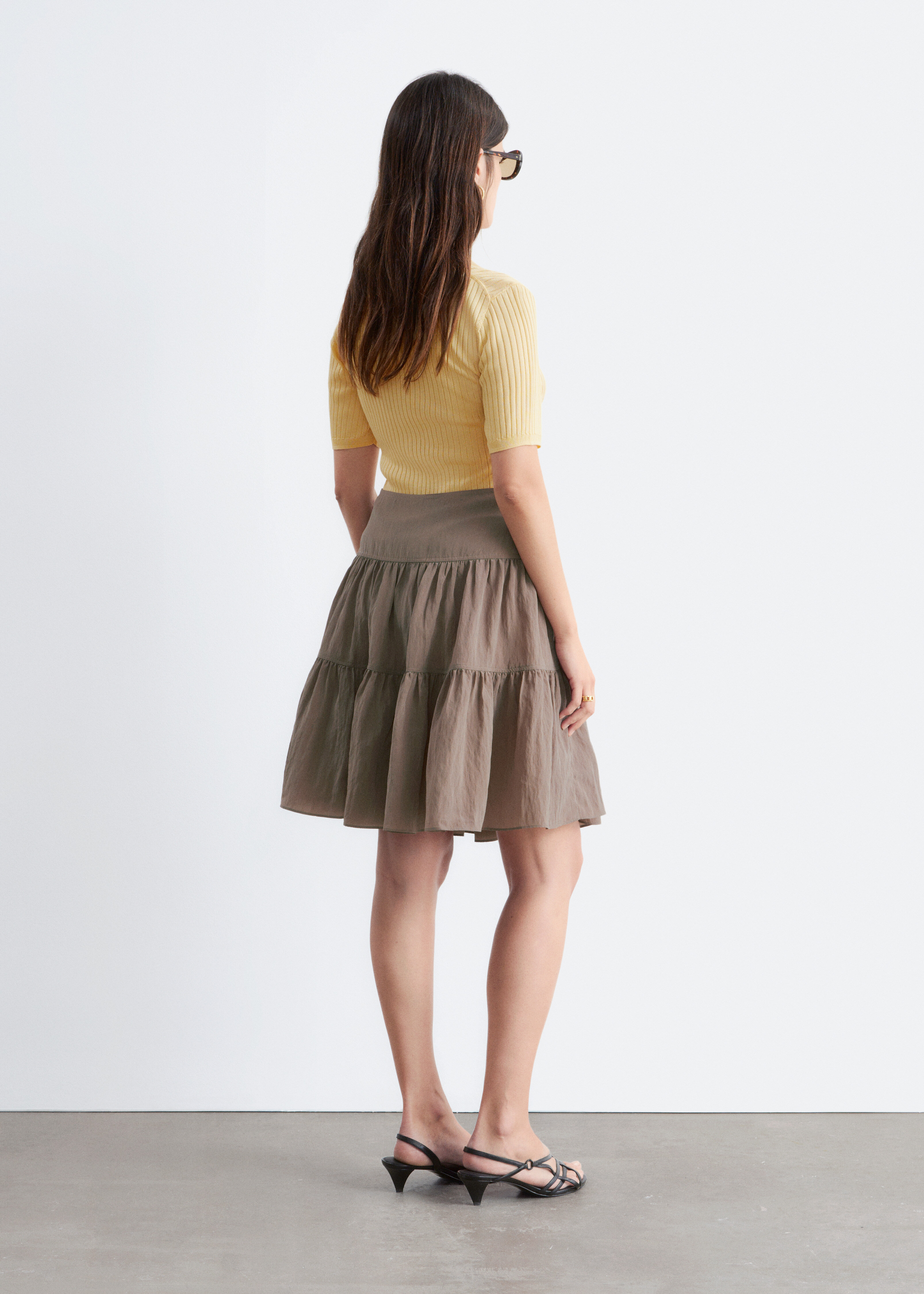 여성적 무드와 스포티함이 어우러진 스커트예요. 산뜻한 나일론 소재로 탄생했으며, 무릎까지 오는 A 라인 실루엣이 특징이에요. 부드러운 여러 겹의 레이어가 텍스처와 볼륨감을 더해주며, 옆면의 히든 지퍼로 깔끔하답니다.