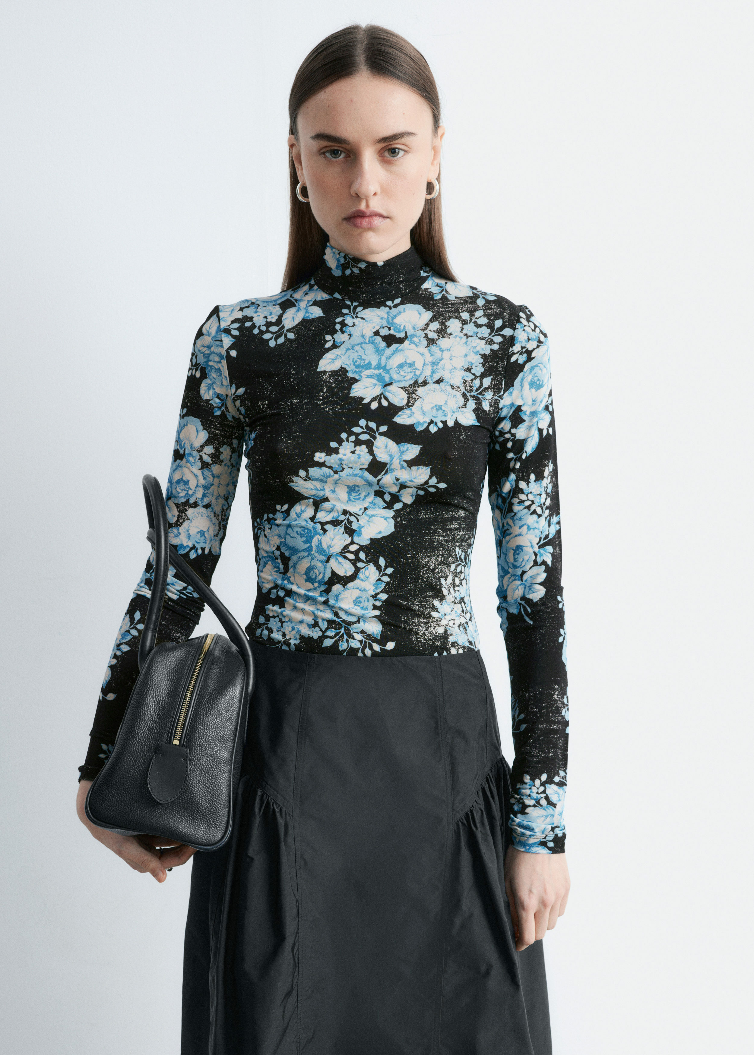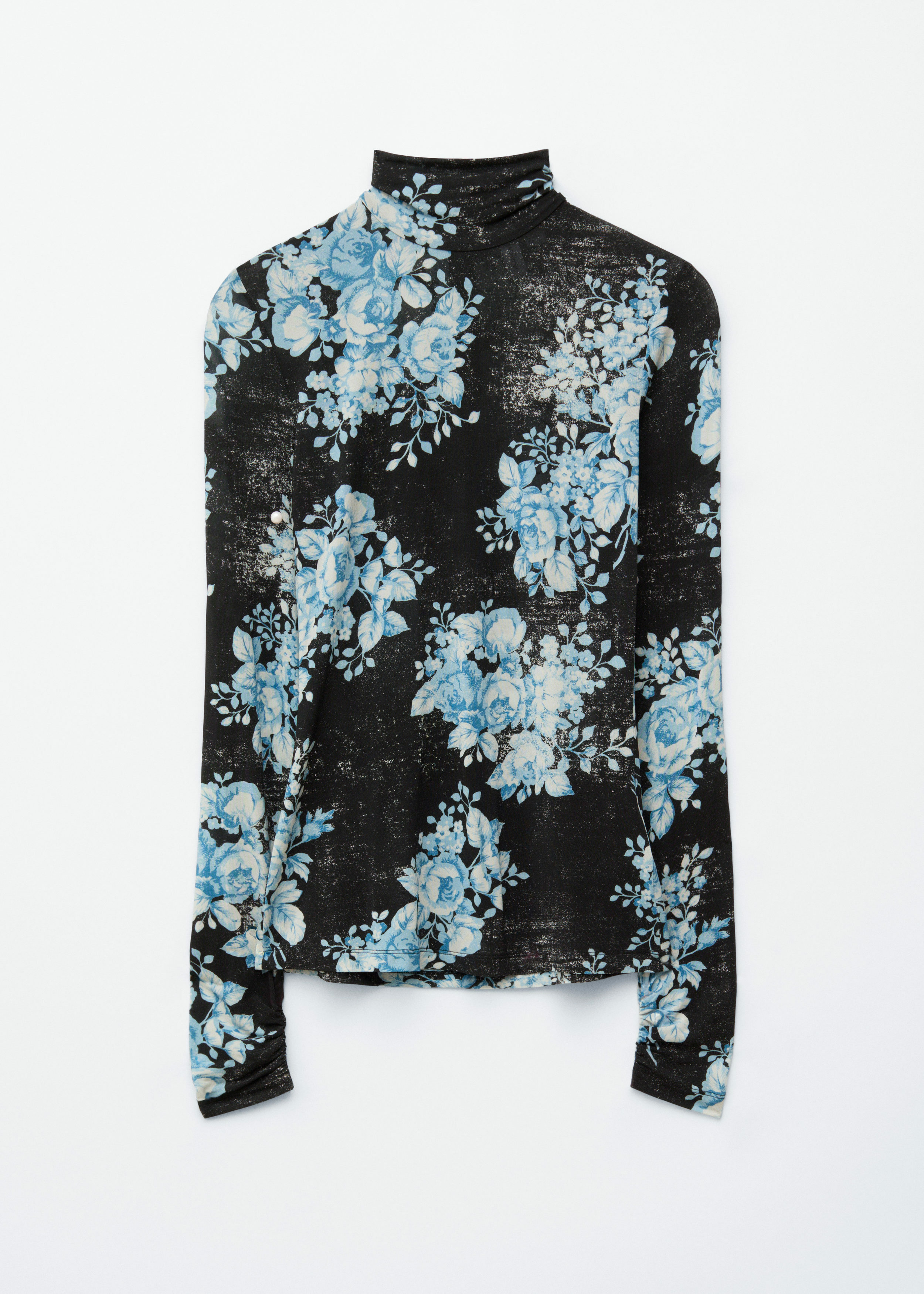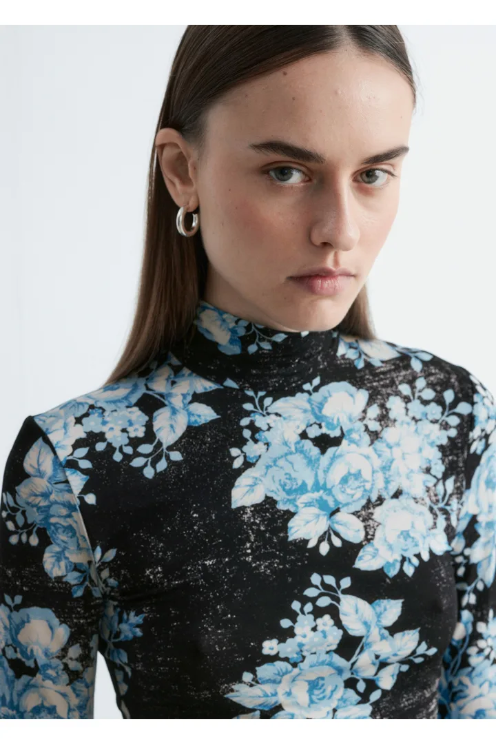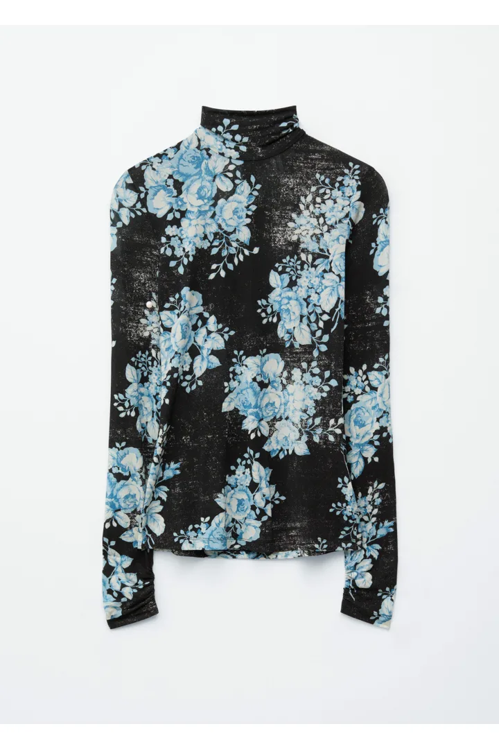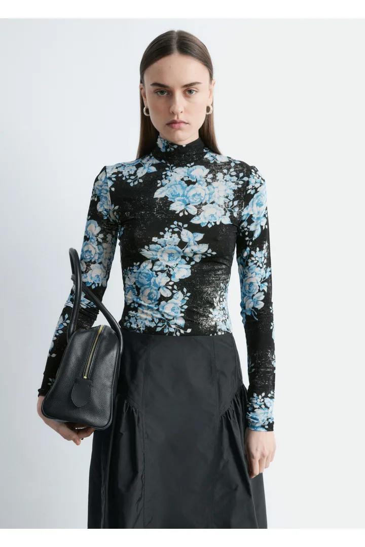 플로럴 패턴의 유려한 저지로 탄생한 롱 슬리브 터틀넥 탑이에요. 커프스와 네크라인 뒷면의 섬세한 셔링이 부드러운 드레이프 실루엣을 연출한답니다. 네크라인에는 컨실드 지퍼가 자리해 있어요.