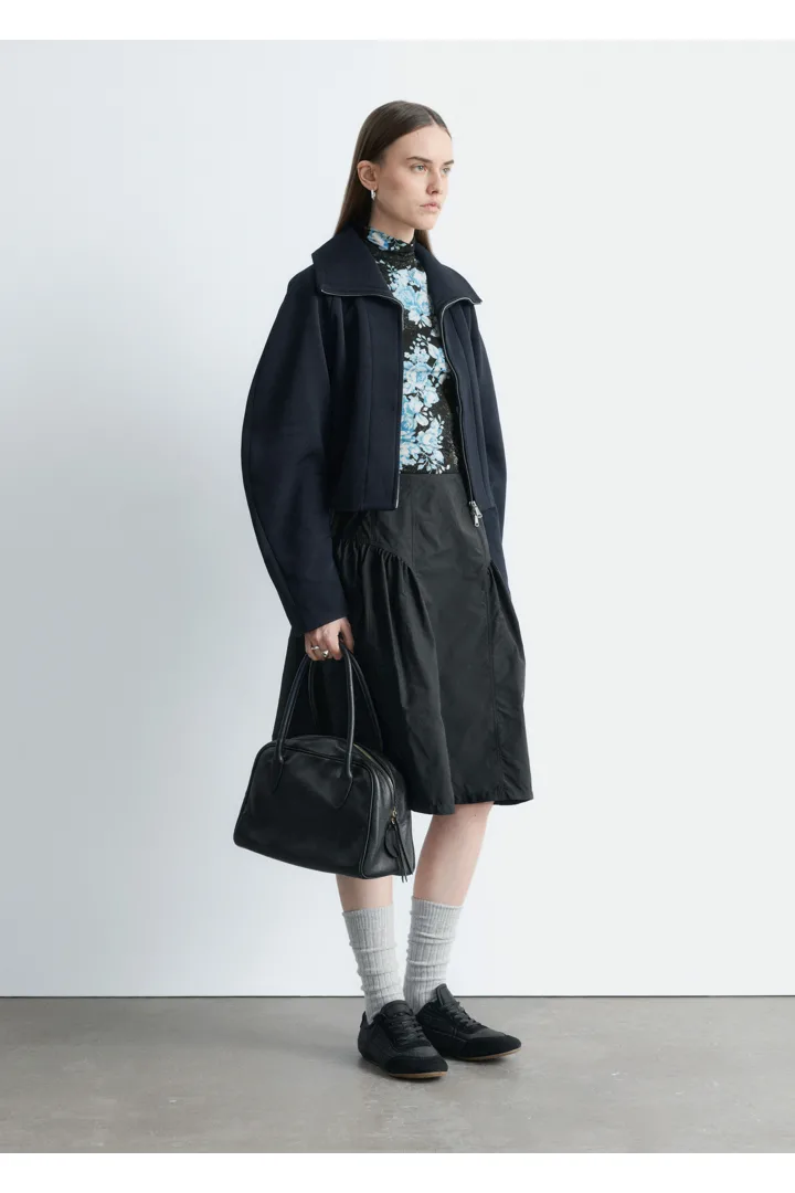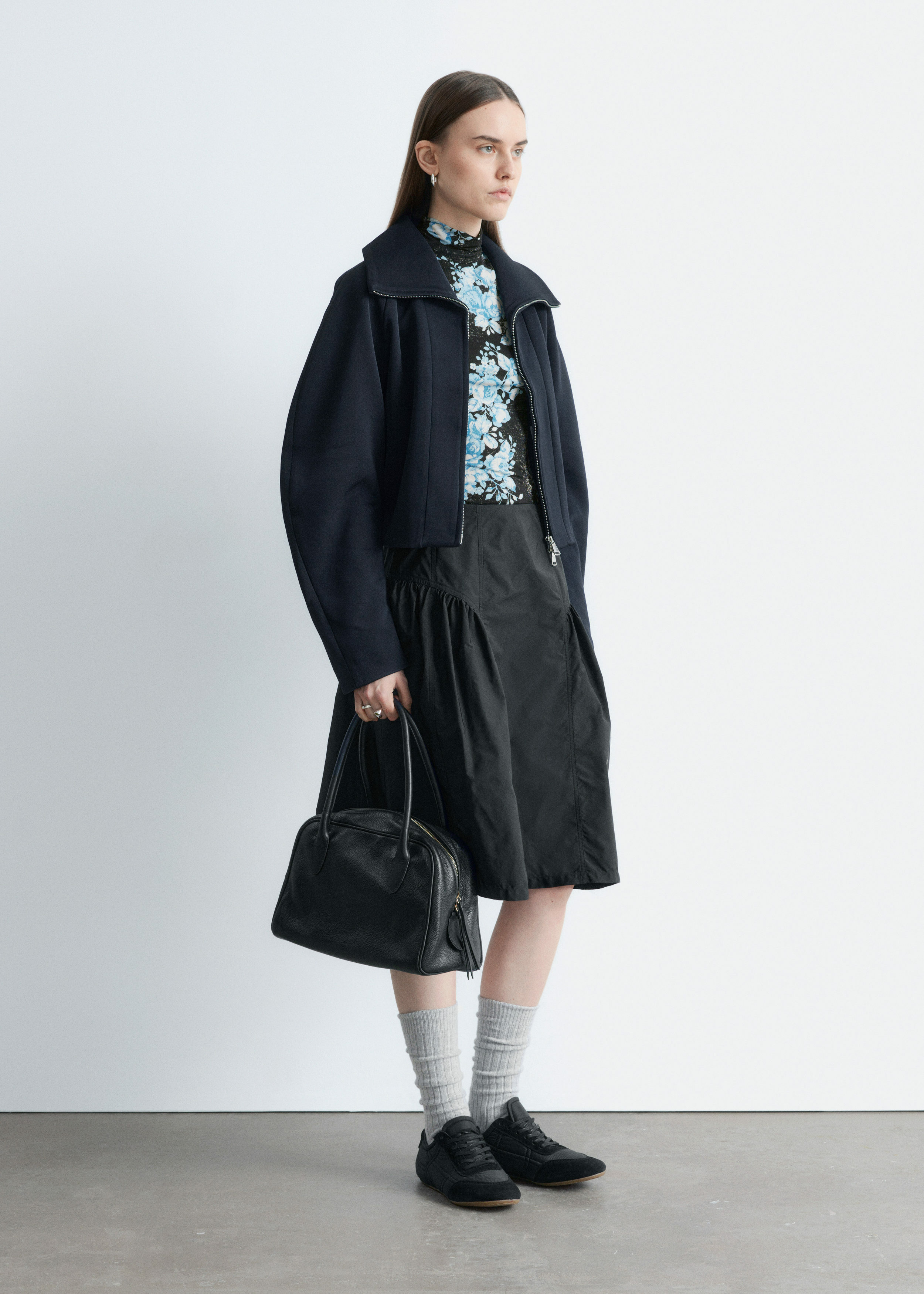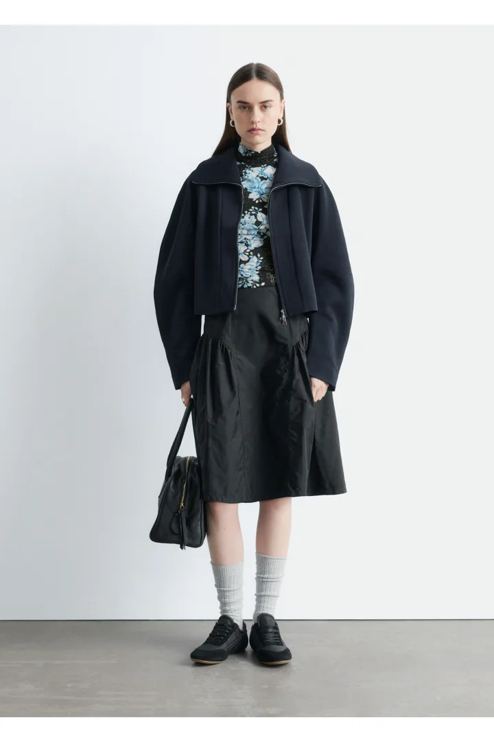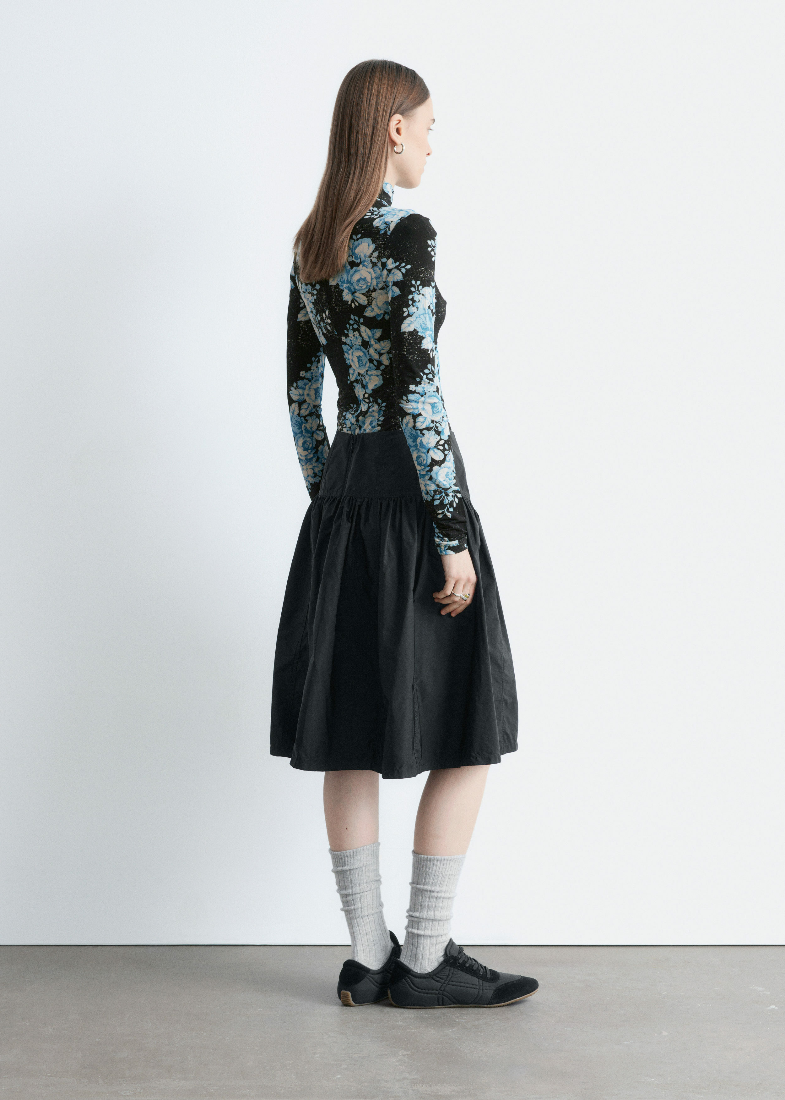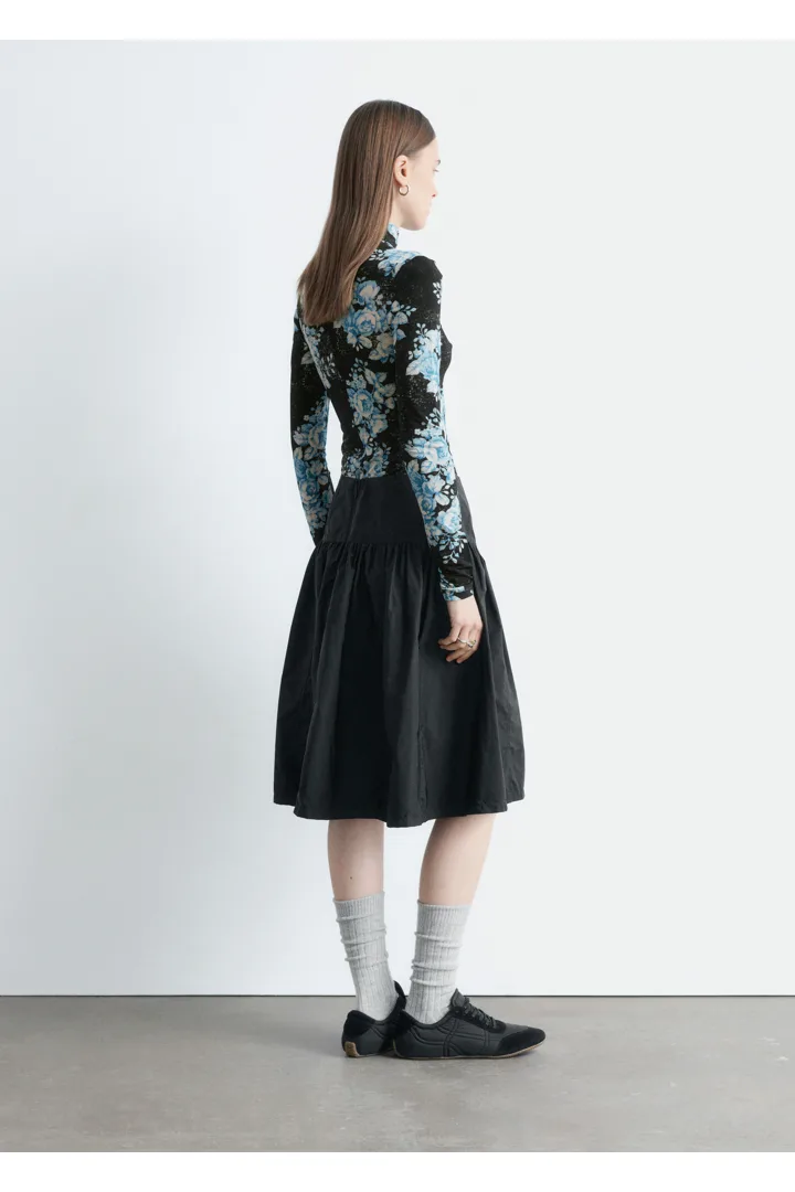 플로럴 패턴의 유려한 저지로 탄생한 롱 슬리브 터틀넥 탑이에요. 커프스와 네크라인 뒷면의 섬세한 셔링이 부드러운 드레이프 실루엣을 연출한답니다. 네크라인에는 컨실드 지퍼가 자리해 있어요.