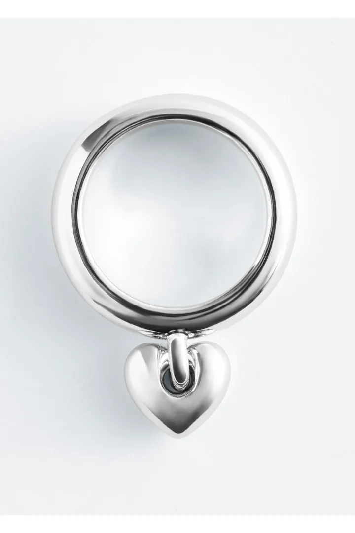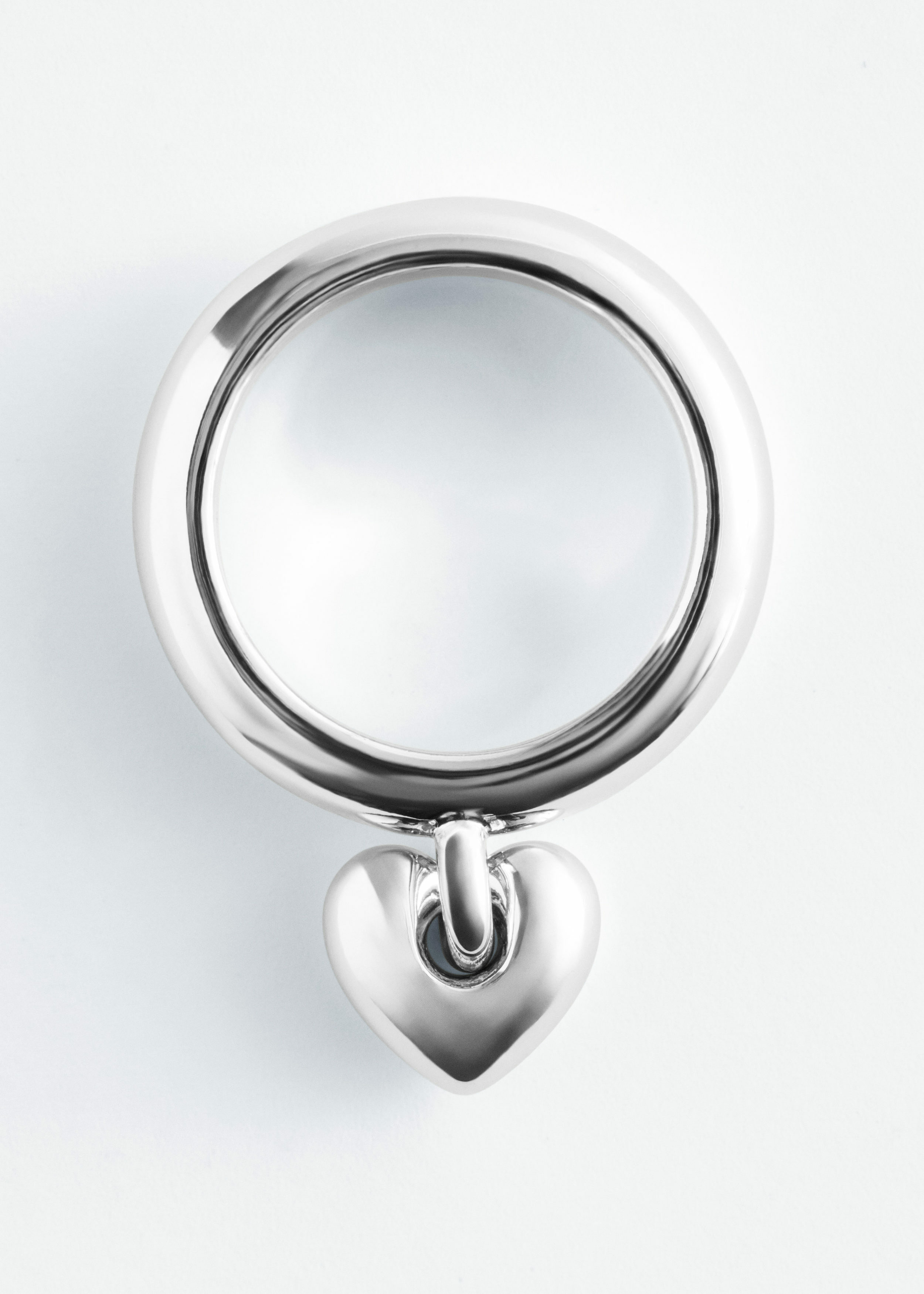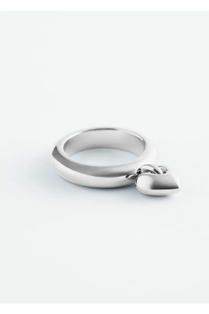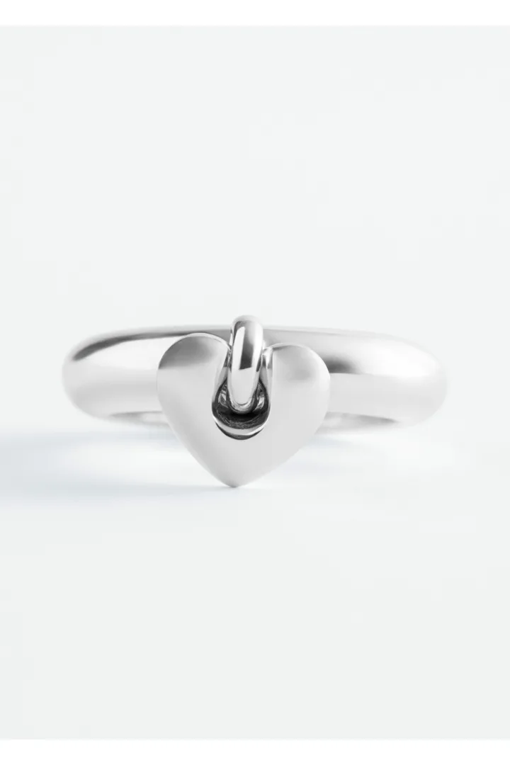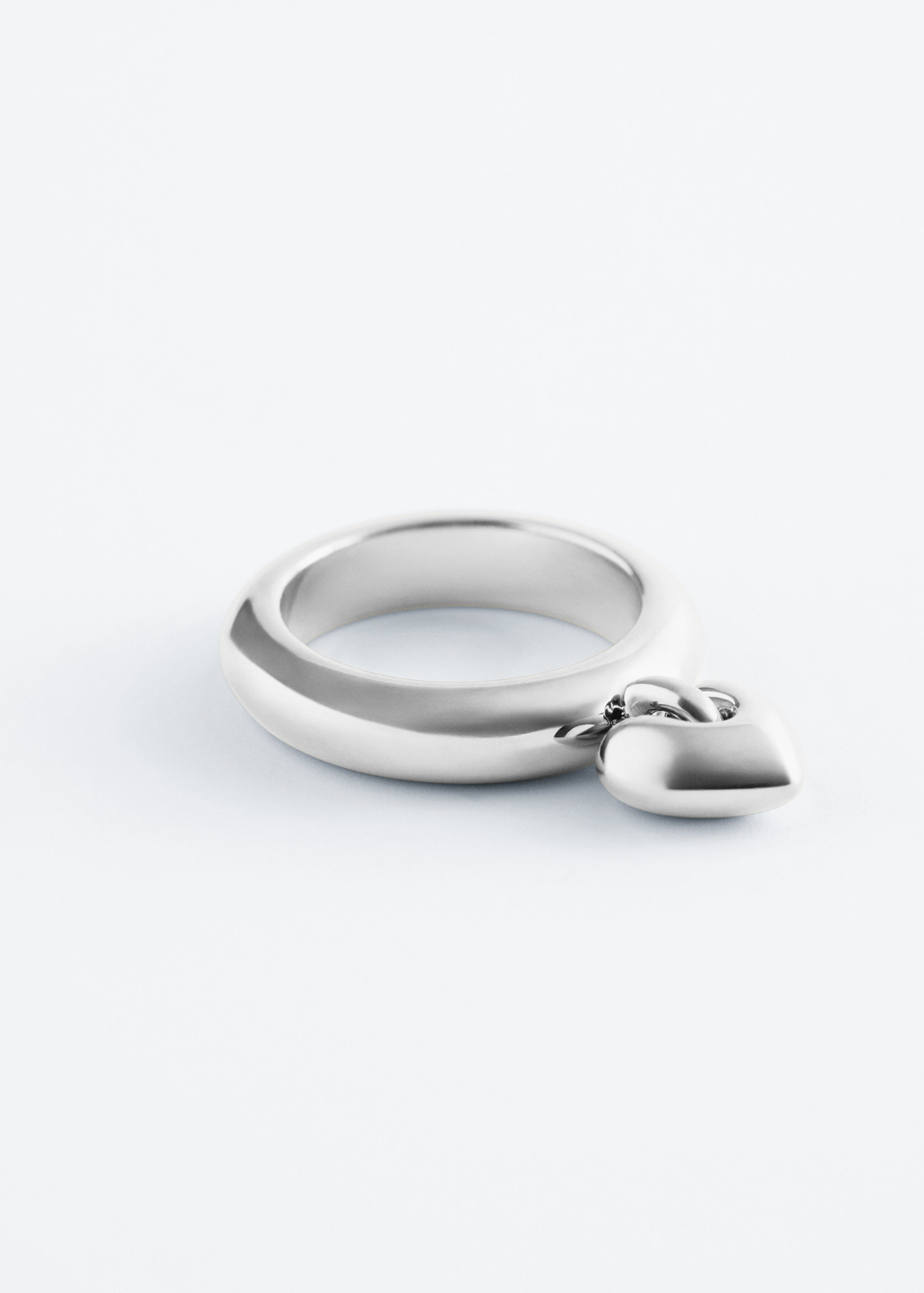 유광 브라스 소재의 링이에요. 청키한 밴드와 섬세한 하트 펜던트가 특징이랍니다.