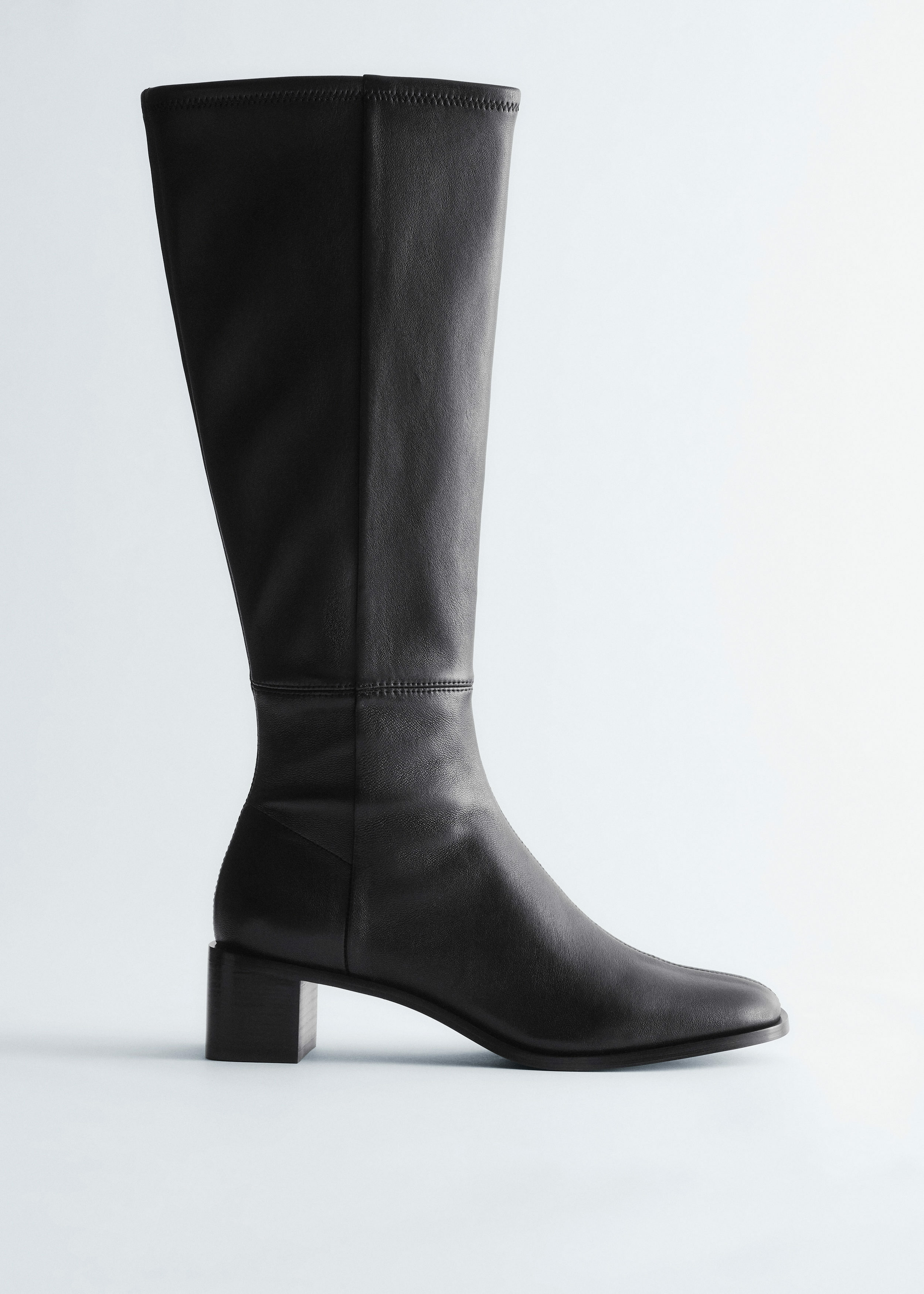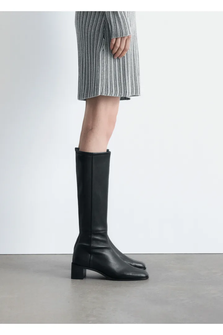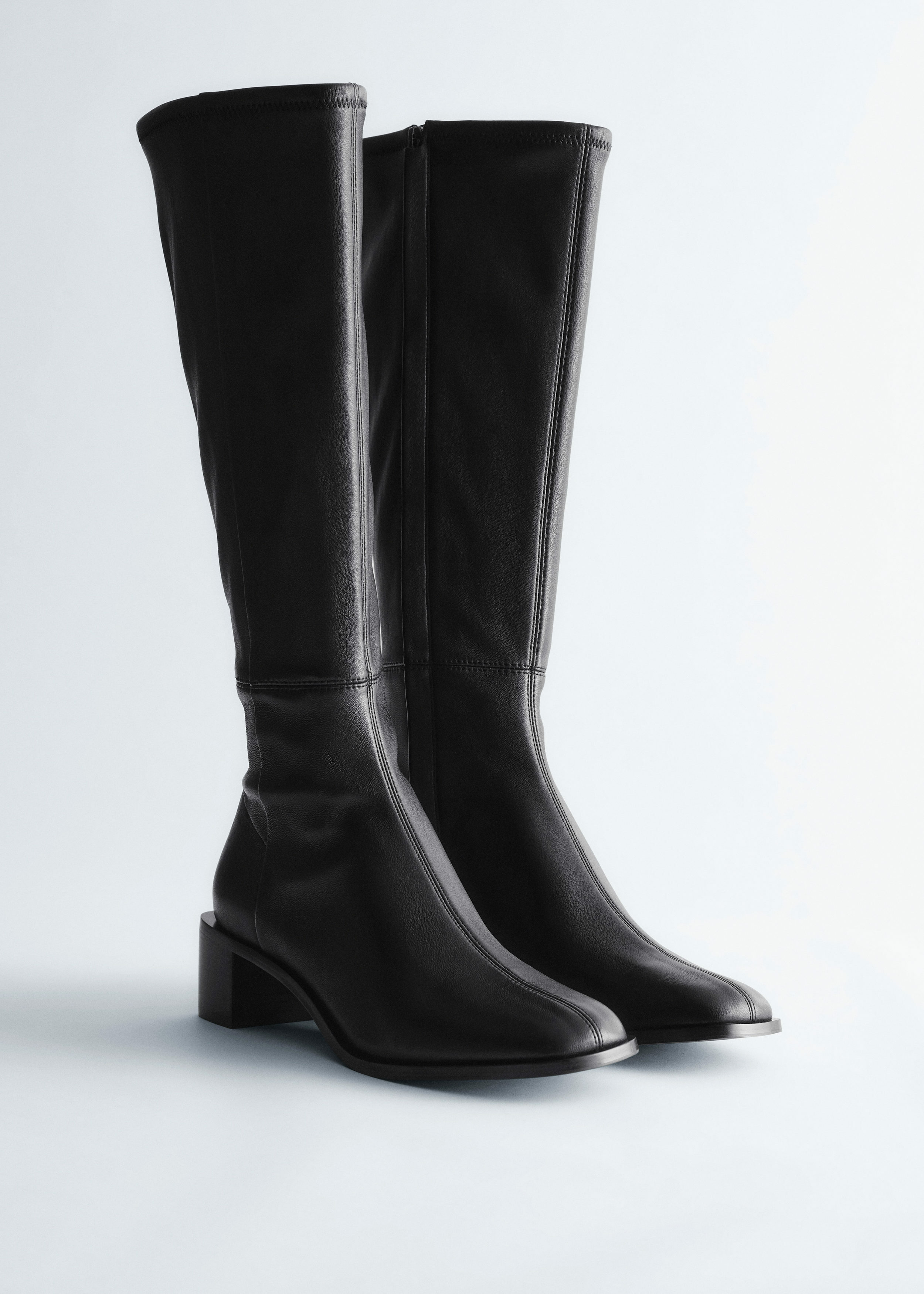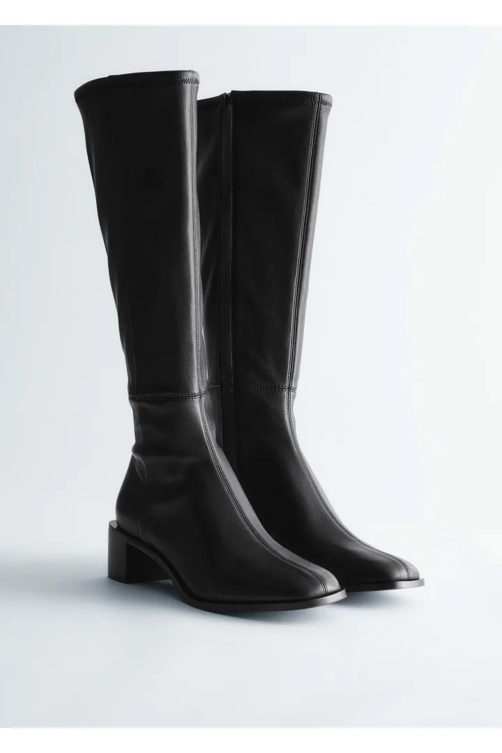 매일의 일상에 힘을 뺀 세련미를 더하기 좋은 니하이 삭 부츠예요. 신축성 좋은 나파 소재로 탄생했으며 스퀘어 앞코, 중앙의 탑스티치 솔기, 측면의 컨실드 지퍼가 자리해 있어요. 살짝 비스듬하게 자리한 청키 블록 힐이 구조적인 무드를 더해준답니다.