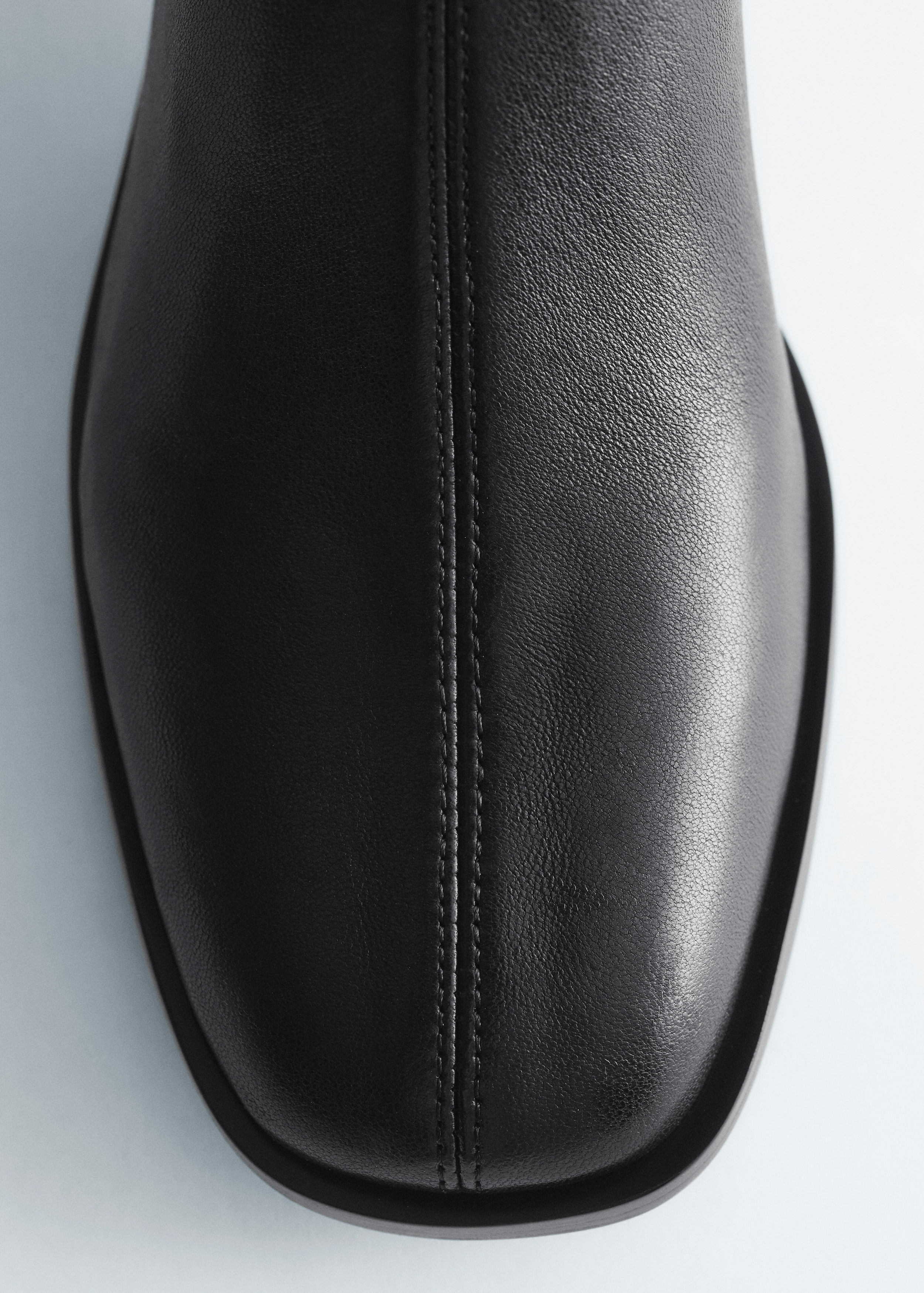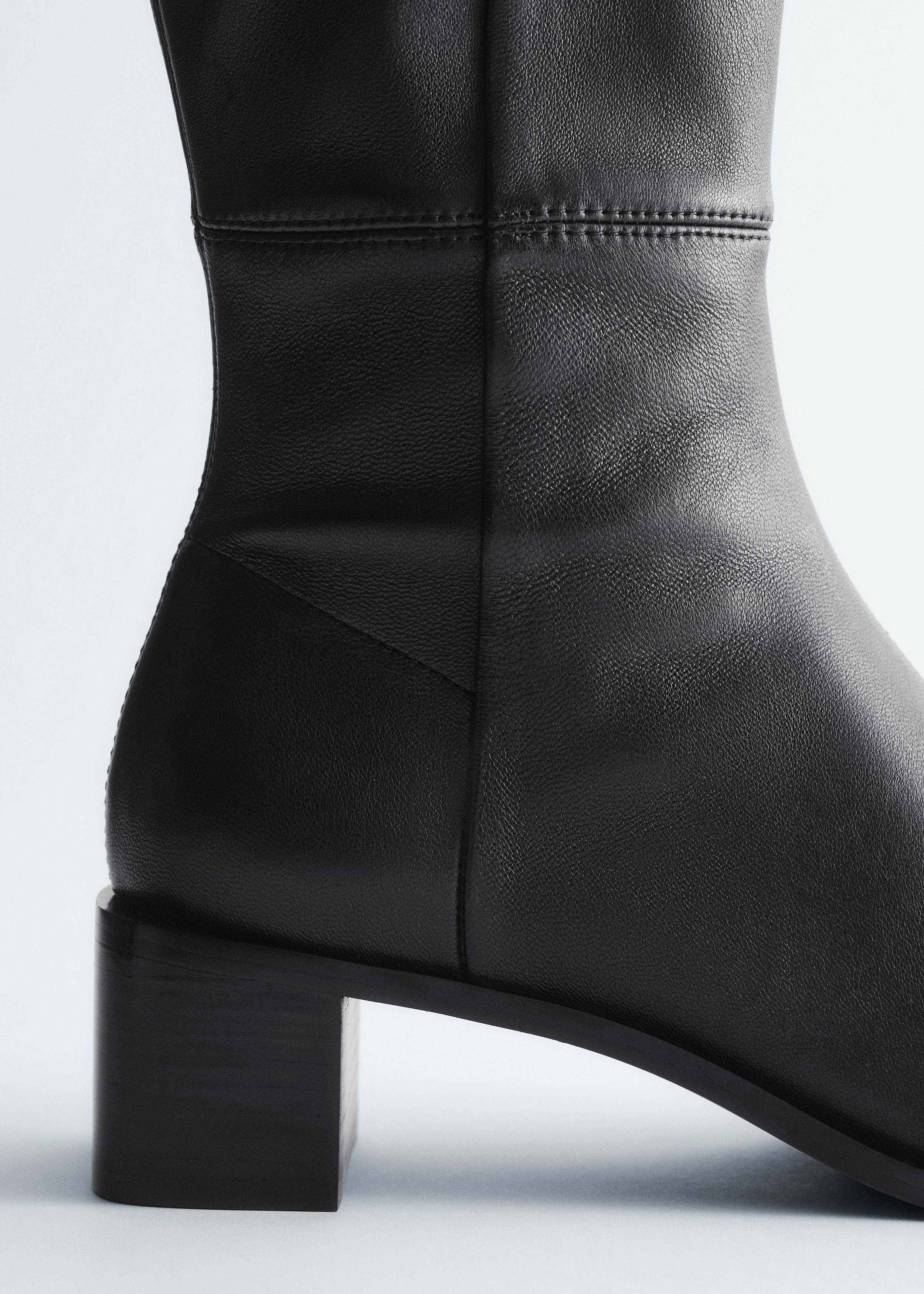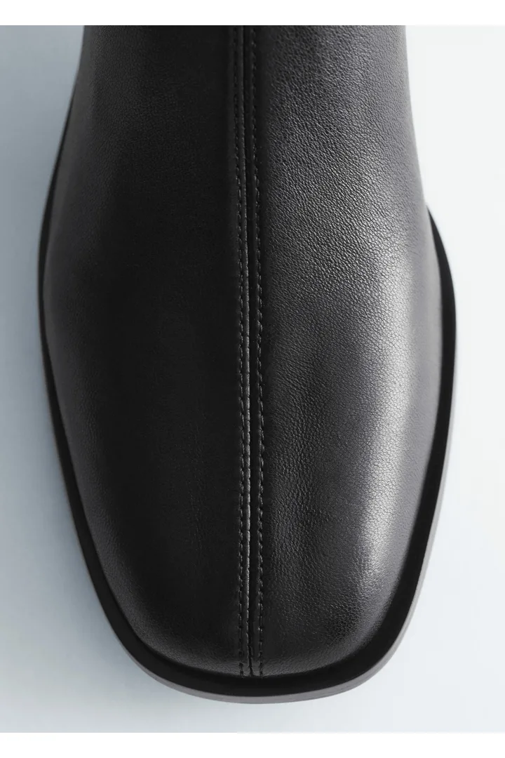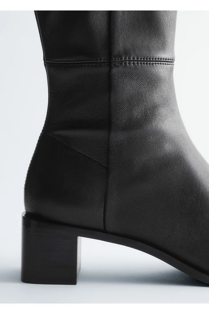 매일의 일상에 힘을 뺀 세련미를 더하기 좋은 니하이 삭 부츠예요. 신축성 좋은 나파 소재로 탄생했으며 스퀘어 앞코, 중앙의 탑스티치 솔기, 측면의 컨실드 지퍼가 자리해 있어요. 살짝 비스듬하게 자리한 청키 블록 힐이 구조적인 무드를 더해준답니다.