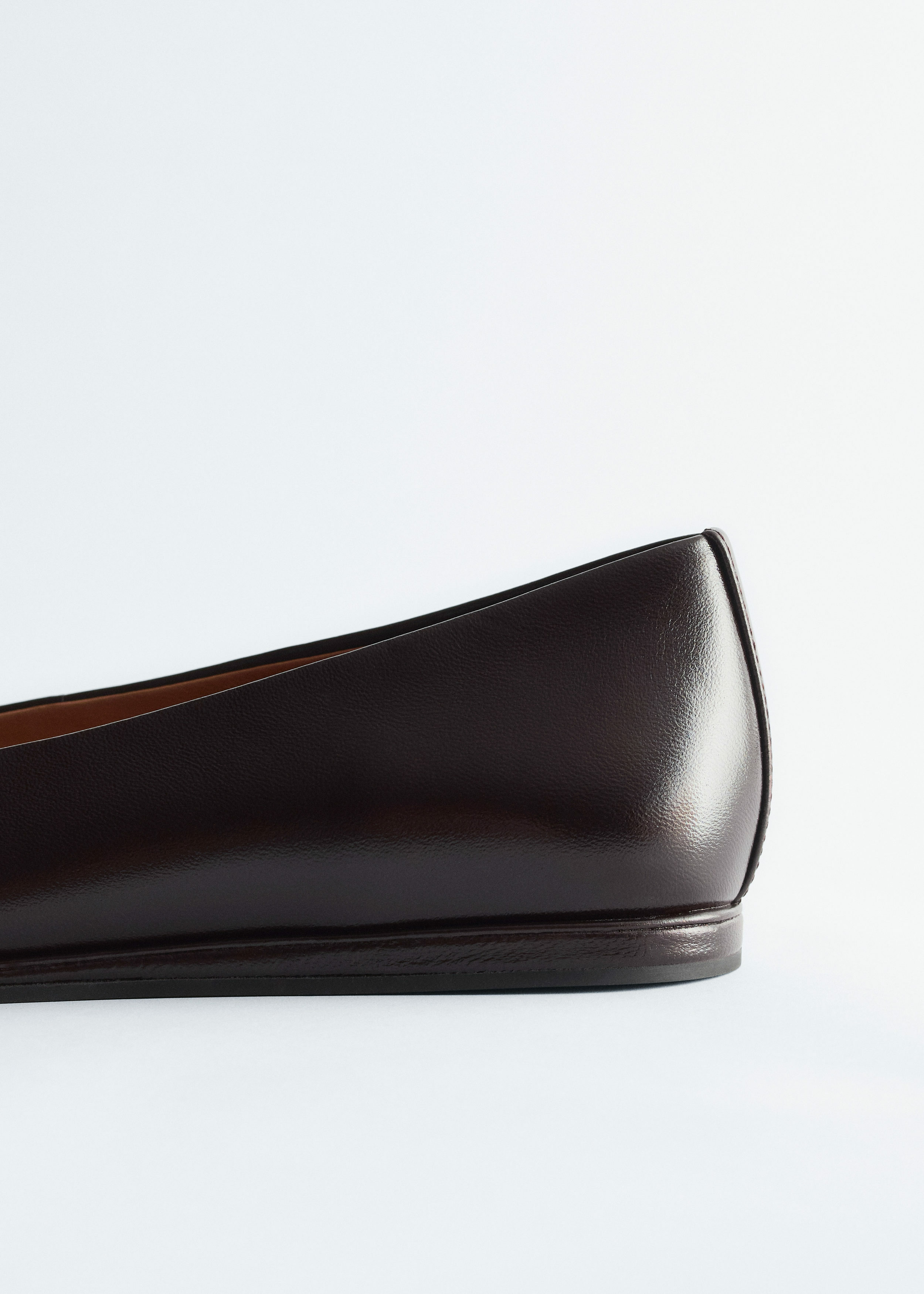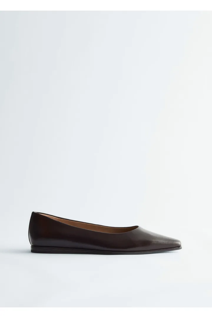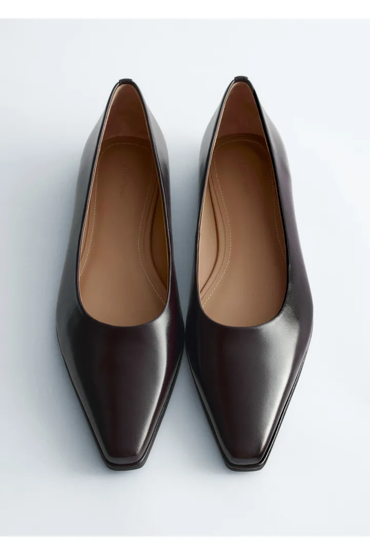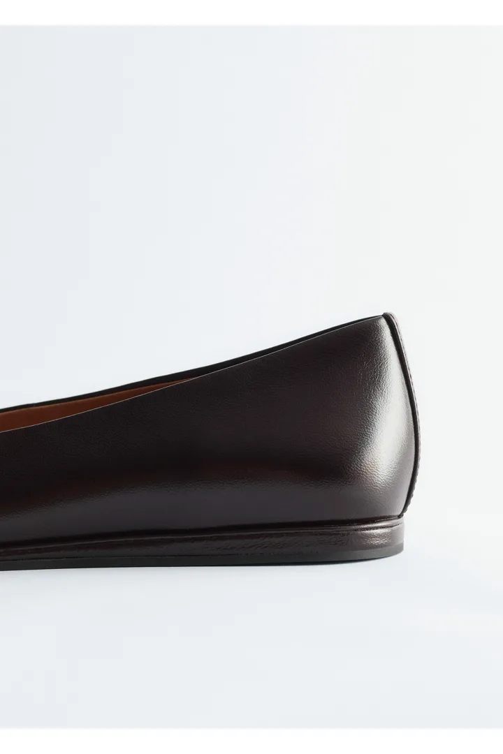유연한 가죽 소재로 제작된 발레 플랫 슈즈예요. 포인트 앞코, 둥근 로우 컷 오프닝, 그리고 낮은 웨지 힐이 특징이랍니다.