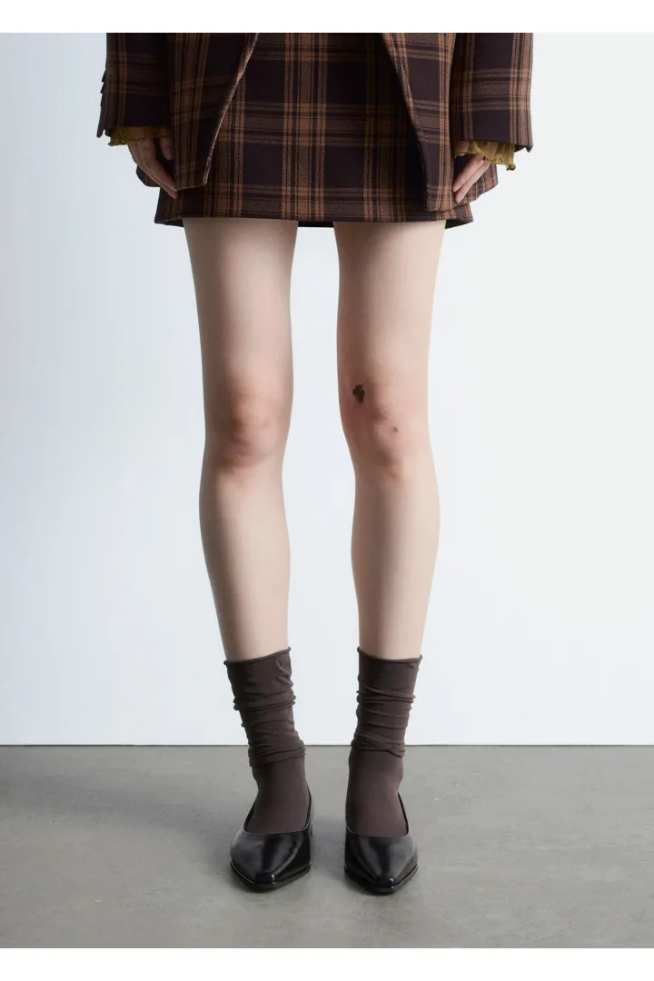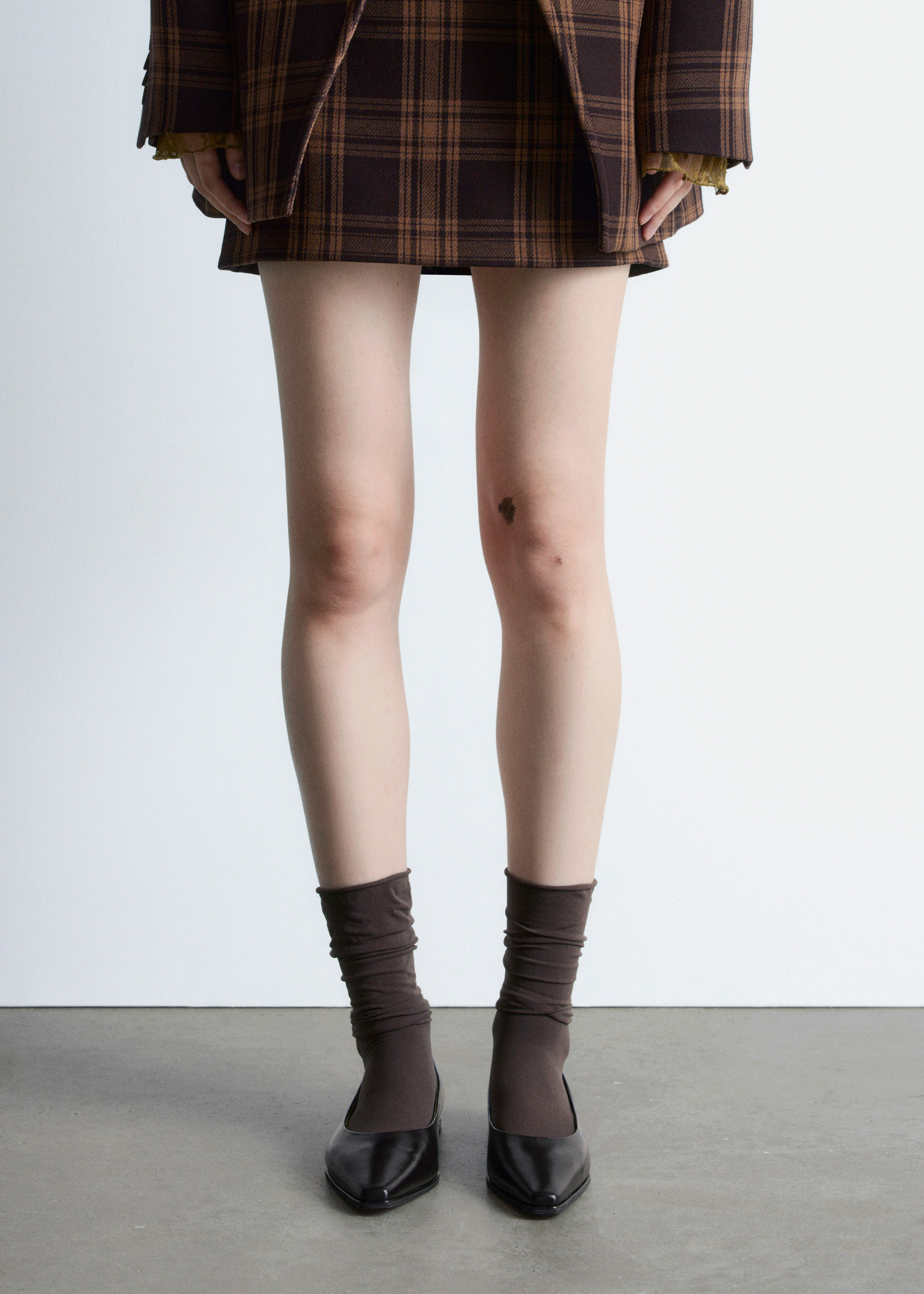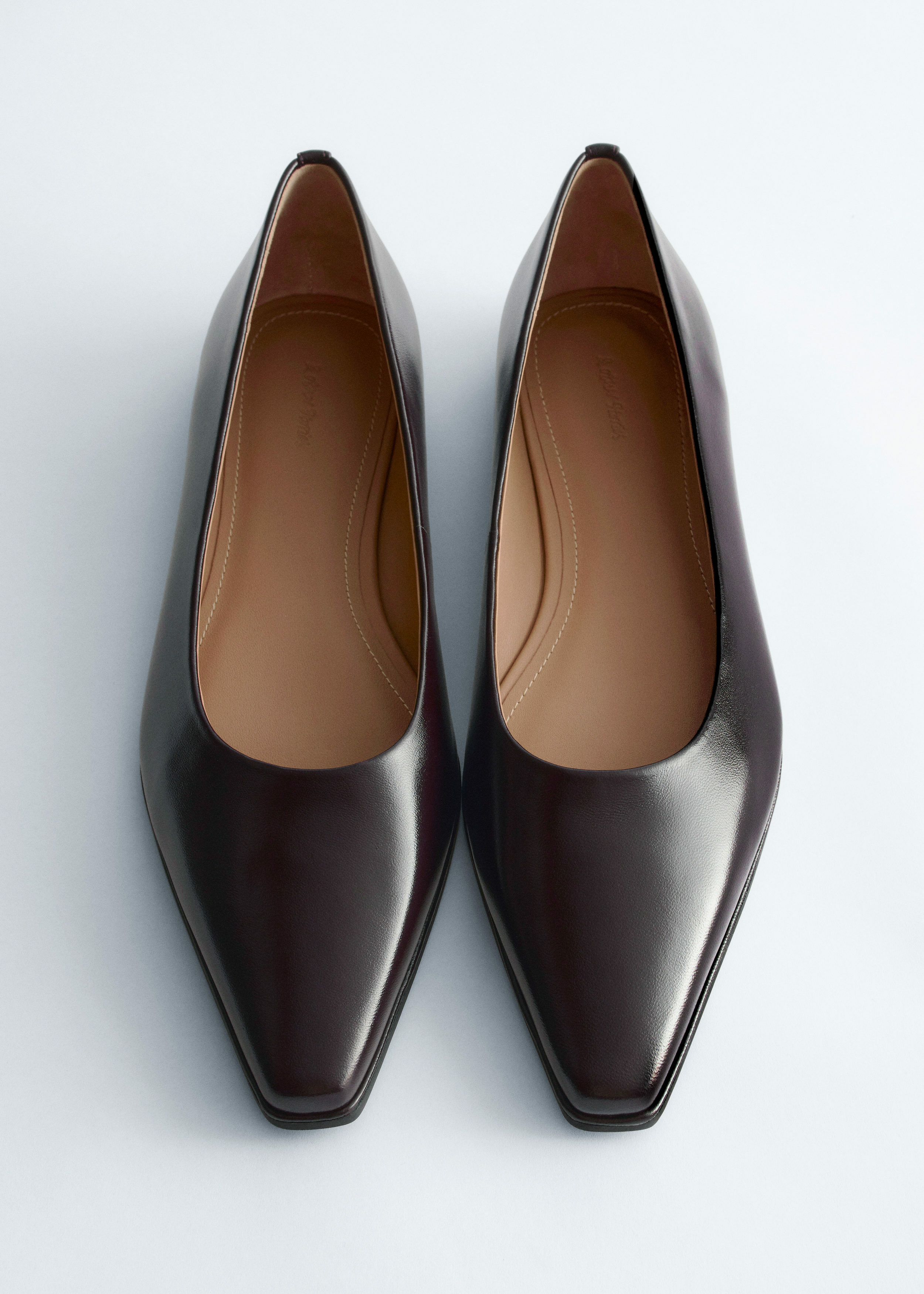 유연한 가죽 소재로 제작된 발레 플랫 슈즈예요. 포인트 앞코, 둥근 로우 컷 오프닝, 그리고 낮은 웨지 힐이 특징이랍니다.