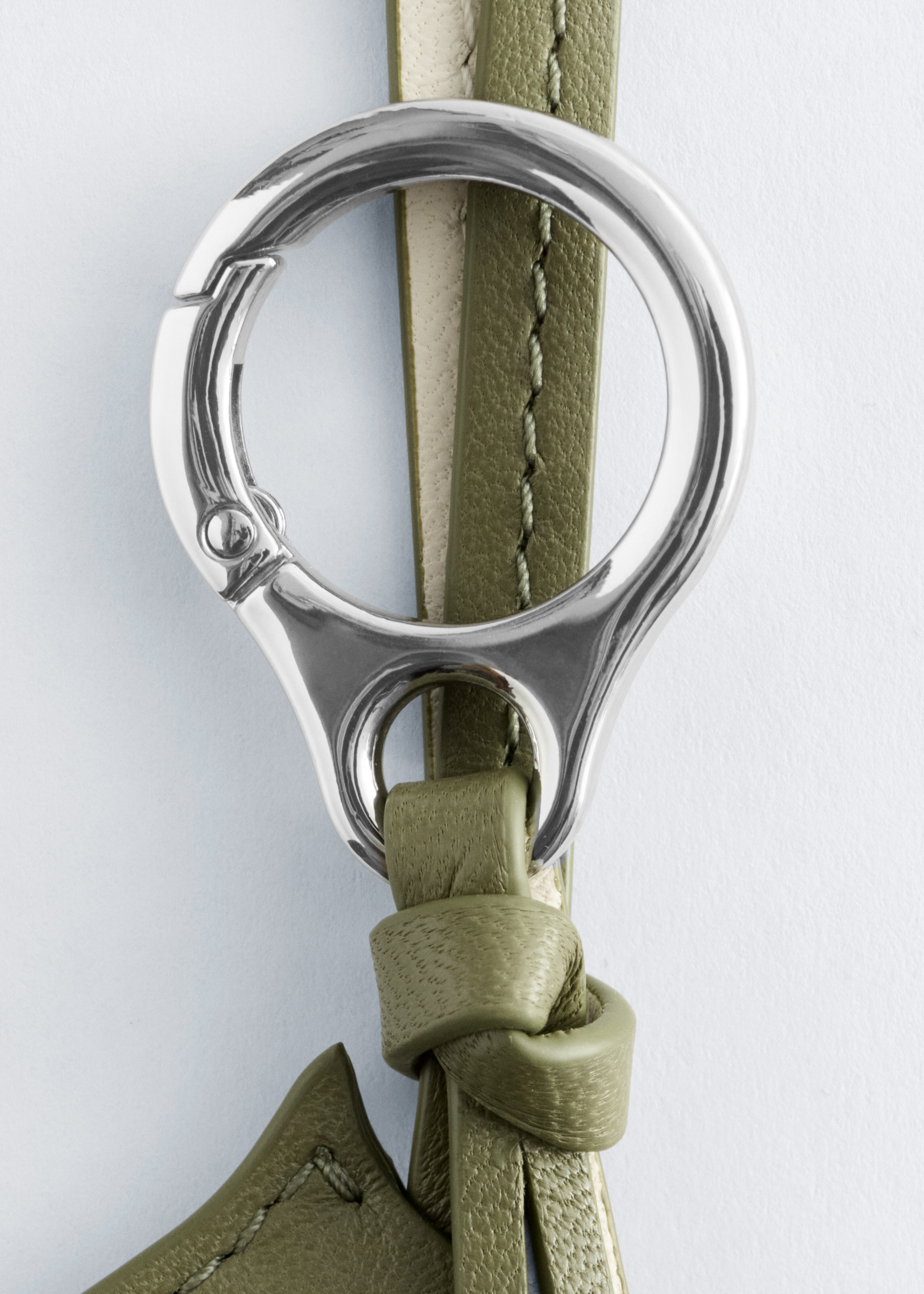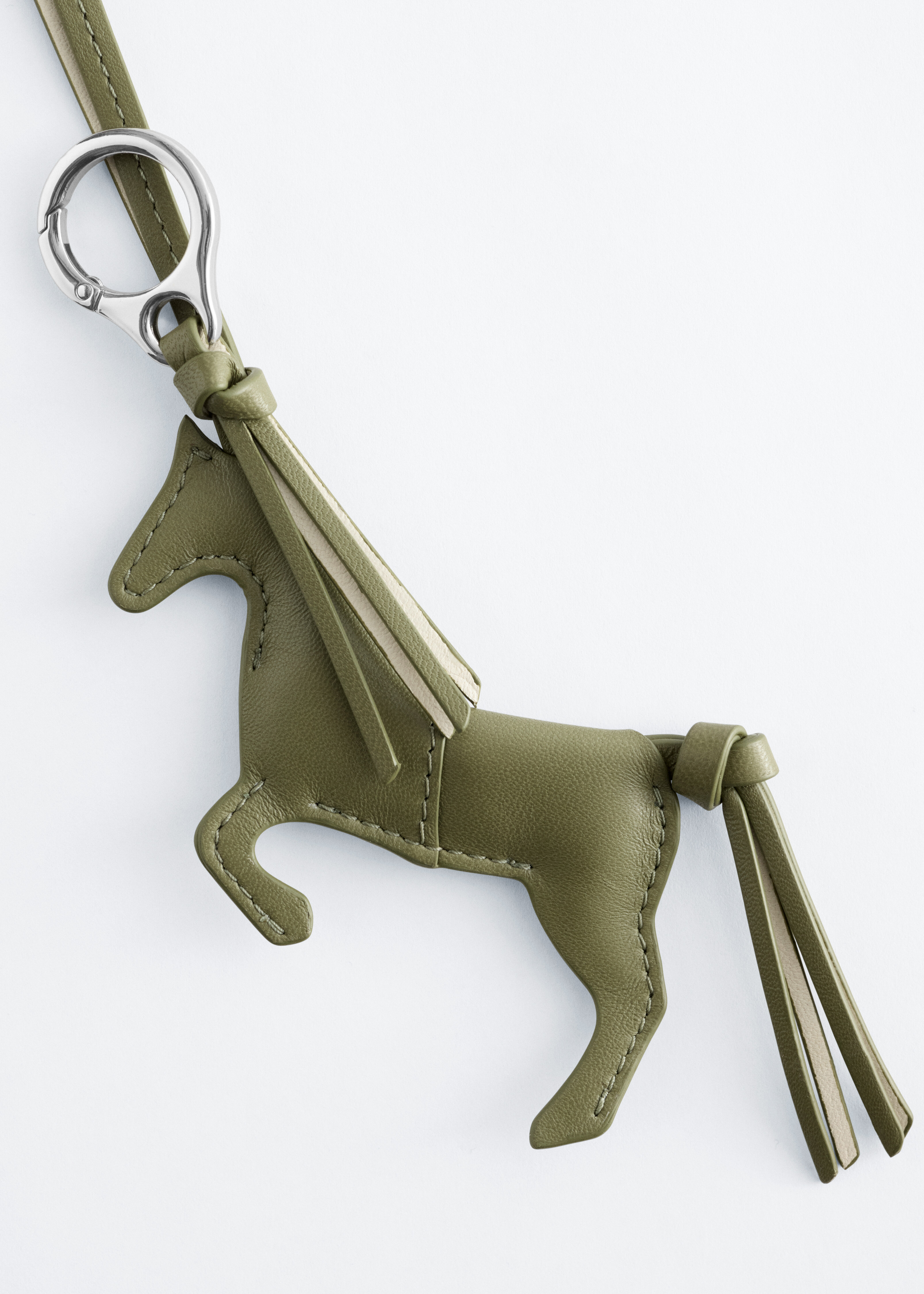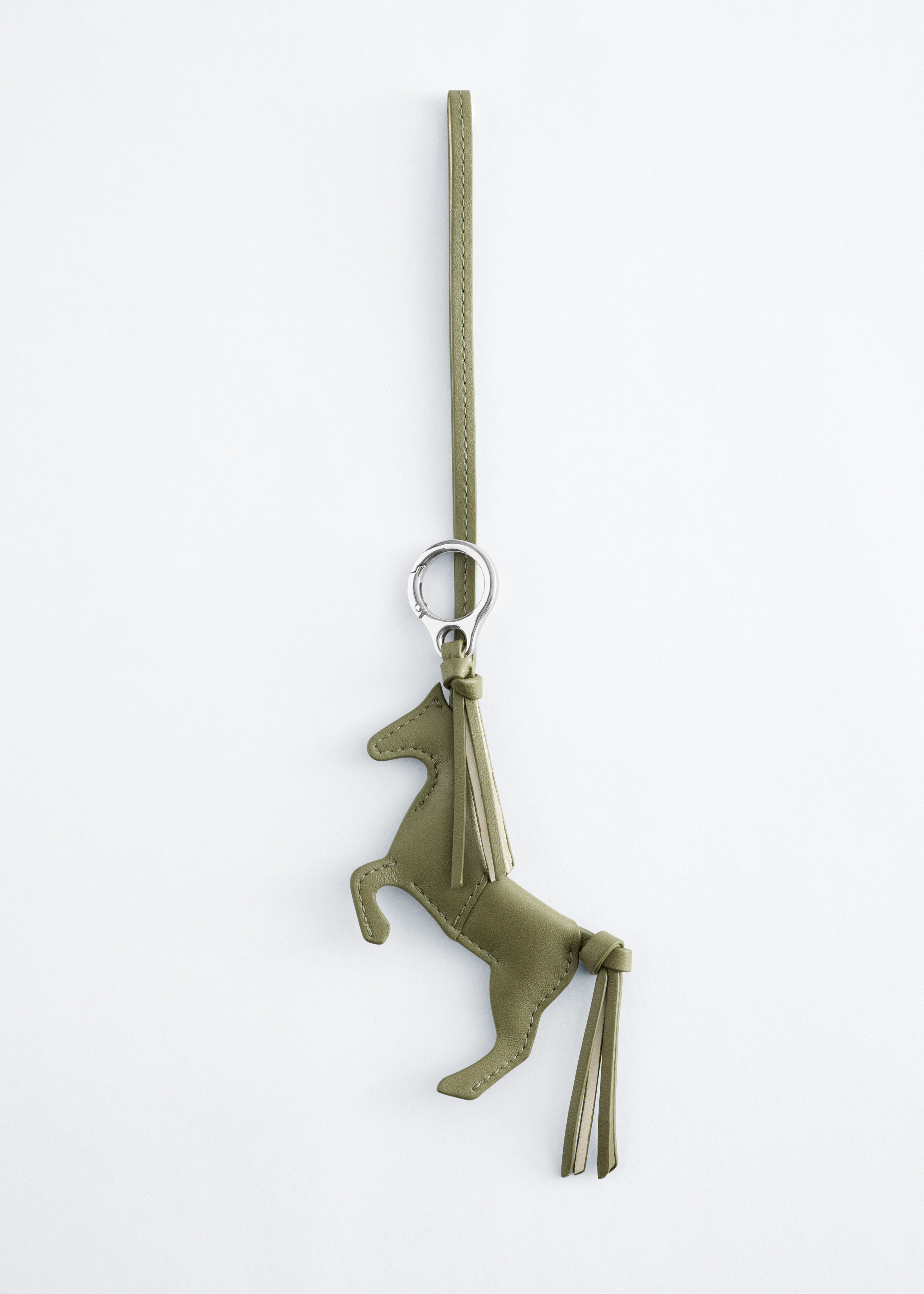가죽 소재로 제작된 이 백 참은 장식용 태슬이 달린 말 모양 피규어가 특징입니다. 긴 루프와 카라비너 클립이 있어 가방, 열쇠, 벨트 고리 등에 쉽게 탈부착할 수 있습니다.