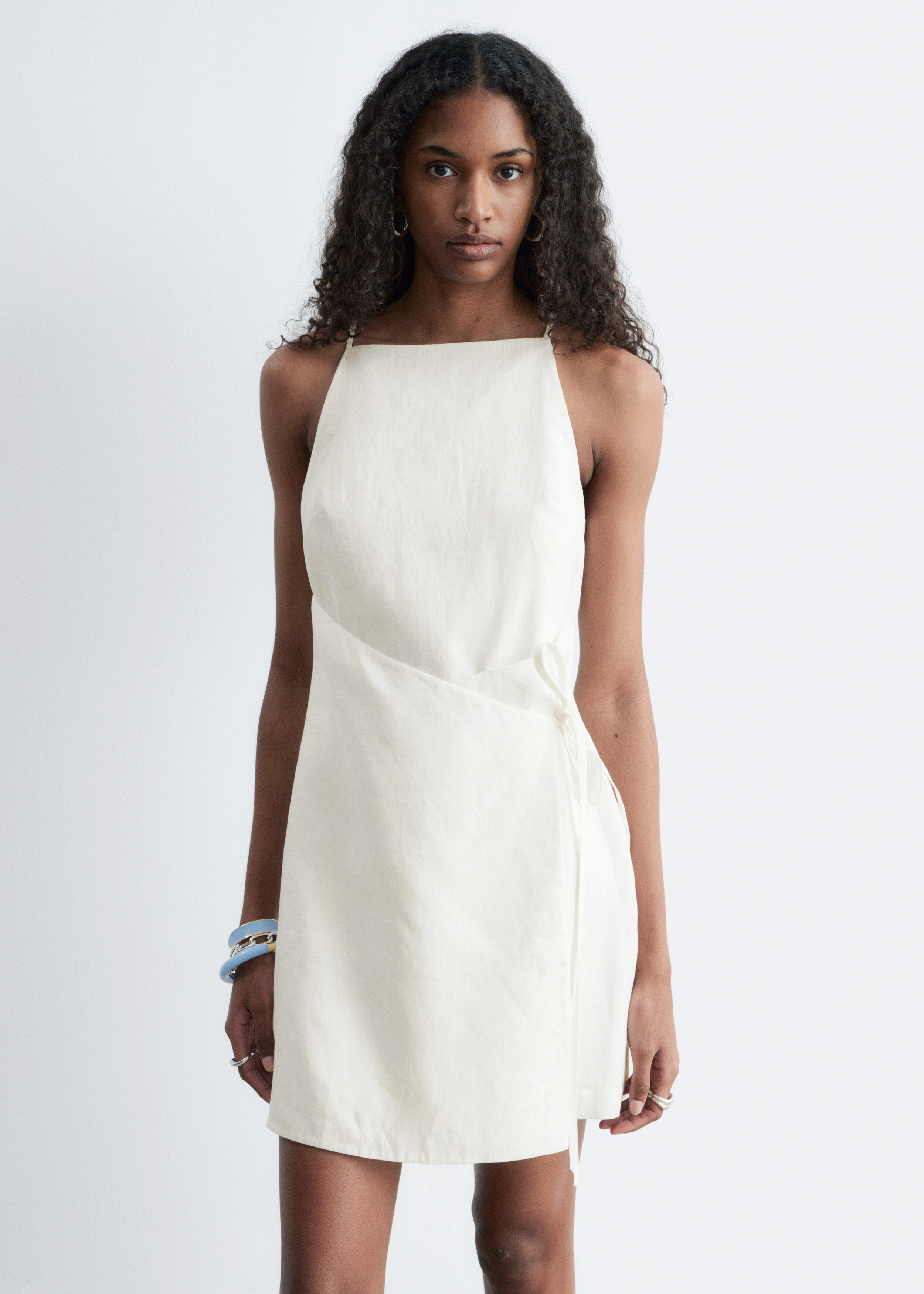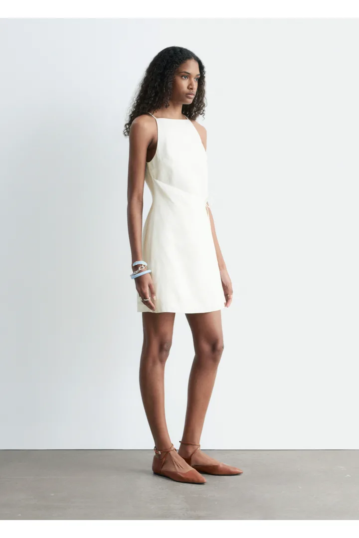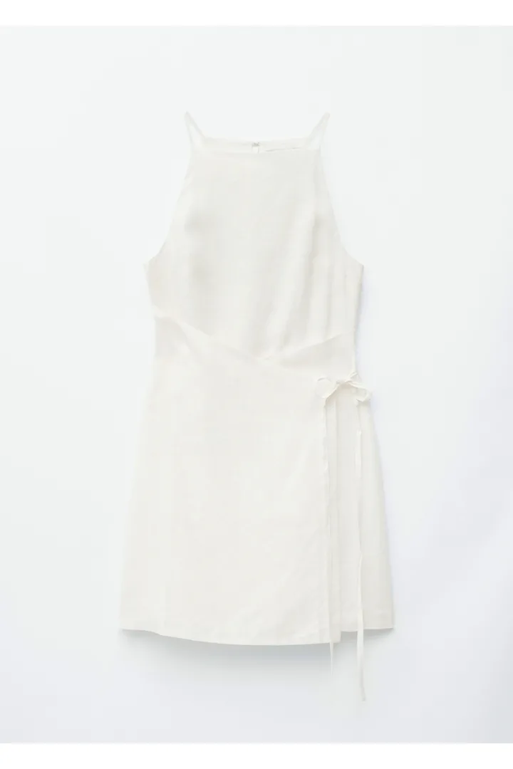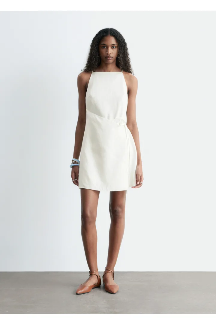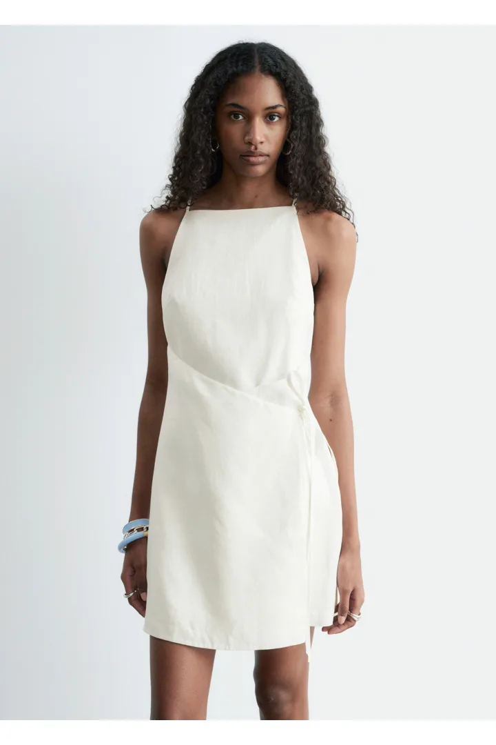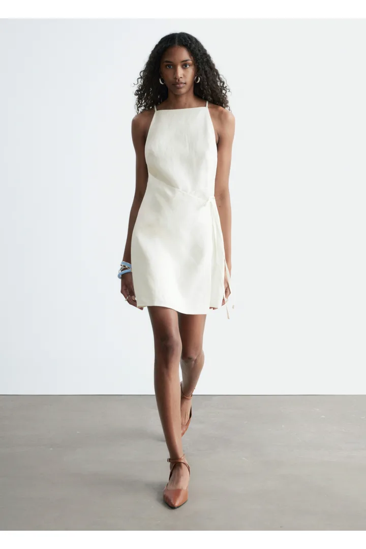 무더운 여름날을 위해 탄생한 미니 드레스예요. 가볍고 통기성 좋은 리넨 소재, 핏 되는 실루엣, 하이 넥, 얇은 숄더 스트랩, 허리에서 슬림한 타이 밴드로 여미는 랩오버 디자인이 특징이에요. 스트랩 샌들, 그리고 스트로 비치 백과 연출하면 더없이 멋스럽답니다.
