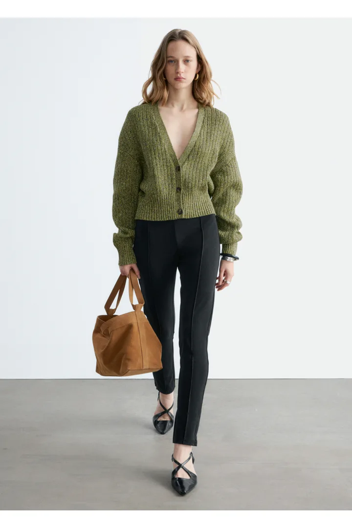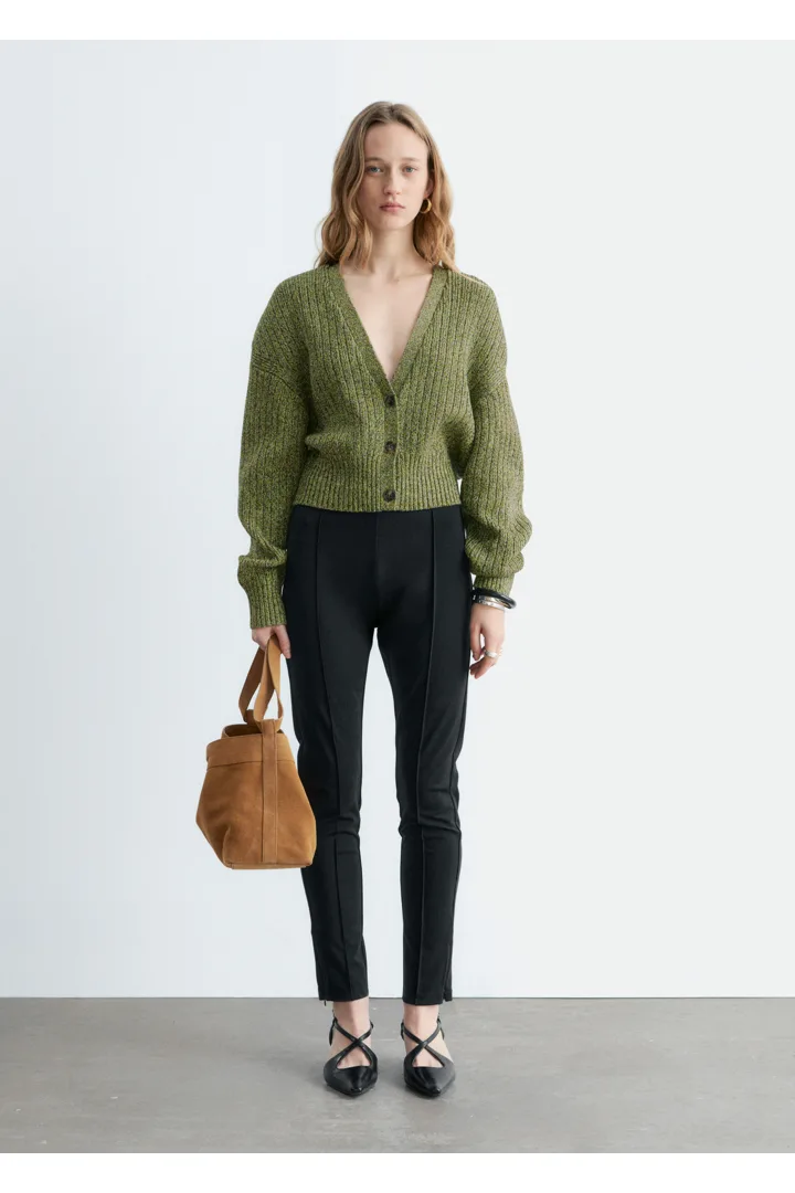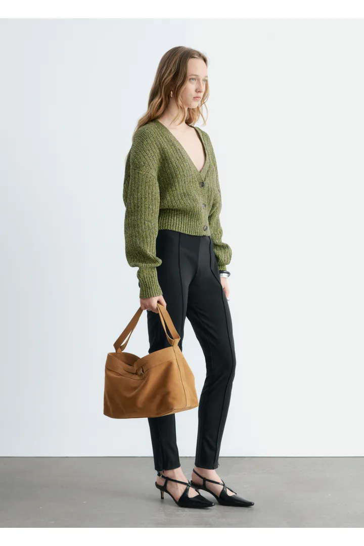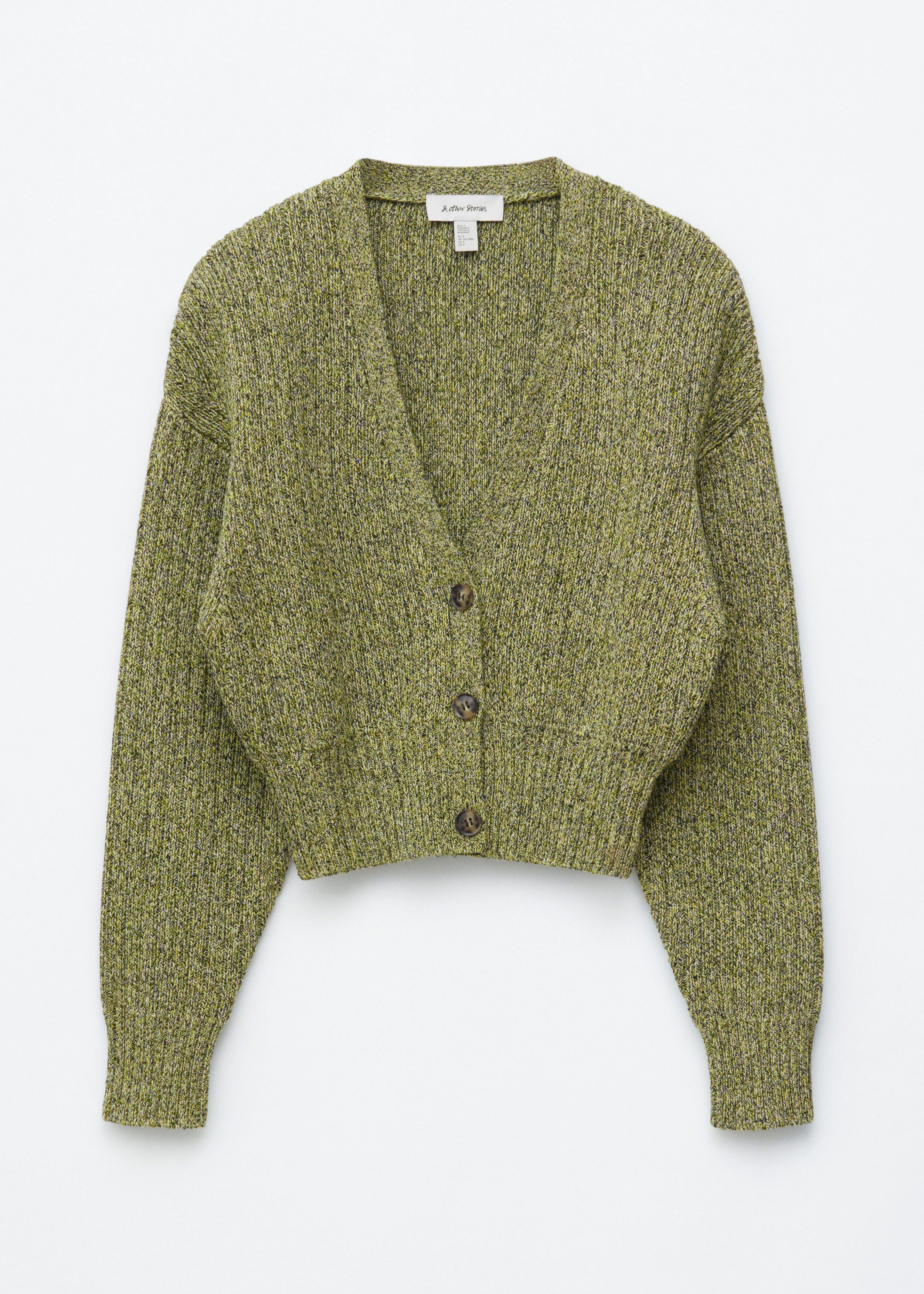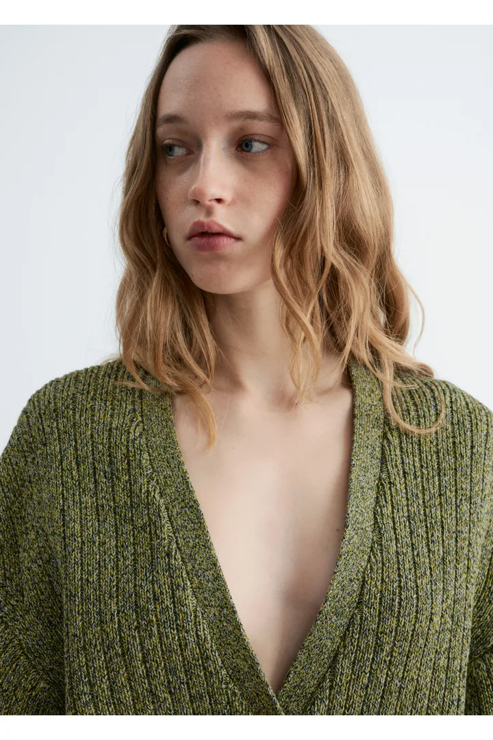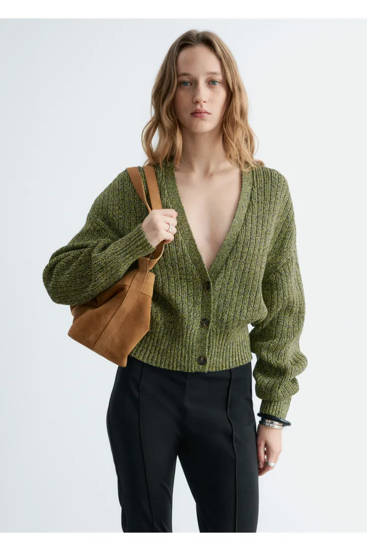 100% 코튼 소재의 립 니트 가디건이에요. 여유로운 크롭 실루엣과 강조된 허리라인이 특징이랍니다. 드롭 숄더와 살짝 둥글린 V 넥으로 부드럽고 느긋한 무드의 쉐입을 연출해 주어요. 티셔츠나 탱크 탑 위에 레이어링해 보세요.