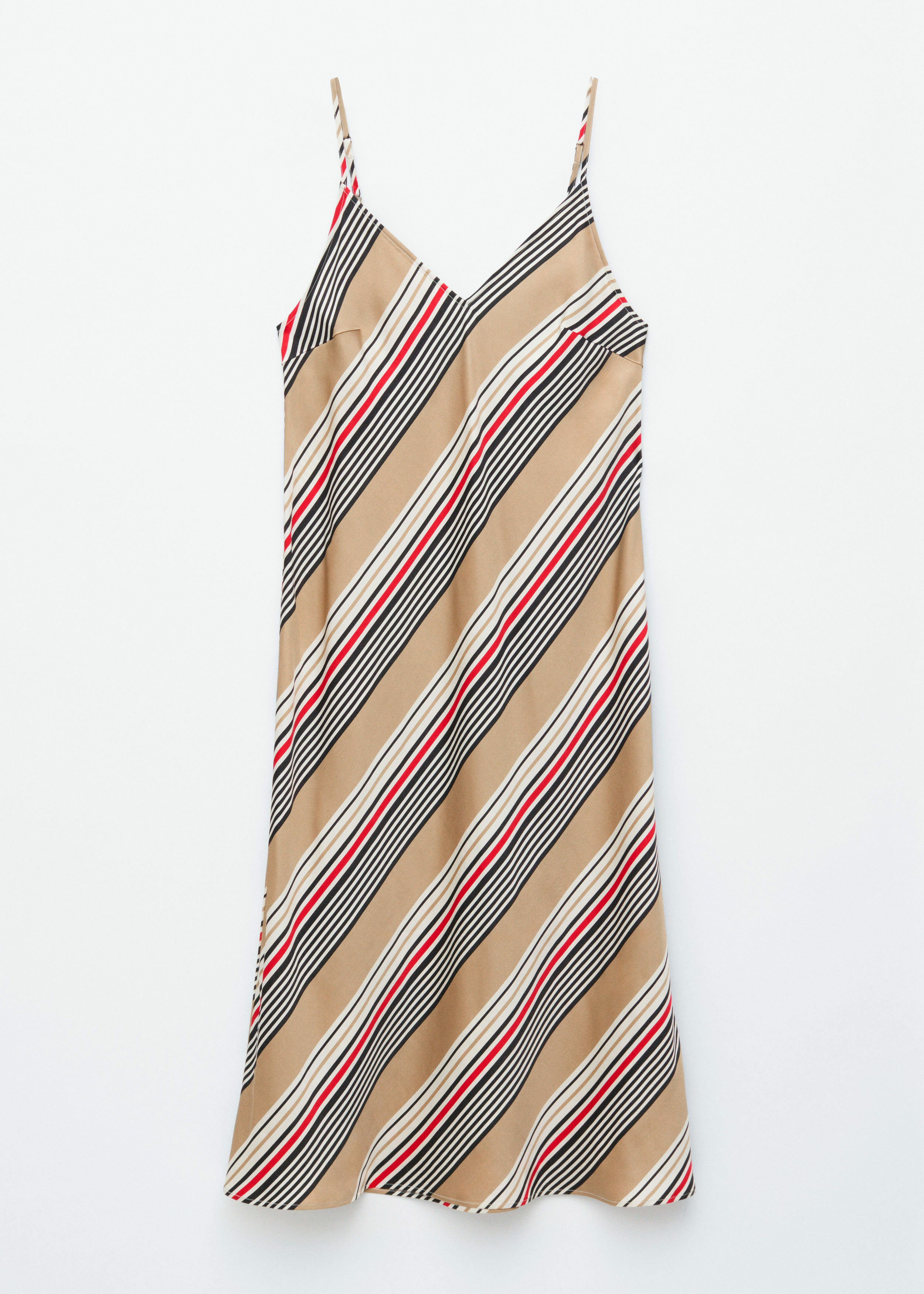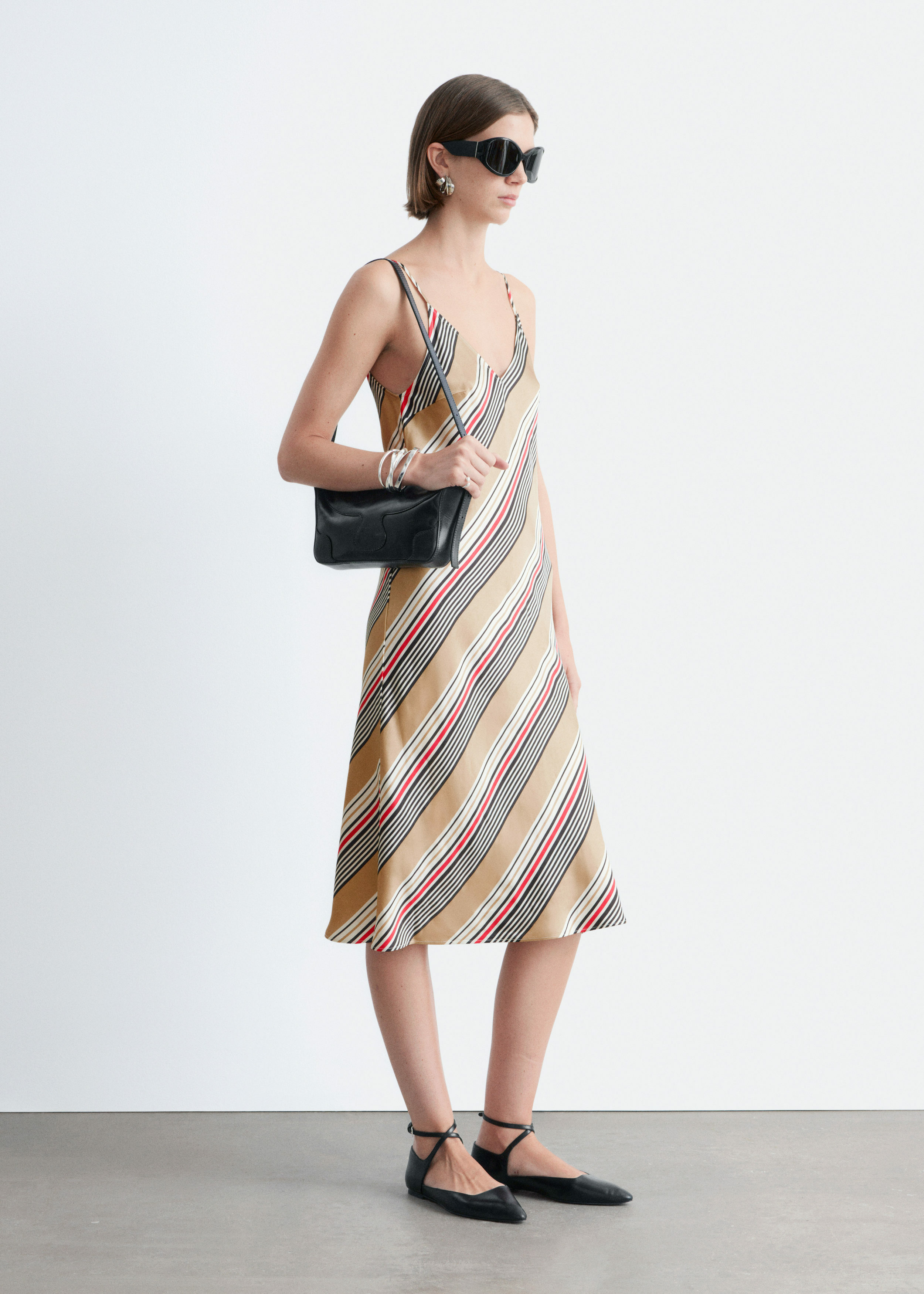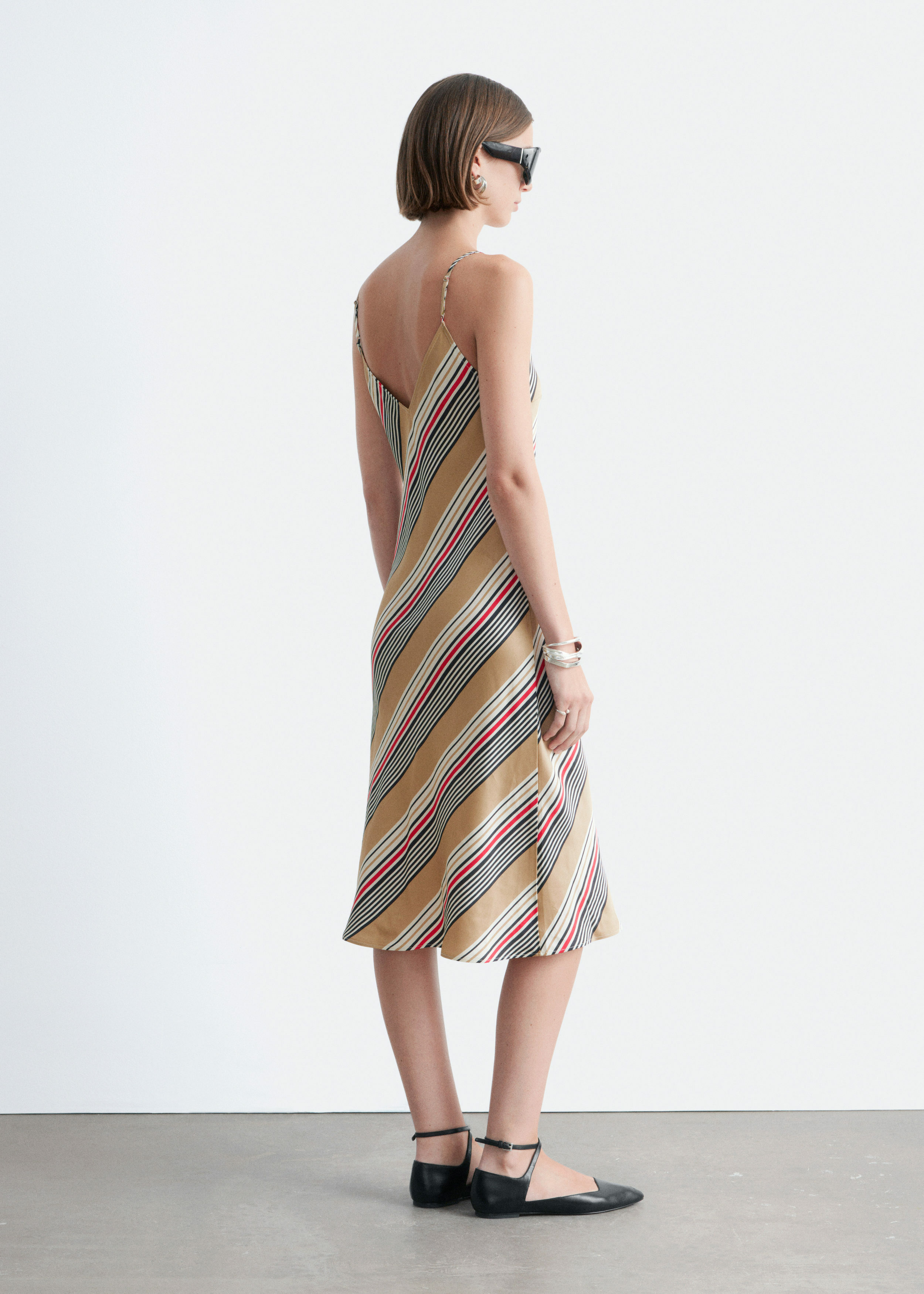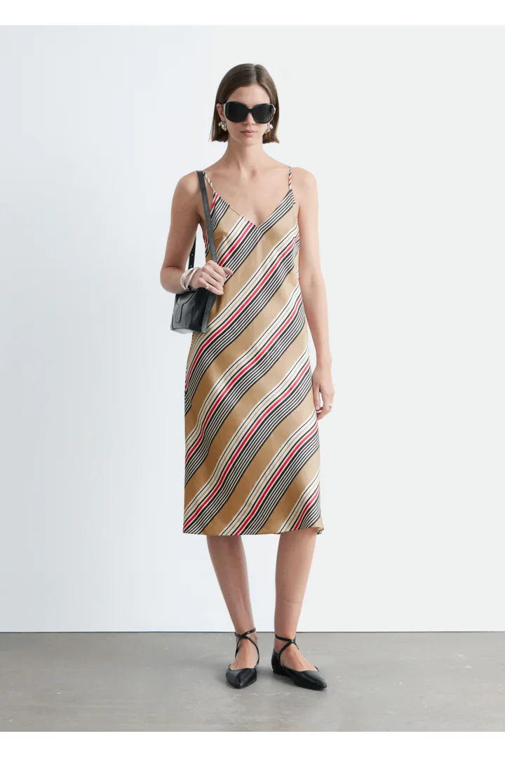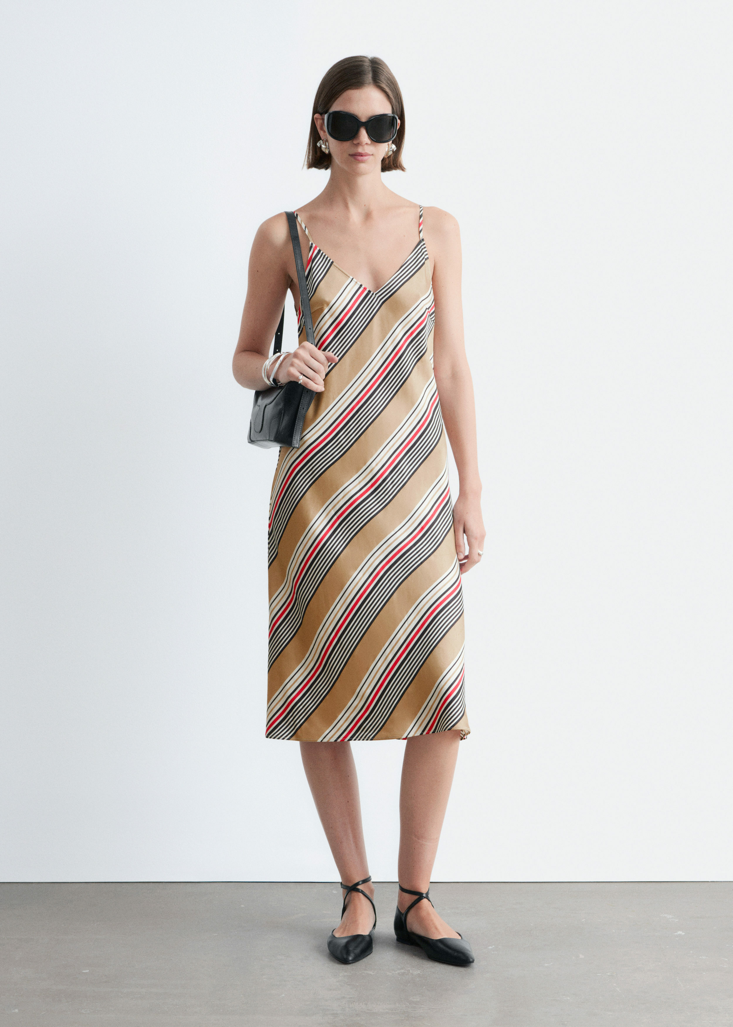 100% 새틴 소재의 슬립 드레스예요. 유려한 무드의 스트레이트 실루엣과 대담한 그래픽 스트라이프가 돋보이는 아이템이에요. V 네크라인과 슬림한 조절형 숄더 스트랩이 자리해 있으며, 단독으로 입거나 핏 되는 티셔츠 또는 셔츠 위에 레이어링하여 모던한 분위기를 연출해 보세요.