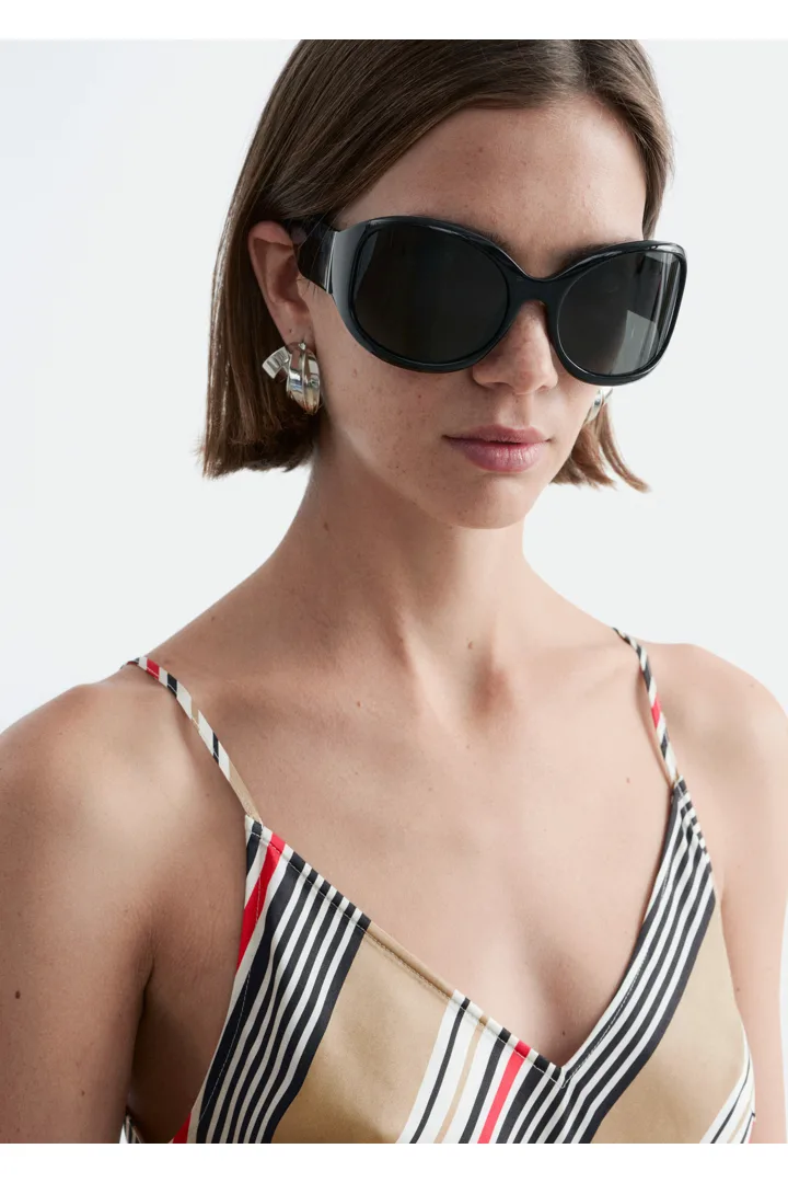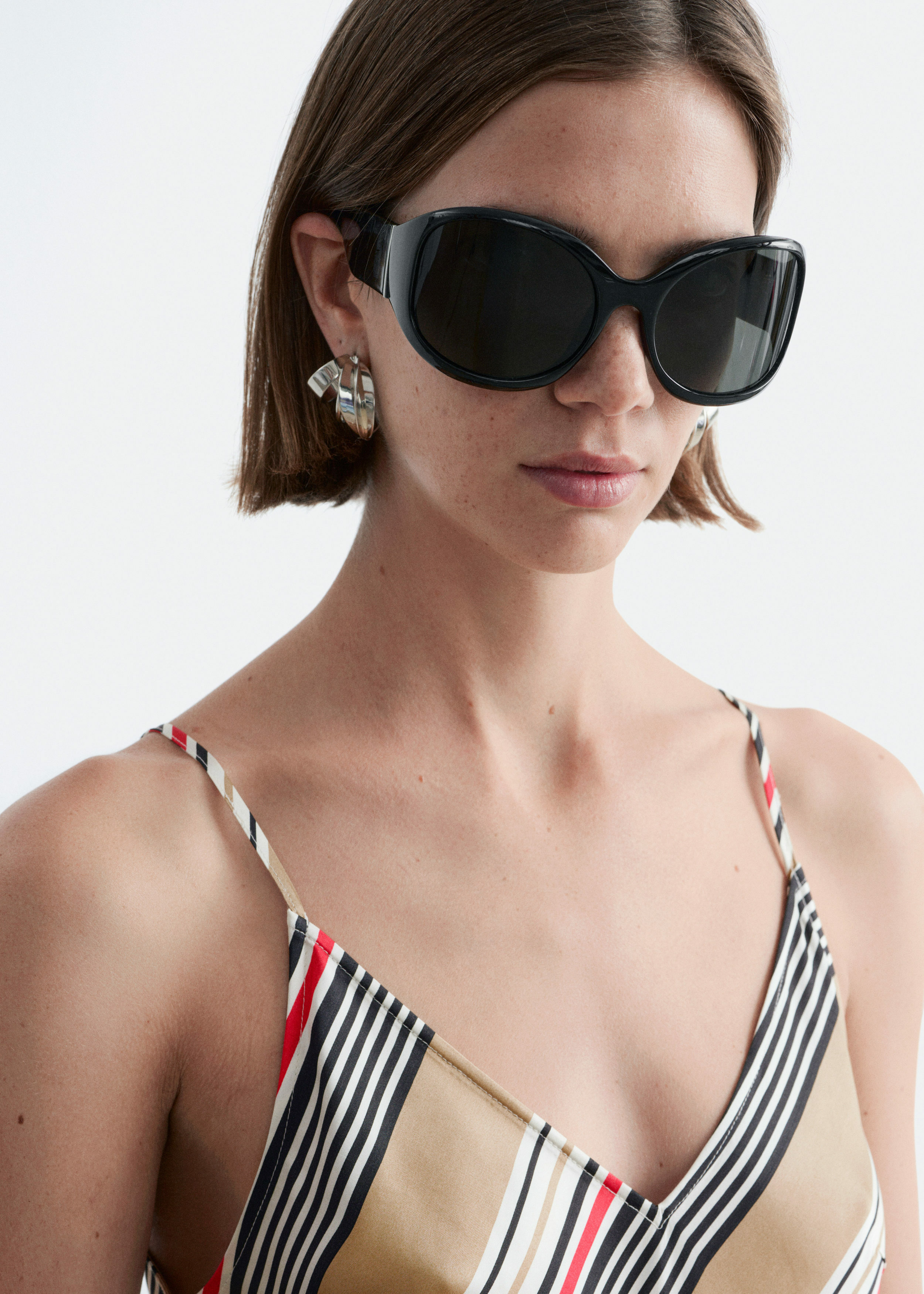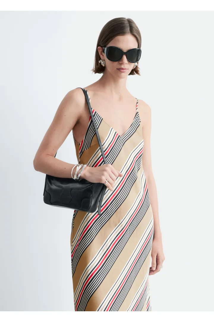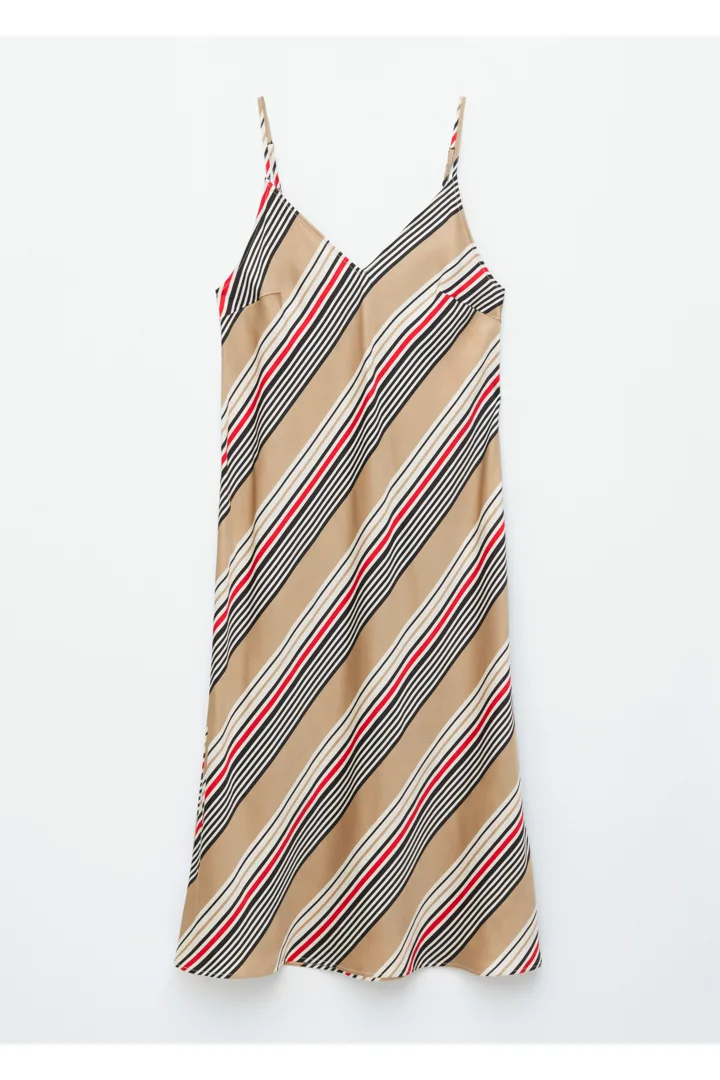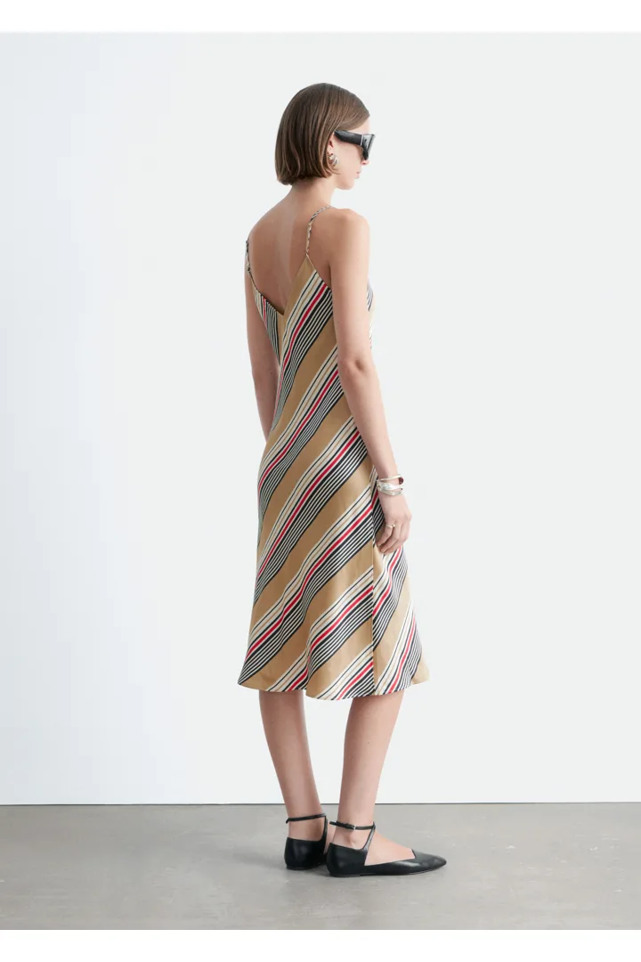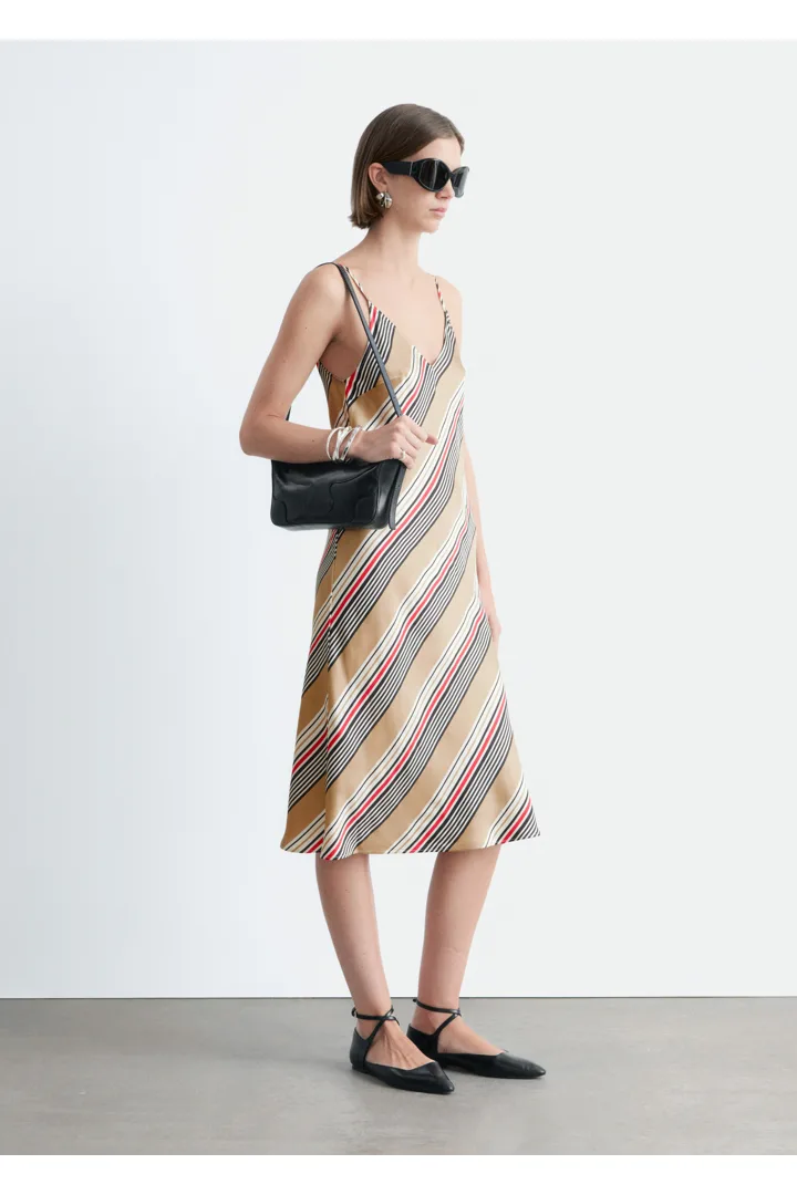 100% 새틴 소재의 슬립 드레스예요. 유려한 무드의 스트레이트 실루엣과 대담한 그래픽 스트라이프가 돋보이는 아이템이에요. V 네크라인과 슬림한 조절형 숄더 스트랩이 자리해 있으며, 단독으로 입거나 핏 되는 티셔츠 또는 셔츠 위에 레이어링하여 모던한 분위기를 연출해 보세요.