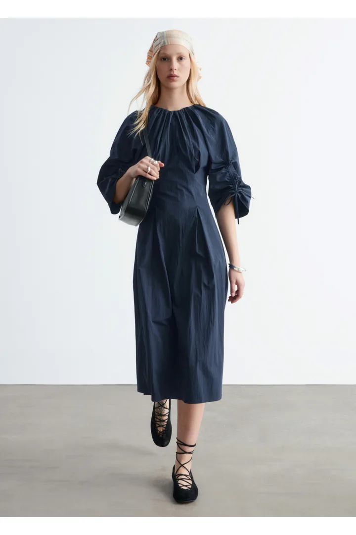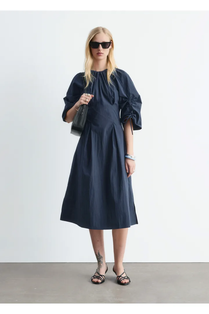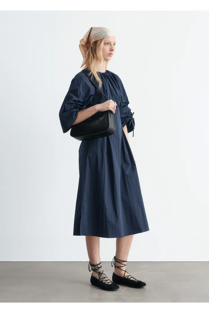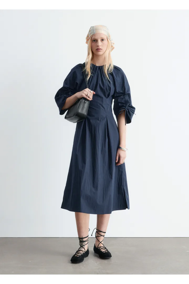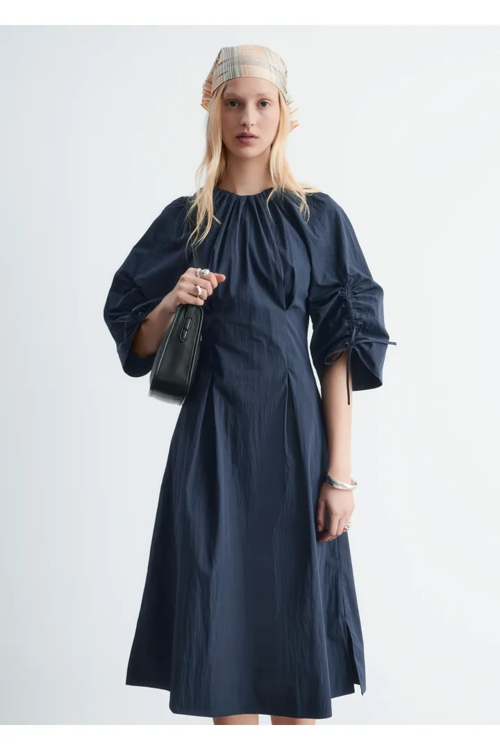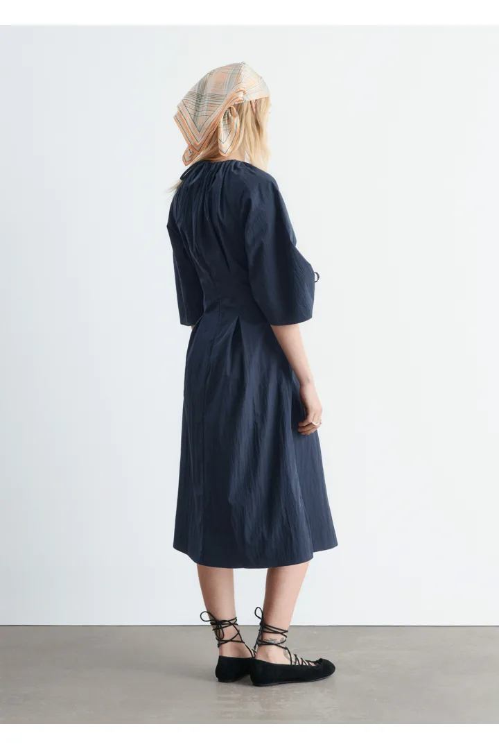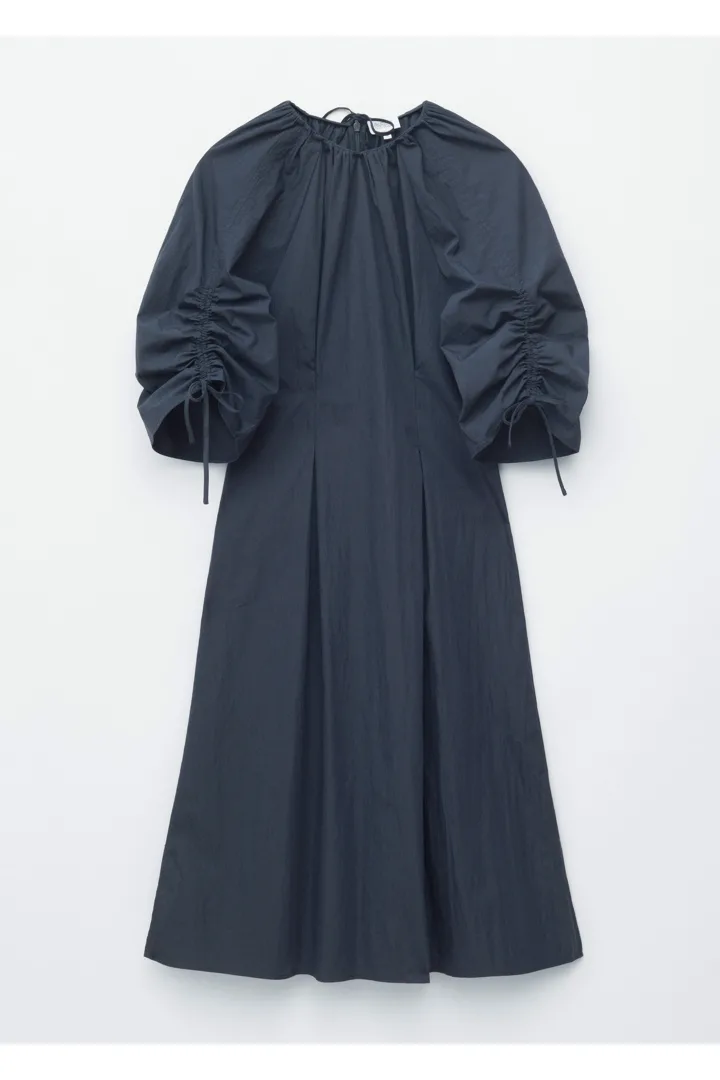구조적인 디테일과 깔끔한 라인이 돋보이는 미디 드레스예요. 코튼 혼방 소재로 탄생했으며, 볼륨감 있는 슬리브가 특징이랍니다. 허리의 접힌 주름이 은은한 입체감을 더하며, 네크라인과 슬리브의 드로스트링은 세심하고 실용적인 감각을 더해주어요. 밑단 측면의 트임과 뒷면의 지퍼가 자리해 있으며, 네크라인의 섬세한 타이 여밈이 조형적인 실루엣을 완성한답니다.