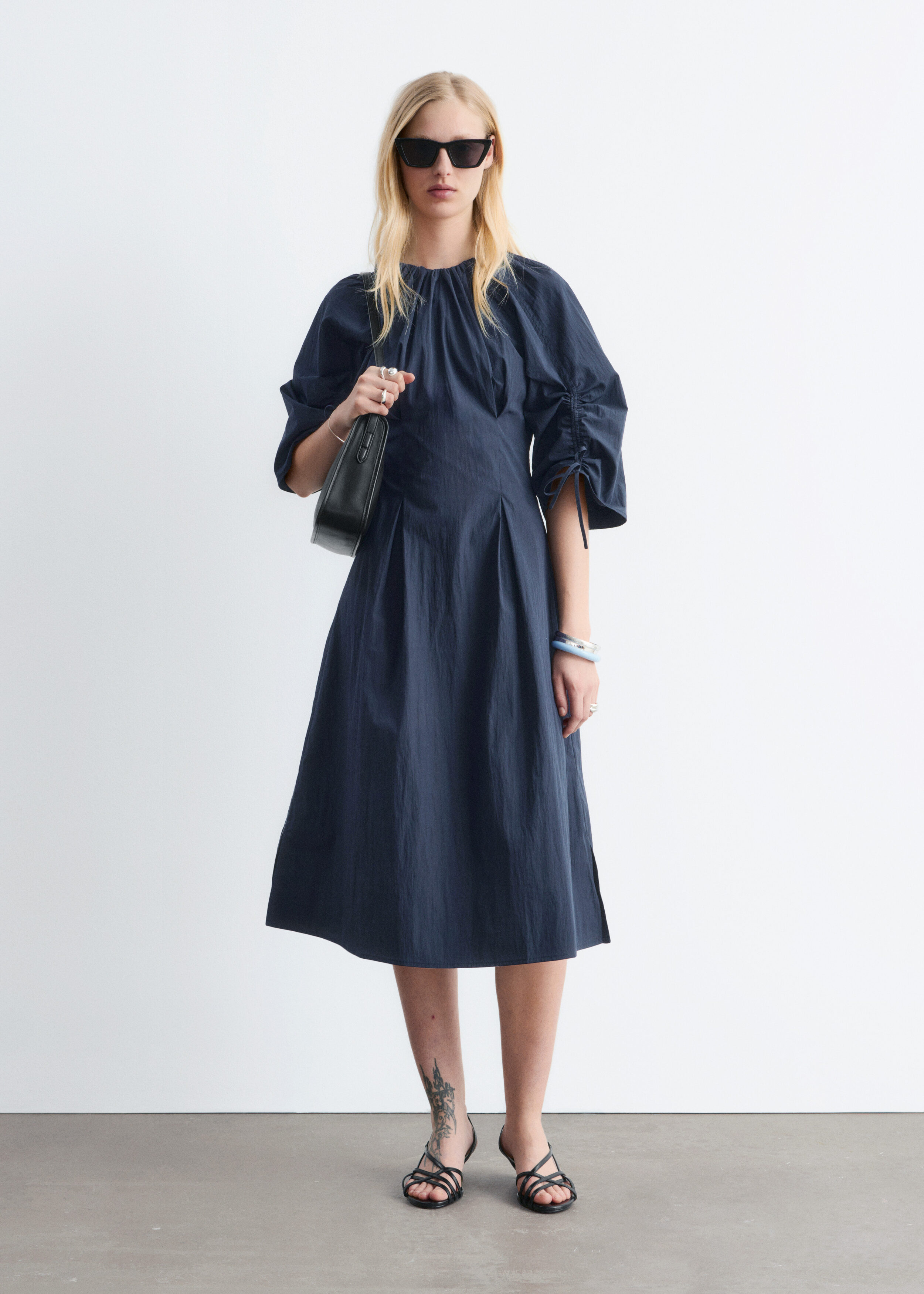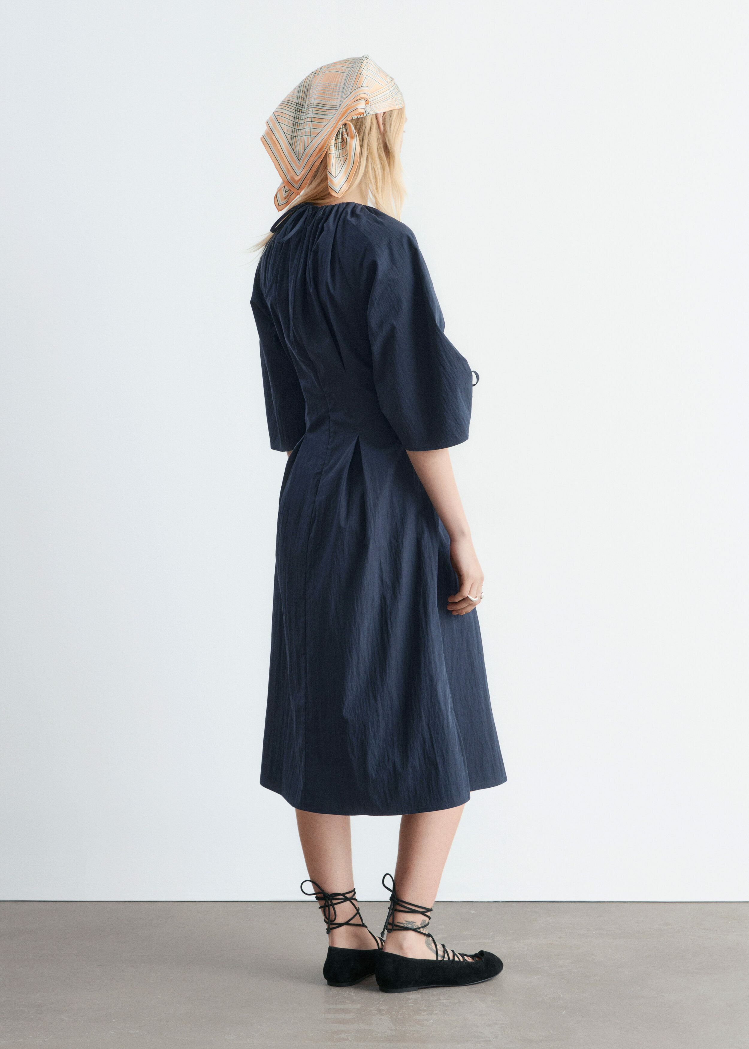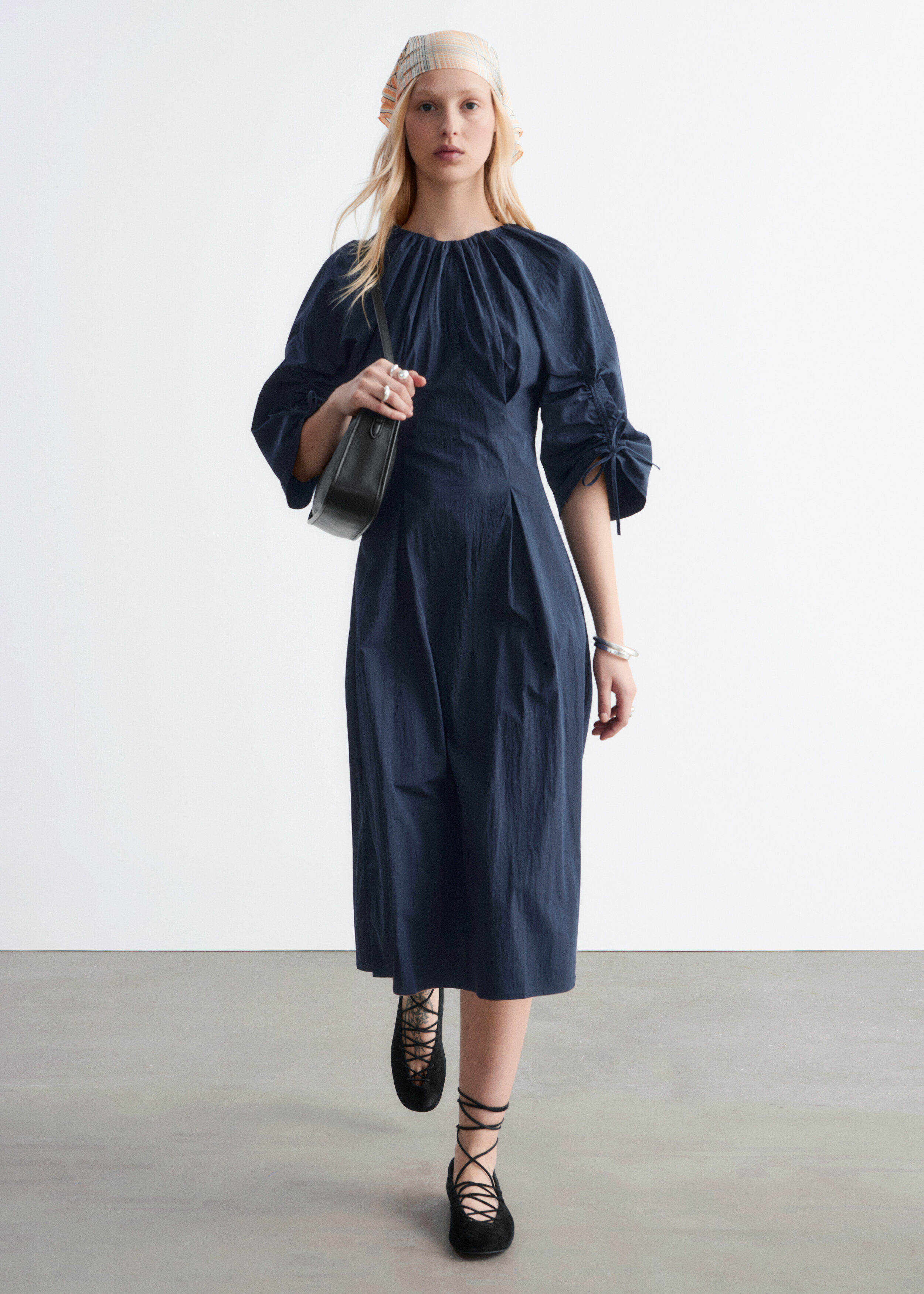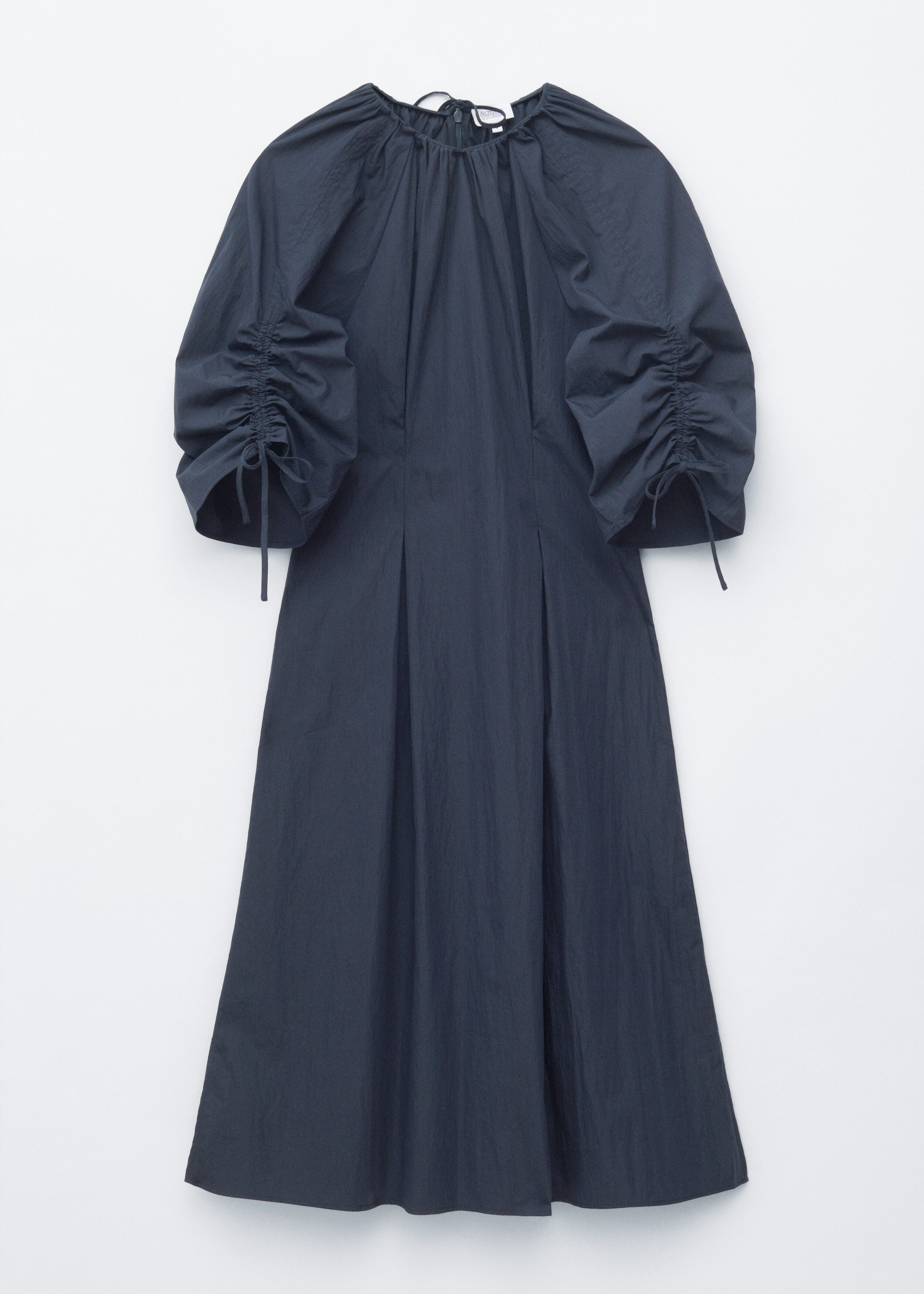 구조적인 디테일과 깔끔한 라인이 돋보이는 미디 드레스예요. 코튼 혼방 소재로 탄생했으며, 볼륨감 있는 슬리브가 특징이랍니다. 허리의 접힌 주름이 은은한 입체감을 더하며, 네크라인과 슬리브의 드로스트링은 세심하고 실용적인 감각을 더해주어요. 밑단 측면의 트임과 뒷면의 지퍼가 자리해 있으며, 네크라인의 섬세한 타이 여밈이 조형적인 실루엣을 완성한답니다.
