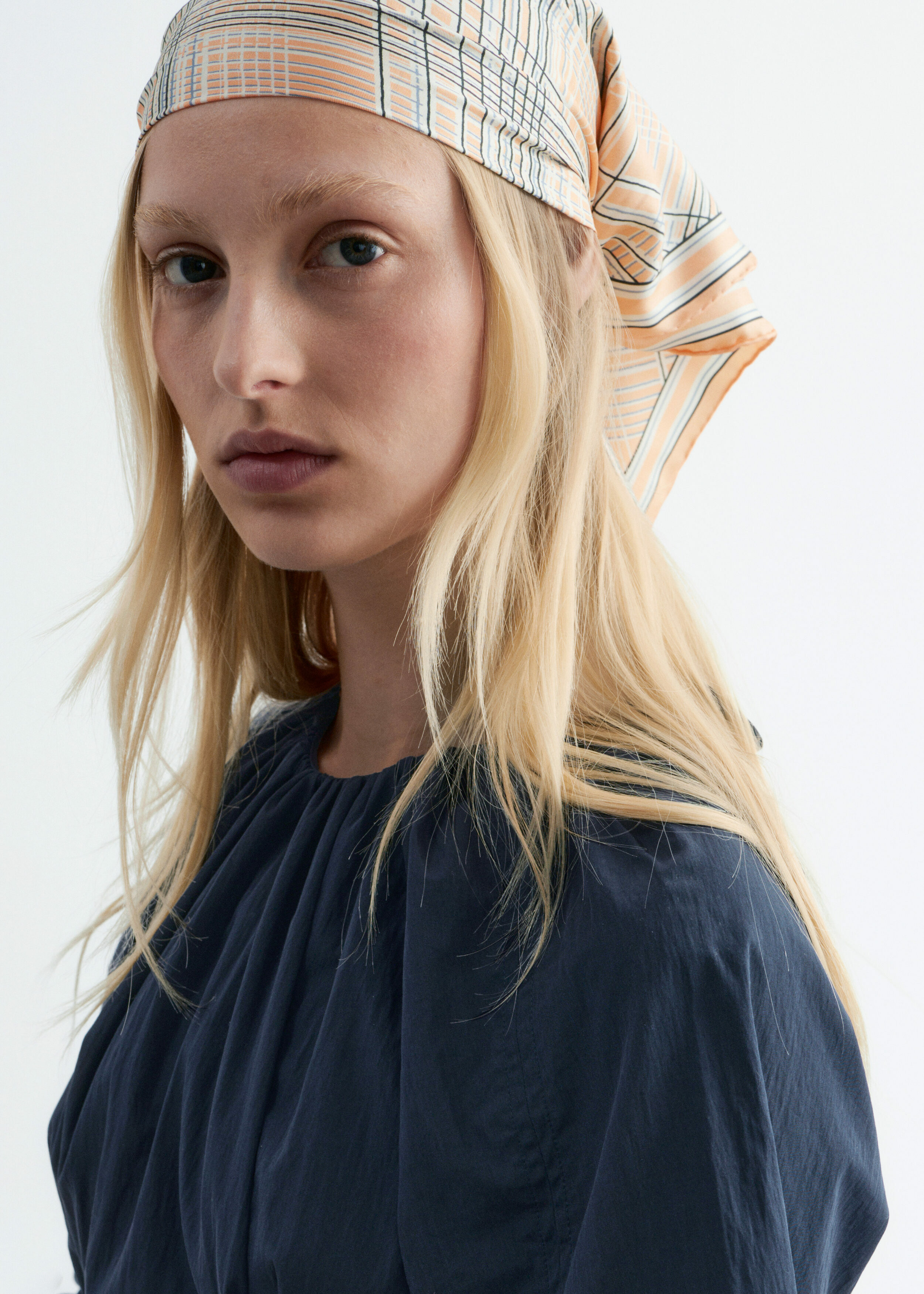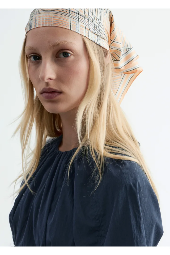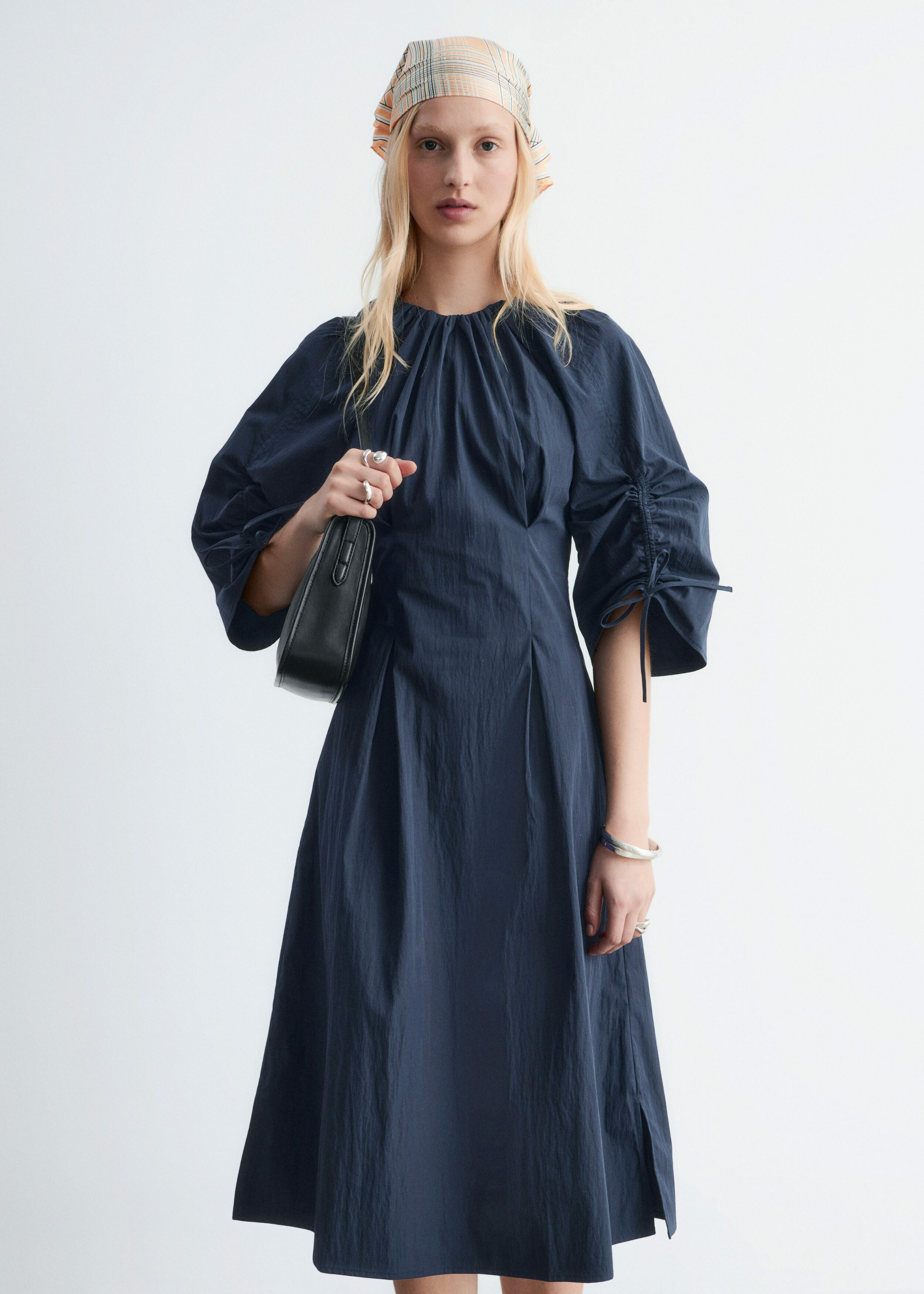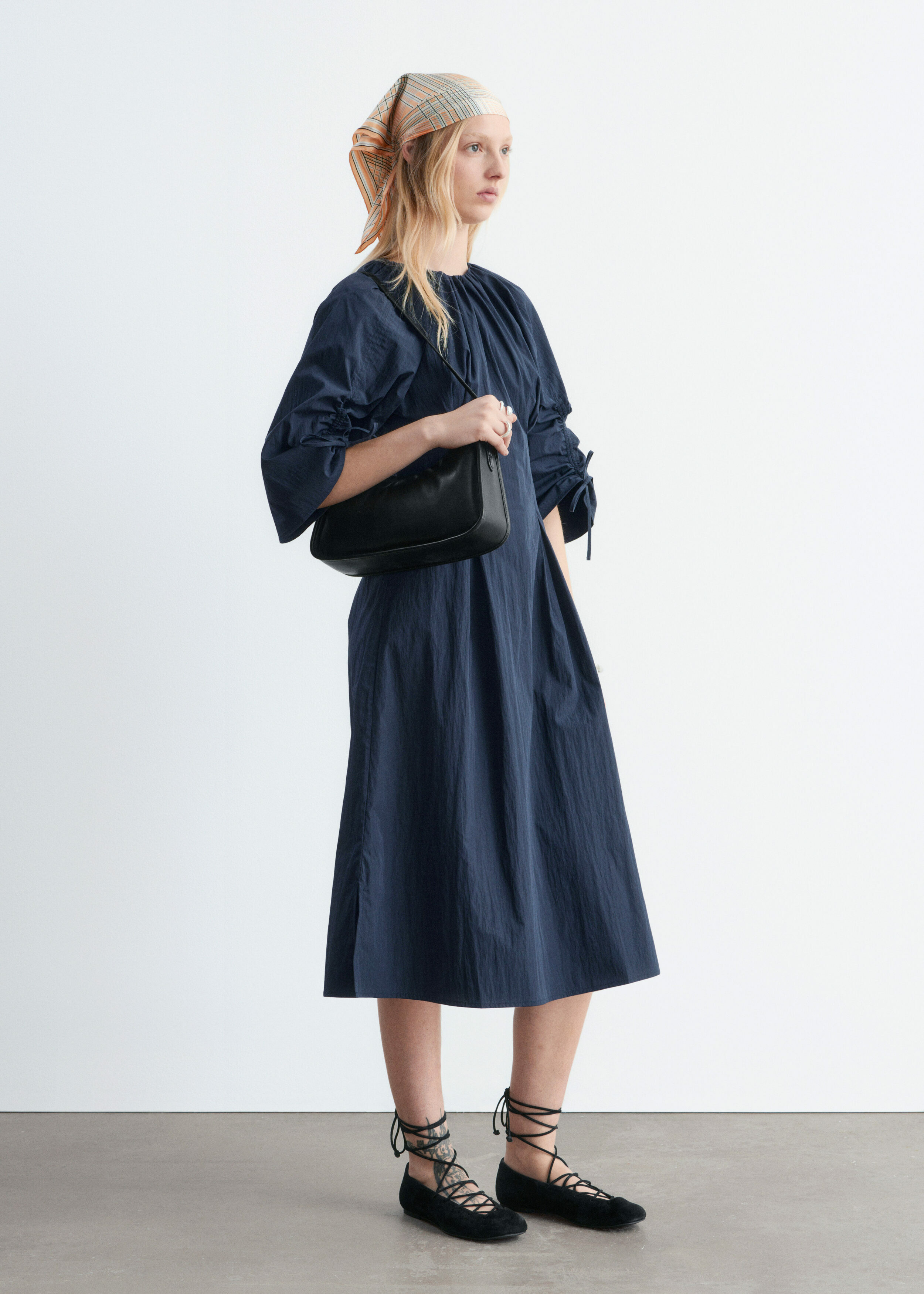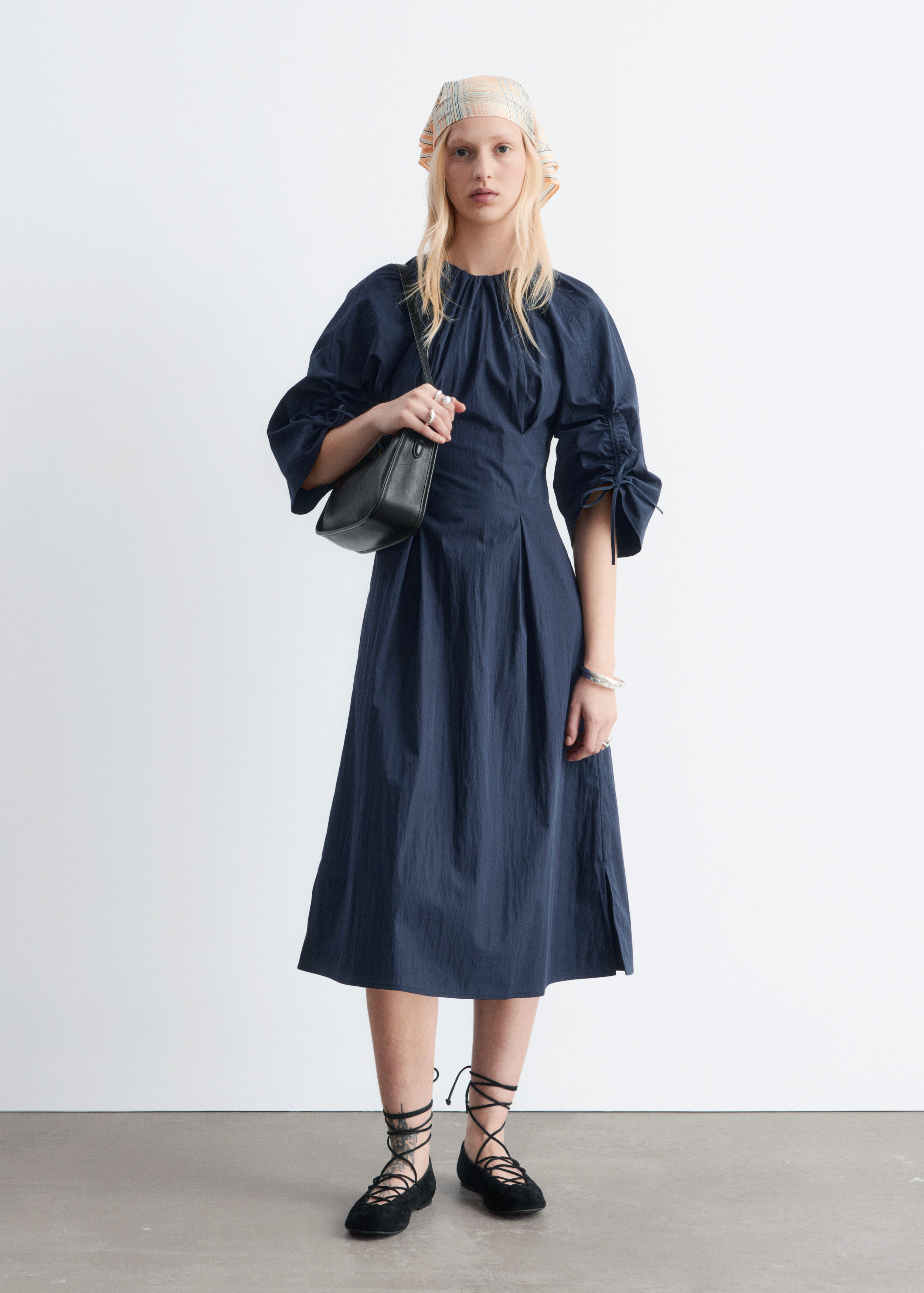 구조적인 디테일과 깔끔한 라인이 돋보이는 미디 드레스예요. 코튼 혼방 소재로 탄생했으며, 볼륨감 있는 슬리브가 특징이랍니다. 허리의 접힌 주름이 은은한 입체감을 더하며, 네크라인과 슬리브의 드로스트링은 세심하고 실용적인 감각을 더해주어요. 밑단 측면의 트임과 뒷면의 지퍼가 자리해 있으며, 네크라인의 섬세한 타이 여밈이 조형적인 실루엣을 완성한답니다.