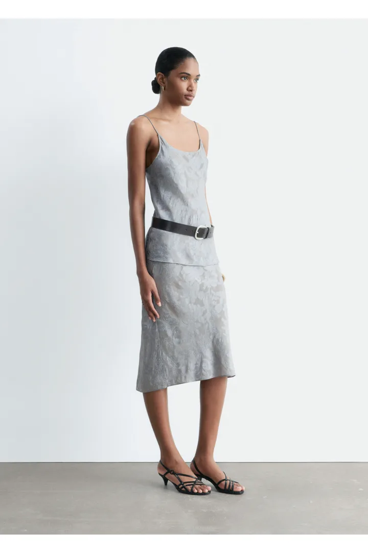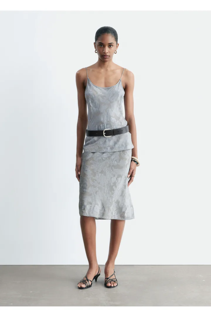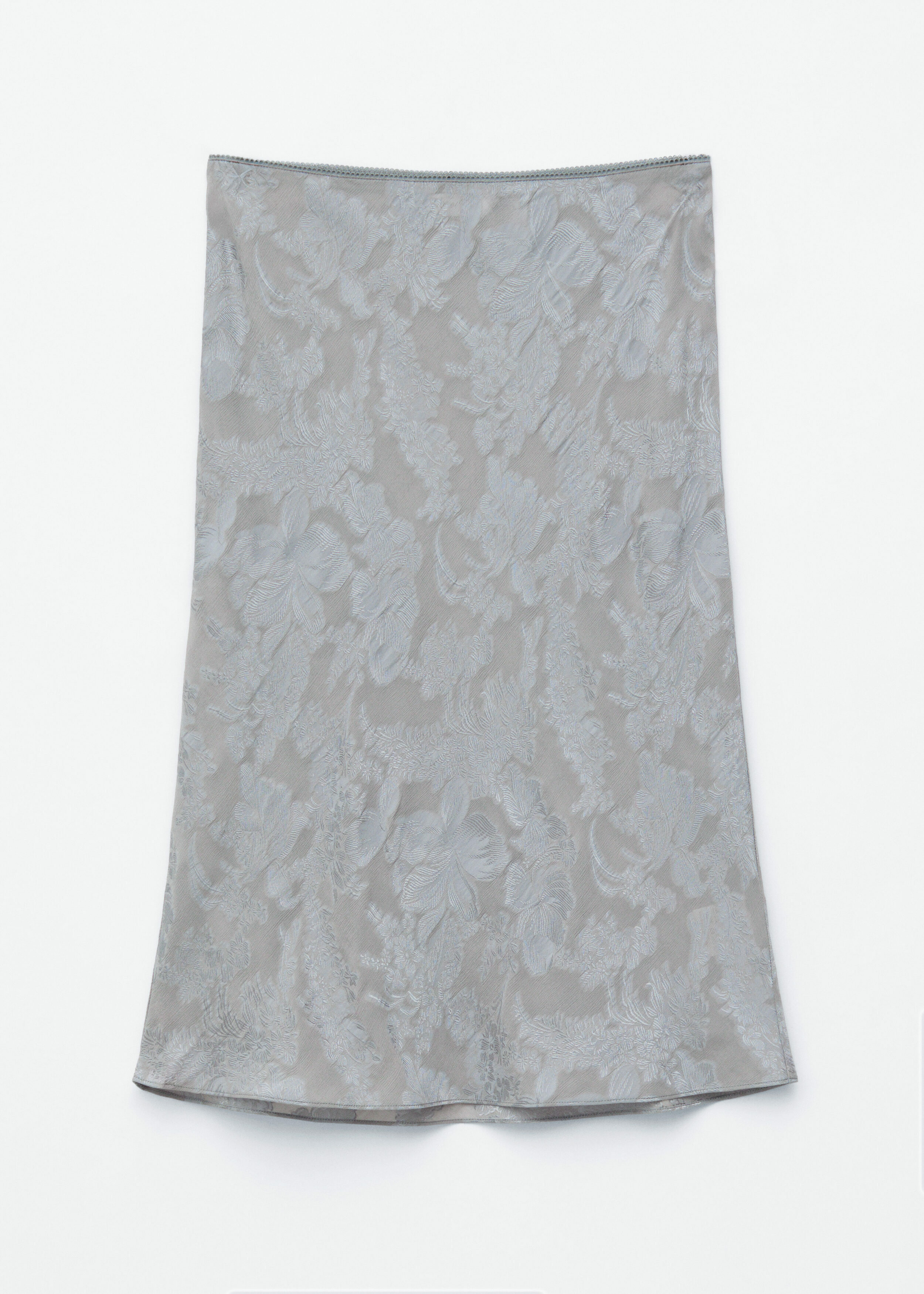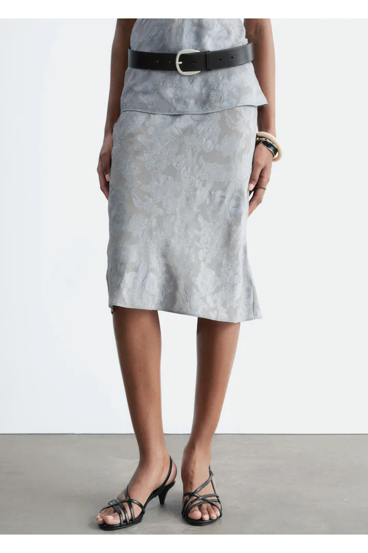 감각적인 텍스처의 비스코스 & 실크 혼방 소재로 탄생한 미디 스커트예요. 플로럴 패턴, 깔끔하고 유려한 드레이프, 얇은 엘라스틱 허리라인, 그리고 밑단의 스캘럽 테두리와 핀 디테일이 특징이랍니다.