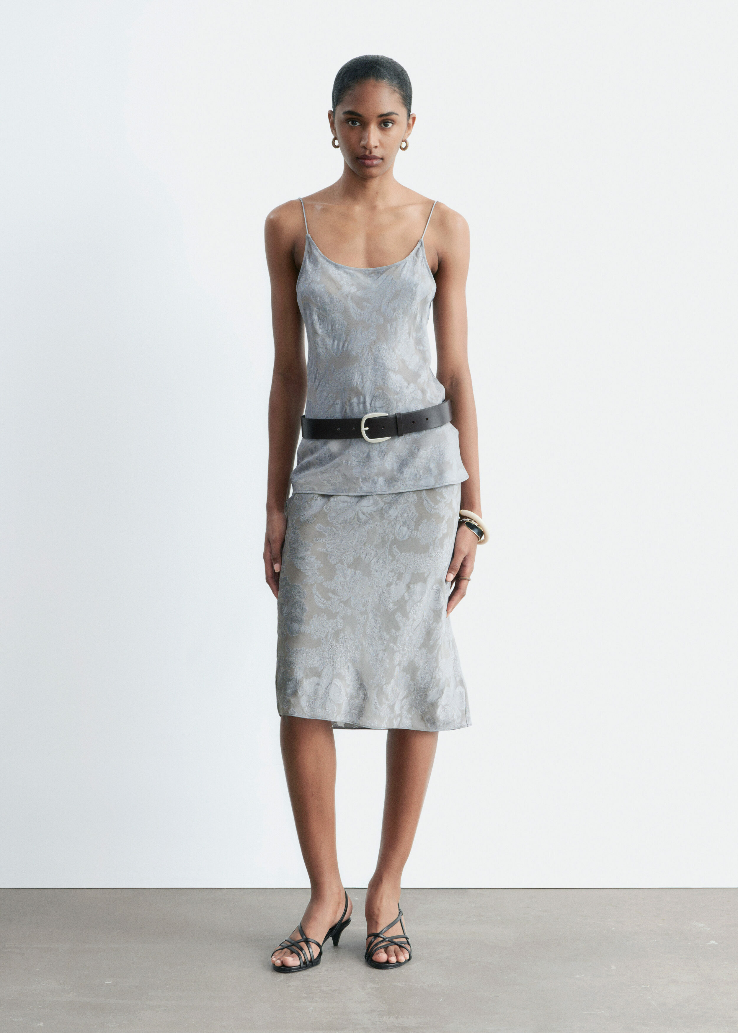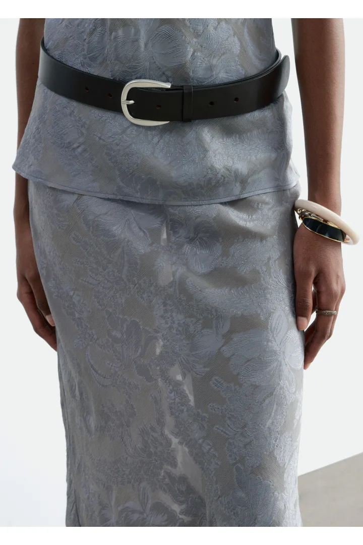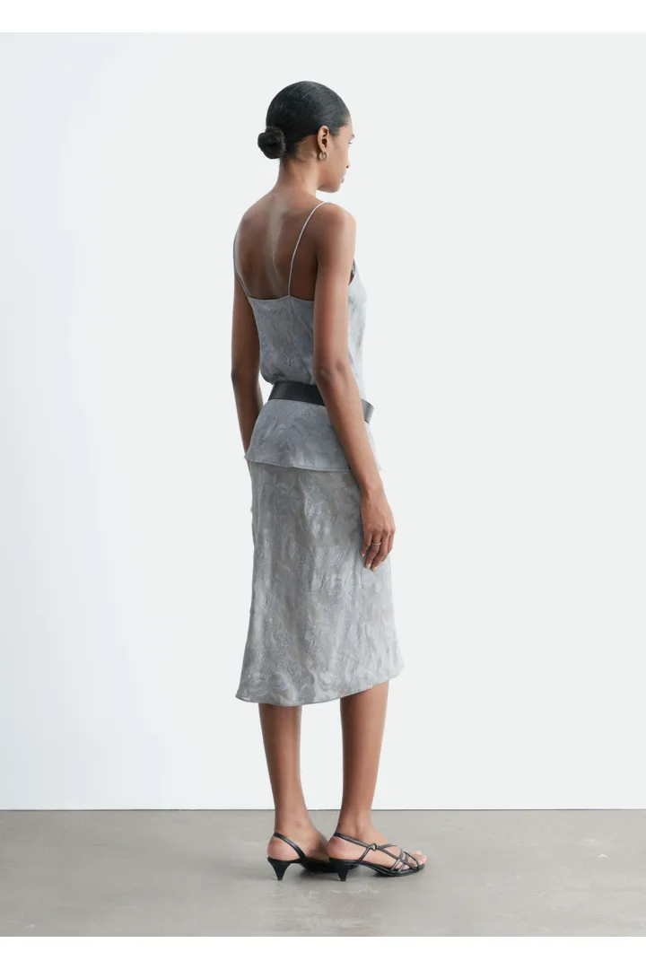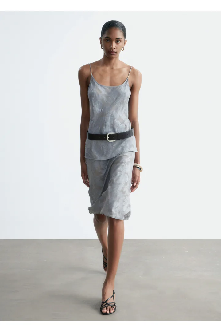 감각적인 텍스처의 비스코스 & 실크 혼방 소재로 탄생한 미디 스커트예요. 플로럴 패턴, 깔끔하고 유려한 드레이프, 얇은 엘라스틱 허리라인, 그리고 밑단의 스캘럽 테두리와 핀 디테일이 특징이랍니다.