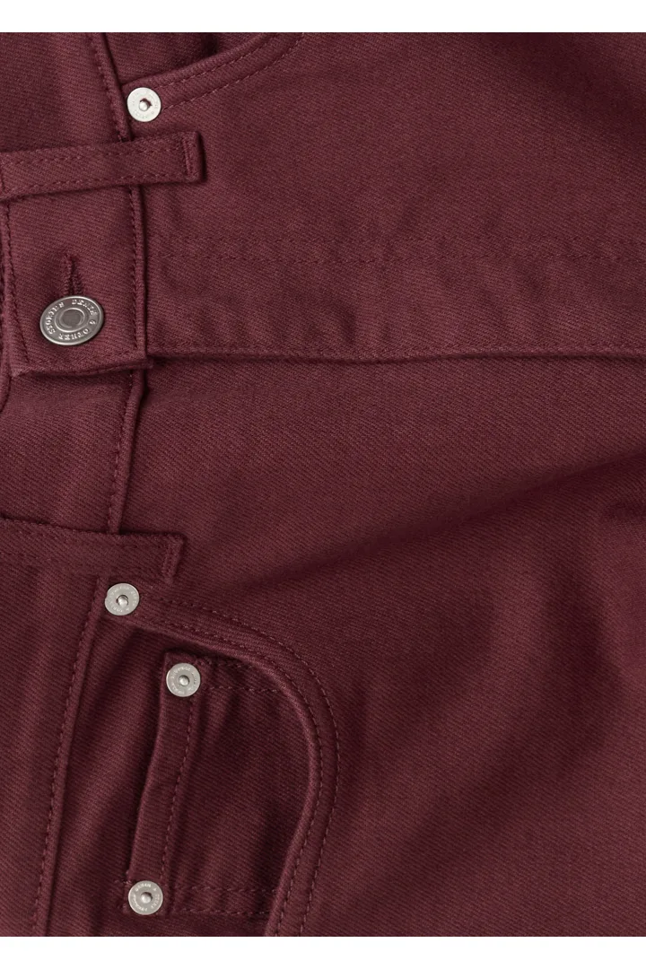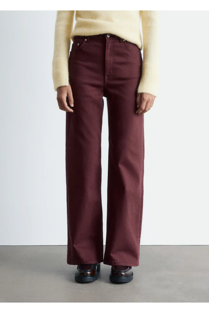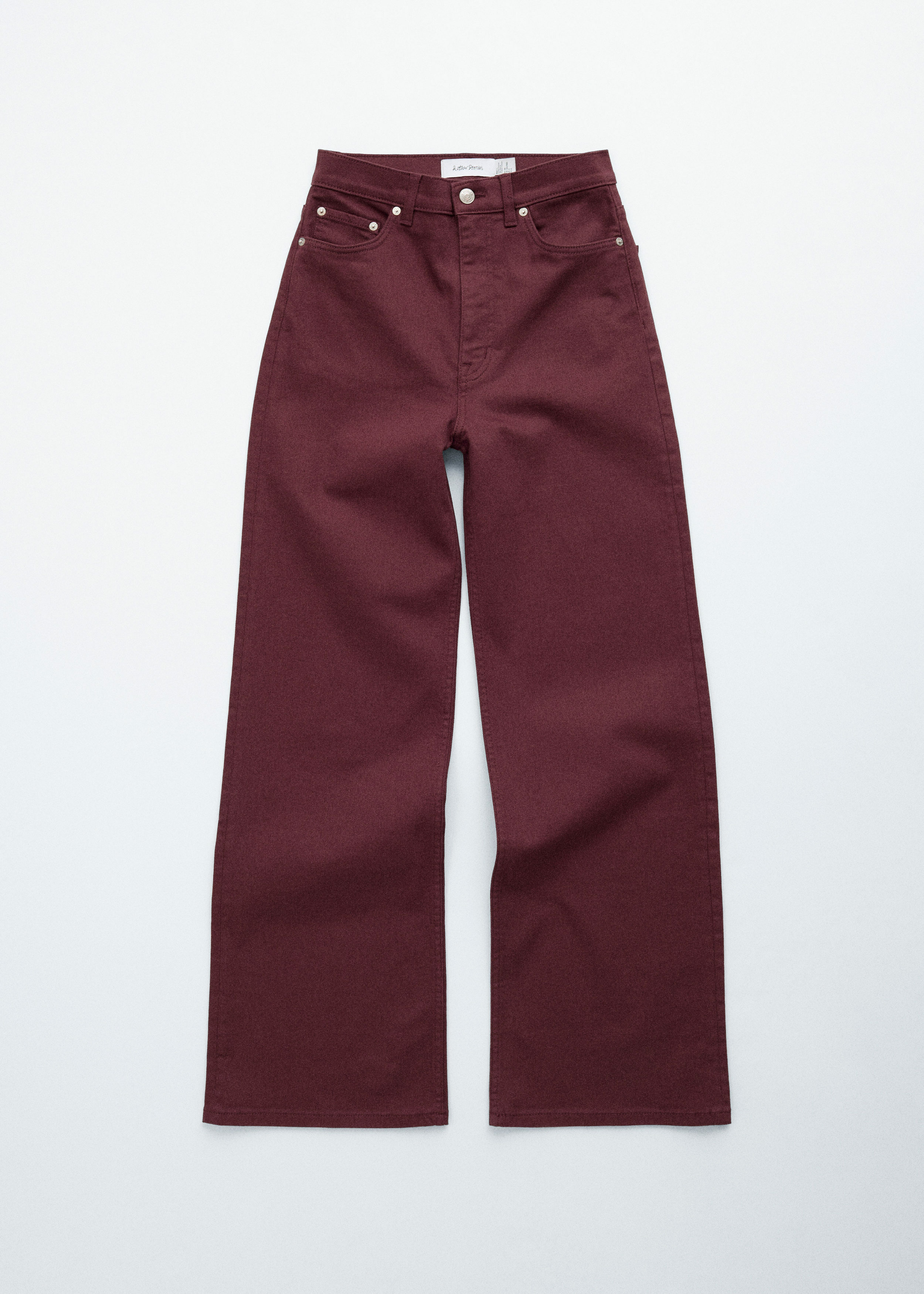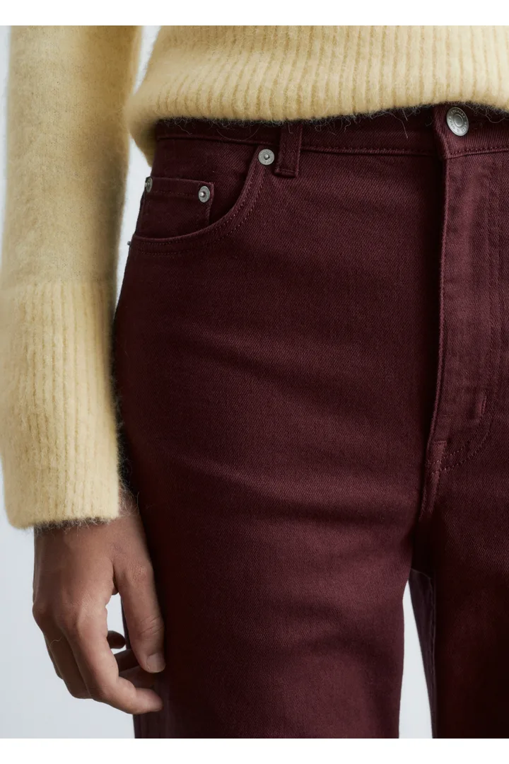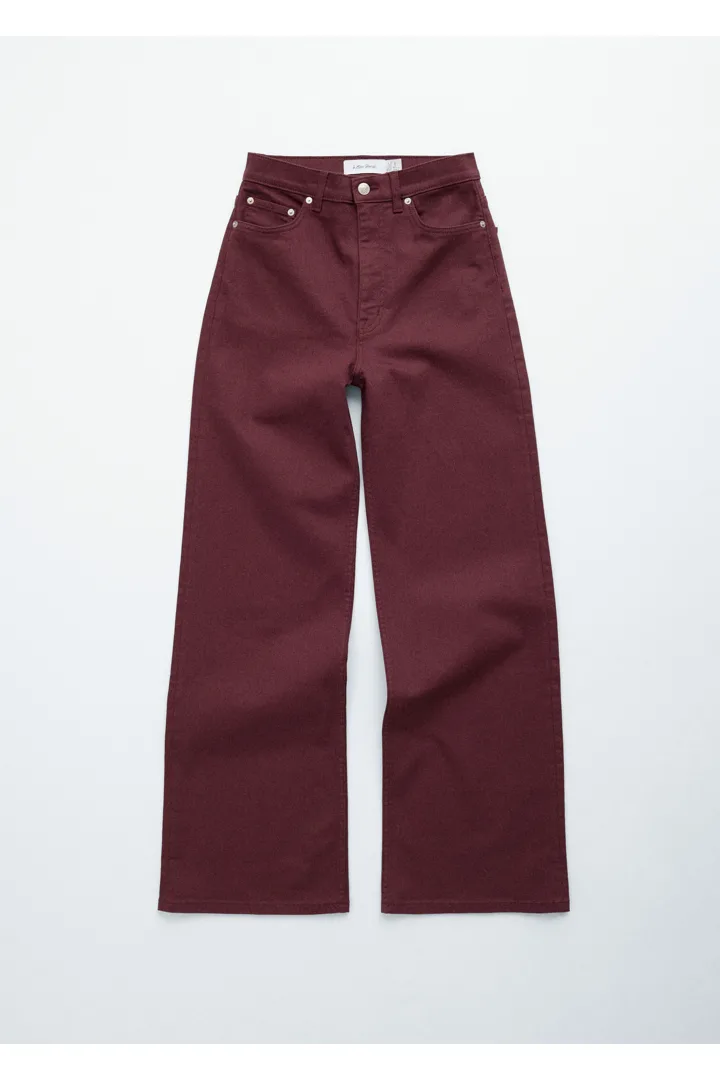 하이 웨이스트의 데님 진이에요. 너비감 있는 롱 레그와 클래식한 5 포켓 디자인이 특징이랍니다.