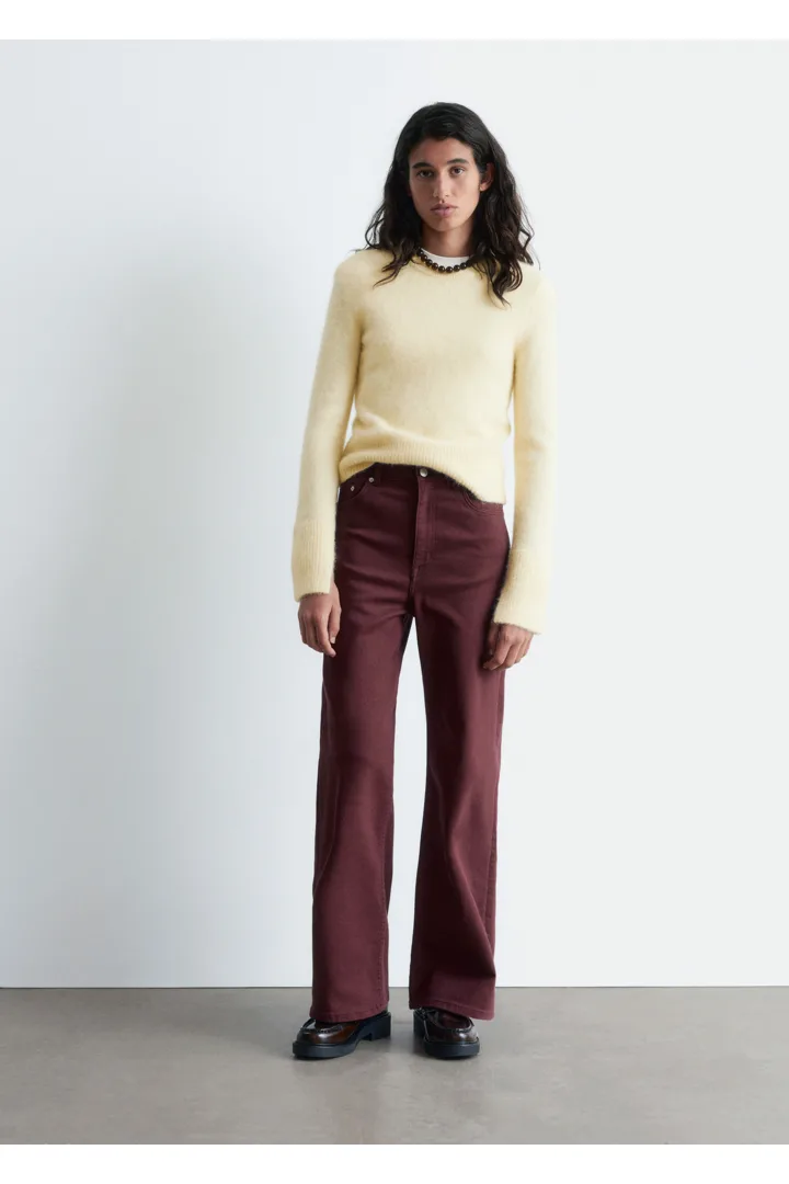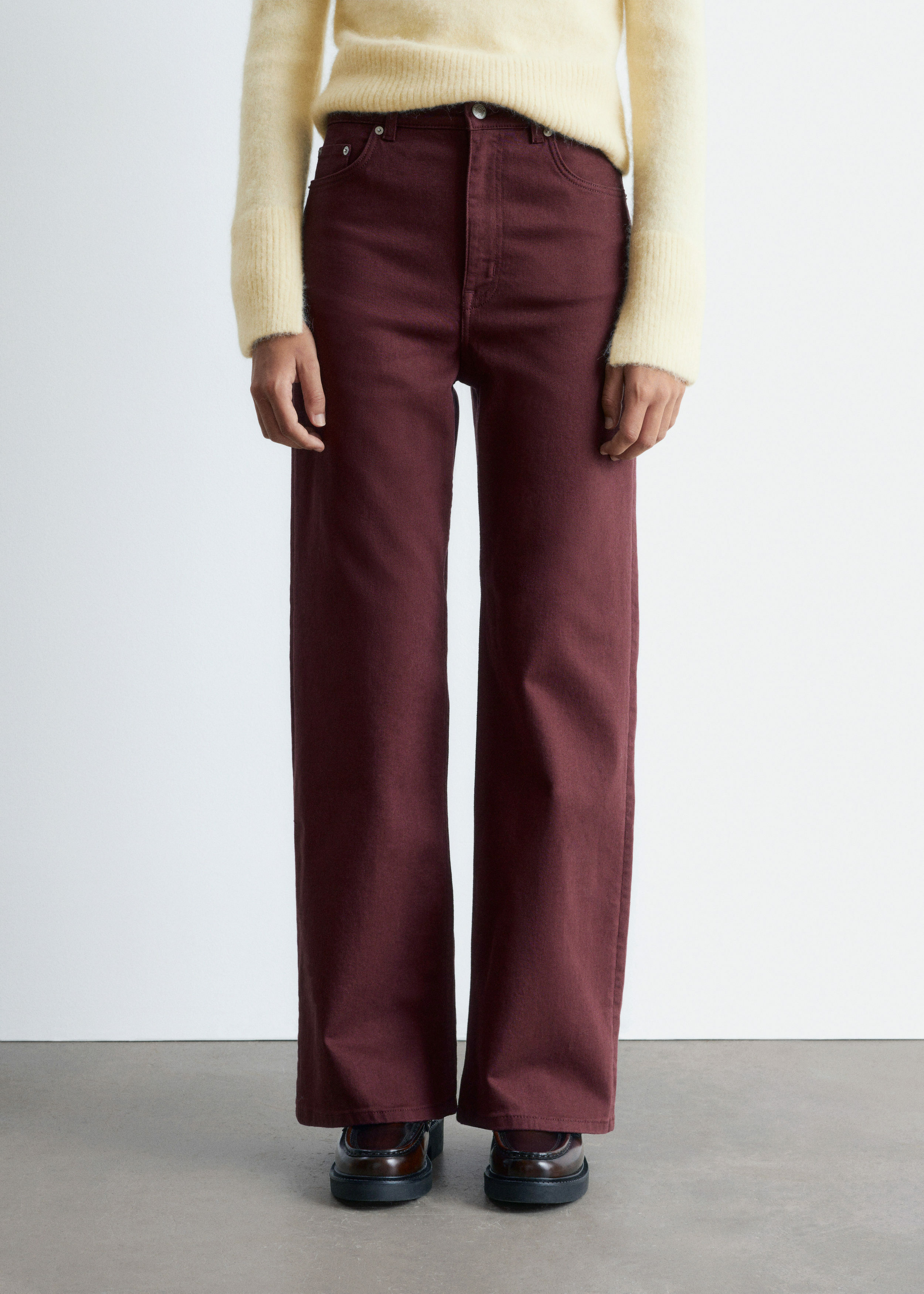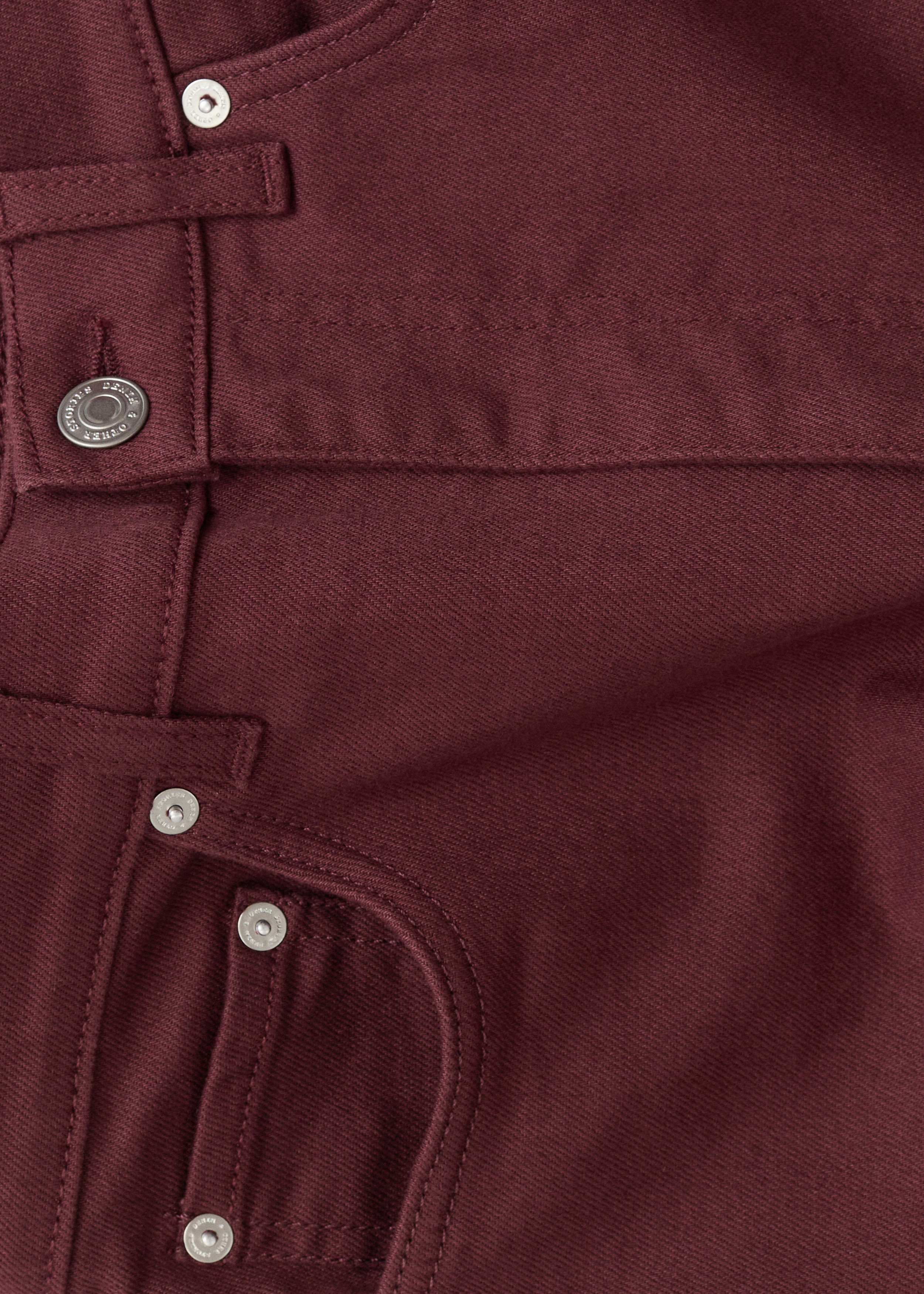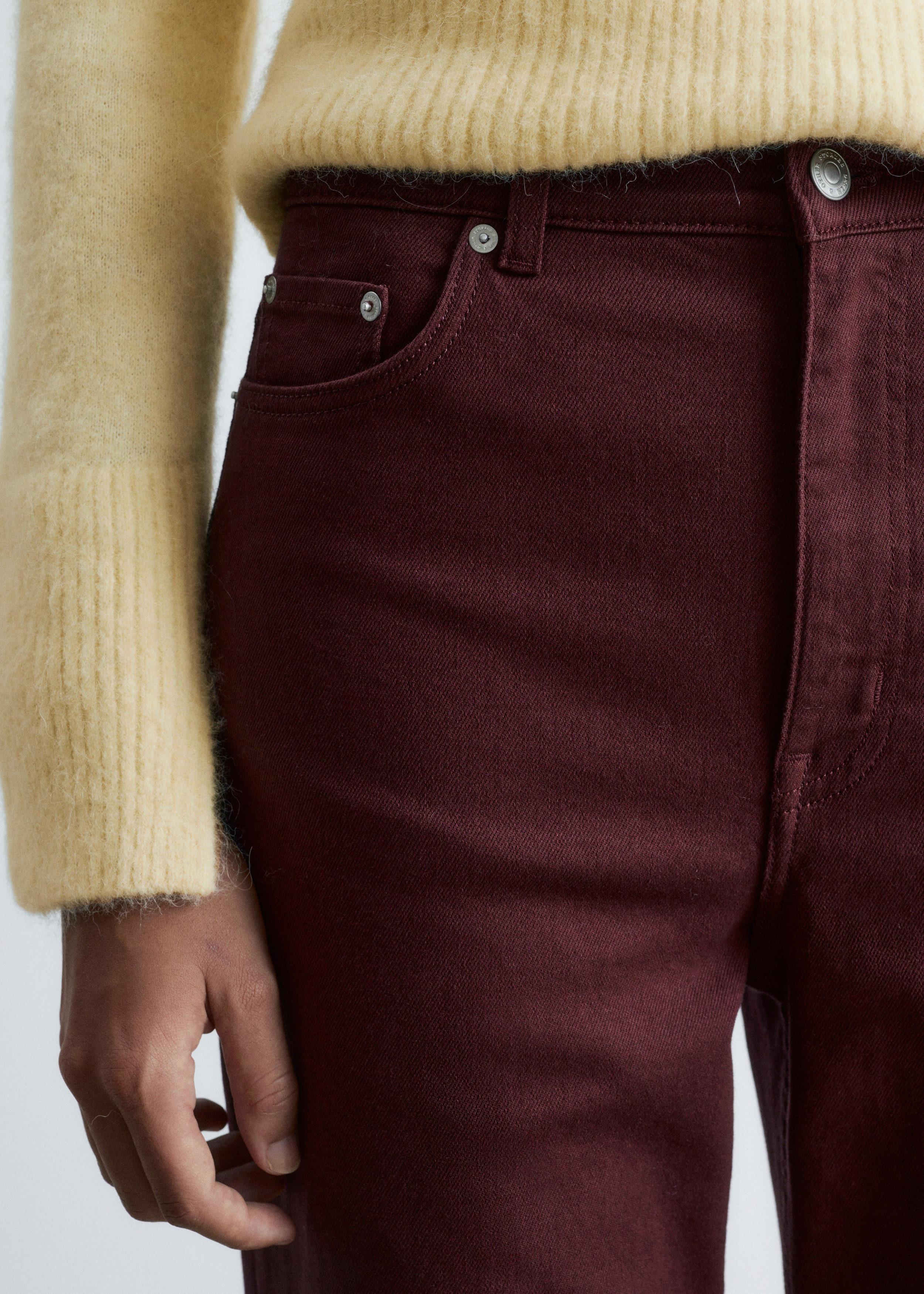 하이 웨이스트의 데님 진이에요. 너비감 있는 롱 레그와 클래식한 5 포켓 디자인이 특징이랍니다.