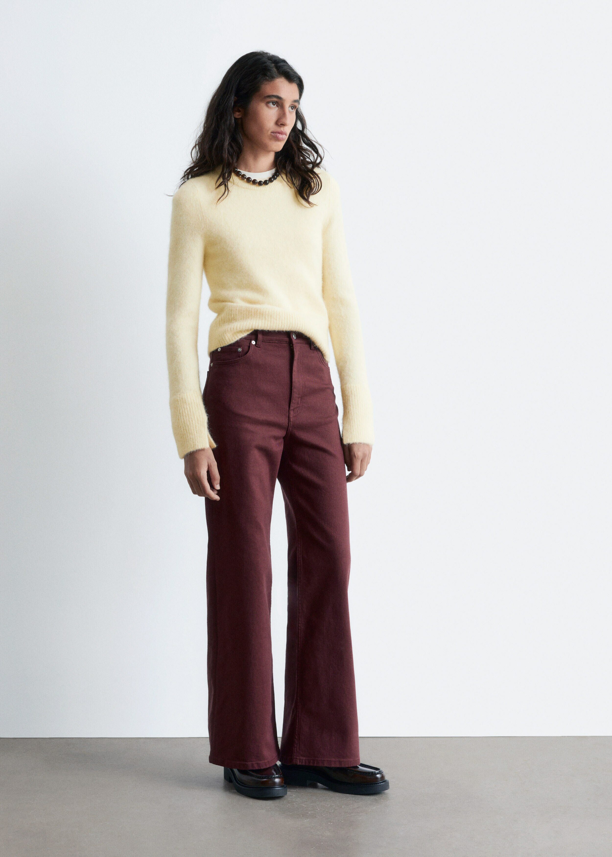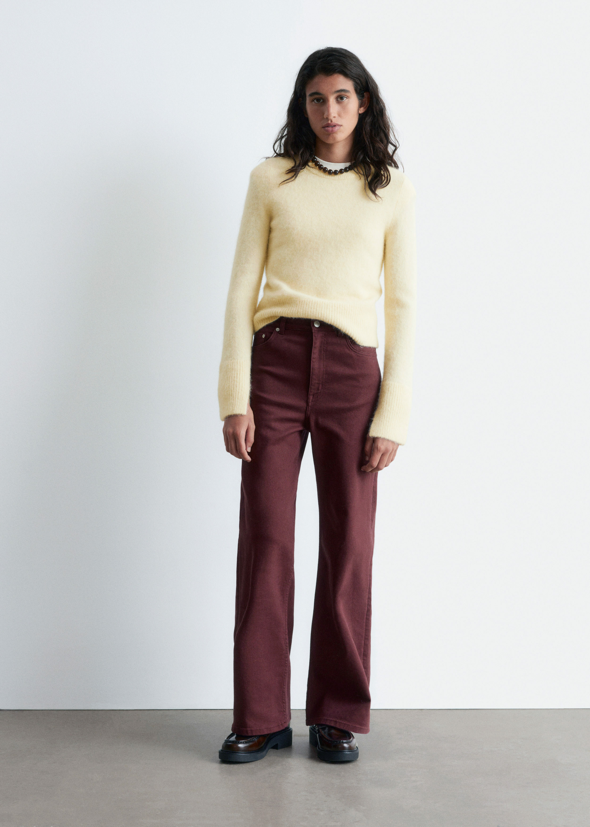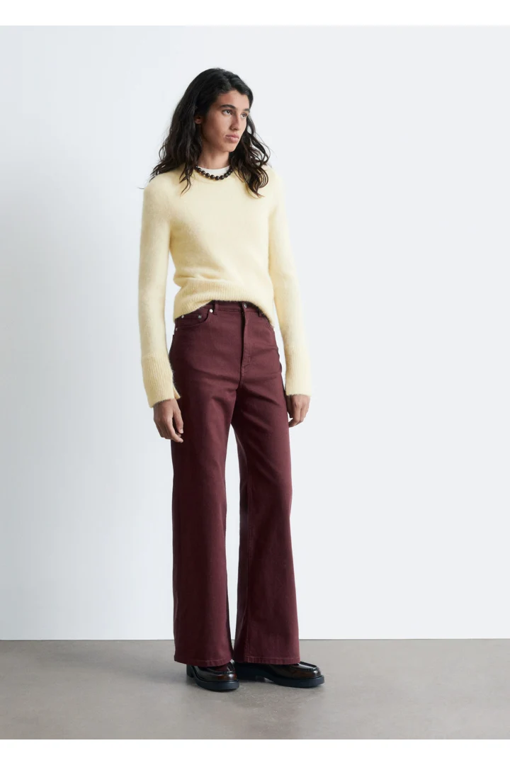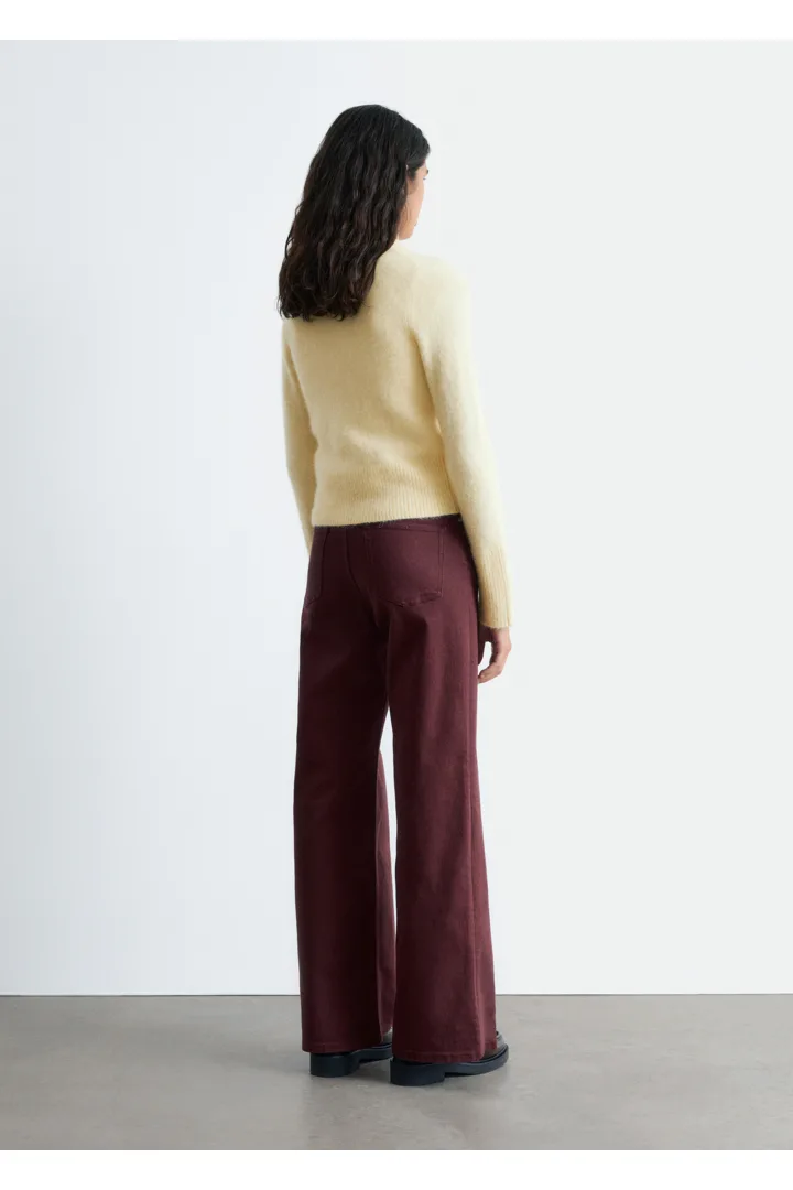 하이 웨이스트의 데님 진이에요. 너비감 있는 롱 레그와 클래식한 5 포켓 디자인이 특징이랍니다.