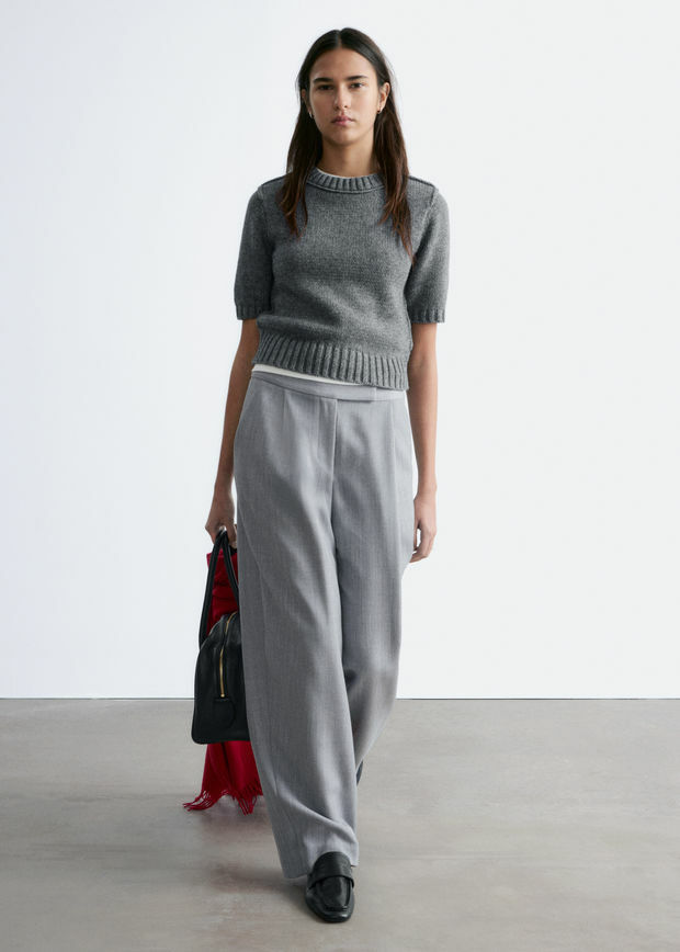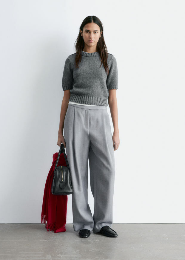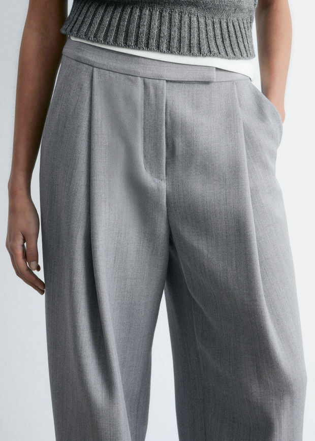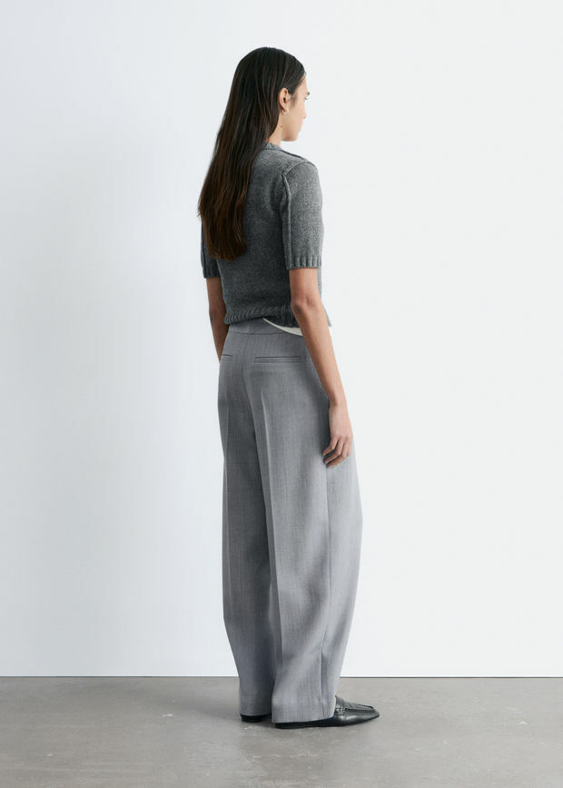 울 혼방 소재로 탄생한 트라우저예요. 루즈한 실루엣이 멋스러운 아이템으로 풀 기장의 레그에는 앞면부 플리츠와 뒷면부 프레스 크리스가 자리해 있어요. 측면의 사선 포켓, 뒷면의 웰트 포켓, 긴 허리밴드, 지퍼 플라이, 후크 앤 바 & 단추가 특징이랍니다.