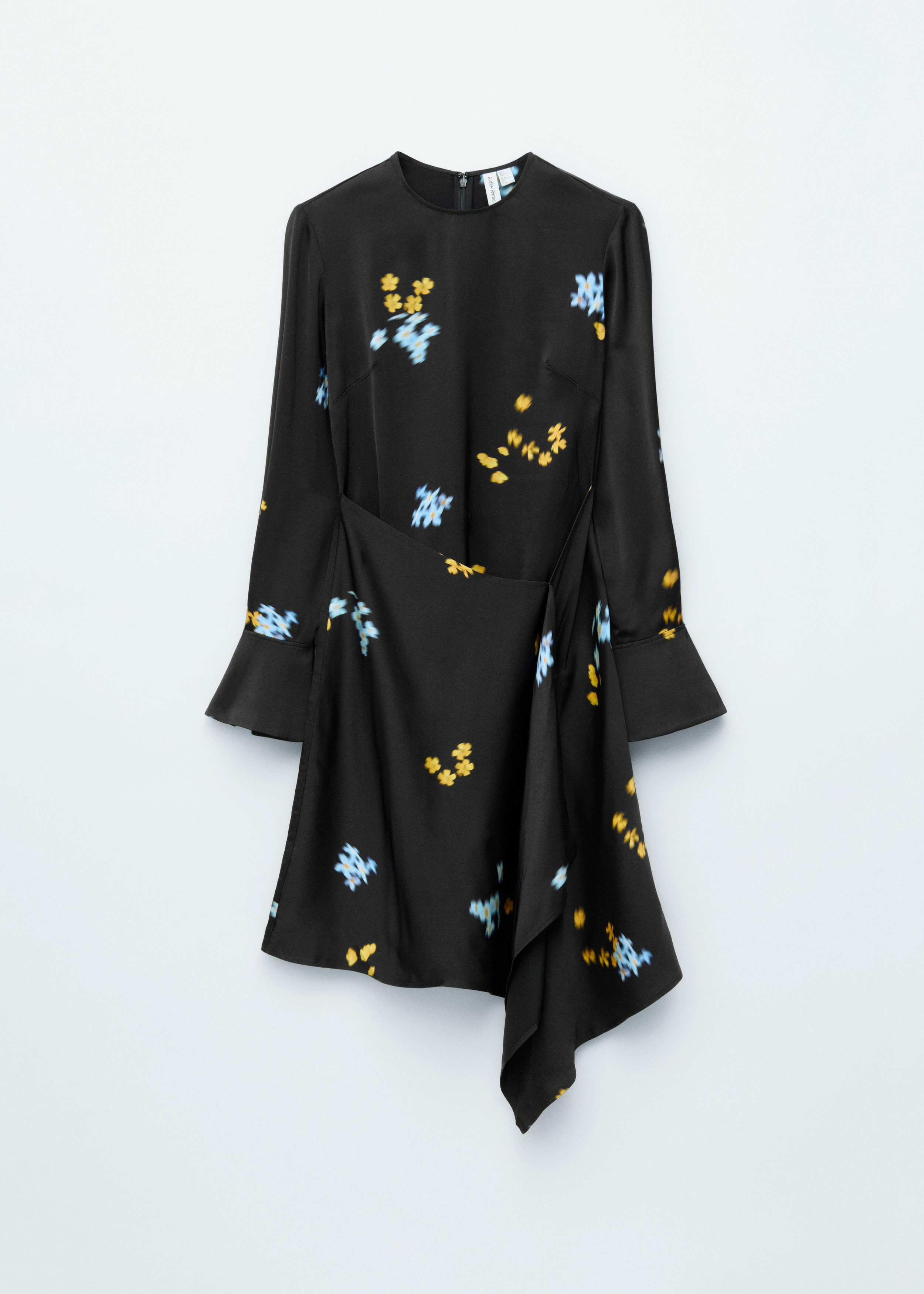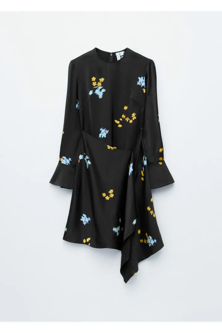 매끈한 새틴 소재로 탄생한 미니 드레스예요. 라운드 넥, 은은한 숄더 패드, 롱 슬리브, 그리도 부드럽게 드레이프지는 비대칭 스커트가 특징이에요. 너비감 있는 커프스에는 은은한 슬릿과 단추가, 뒷면에는 컨실드 지퍼가 자리해 있답니다.