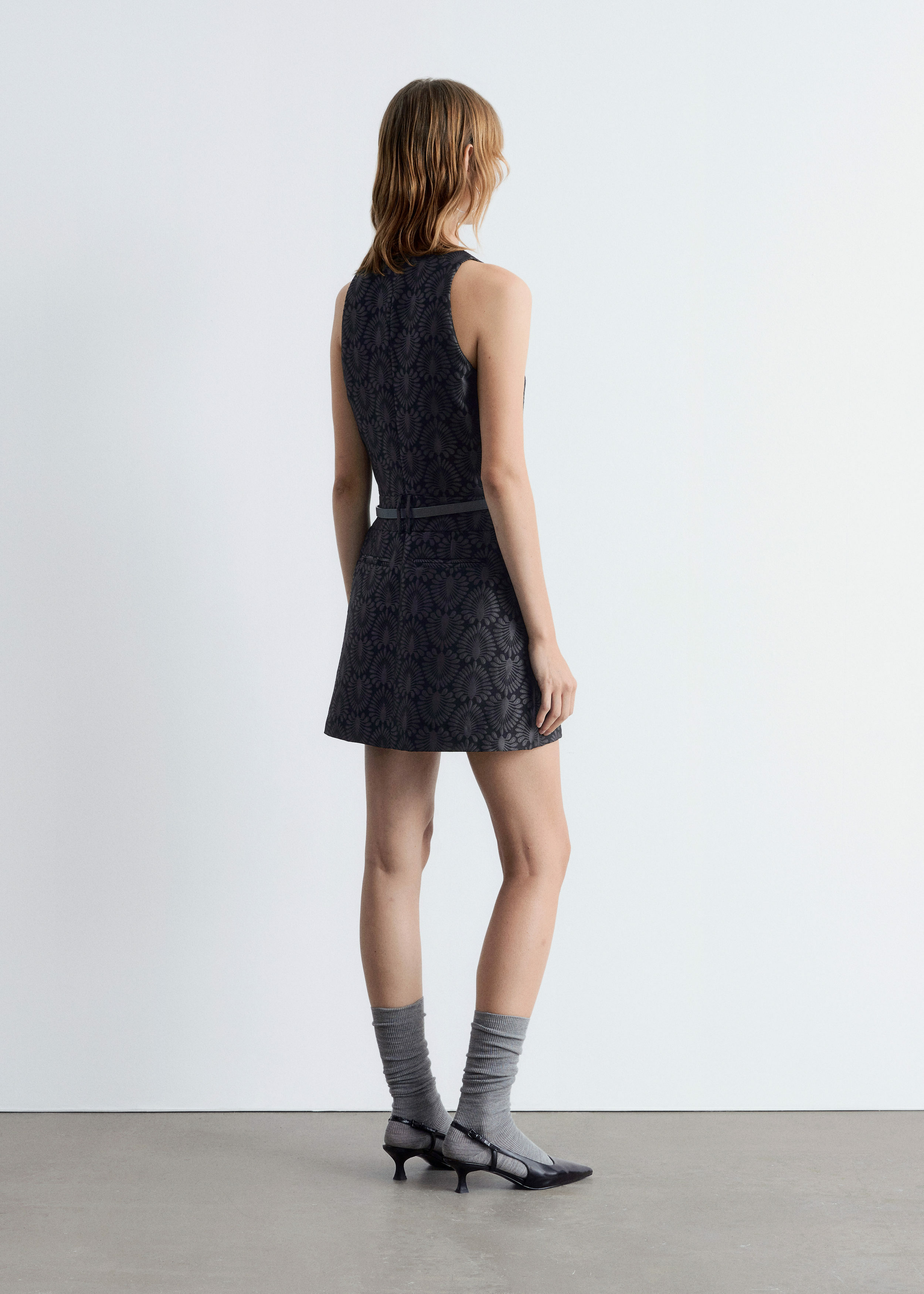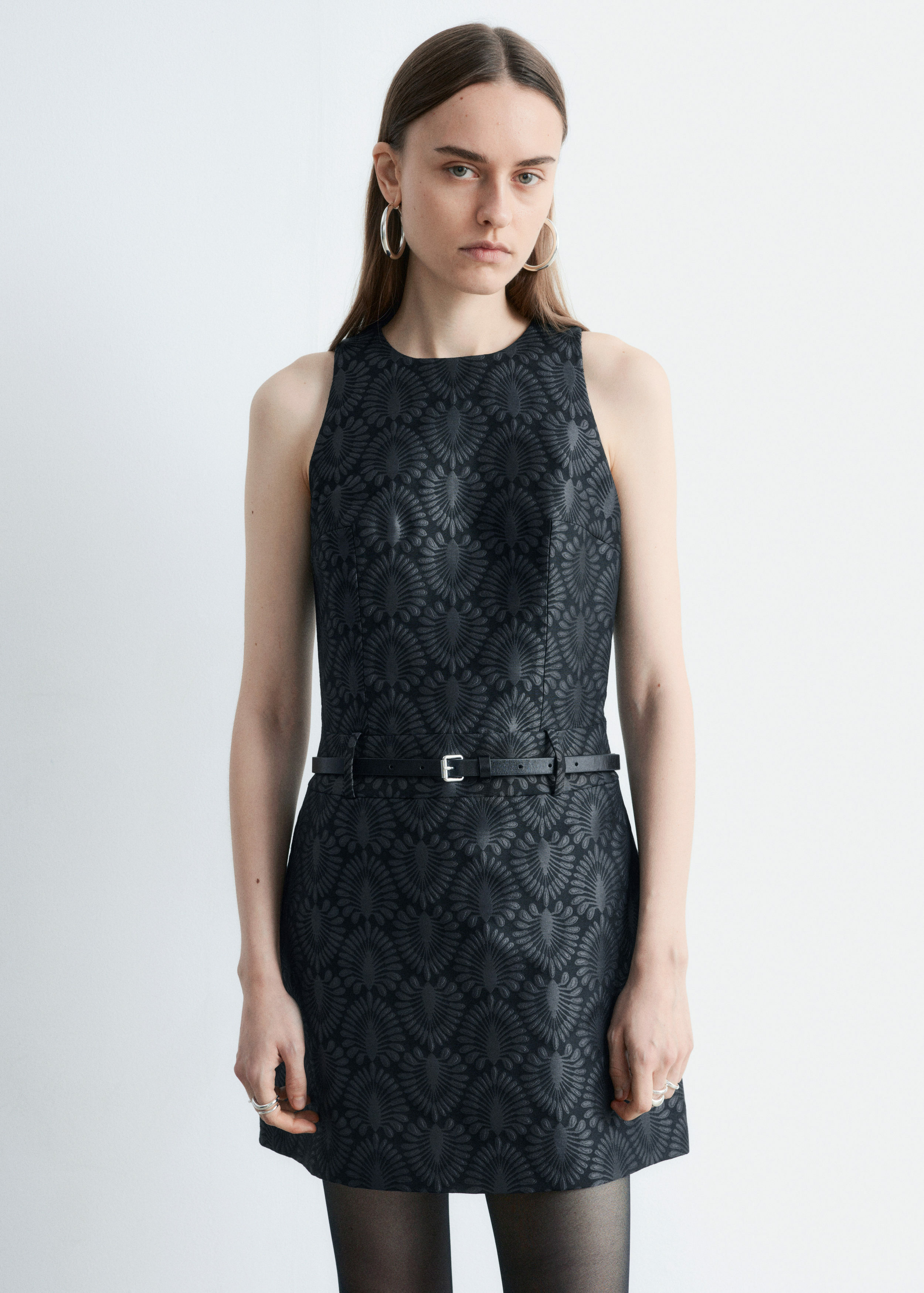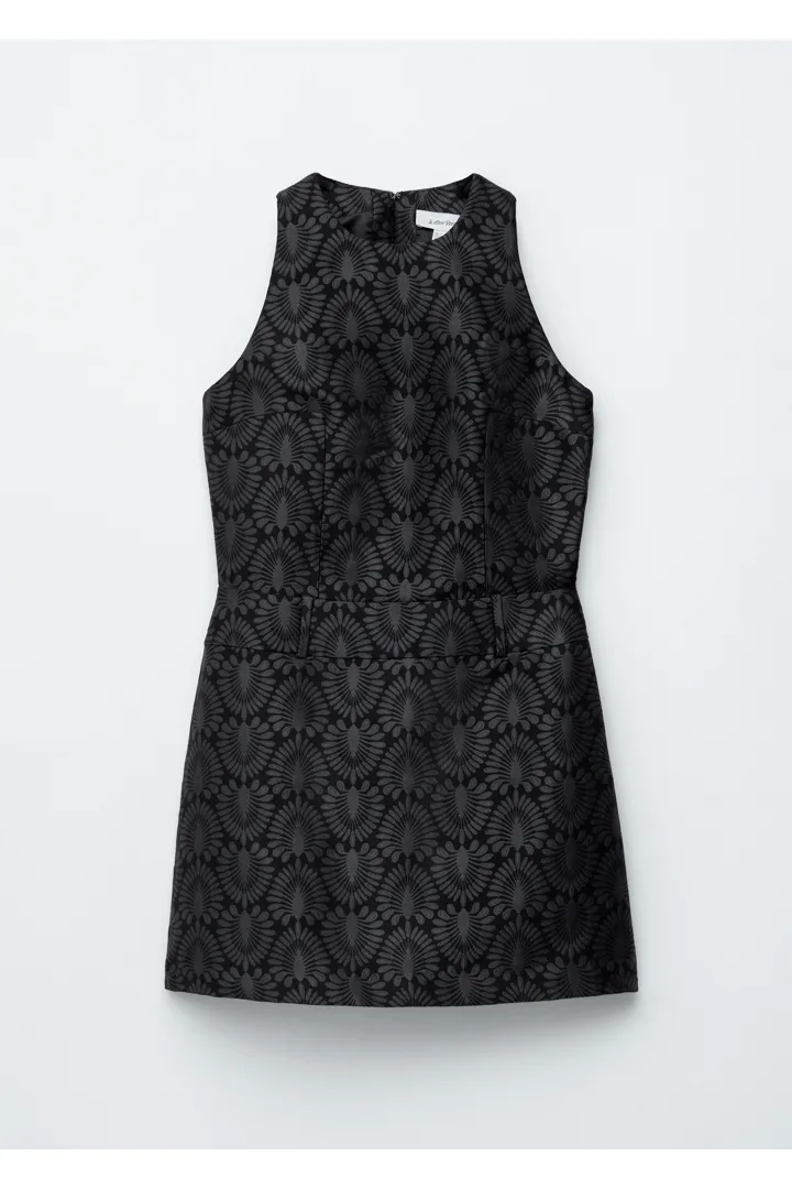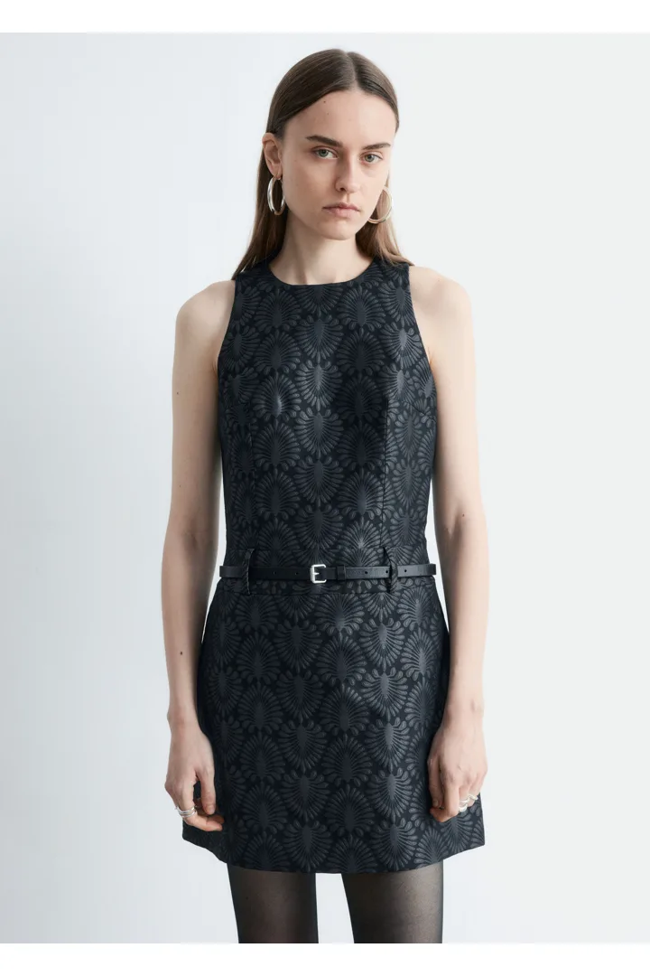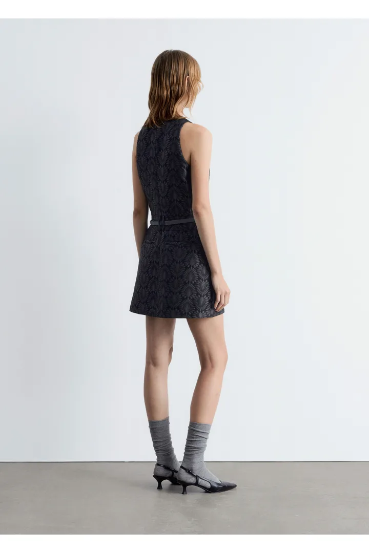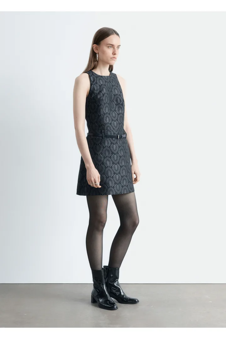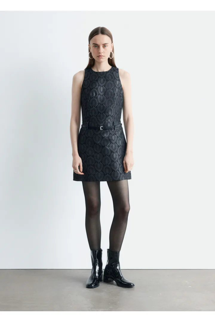 새틴 브로케이드 소재로 탄생한 미니 드레스예요. 텍스처가 풍성한 피코크 패턴이 매력적이랍니다. 라운드 넥, 슬리브리스 디자인, 그리고 허리의 페이크 벨트가 특징이에요. 네크라인에는 키홀 여밈이, 그리고 측면에는 컨실드 지퍼 및 후크 앤 아이 클로저가 자리해 있답니다.