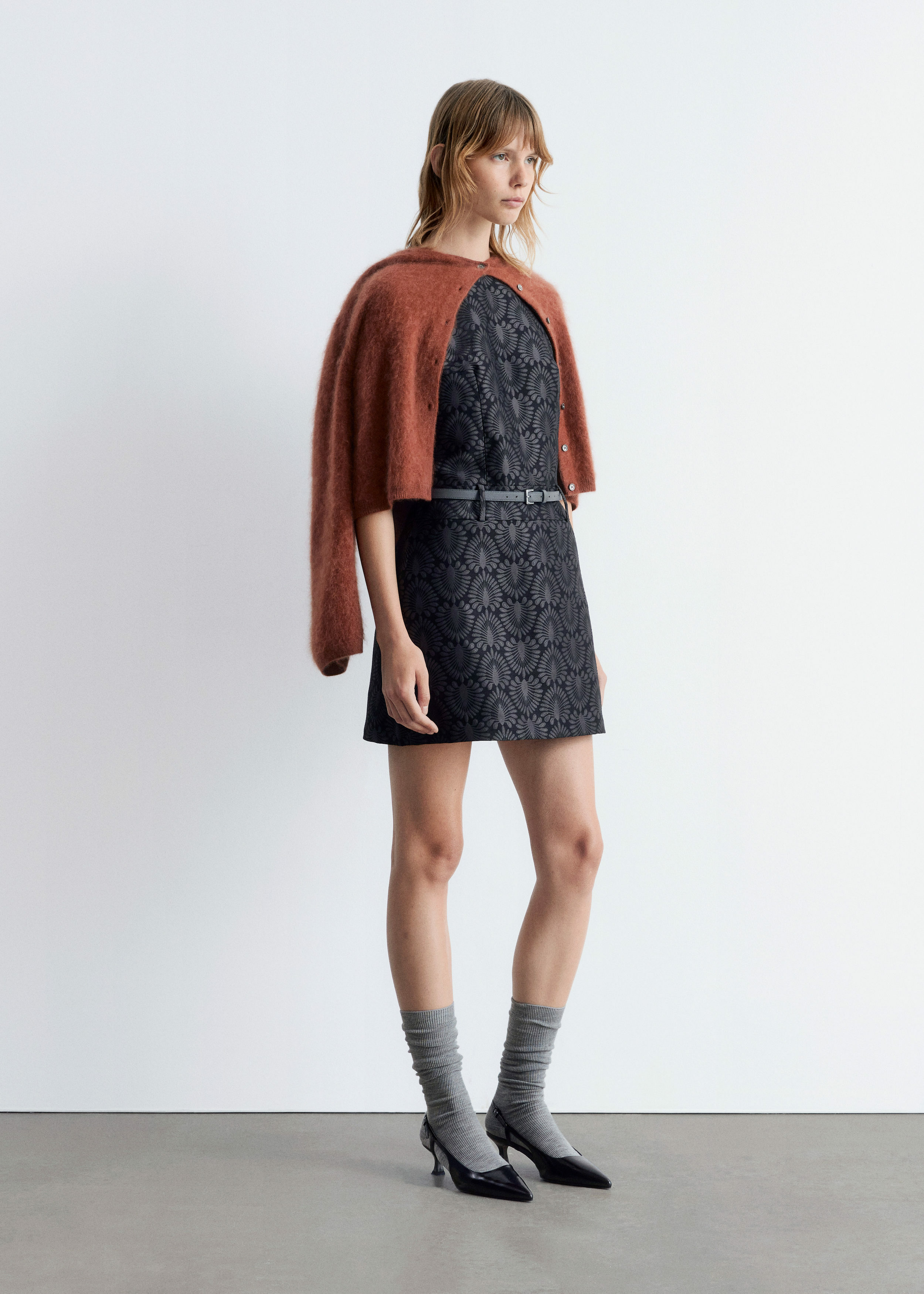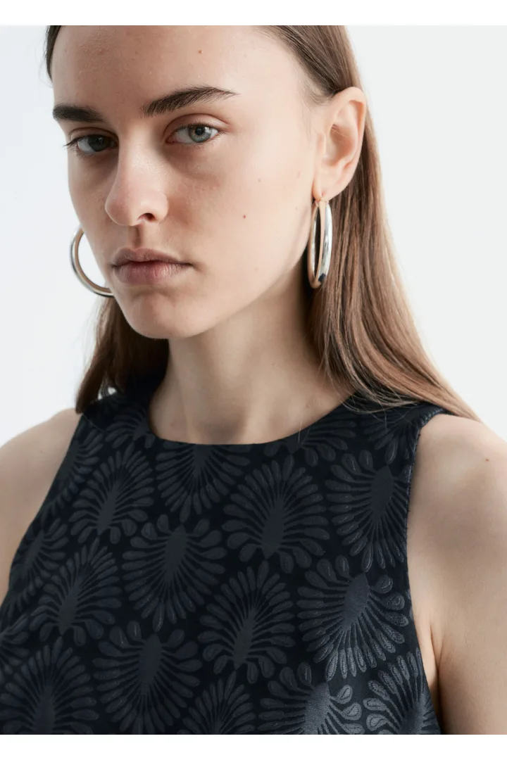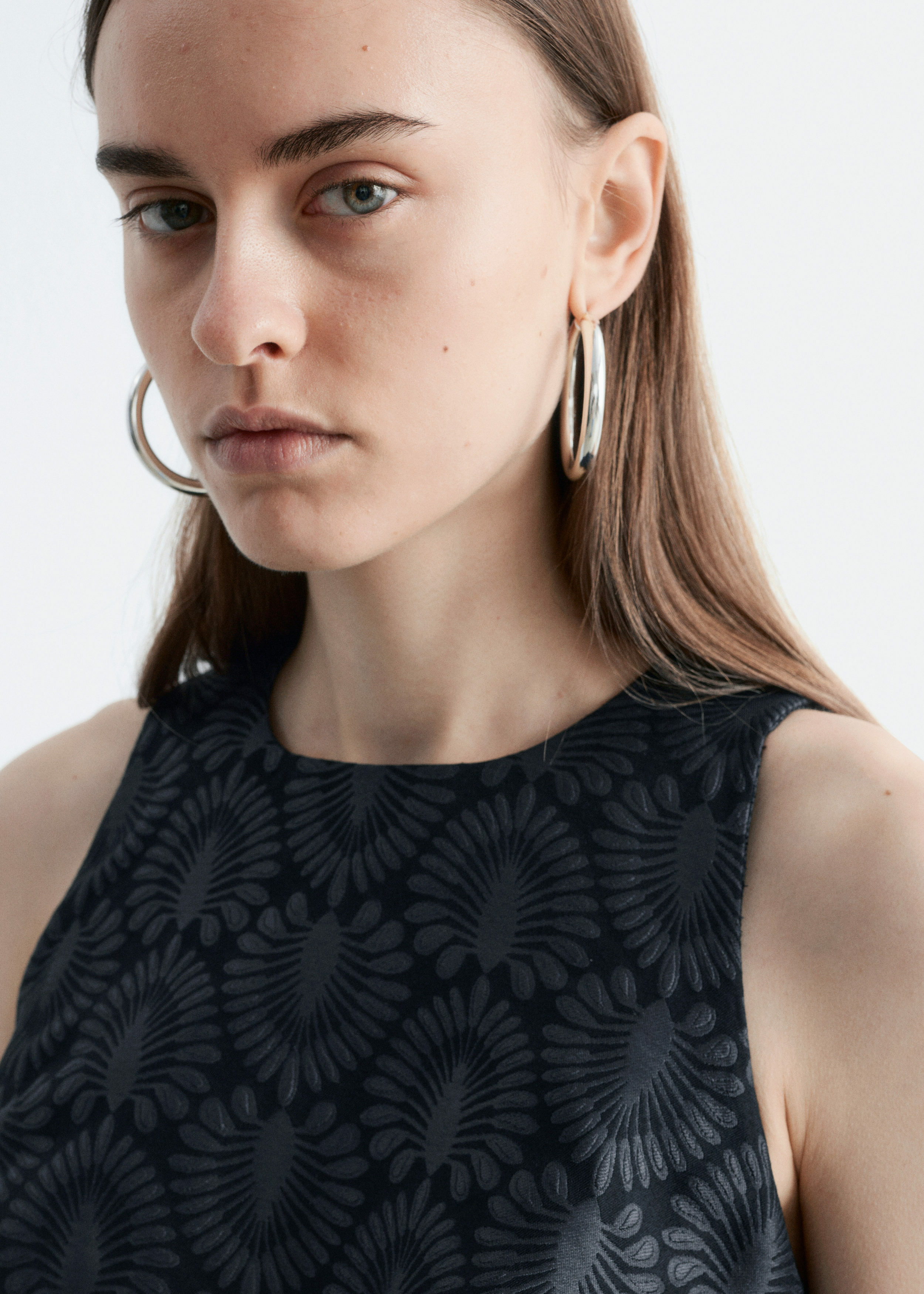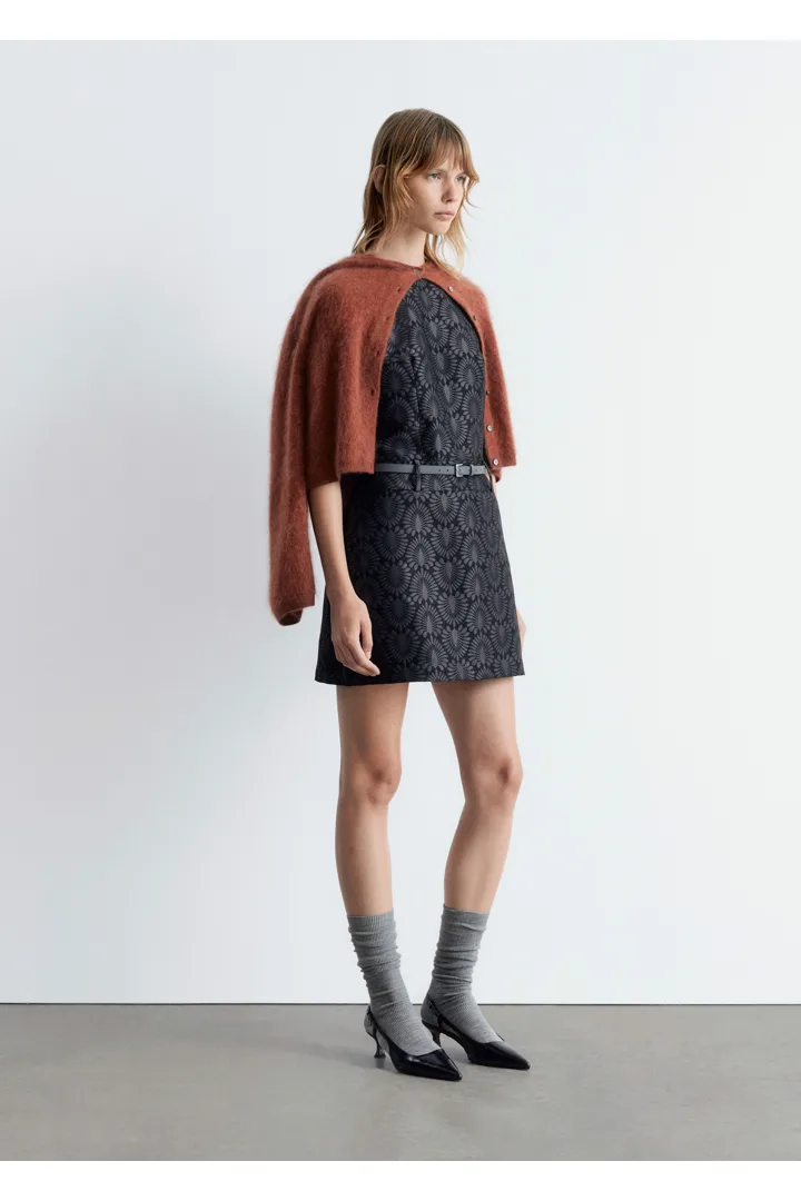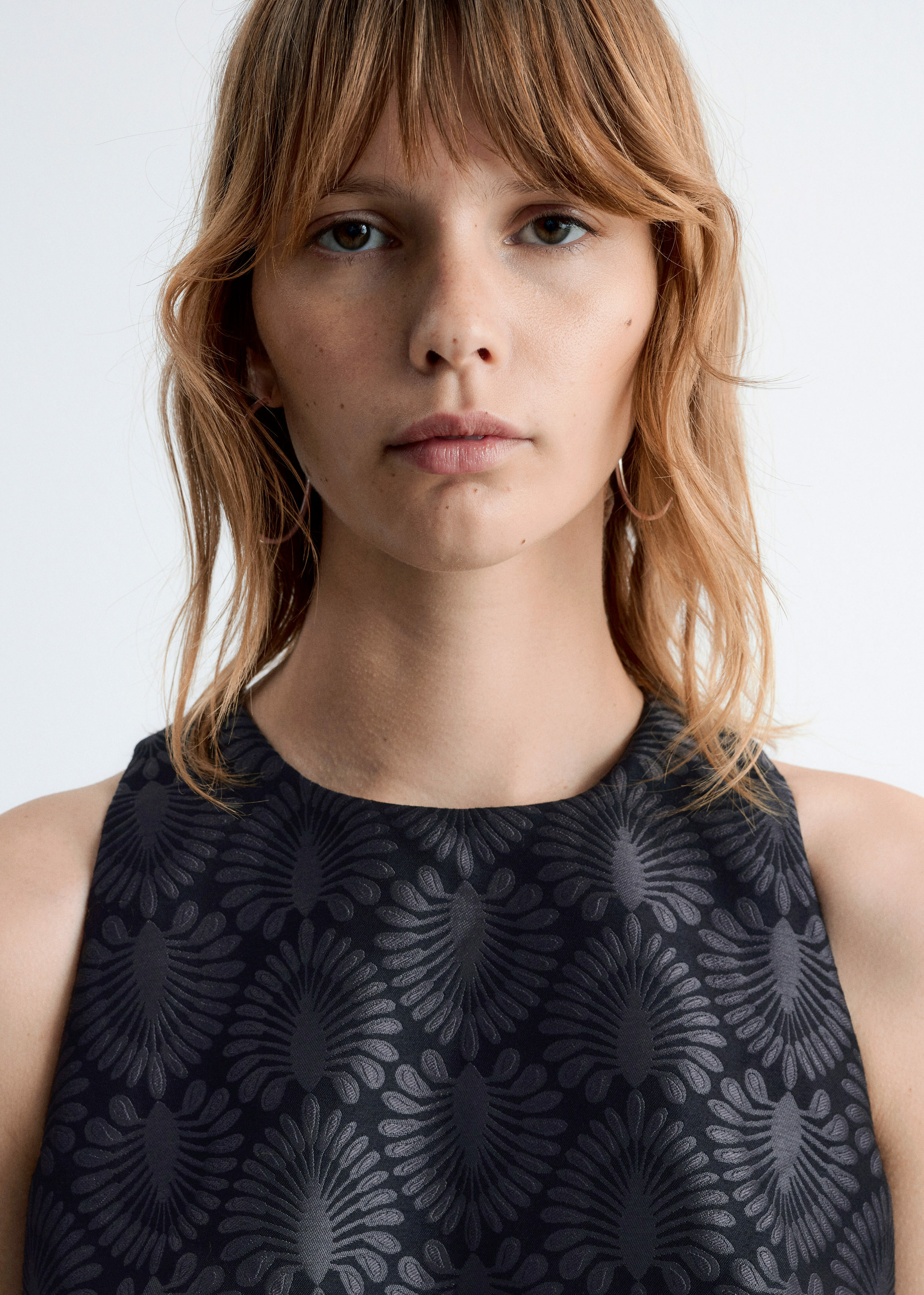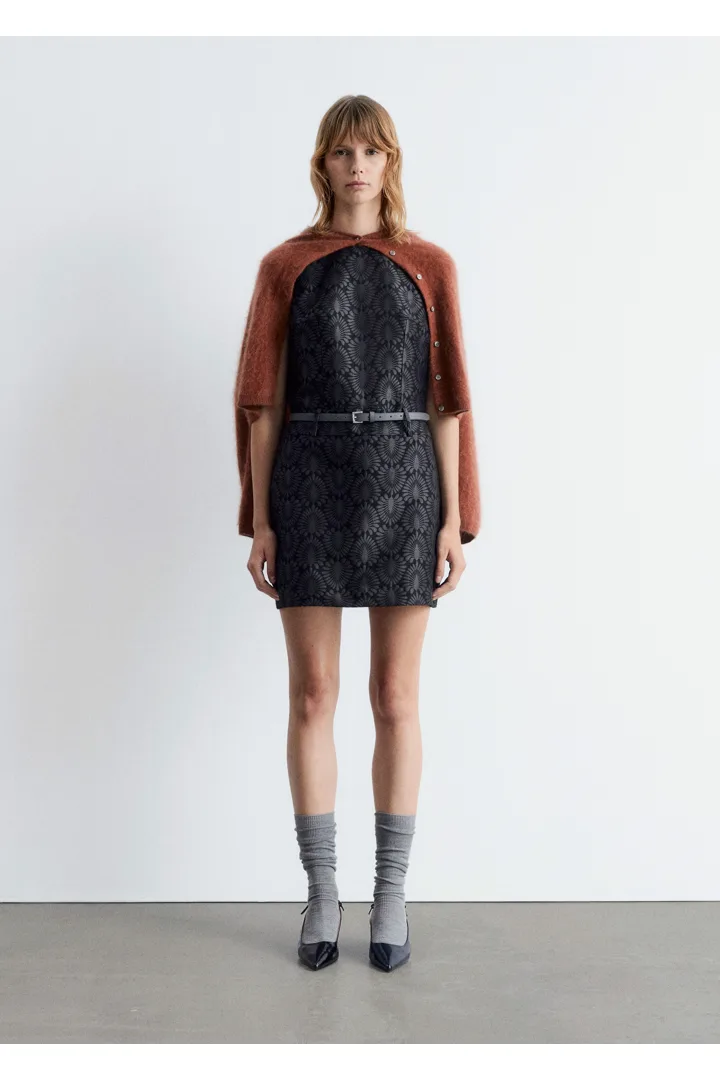 새틴 브로케이드 소재로 탄생한 미니 드레스예요. 텍스처가 풍성한 피코크 패턴이 매력적이랍니다. 라운드 넥, 슬리브리스 디자인, 그리고 허리의 페이크 벨트가 특징이에요. 네크라인에는 키홀 여밈이, 그리고 측면에는 컨실드 지퍼 및 후크 앤 아이 클로저가 자리해 있답니다.