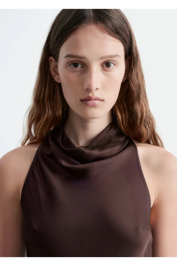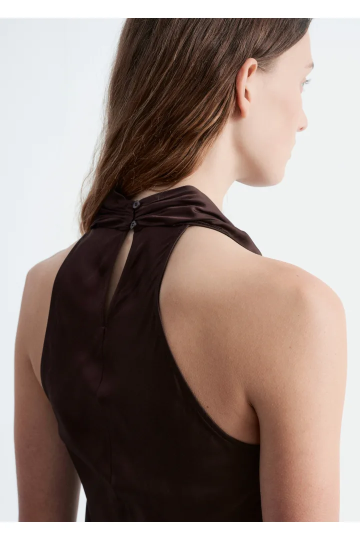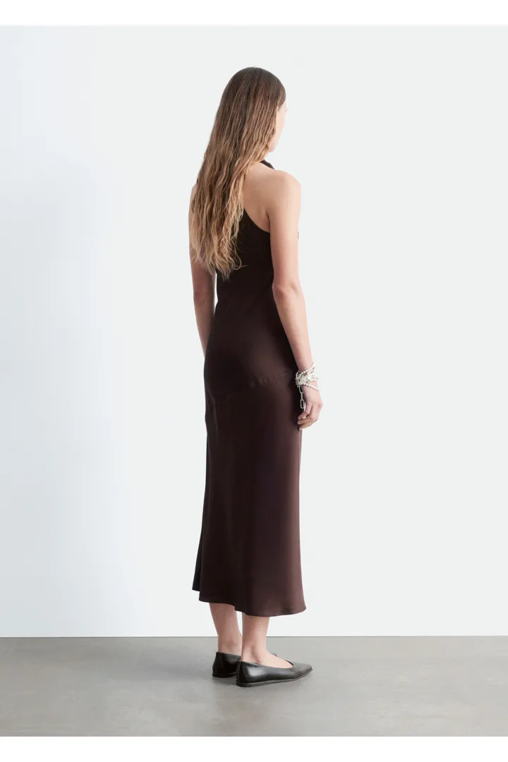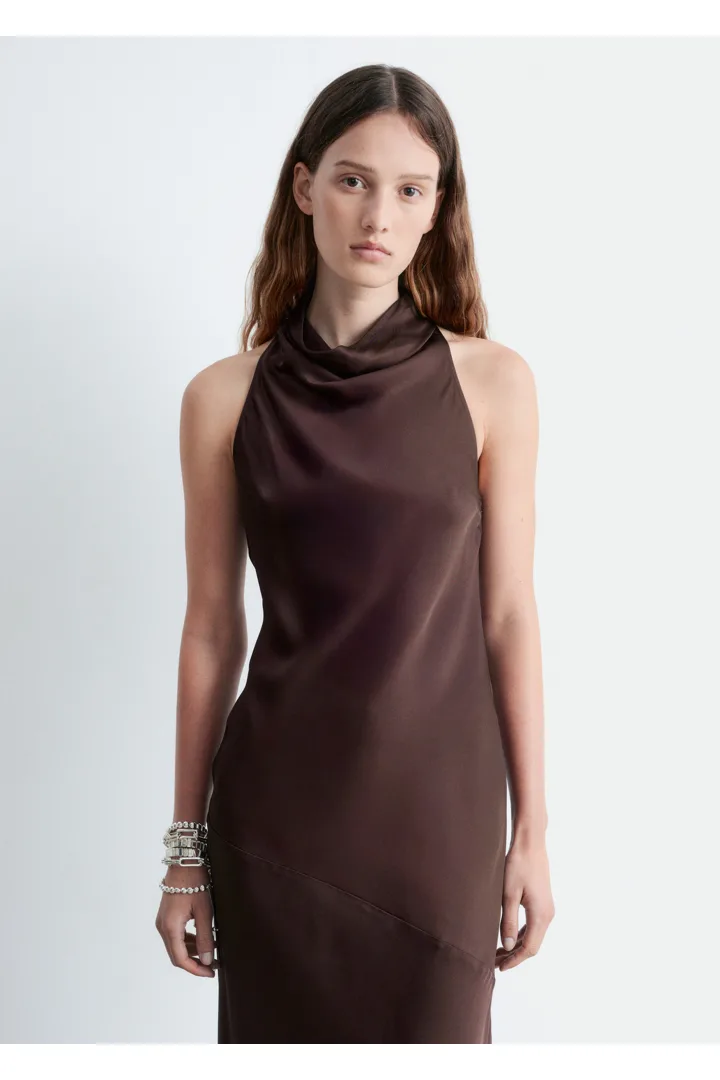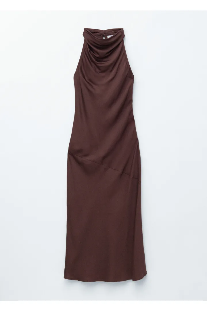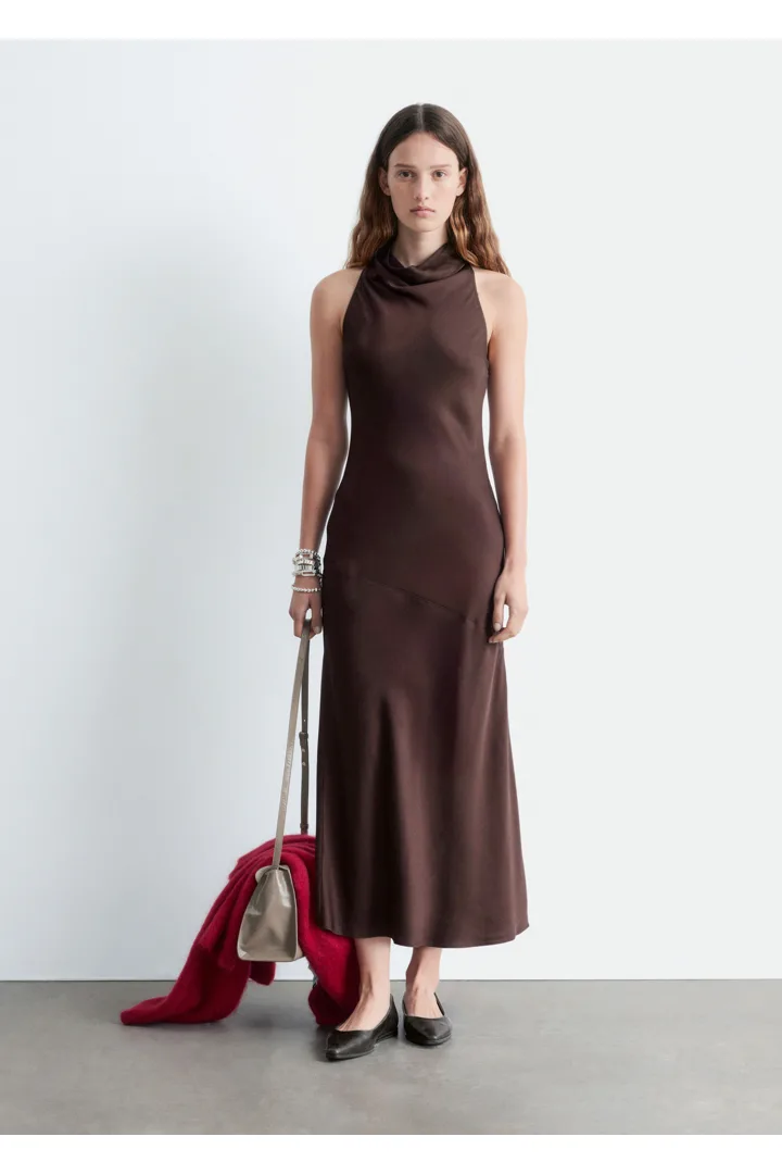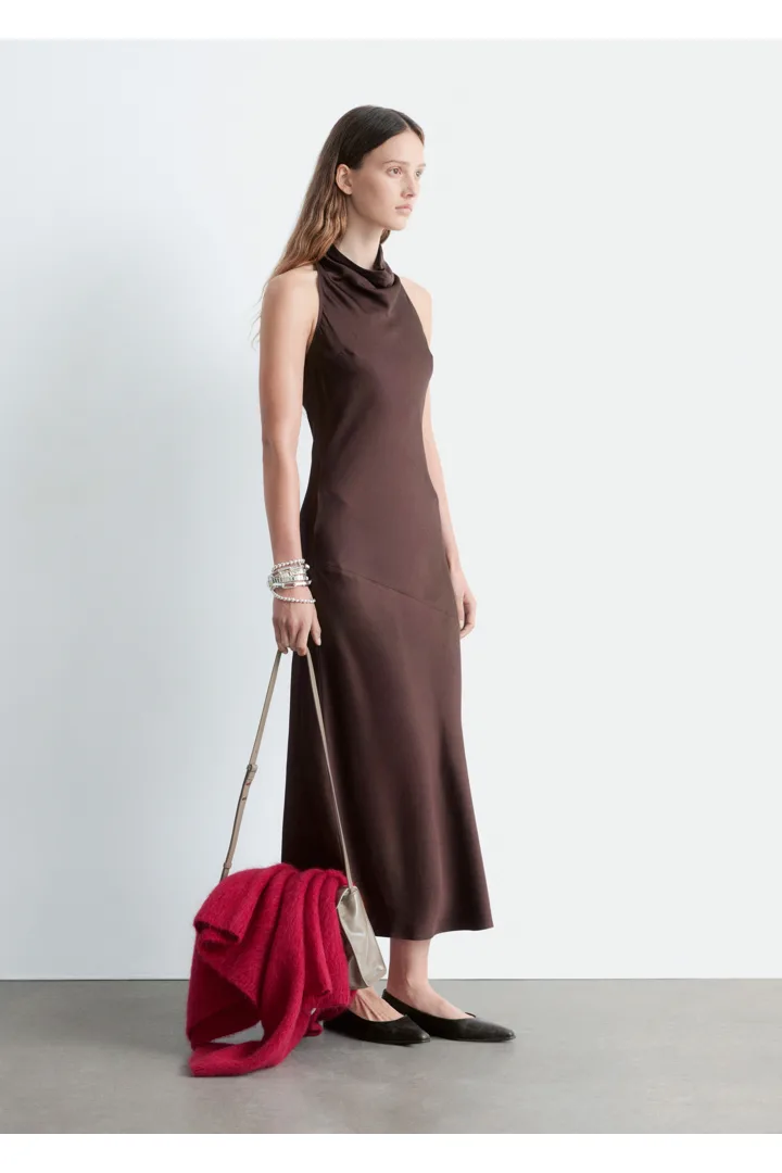 부드러운 새틴 소재로 탄생한 미디 드레스예요. 하이 넥, 드레이프 숄 카라, 핏 되는 허리라인, 은은하게 흐르는 플레어 스커트가 특징이며, 네크라인의 키홀 단추와 측면의 컨실드 지퍼가 자리해 있어요.