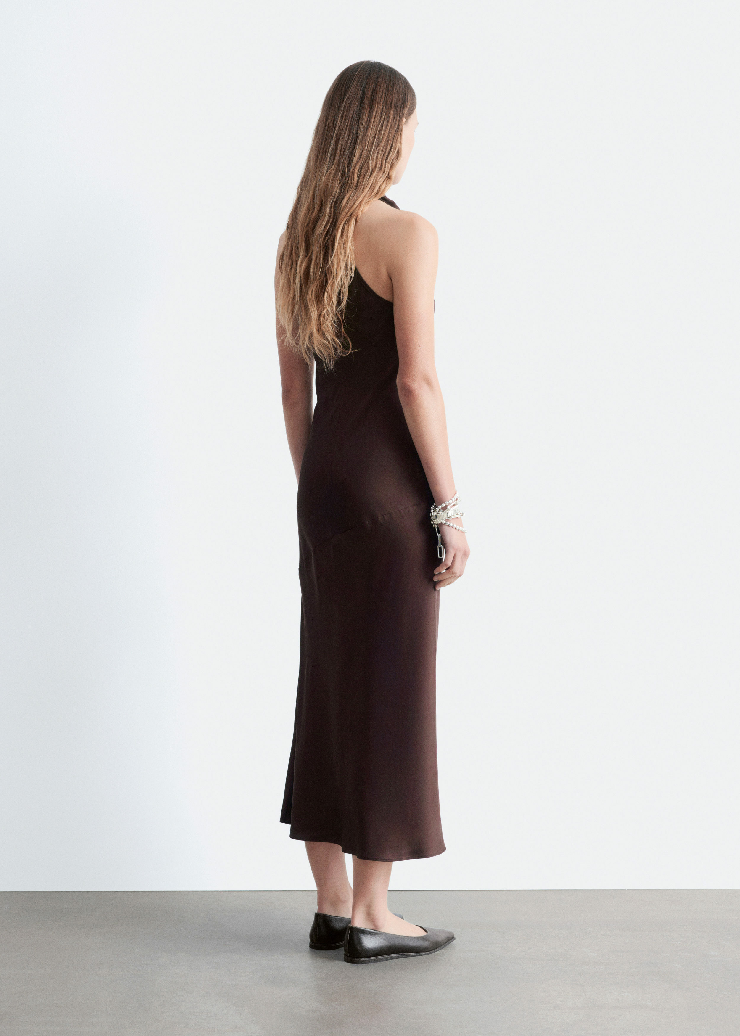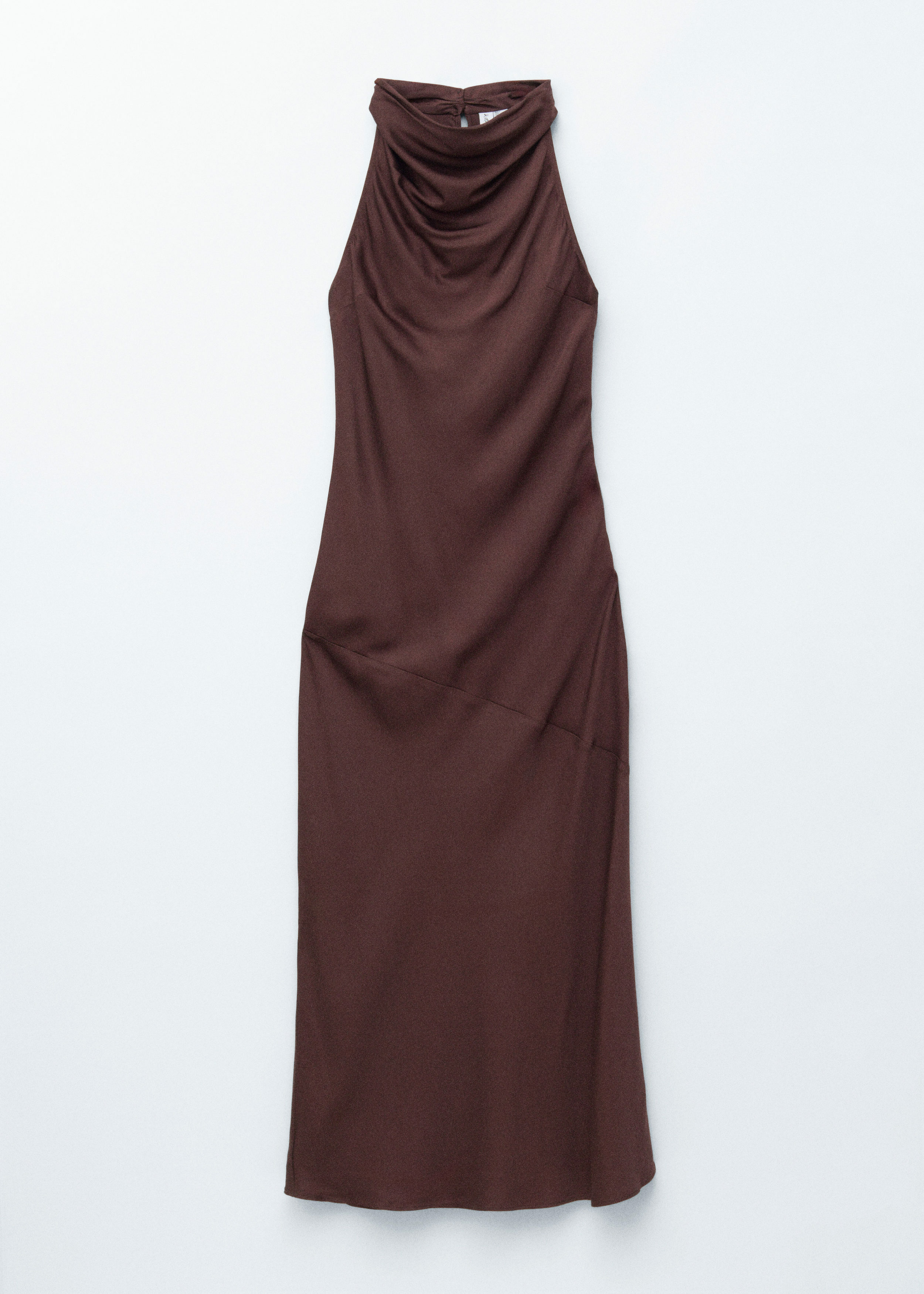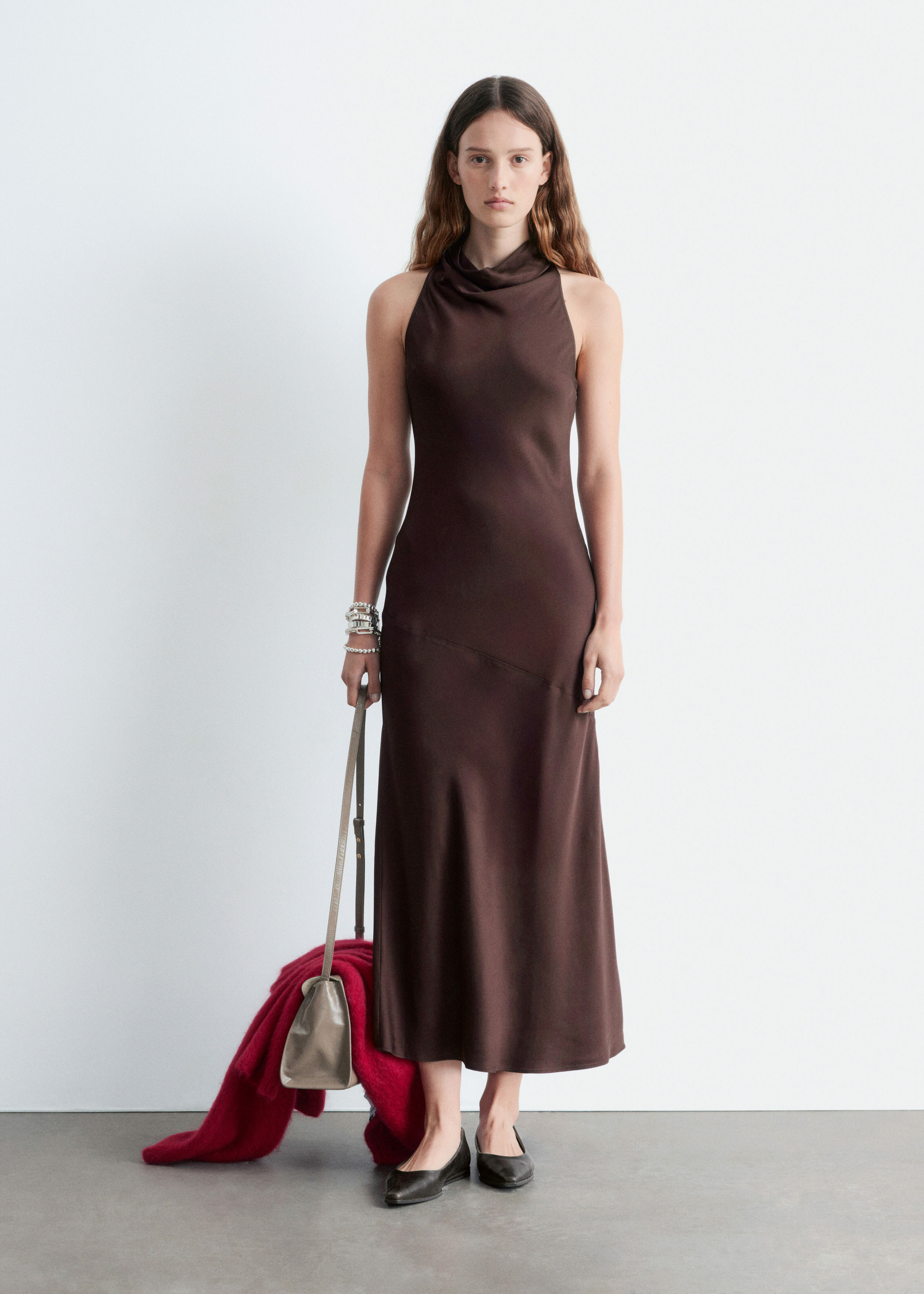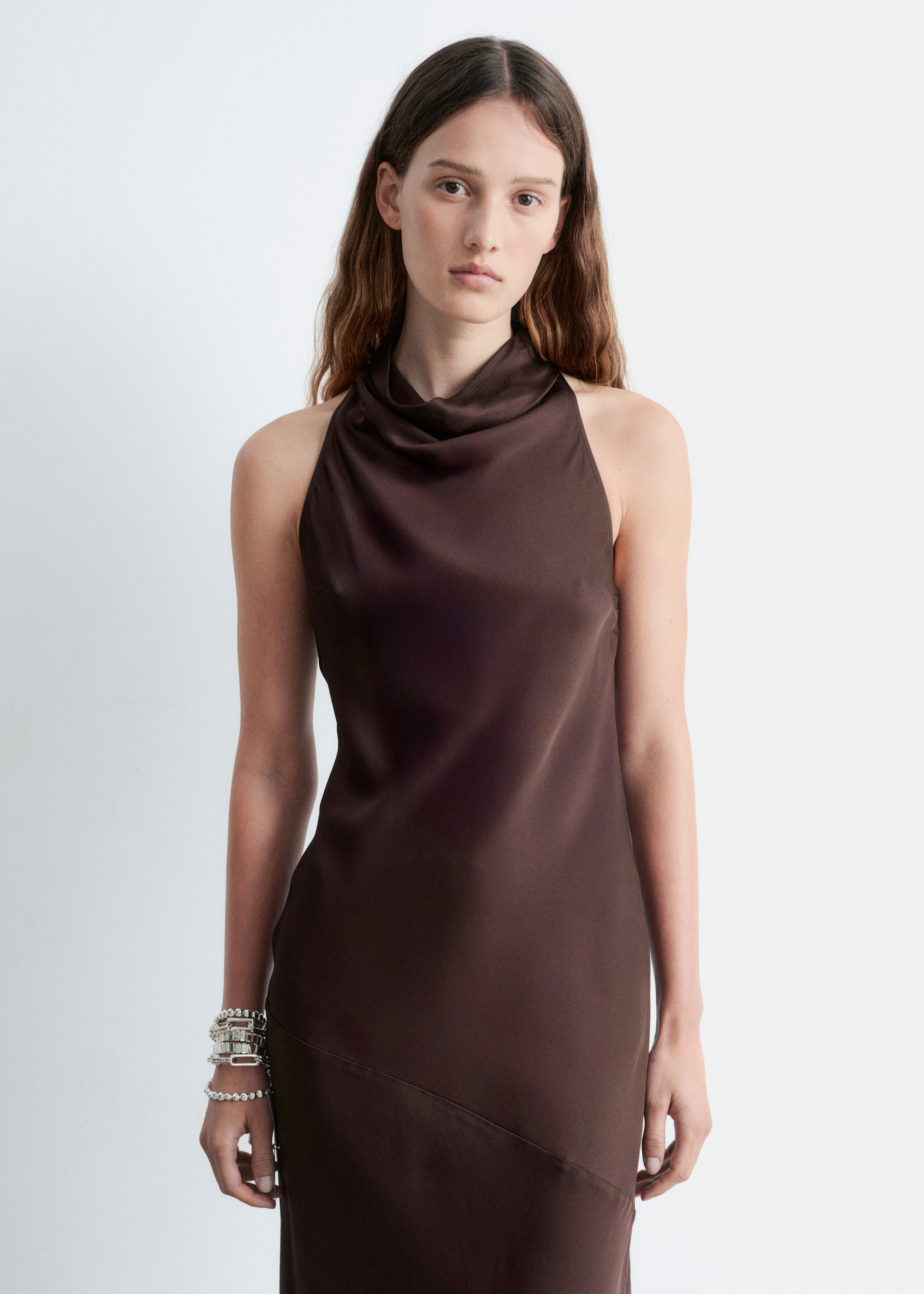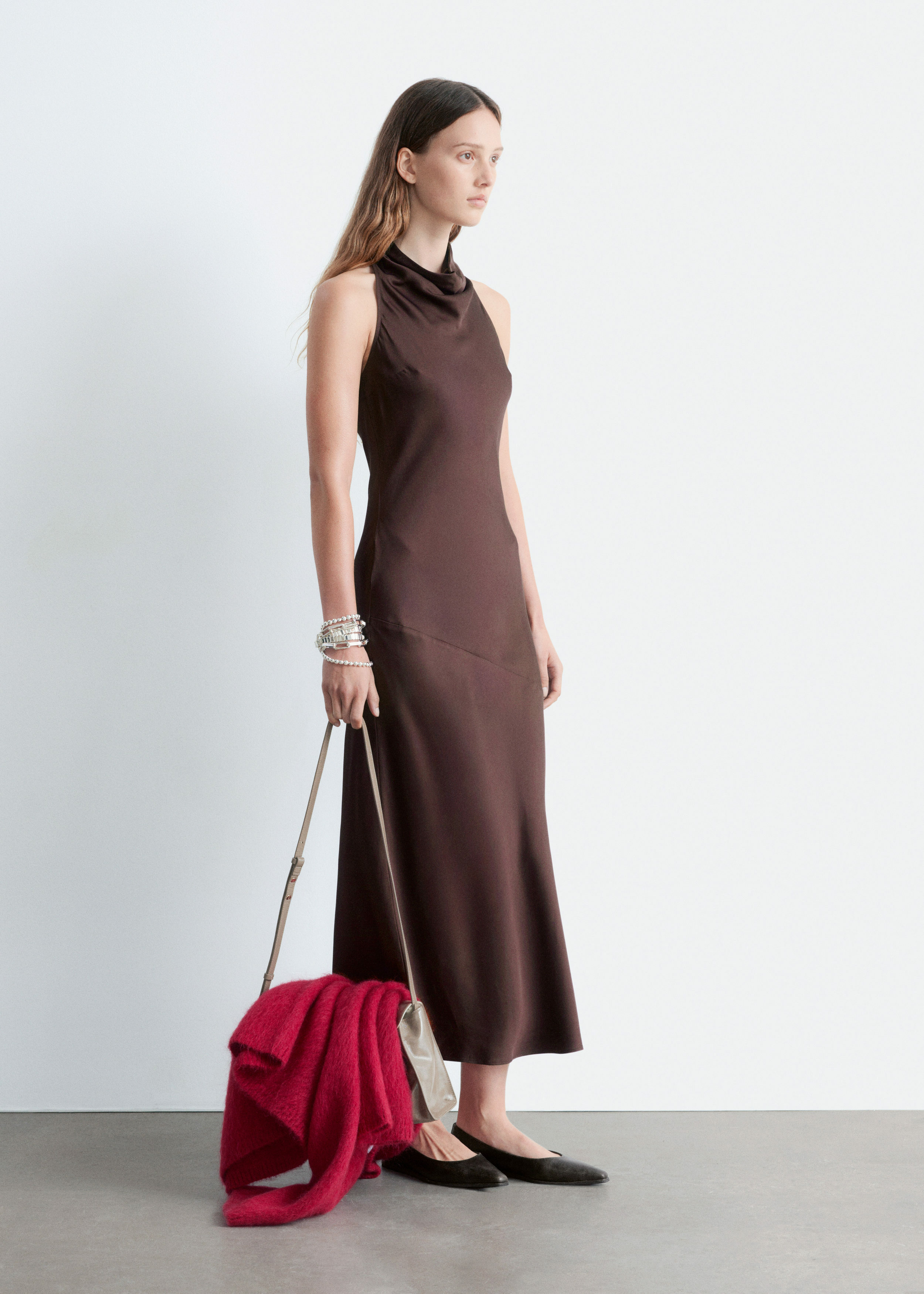 부드러운 새틴 소재로 탄생한 미디 드레스예요. 하이 넥, 드레이프 숄 카라, 핏 되는 허리라인, 은은하게 흐르는 플레어 스커트가 특징이며, 네크라인의 키홀 단추와 측면의 컨실드 지퍼가 자리해 있어요.