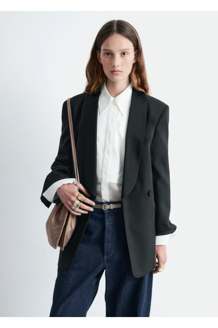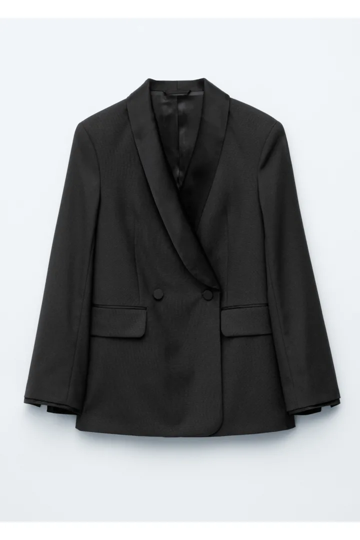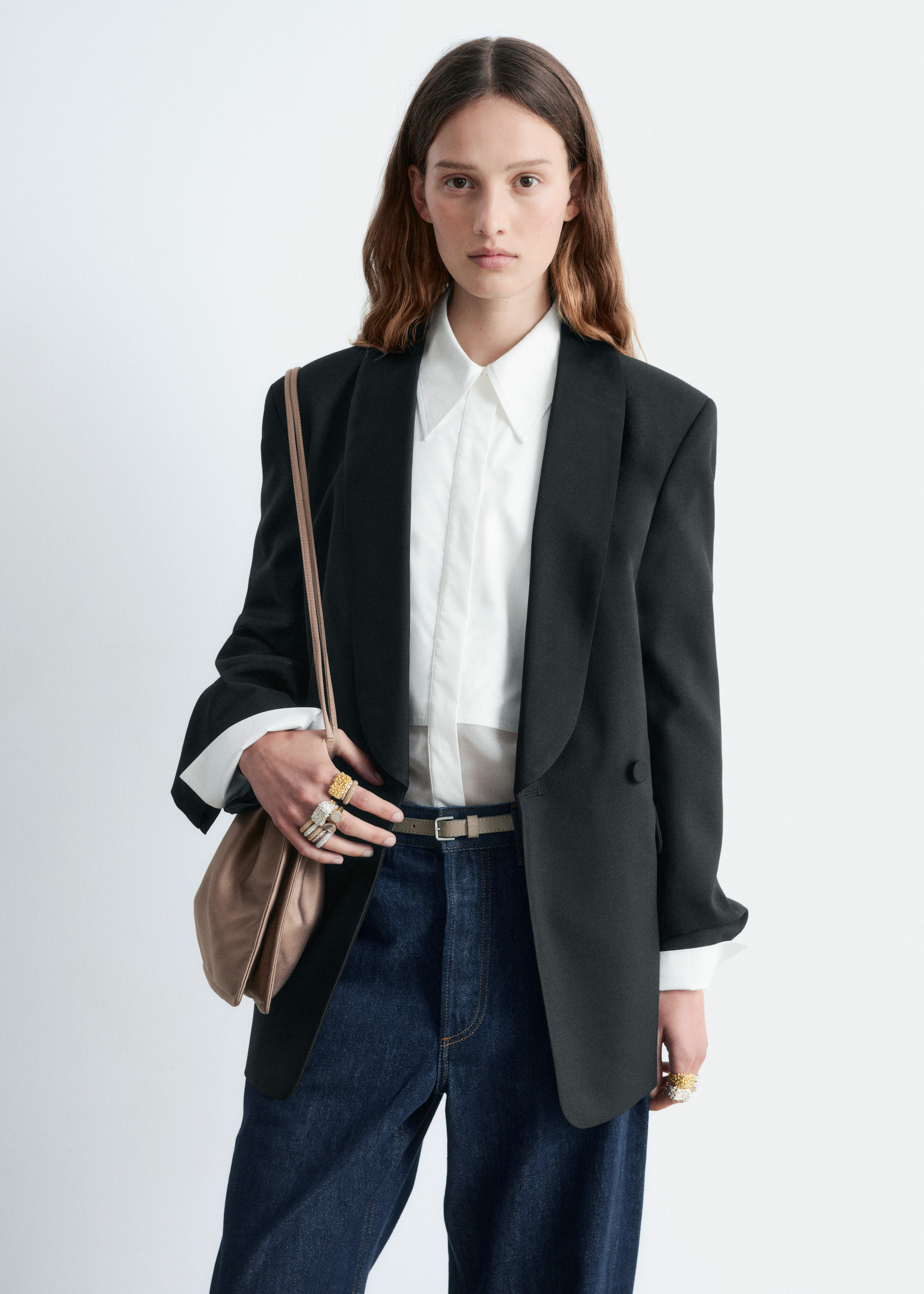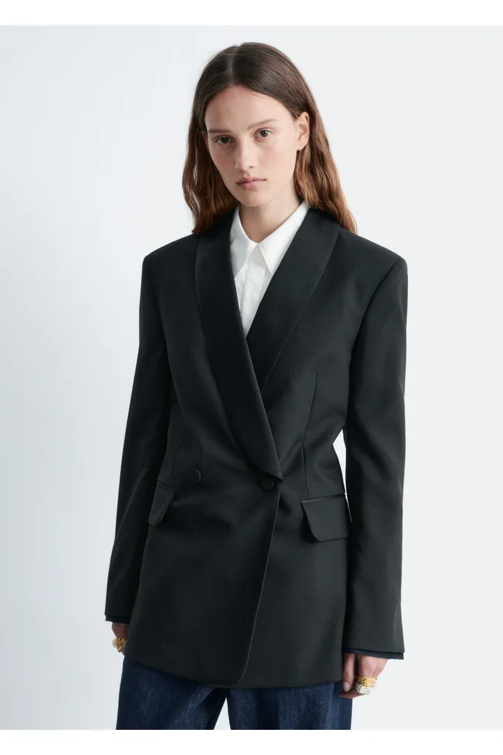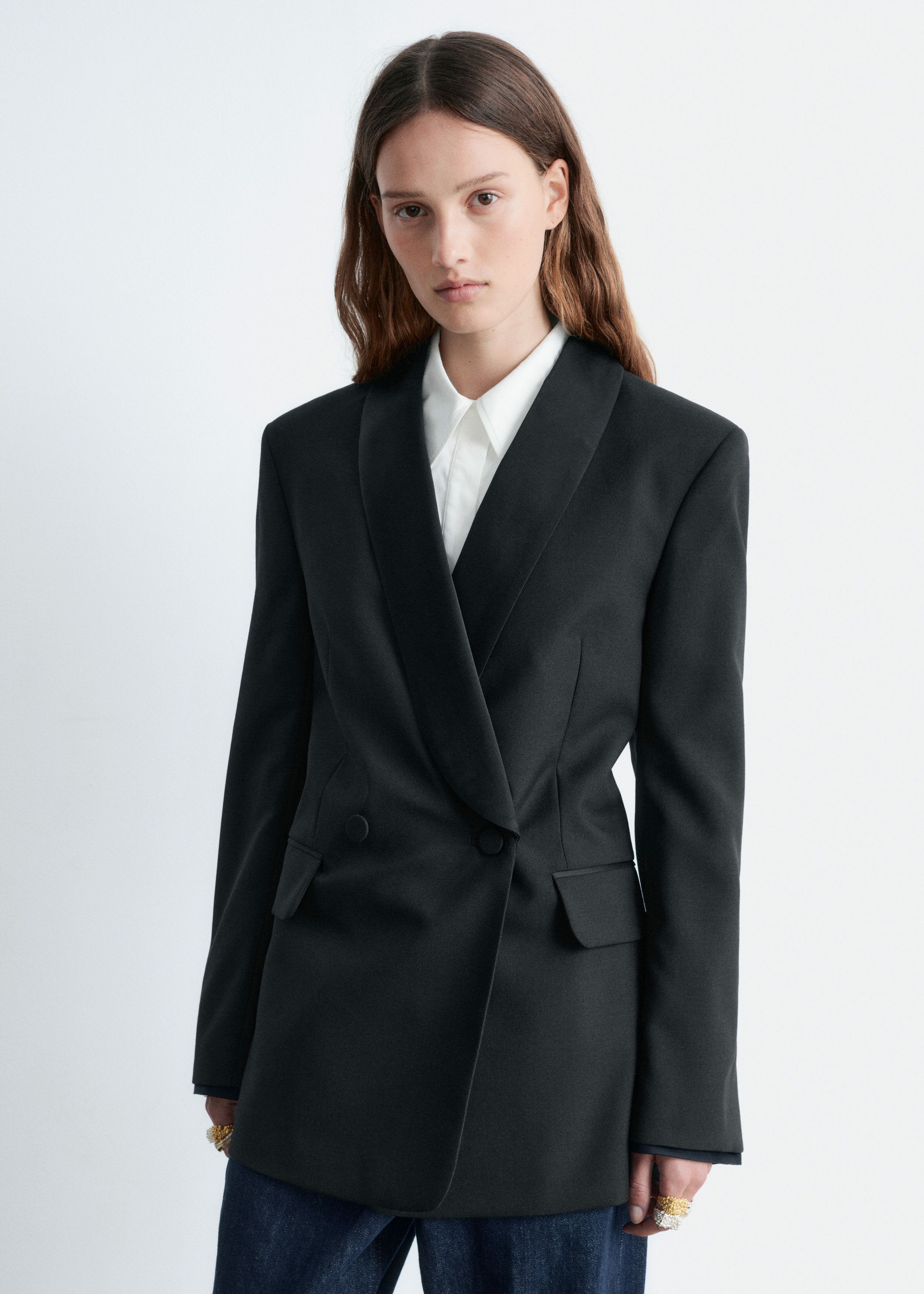 울 소재의 더블 브레스티드 블레이저예요. 새틴 라펠 카라, 그리고 새틴 레이어가 슬리브 아래로 살짝 흐르는 디자인의 더블 레이어 커프스가 돋보인답니다. 스트레이트 실루엣, 숄더 패드, 뒷면의 더블 트임, 플랩 포켓, 2개의 단추가 특징이에요.